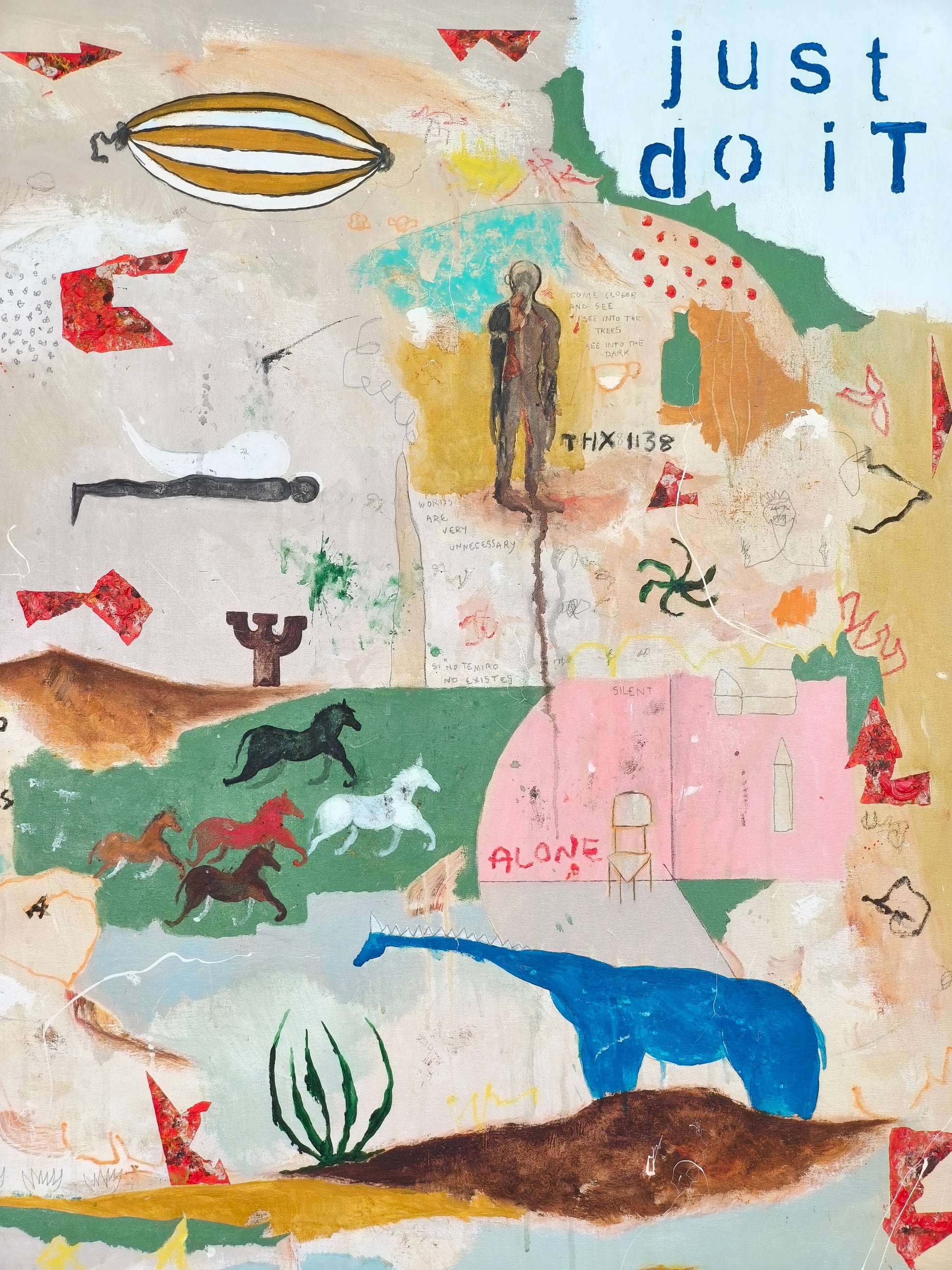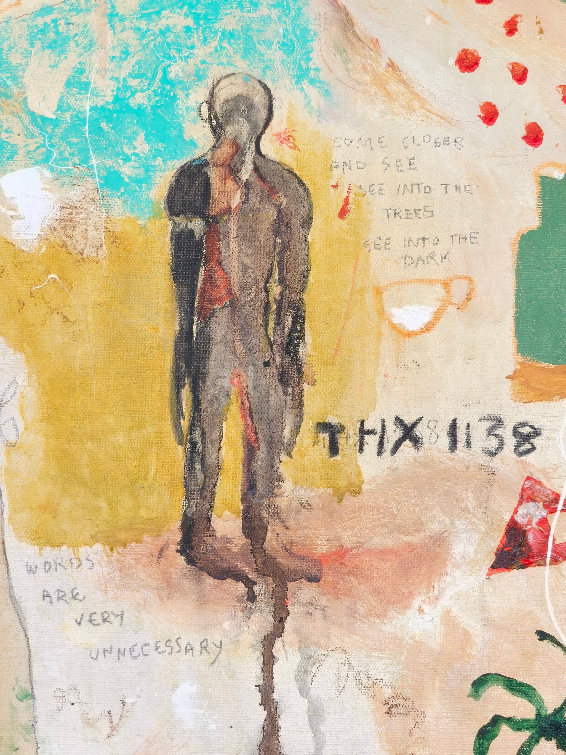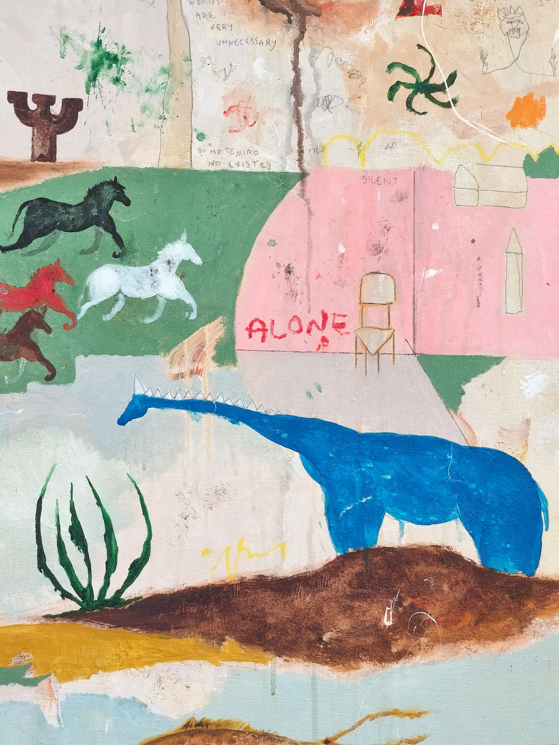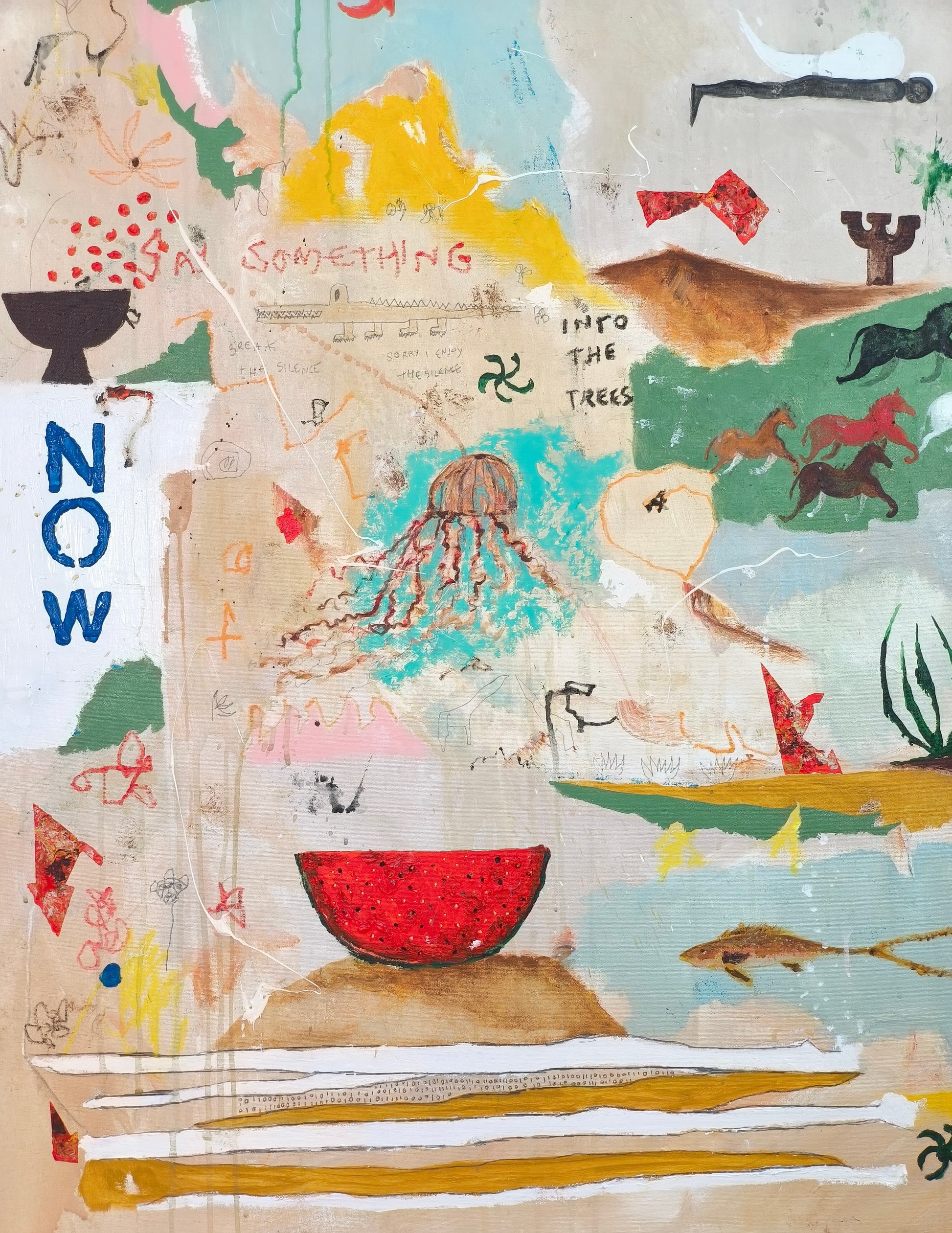Technique: acrylic, pigments, pencil, charcoal, gesso, waxes.