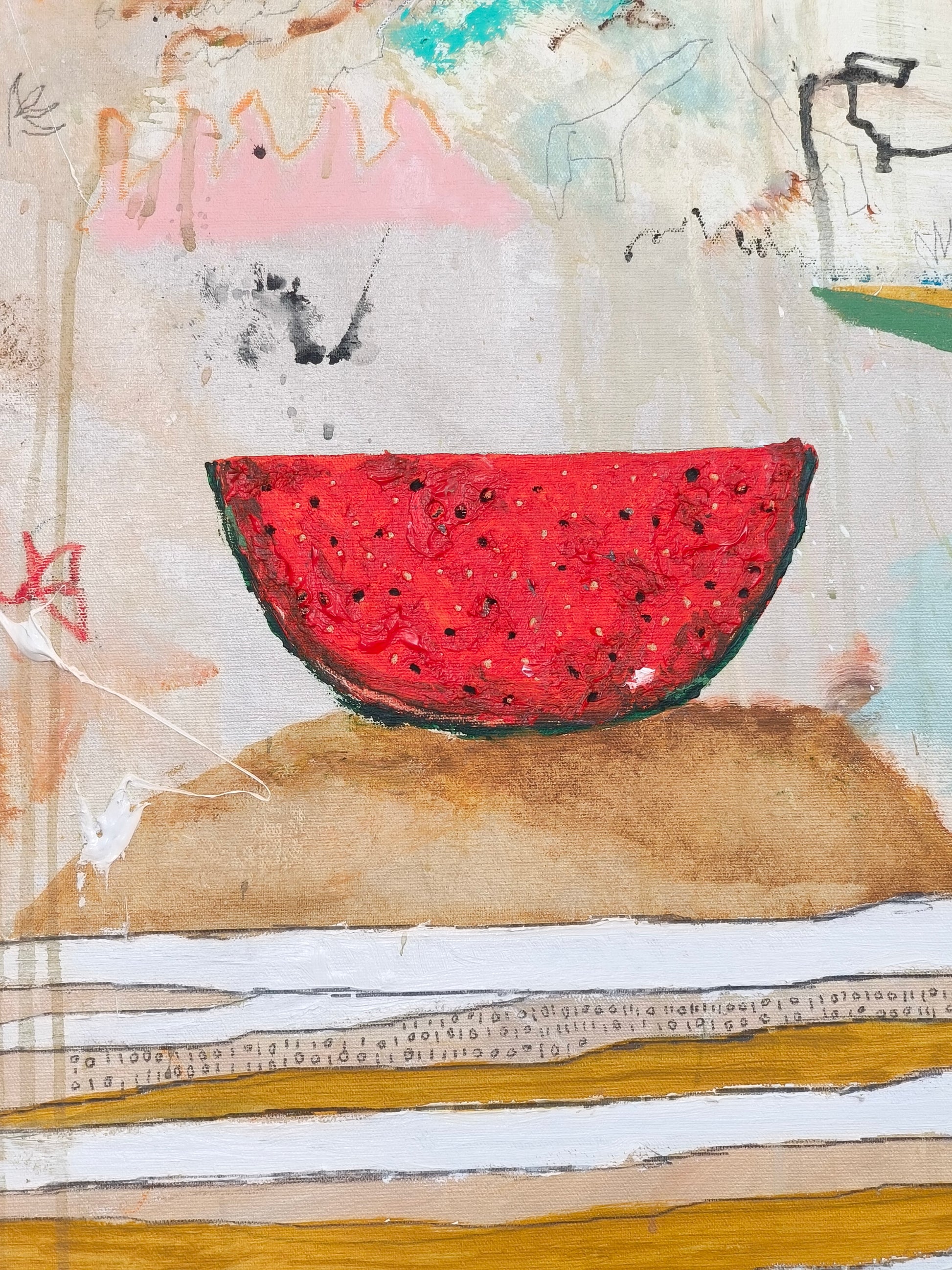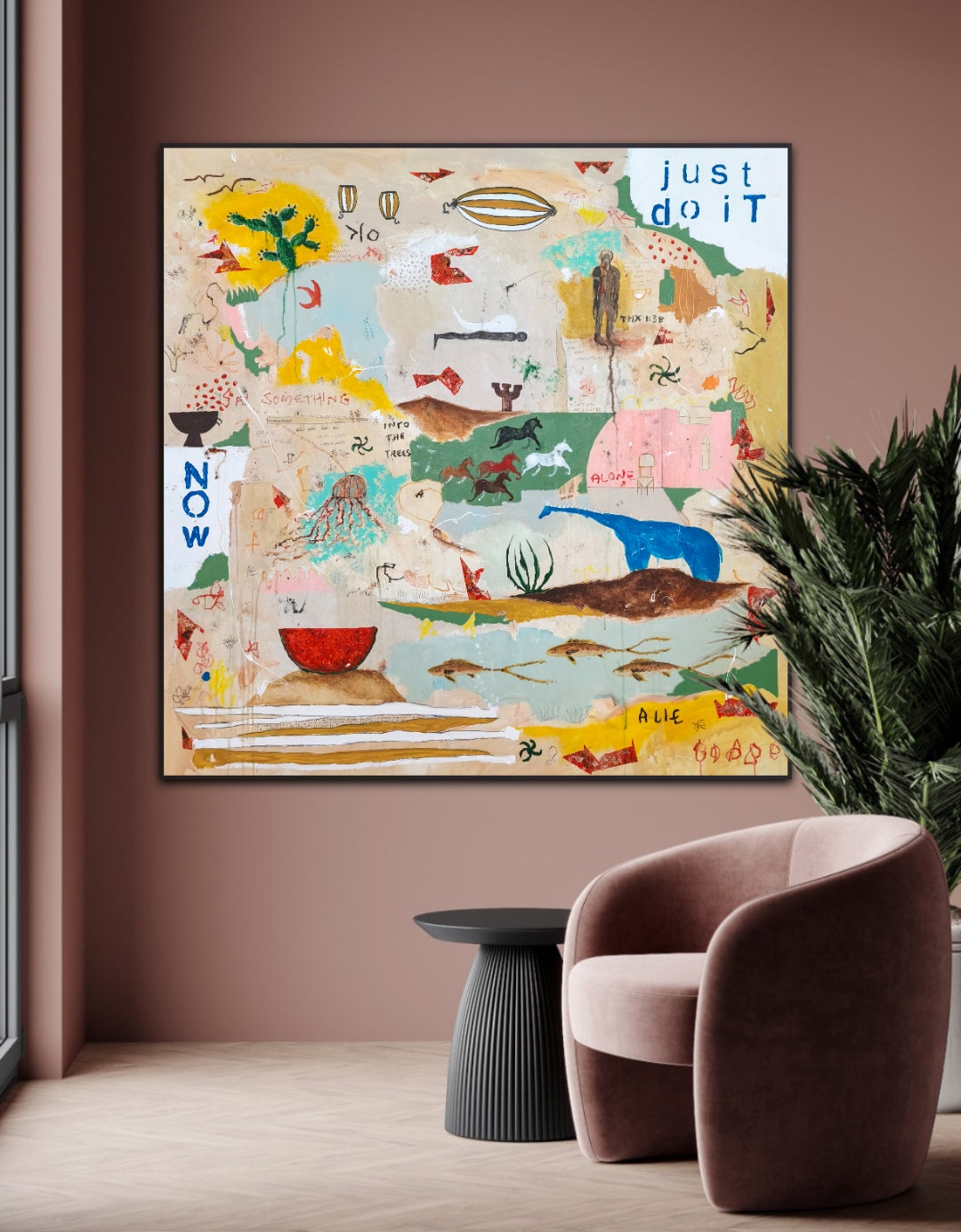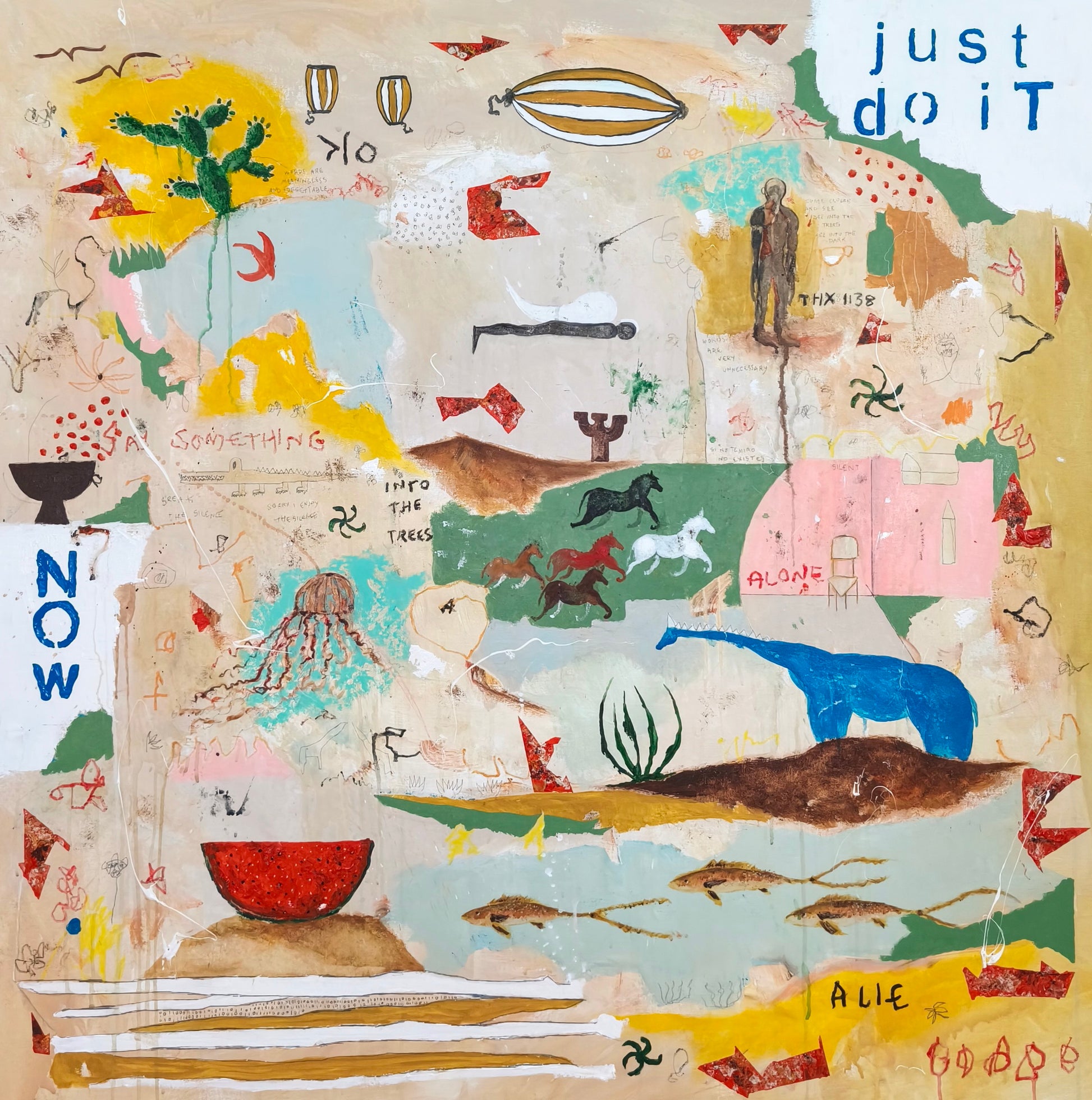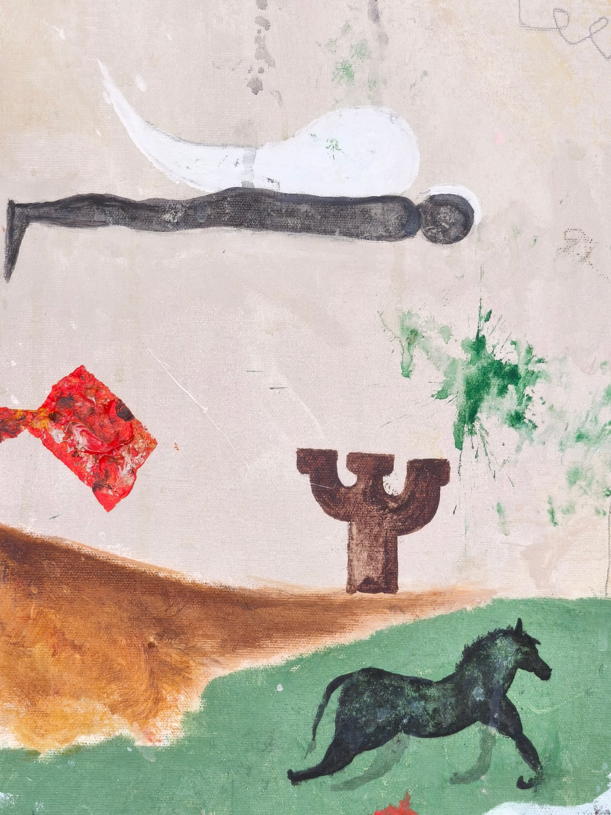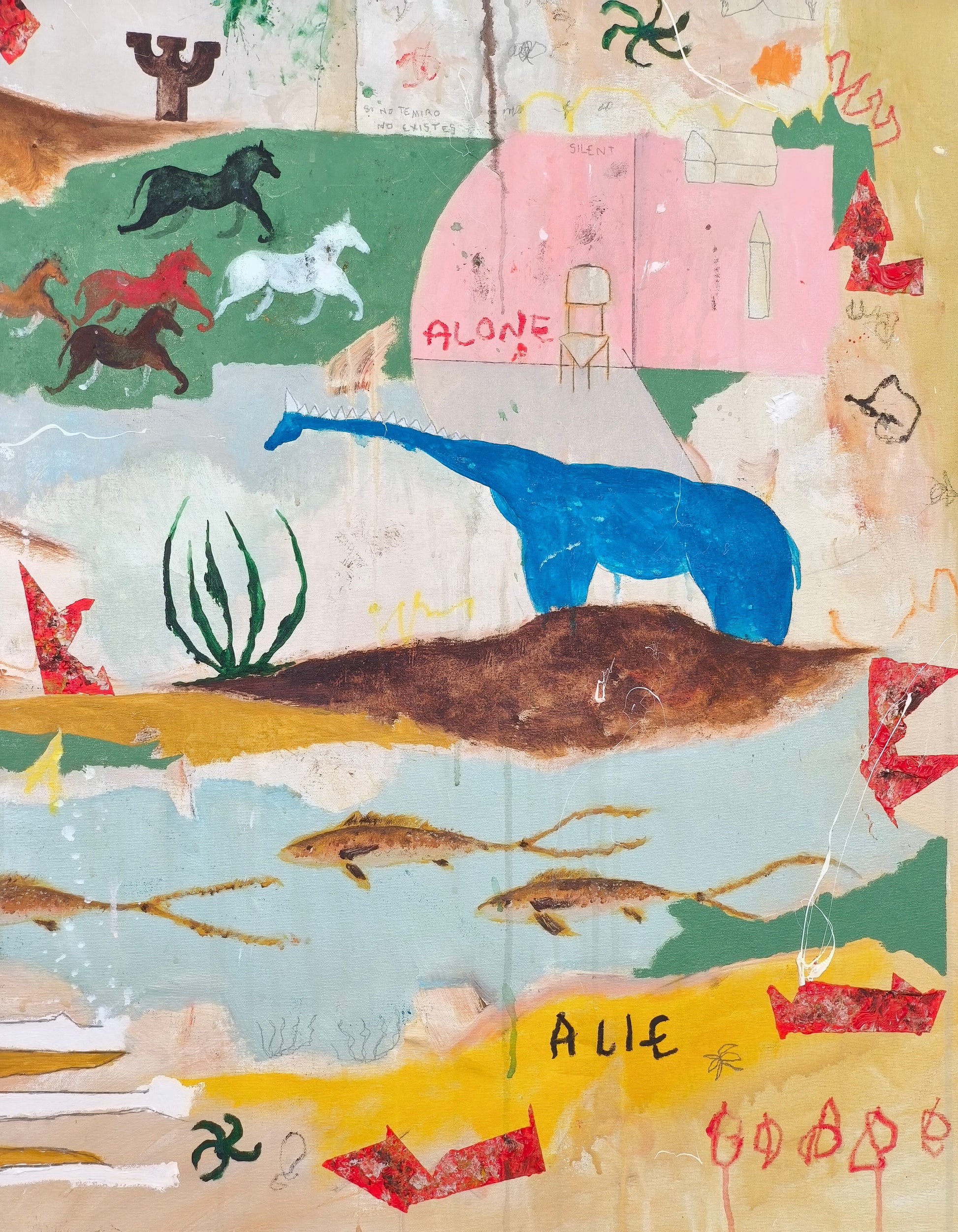Technique: acrylic, pigments, pencil, charcoal, gesso, waxes.
