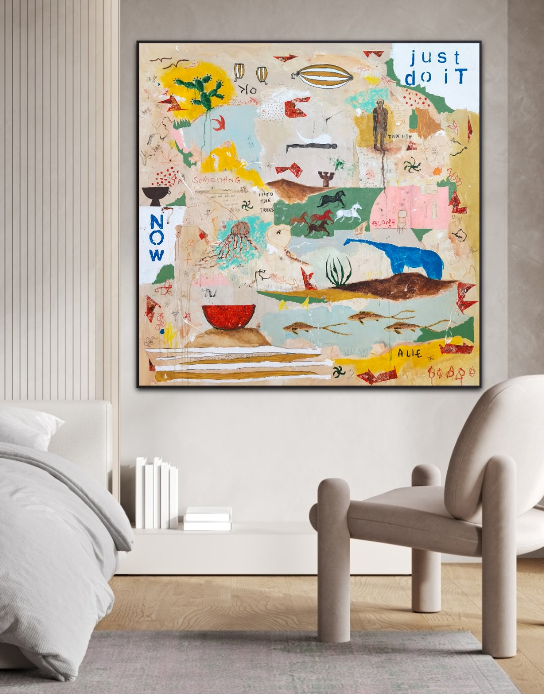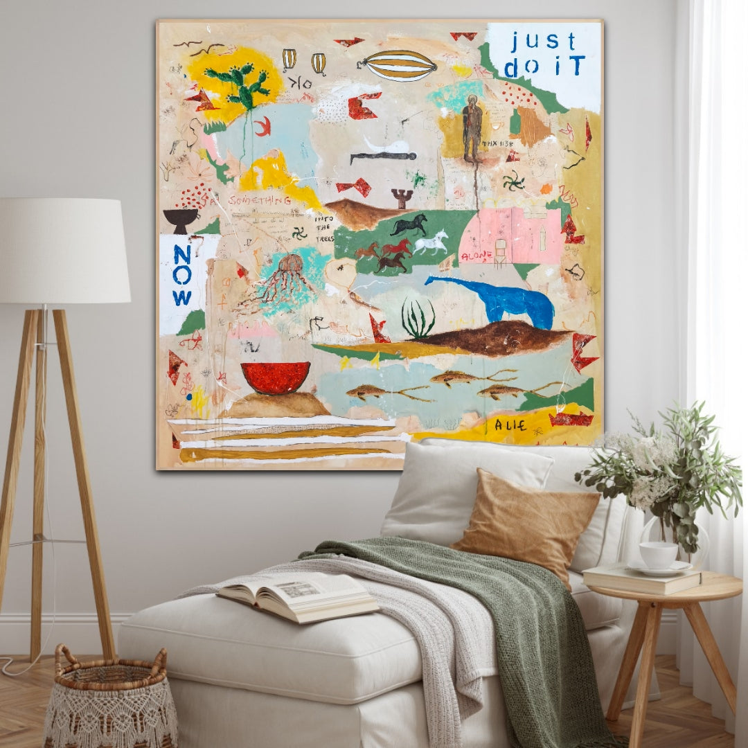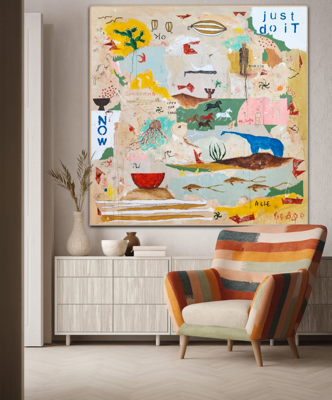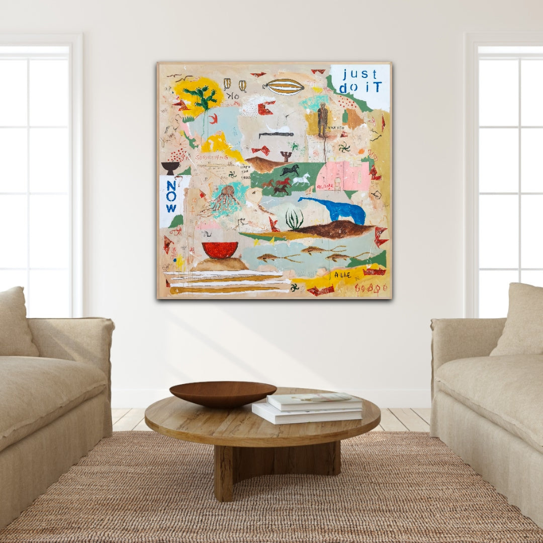 Technique: acrylic, pigments, pencil, charcoal, gesso, waxes.