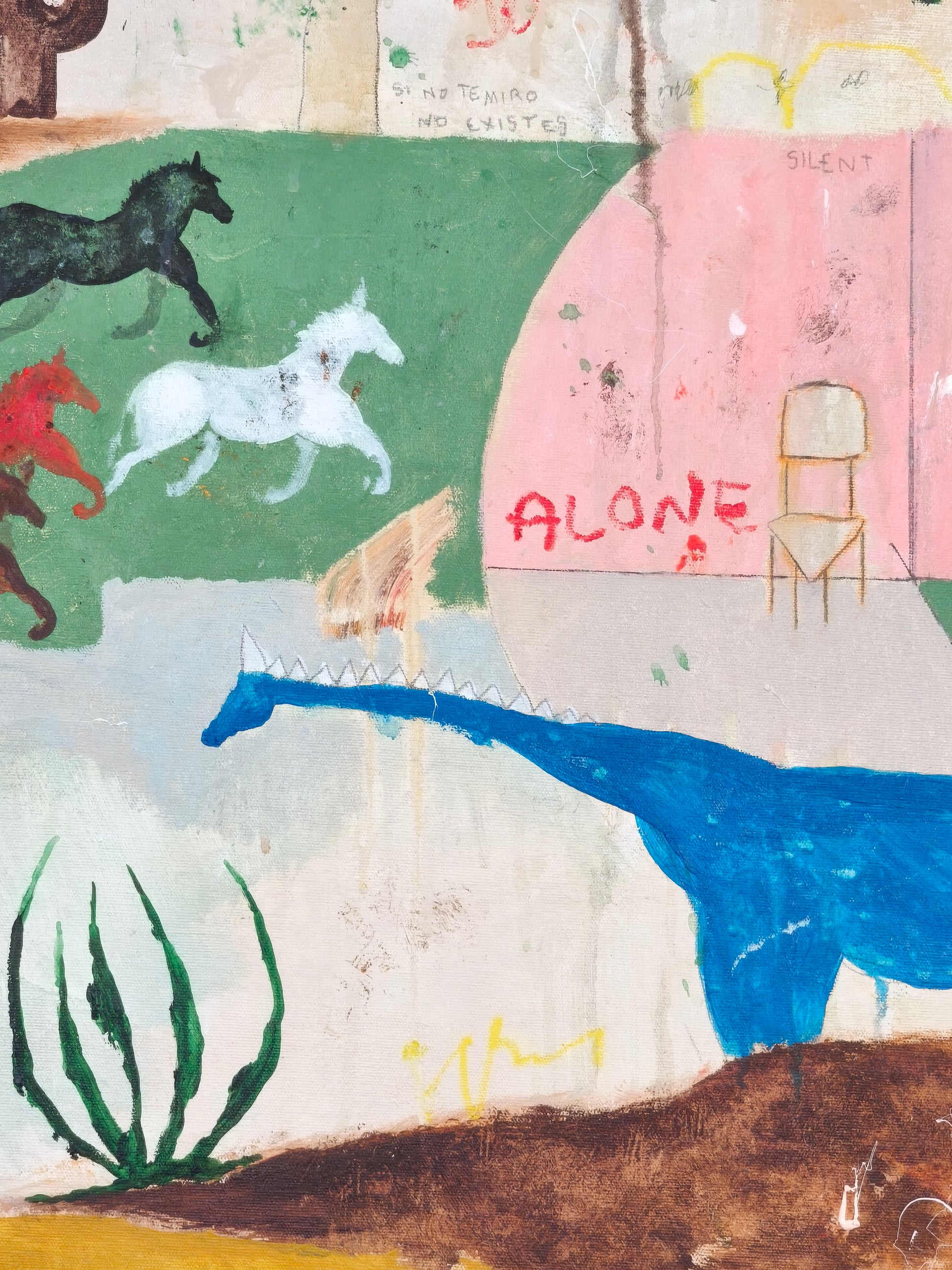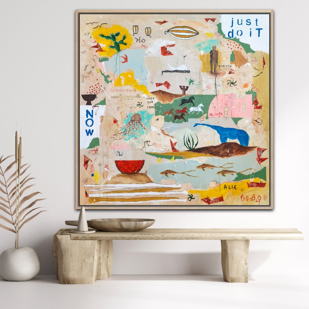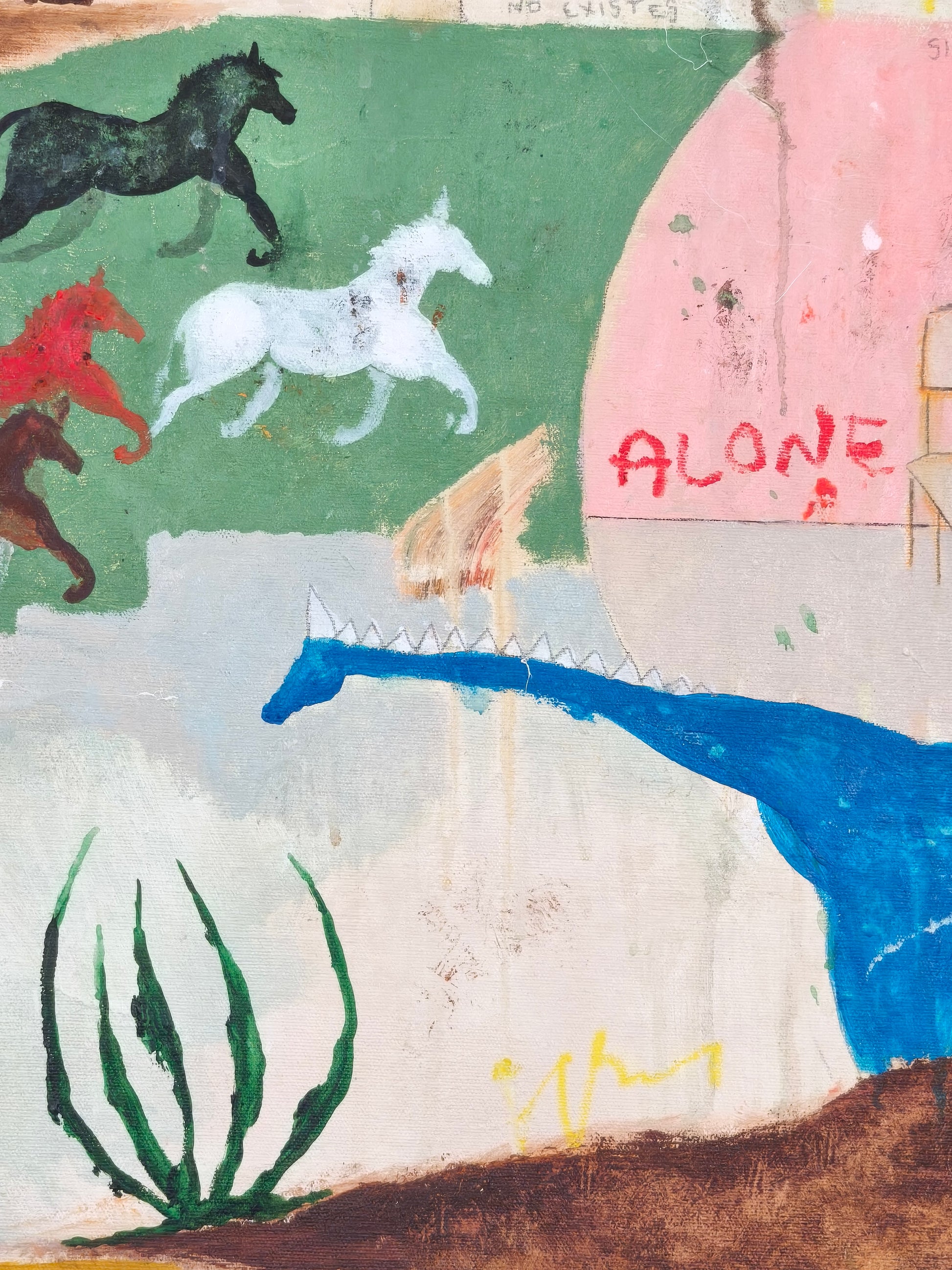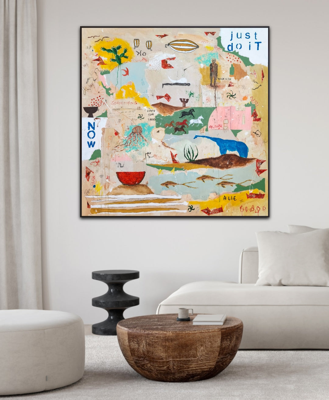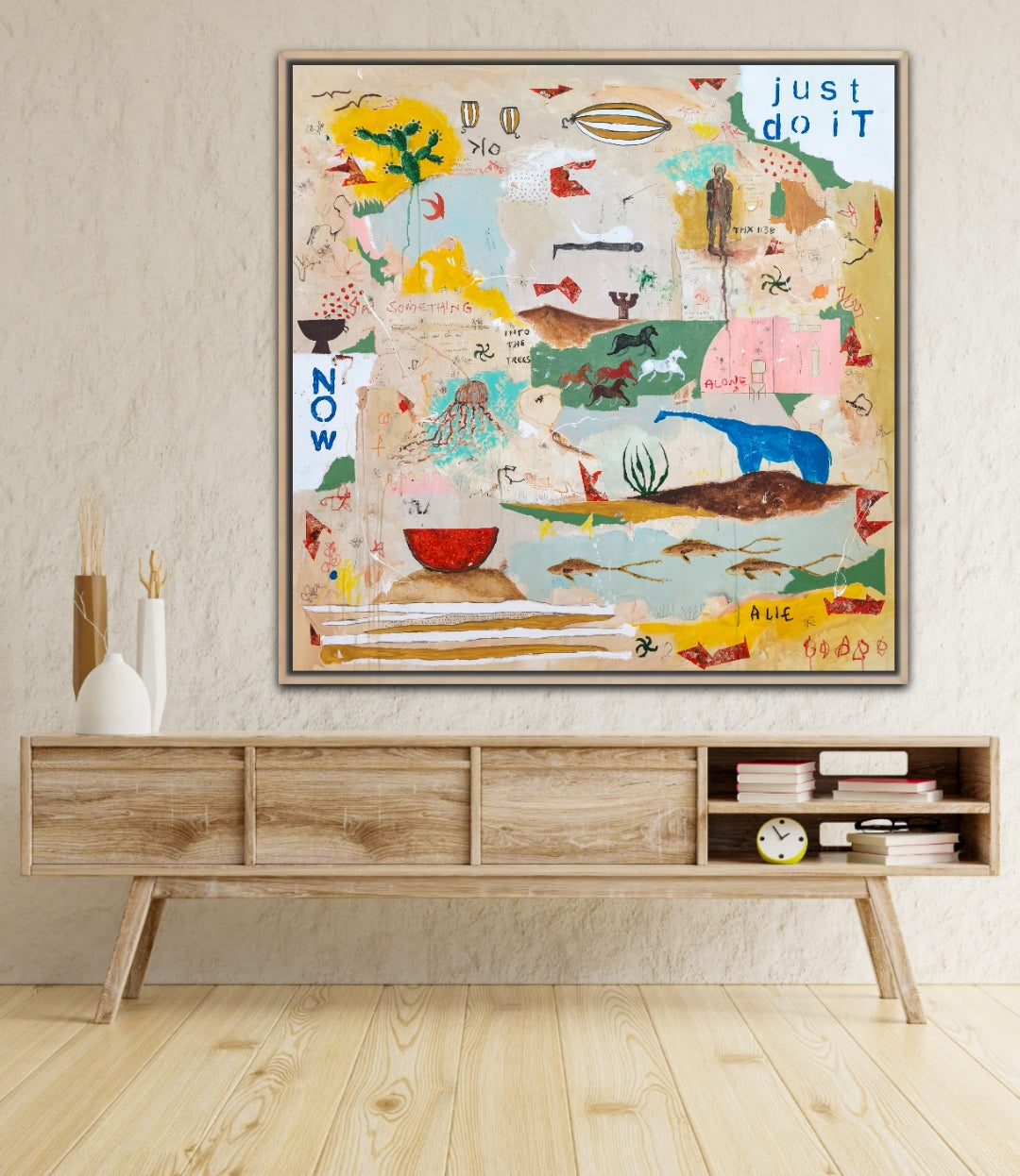 Technique: acrylic, pigments, pencil, charcoal, gesso, waxes.
