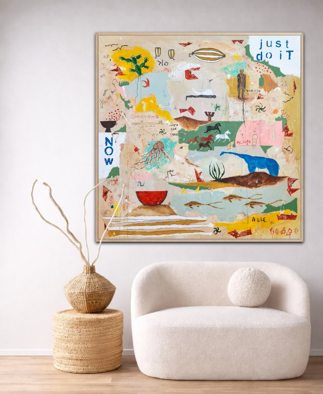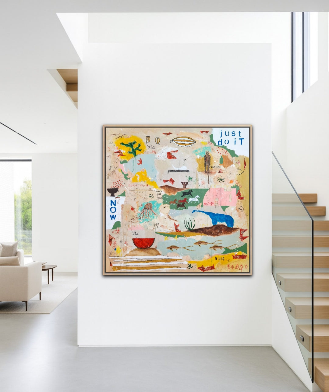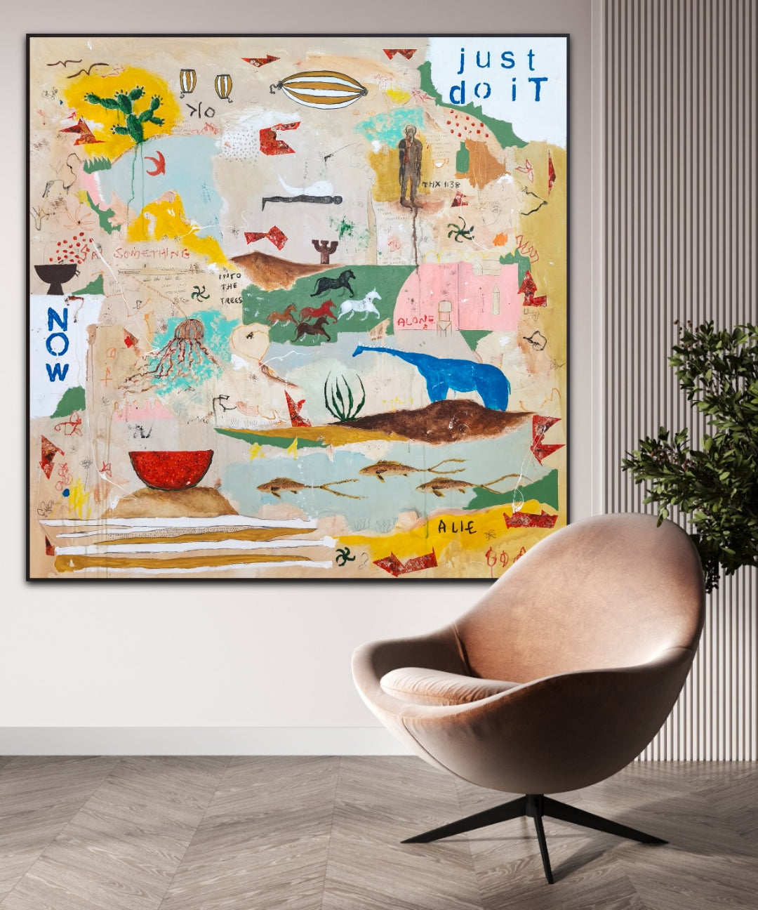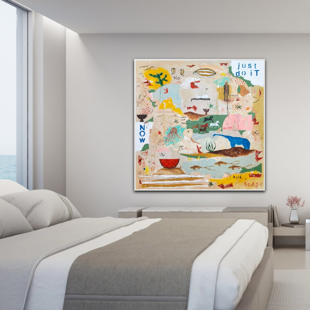Technique: acrylic, pigments, pencil, charcoal, gesso, waxes.