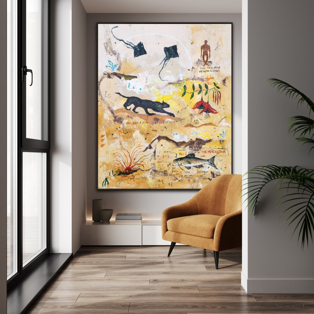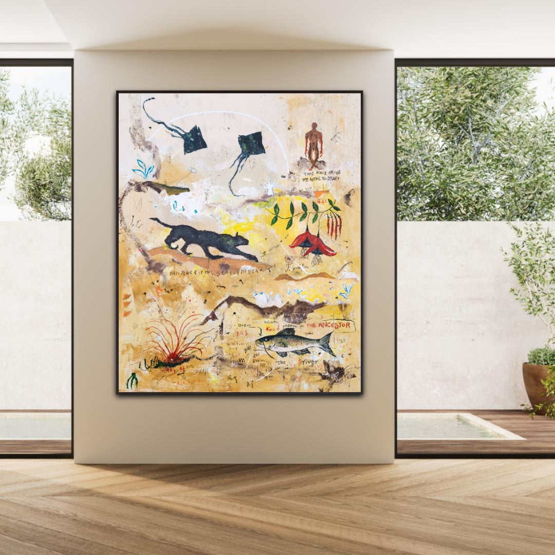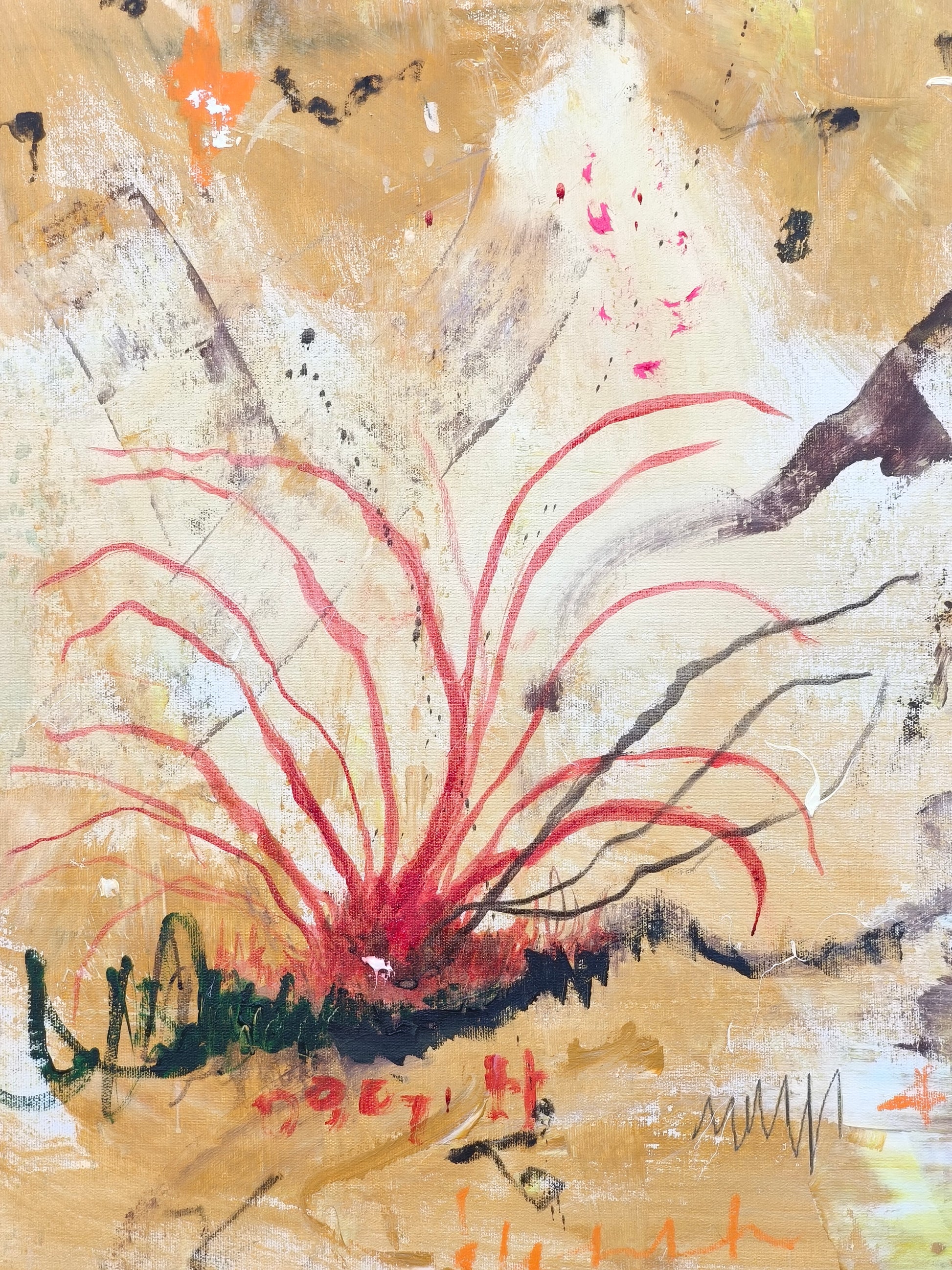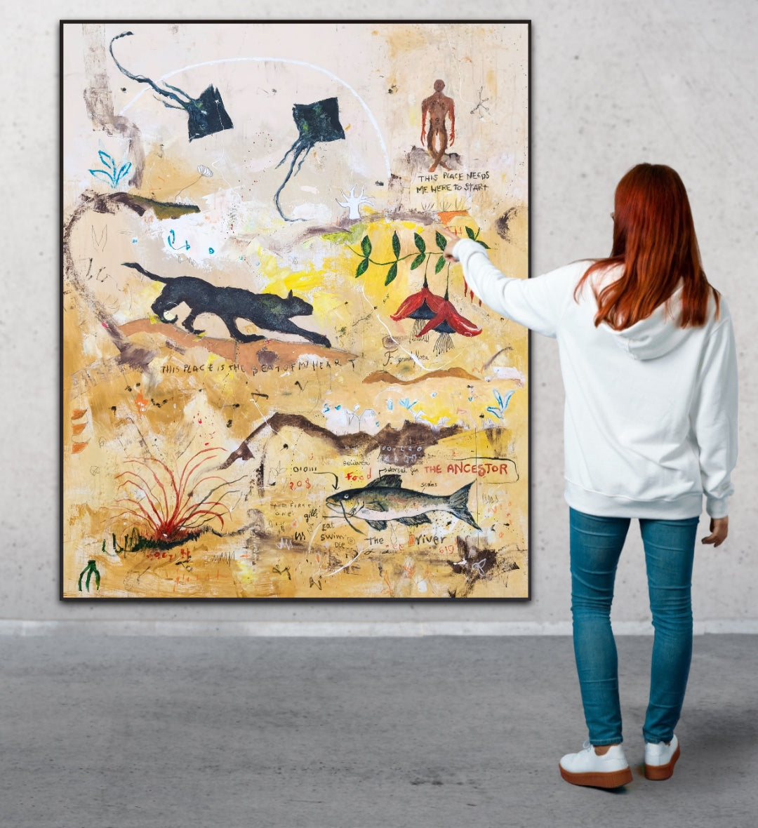 Técnica: acrílico, lápiz, carboncillo, gesso, ceras.
