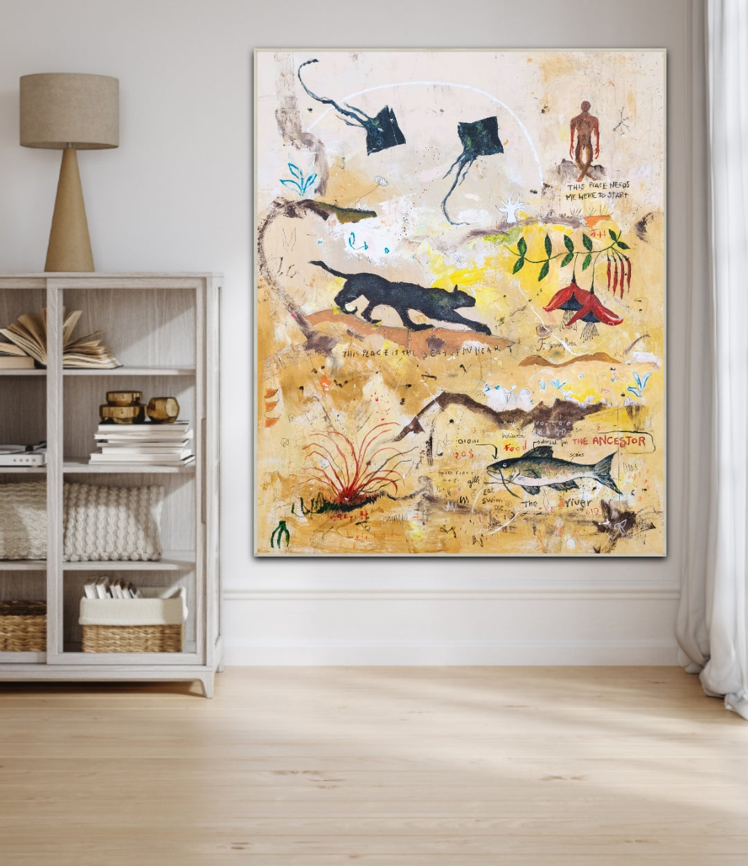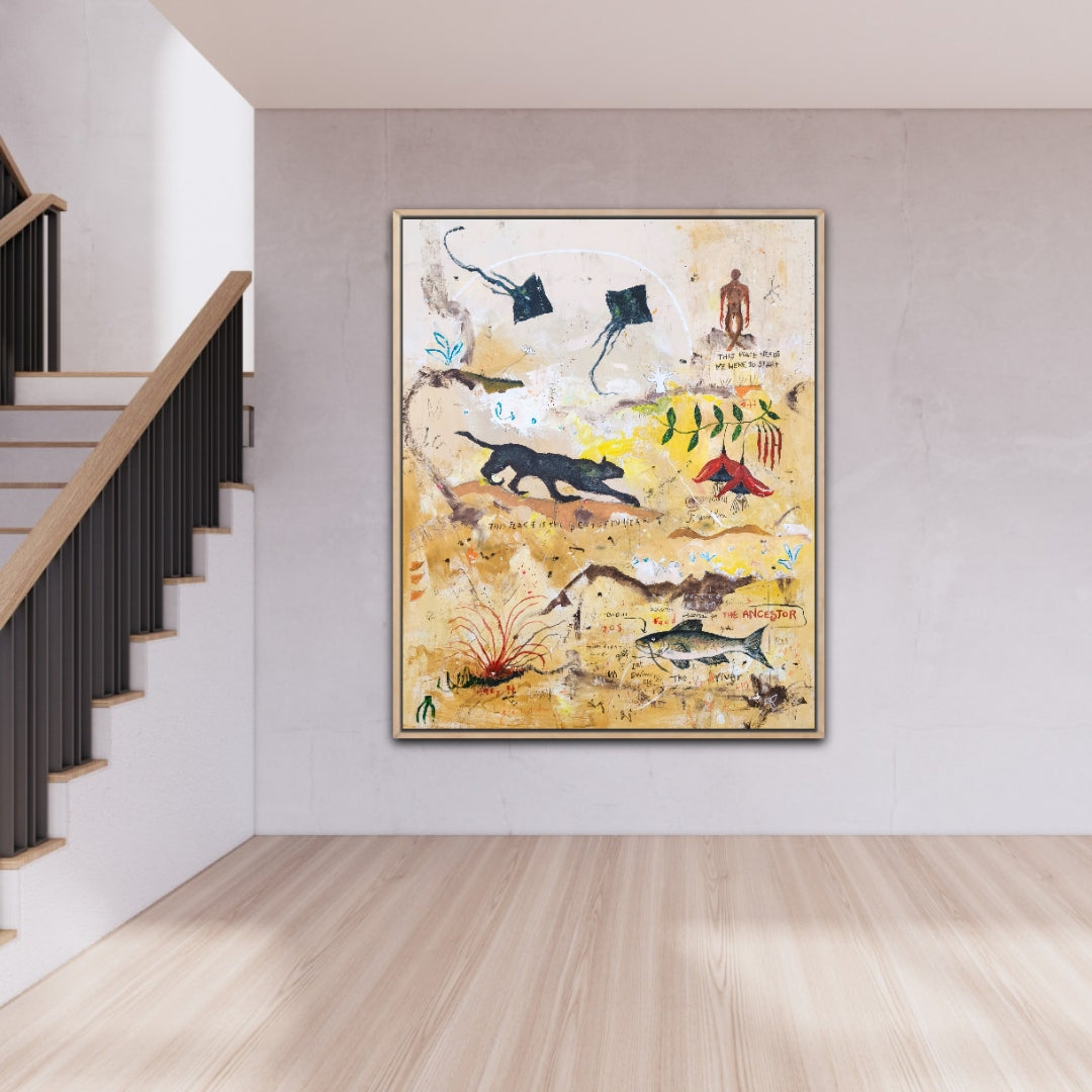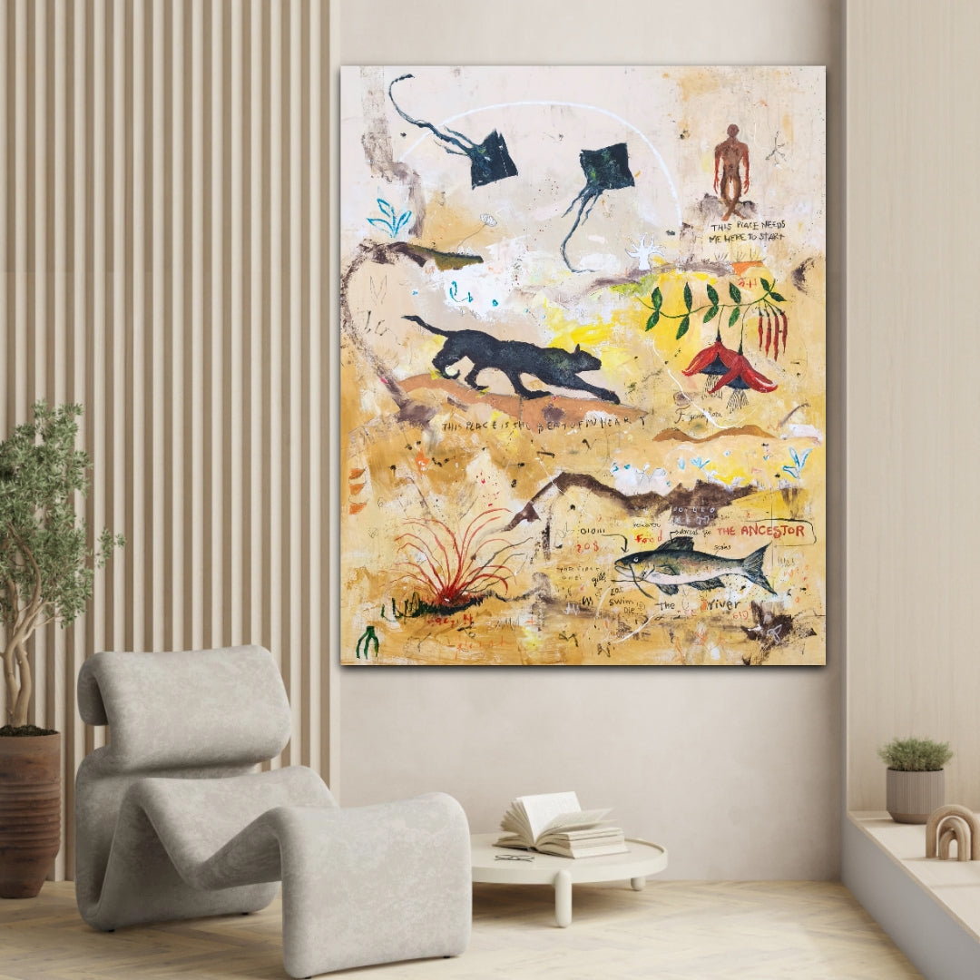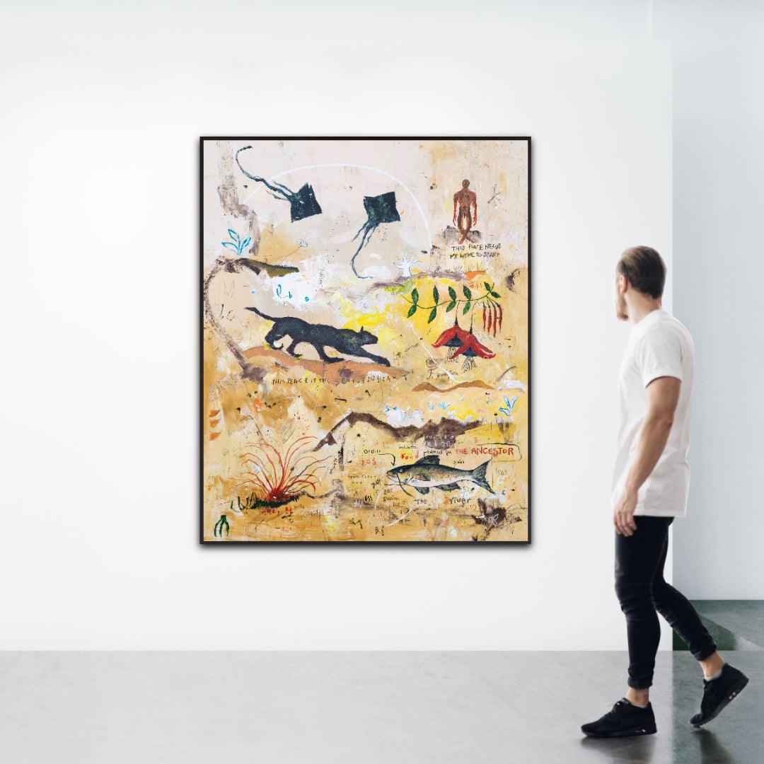 Técnica: acrílico, lápiz, carboncillo, gesso, ceras.