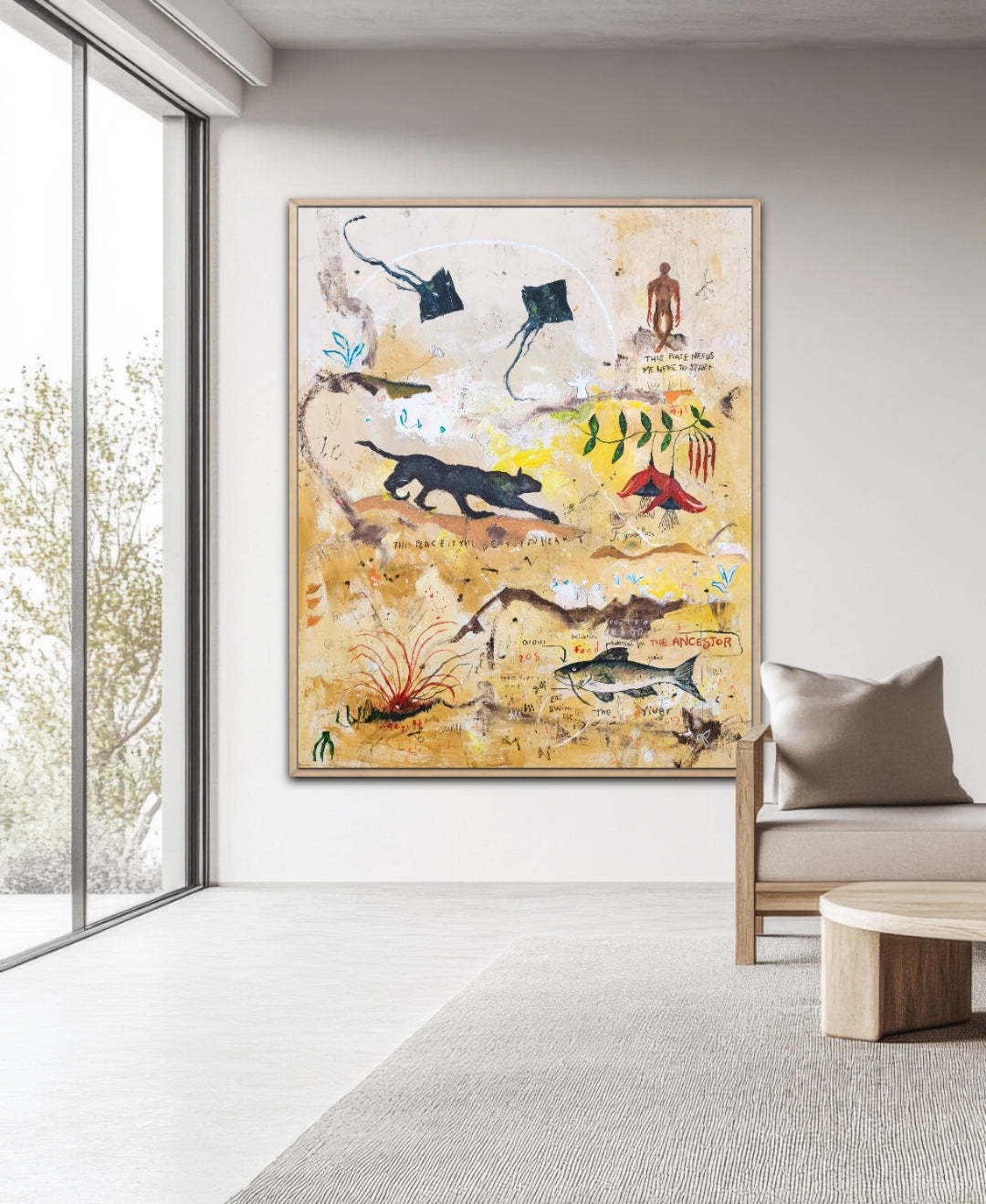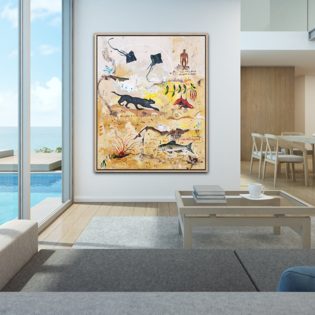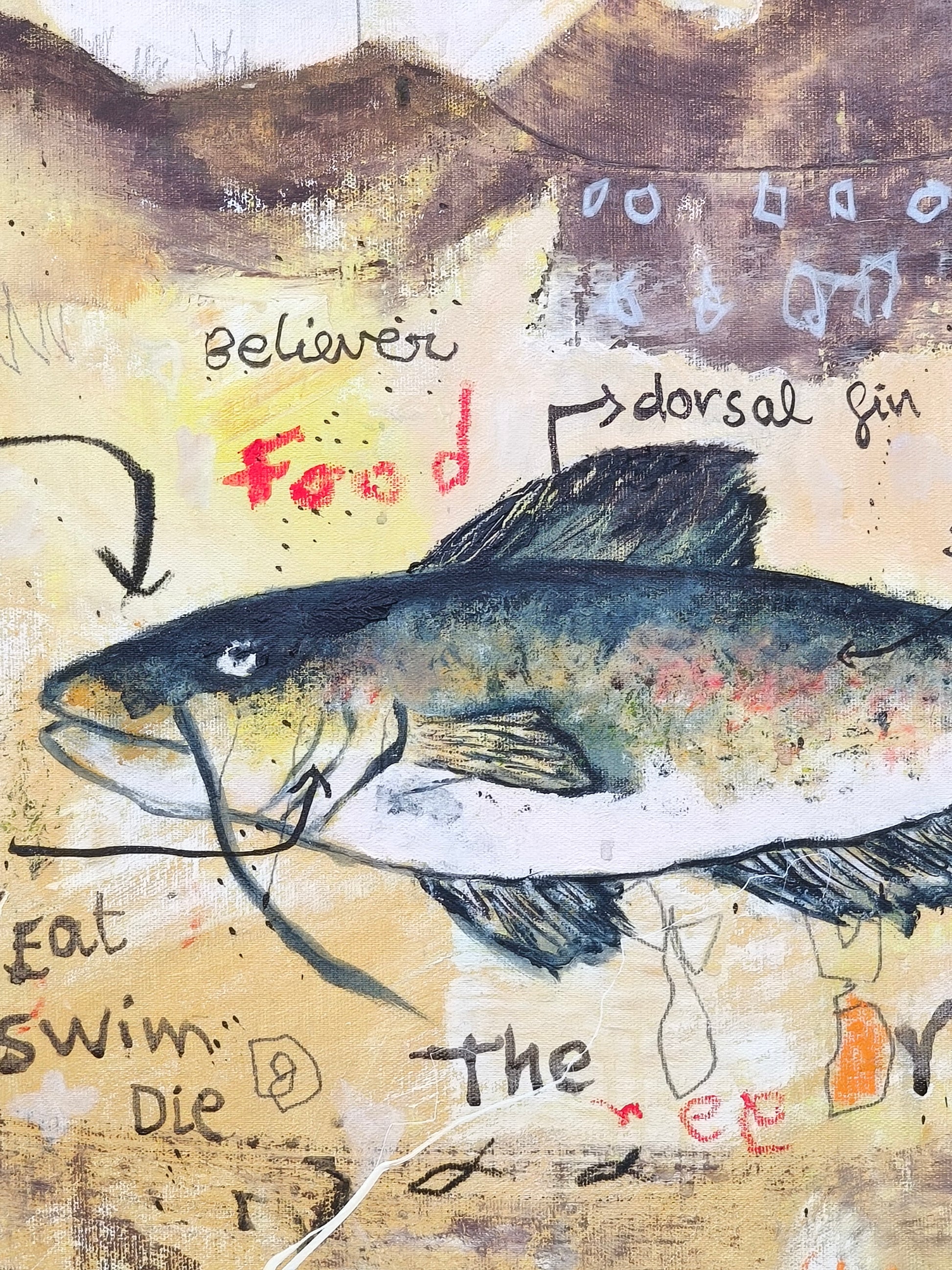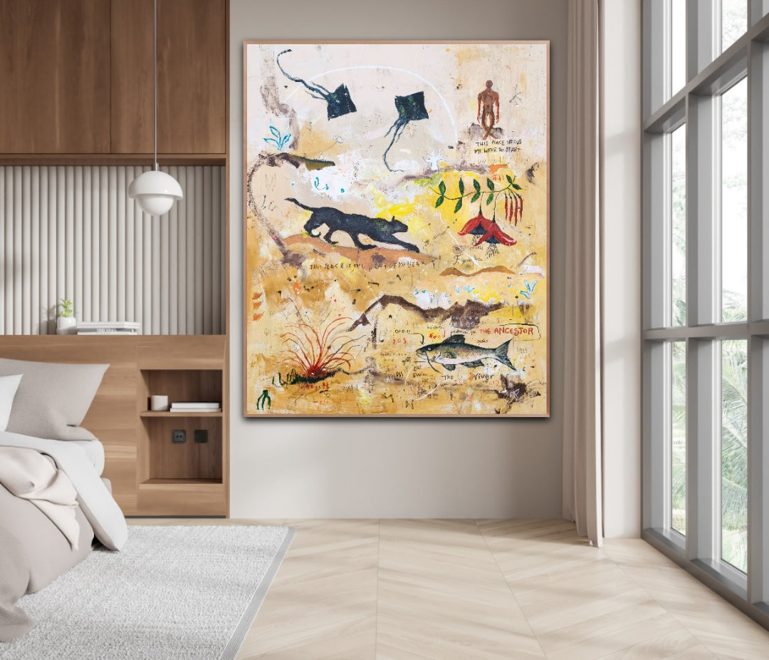 Técnica: acrílico, lápiz, carboncillo, gesso, ceras.