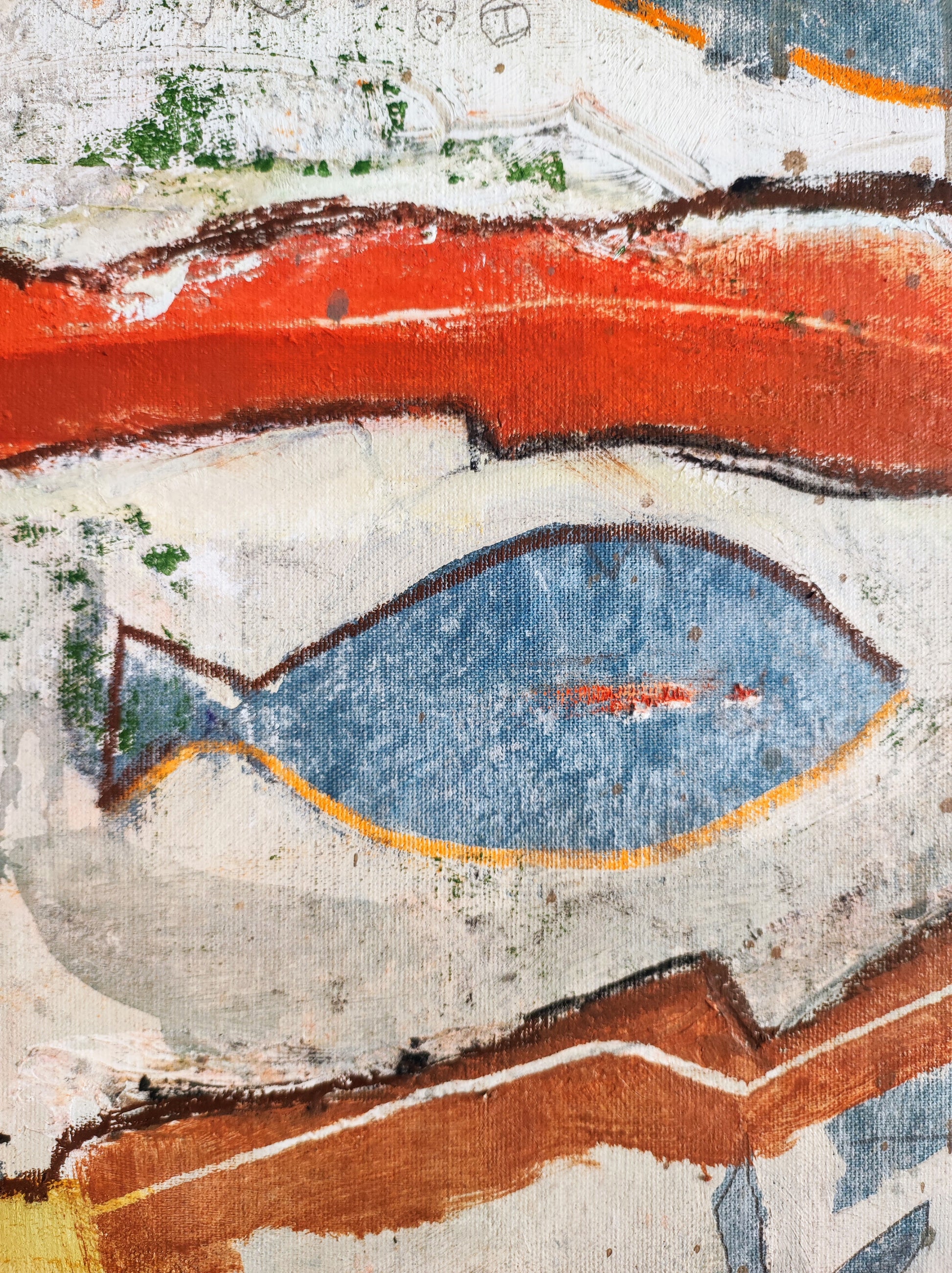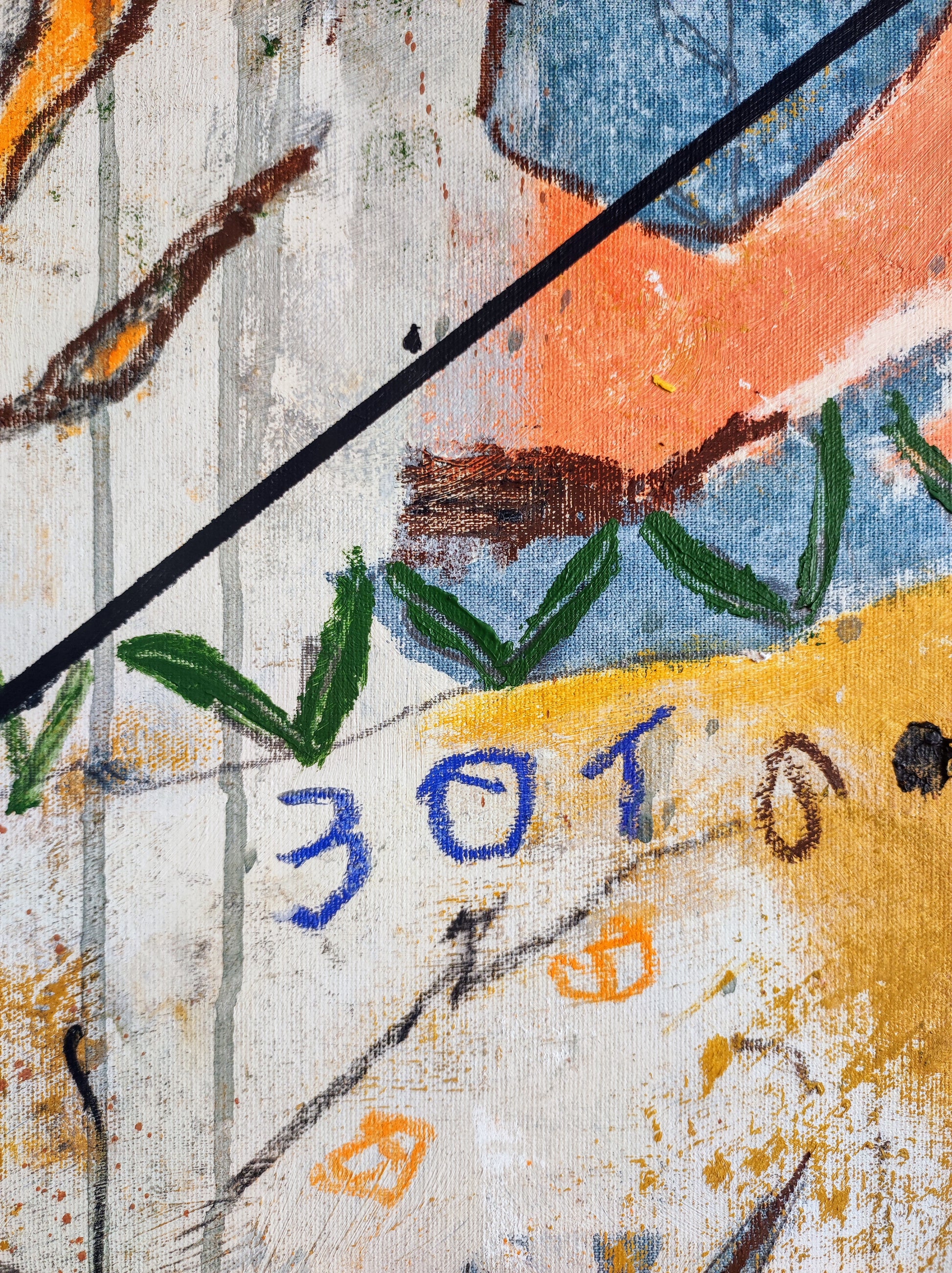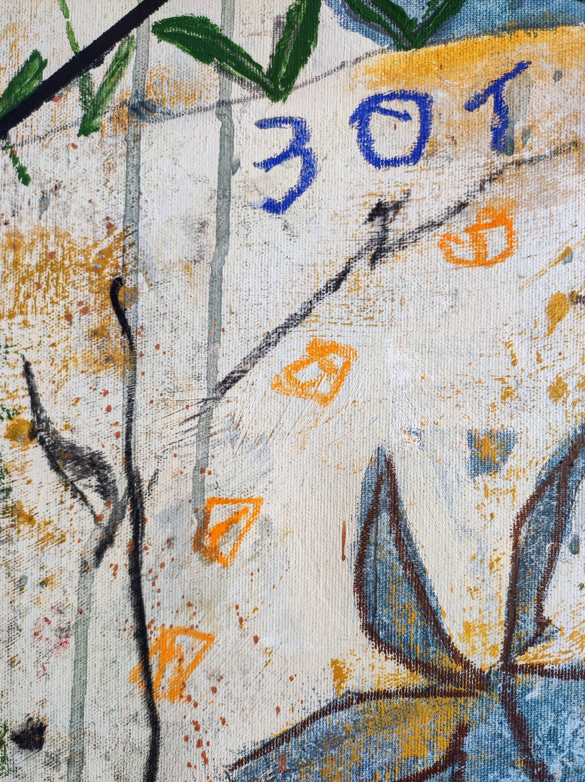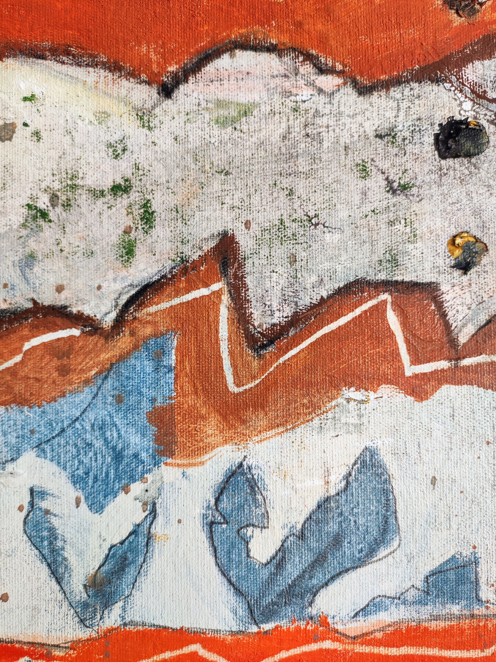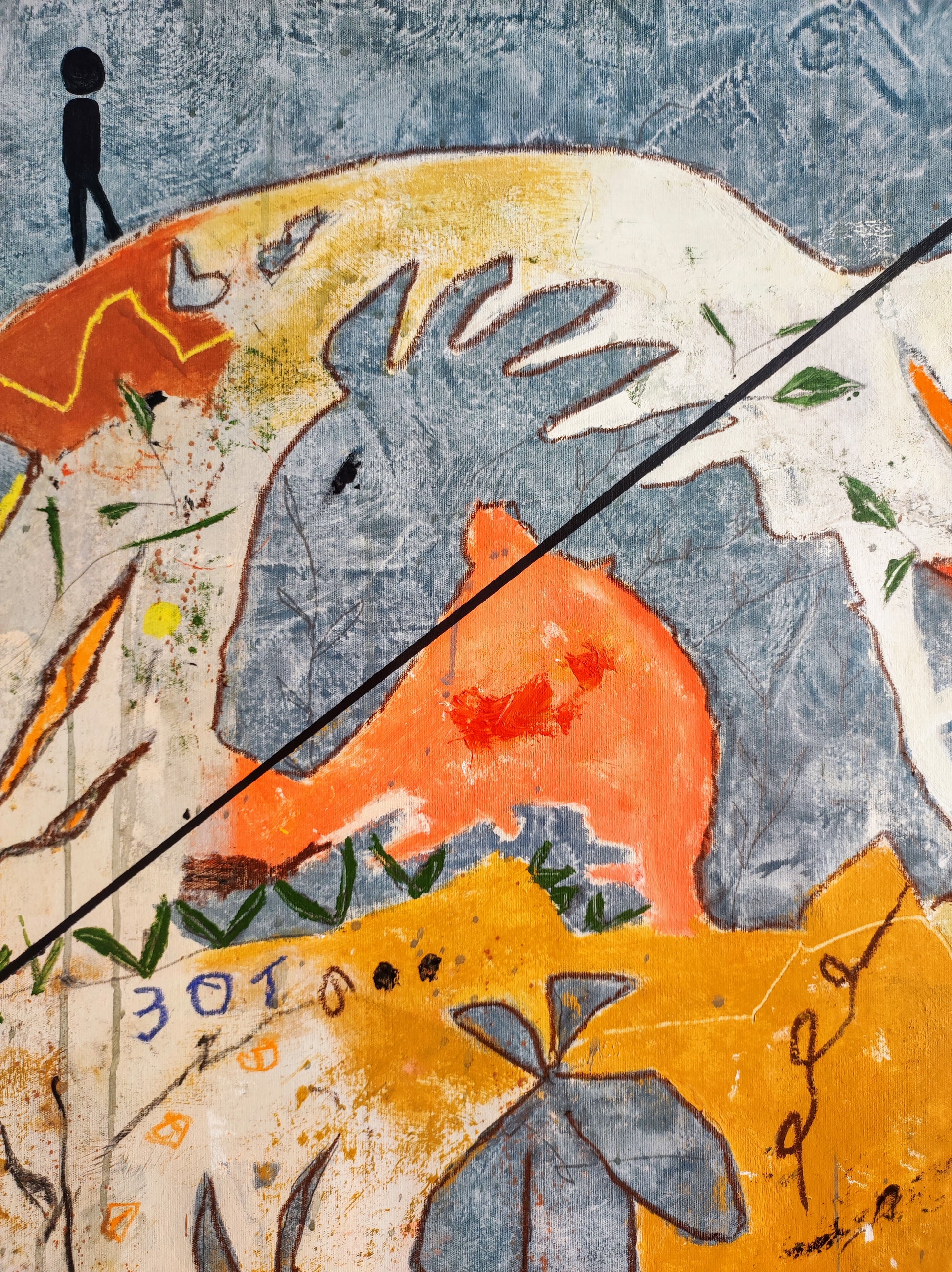 Técnica: acrílico, pigmentos, gesso, ceras, carboncillo y lápiz.