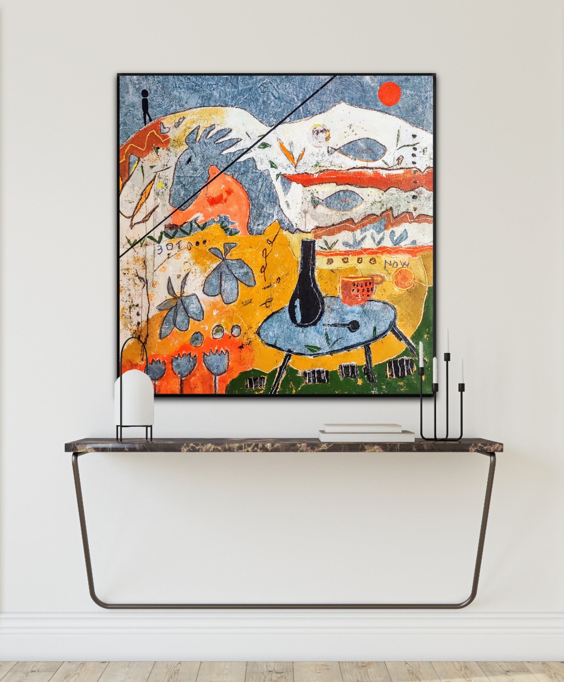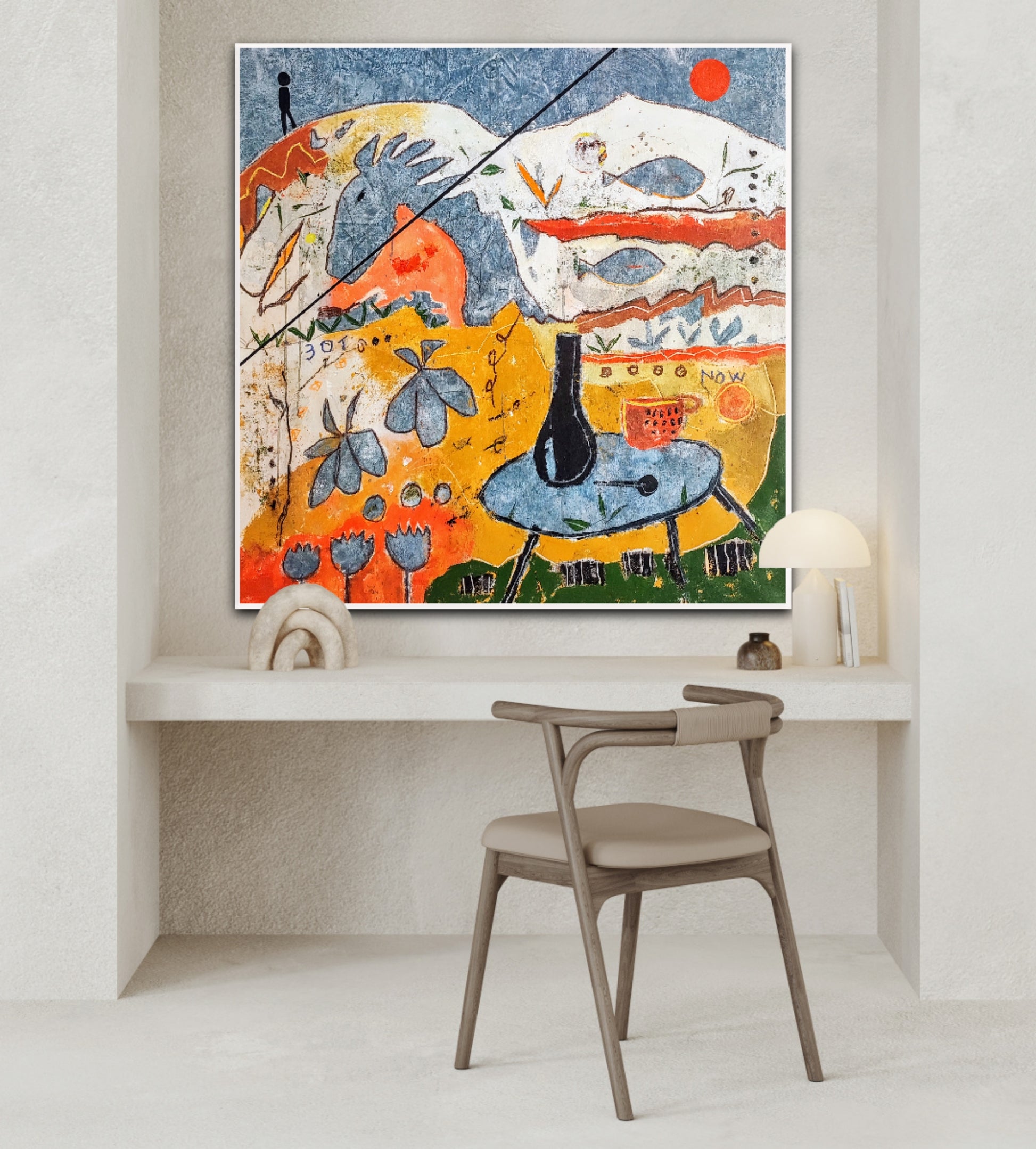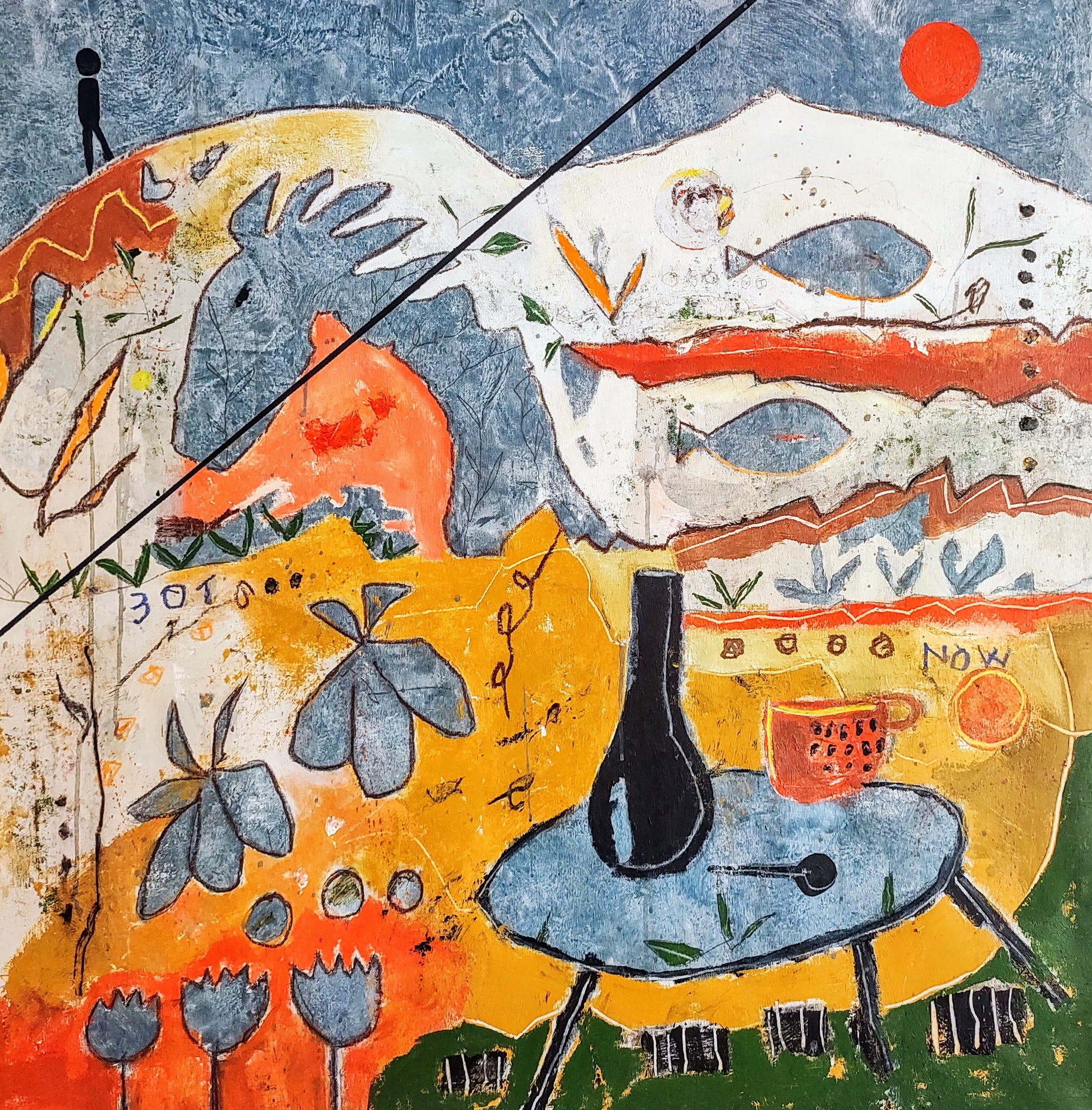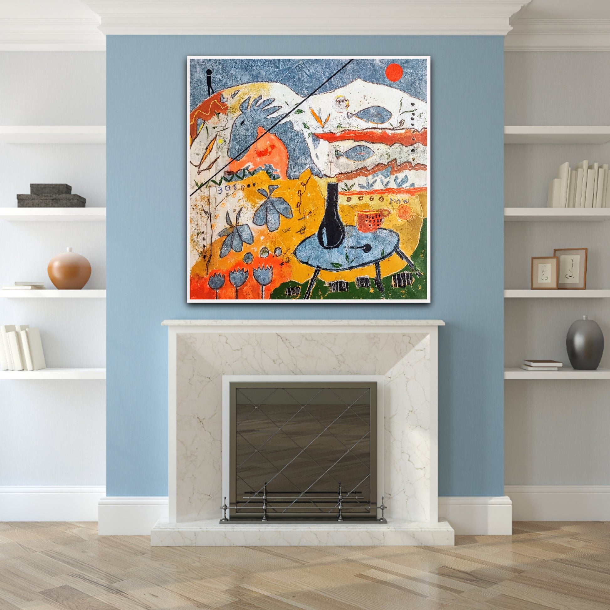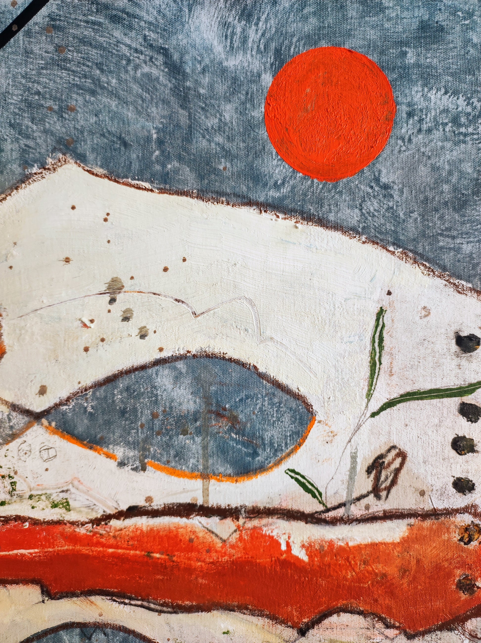Técnica: acrílico, pigmentos, gesso, ceras, carboncillo y lápiz.