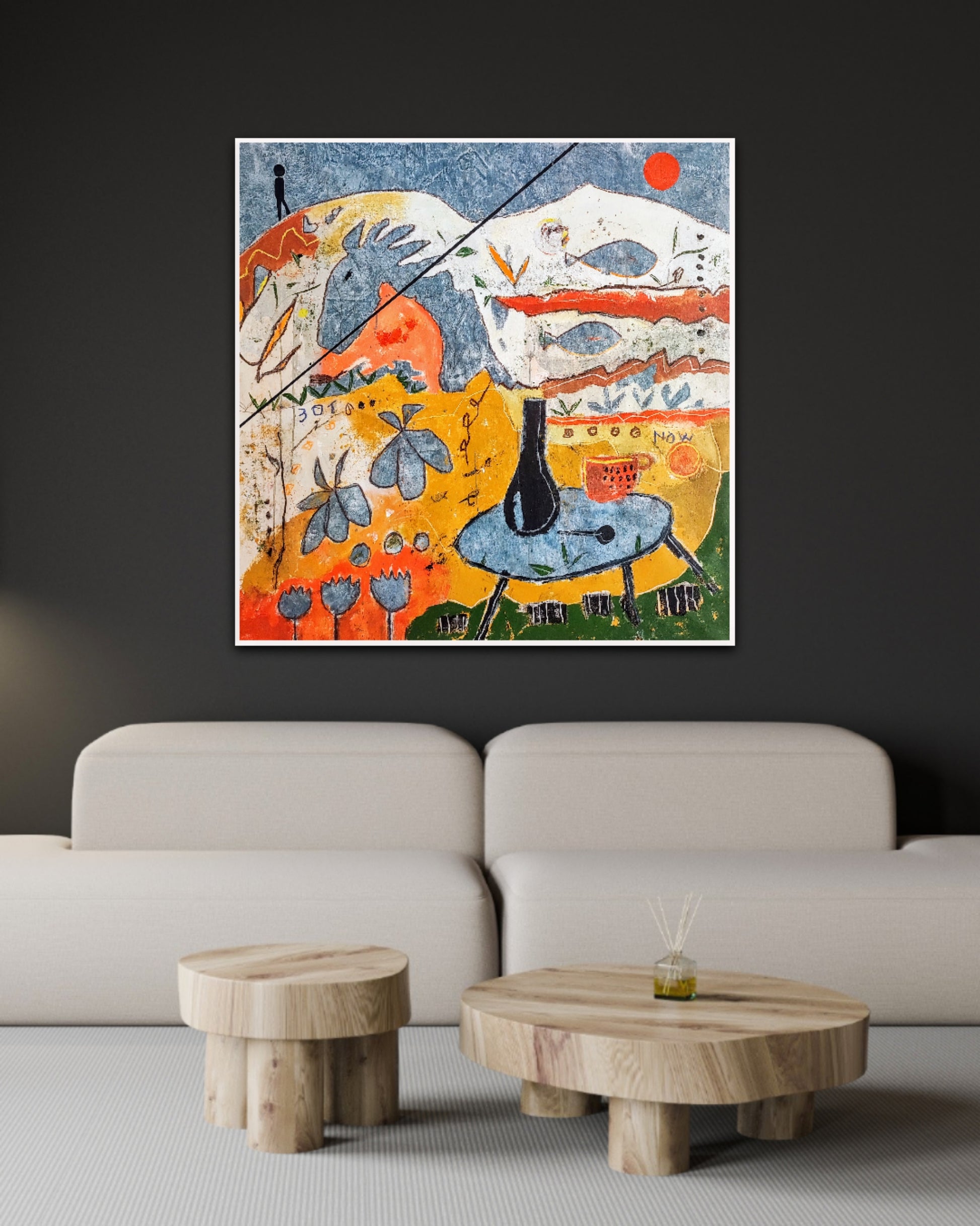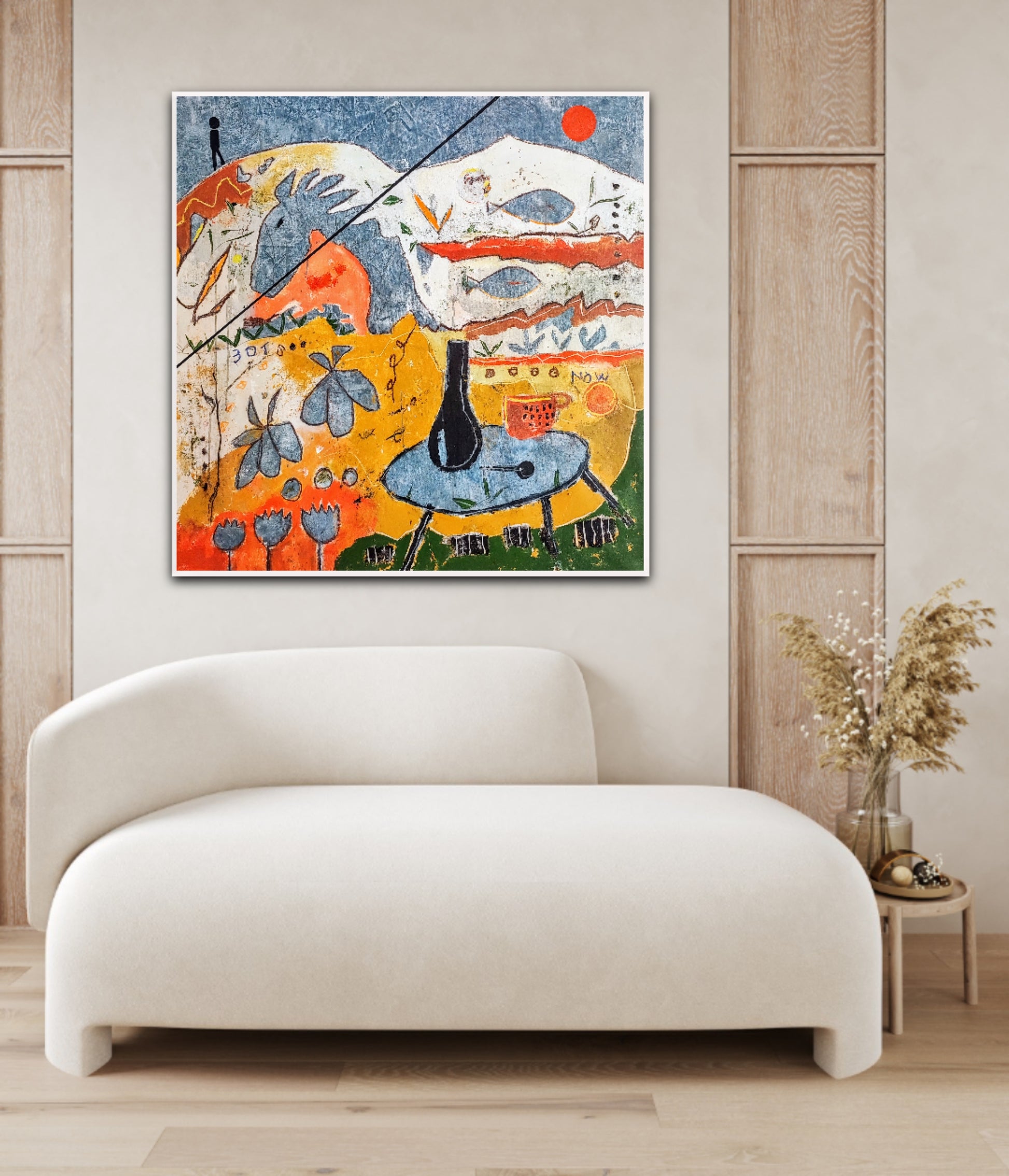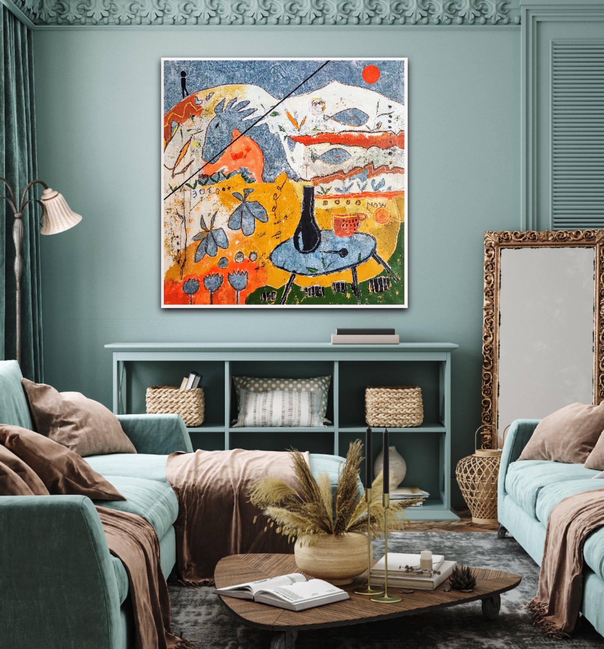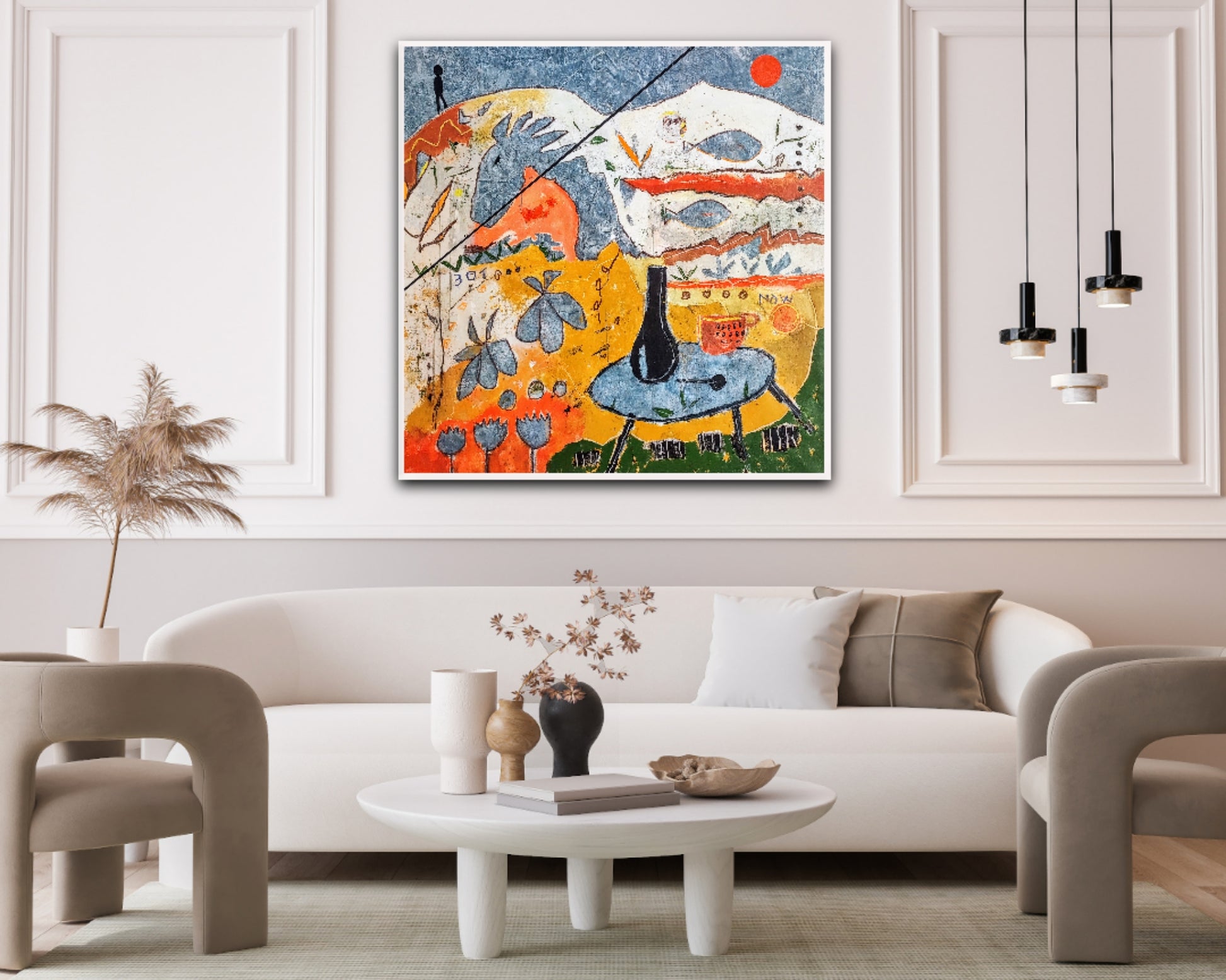 Técnica: acrílico, pigmentos, gesso, ceras, carboncillo y lápiz.