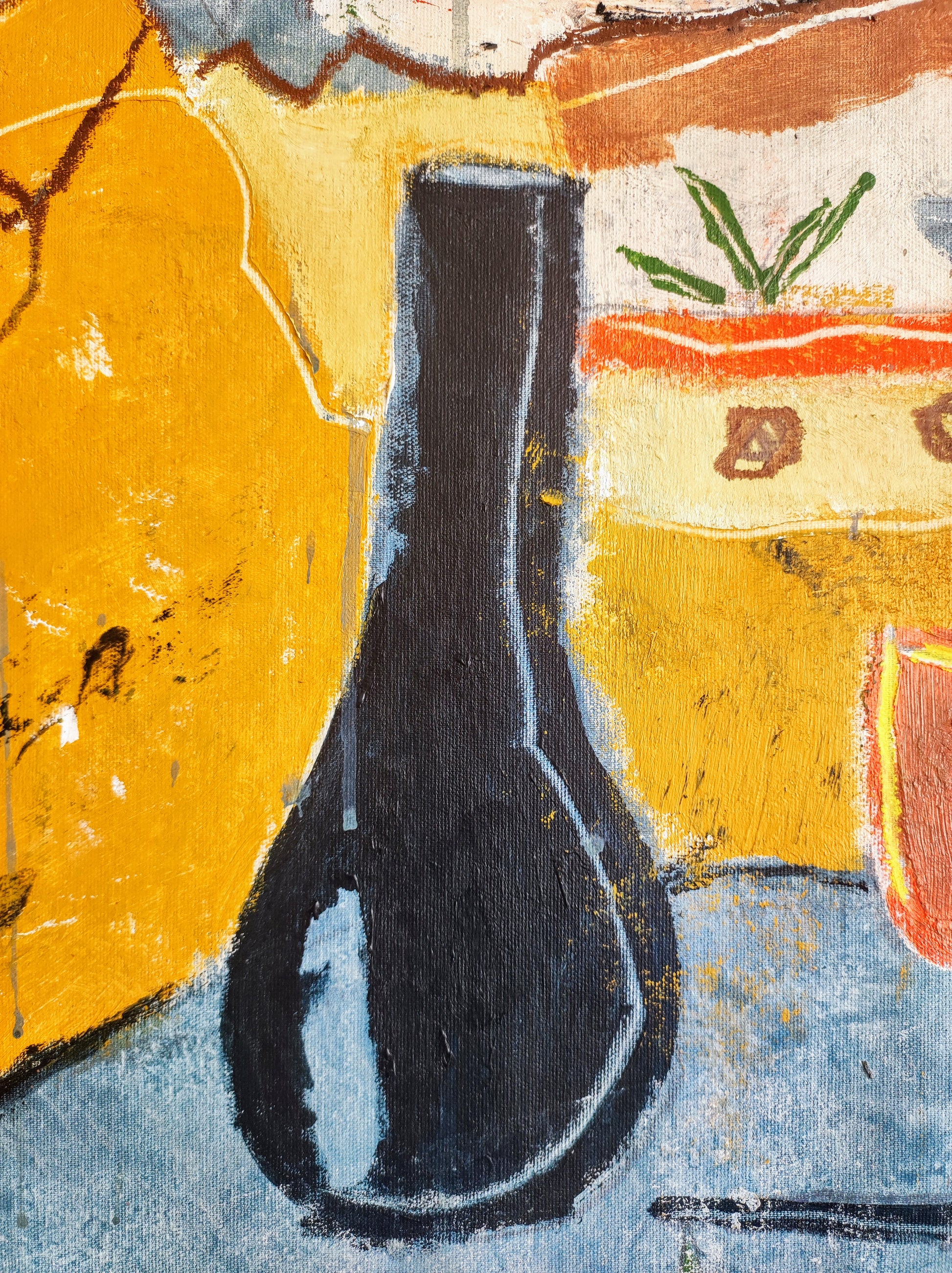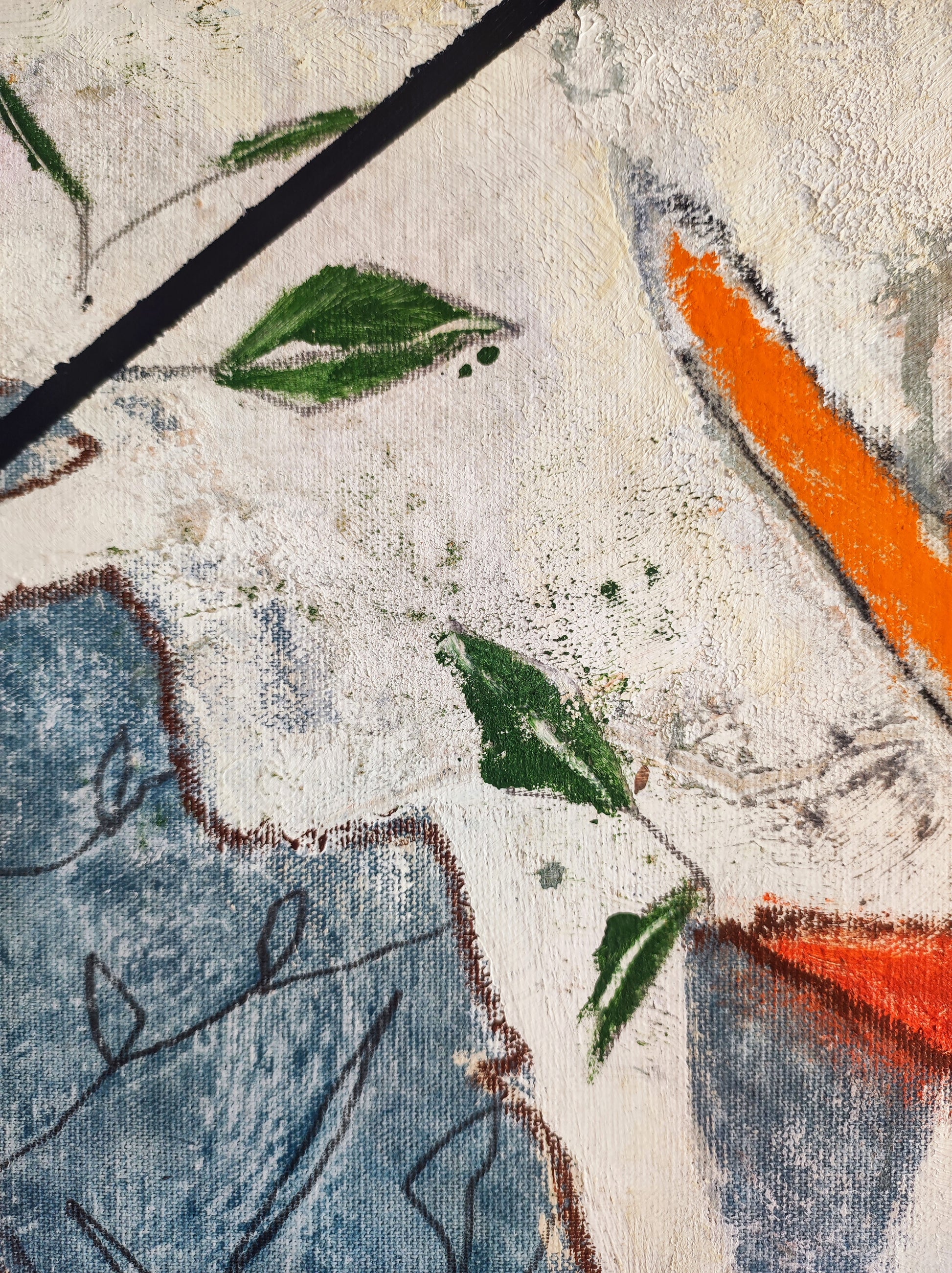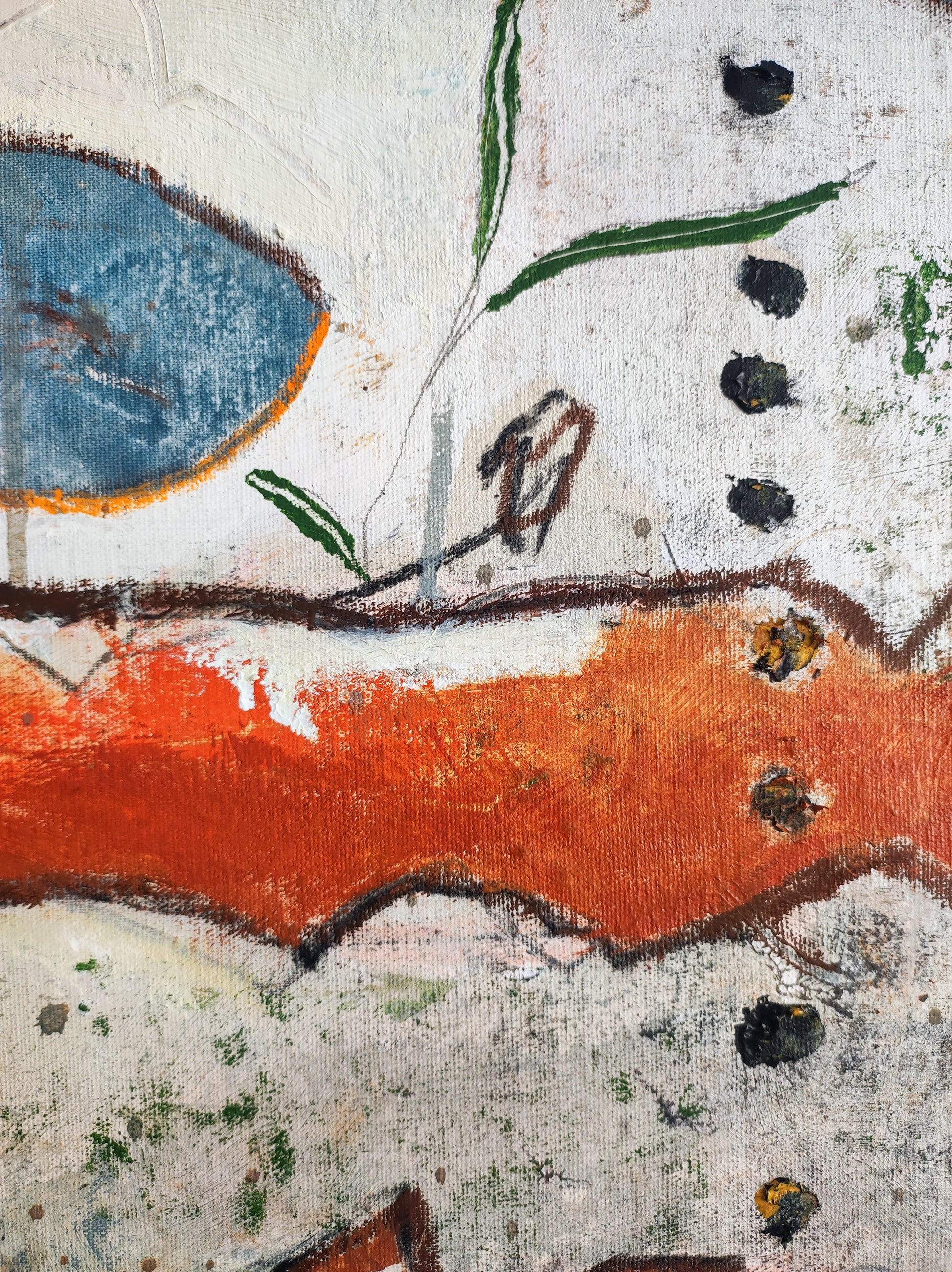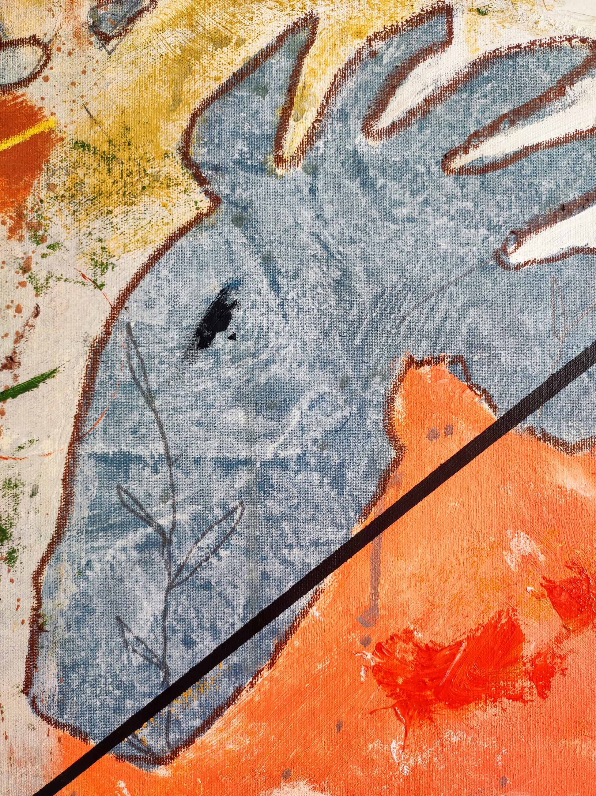 Pintura gestual, intuitiva, que deja que las cosas pasen y se apoya sobre lo que aparece. Aprovechando el accidente y aceptando las consecuencias.
