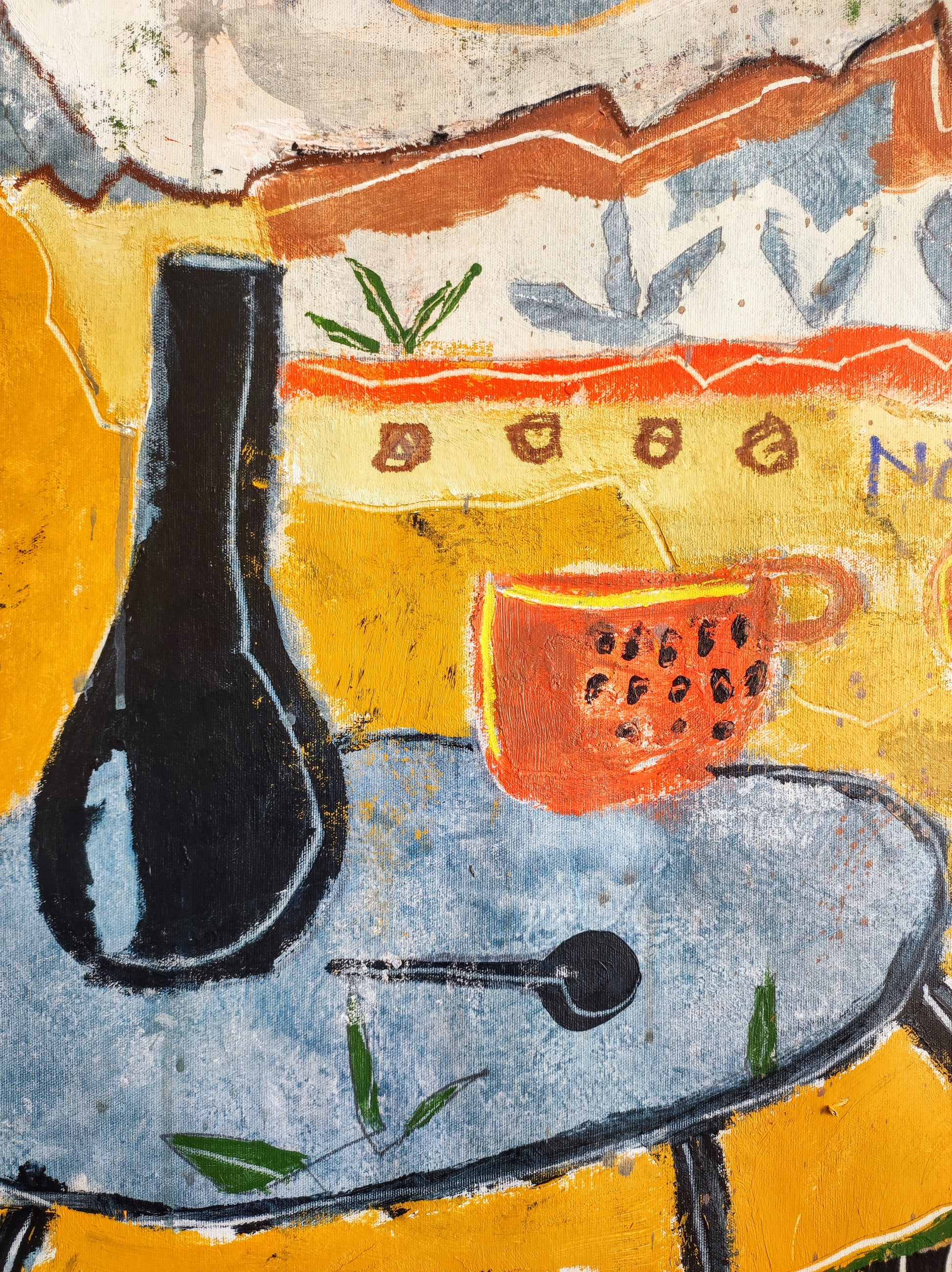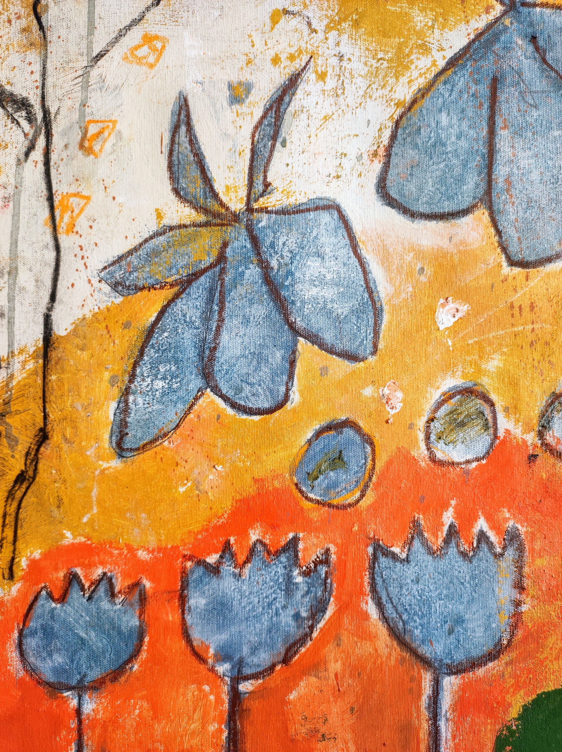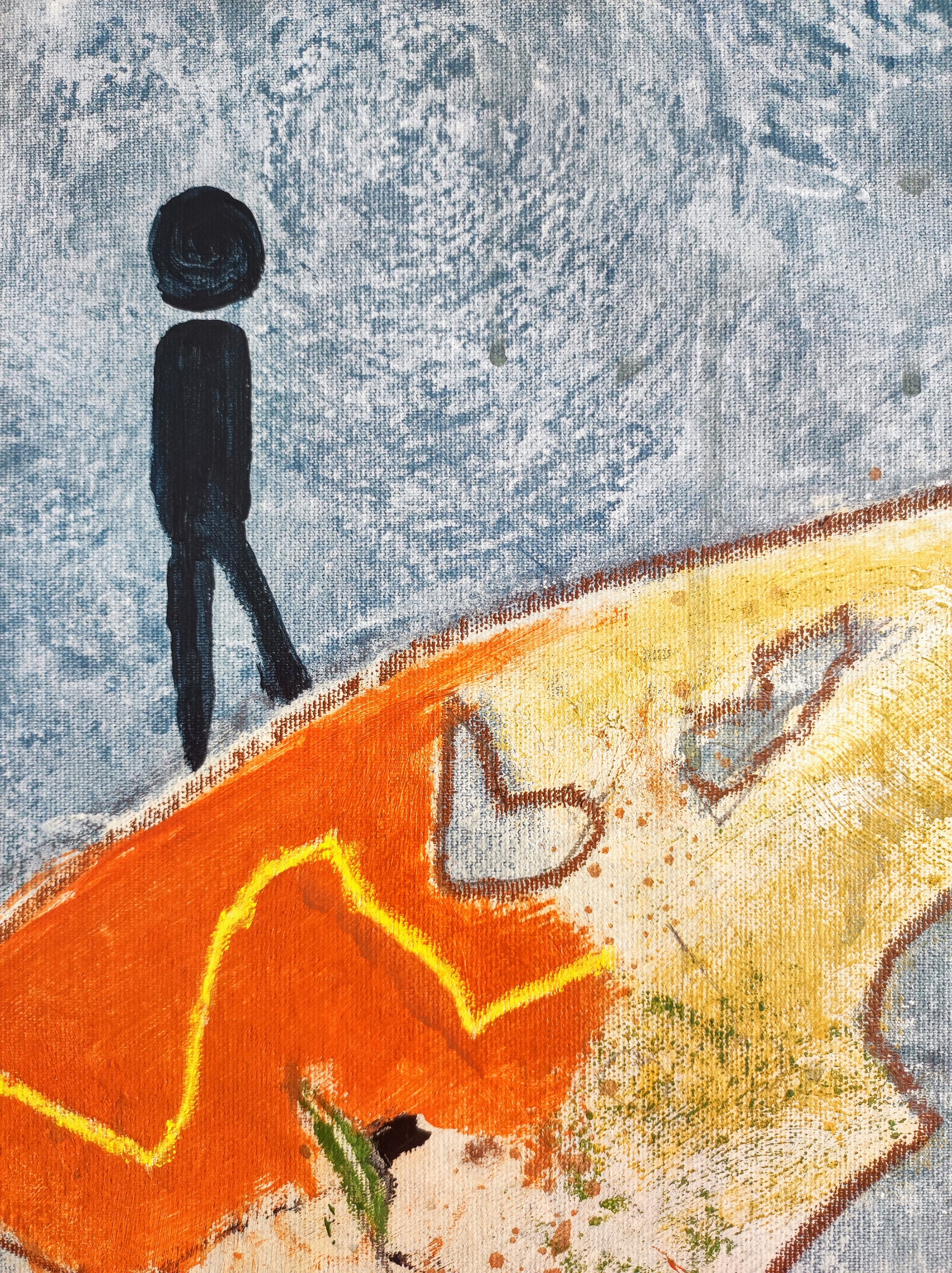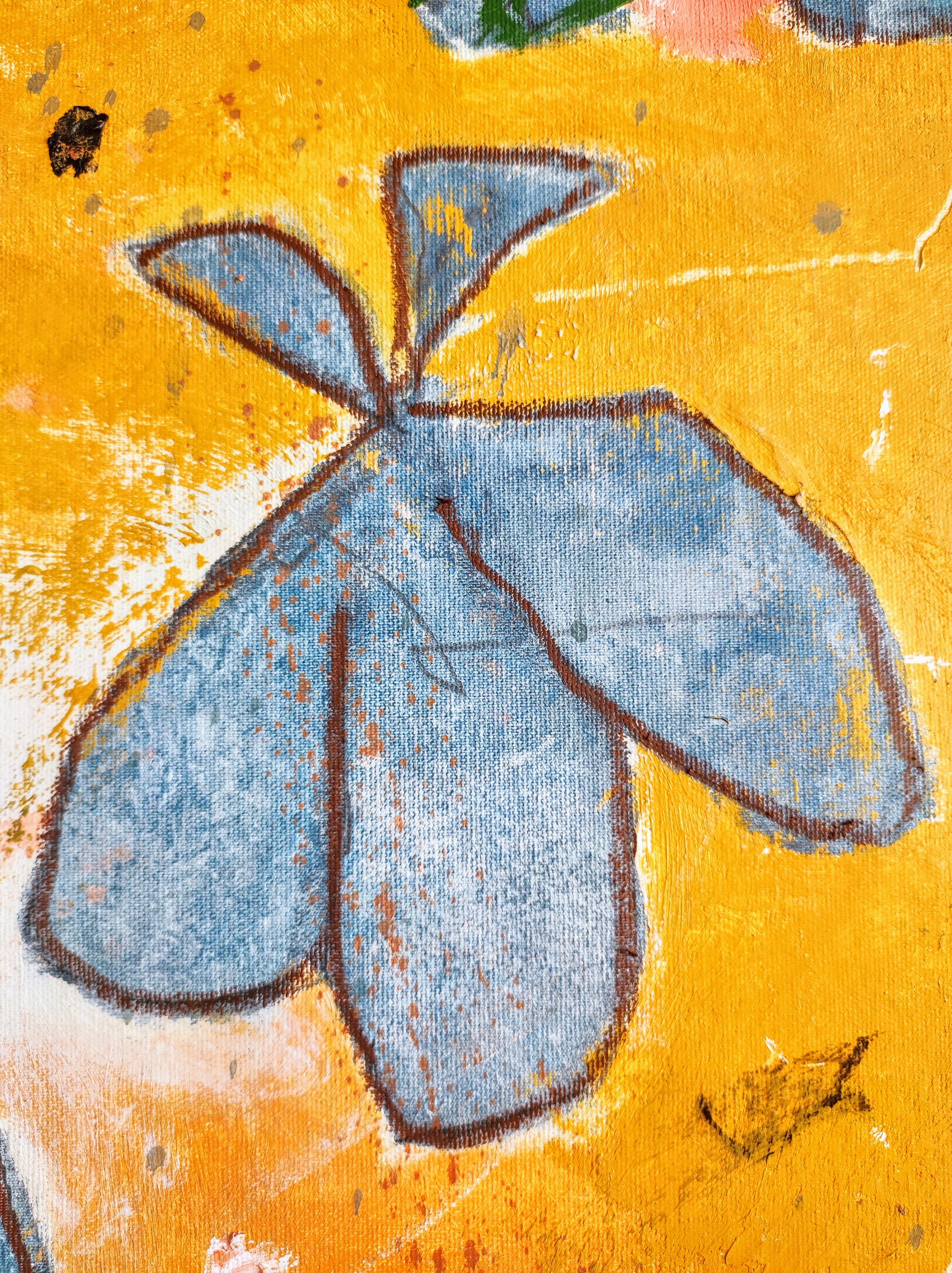 Pintura gestual, intuitiva, que deja que las cosas pasen y se apoya sobre lo que aparece. Aprovechando el accidente y aceptando las consecuencias.