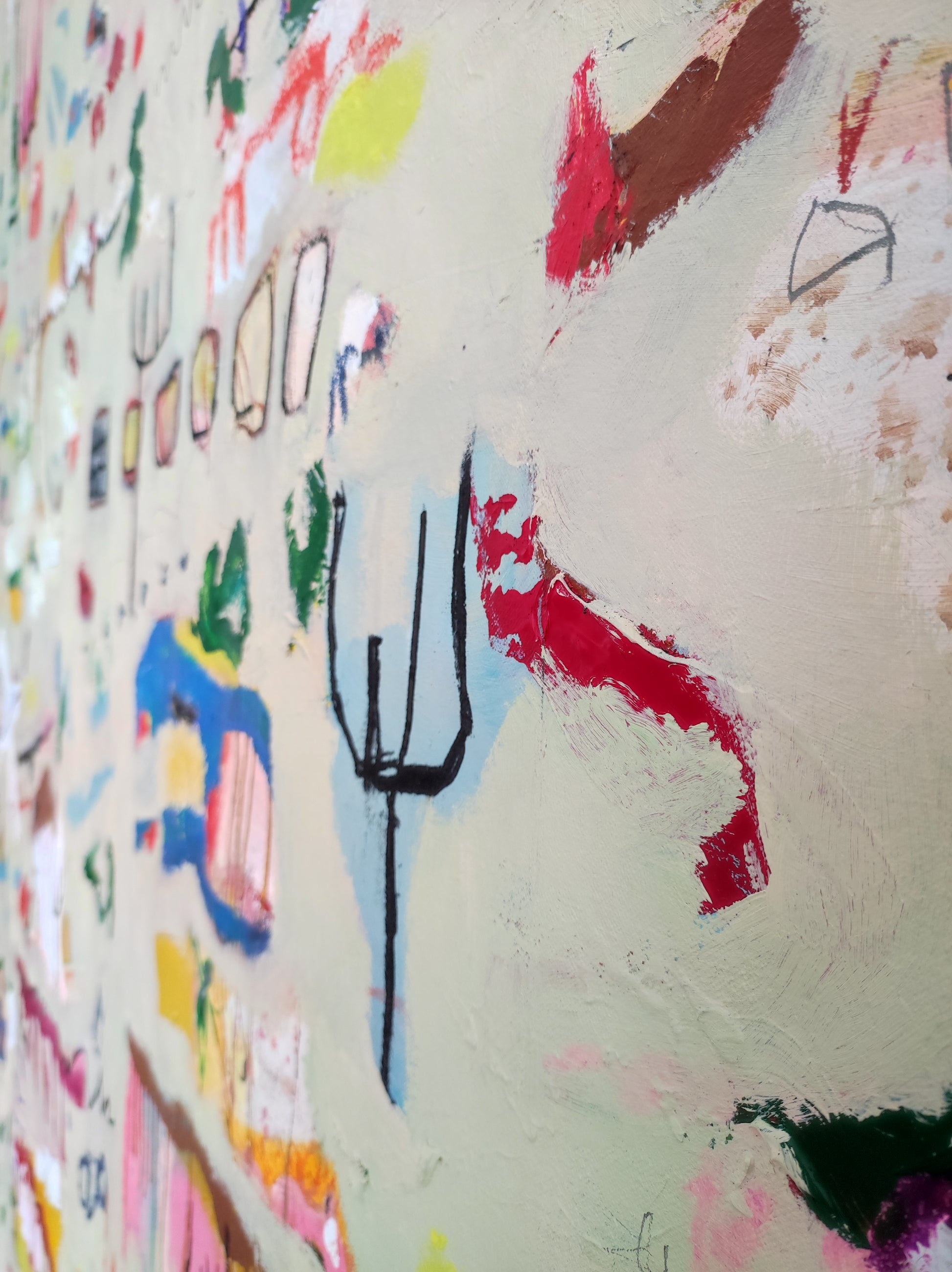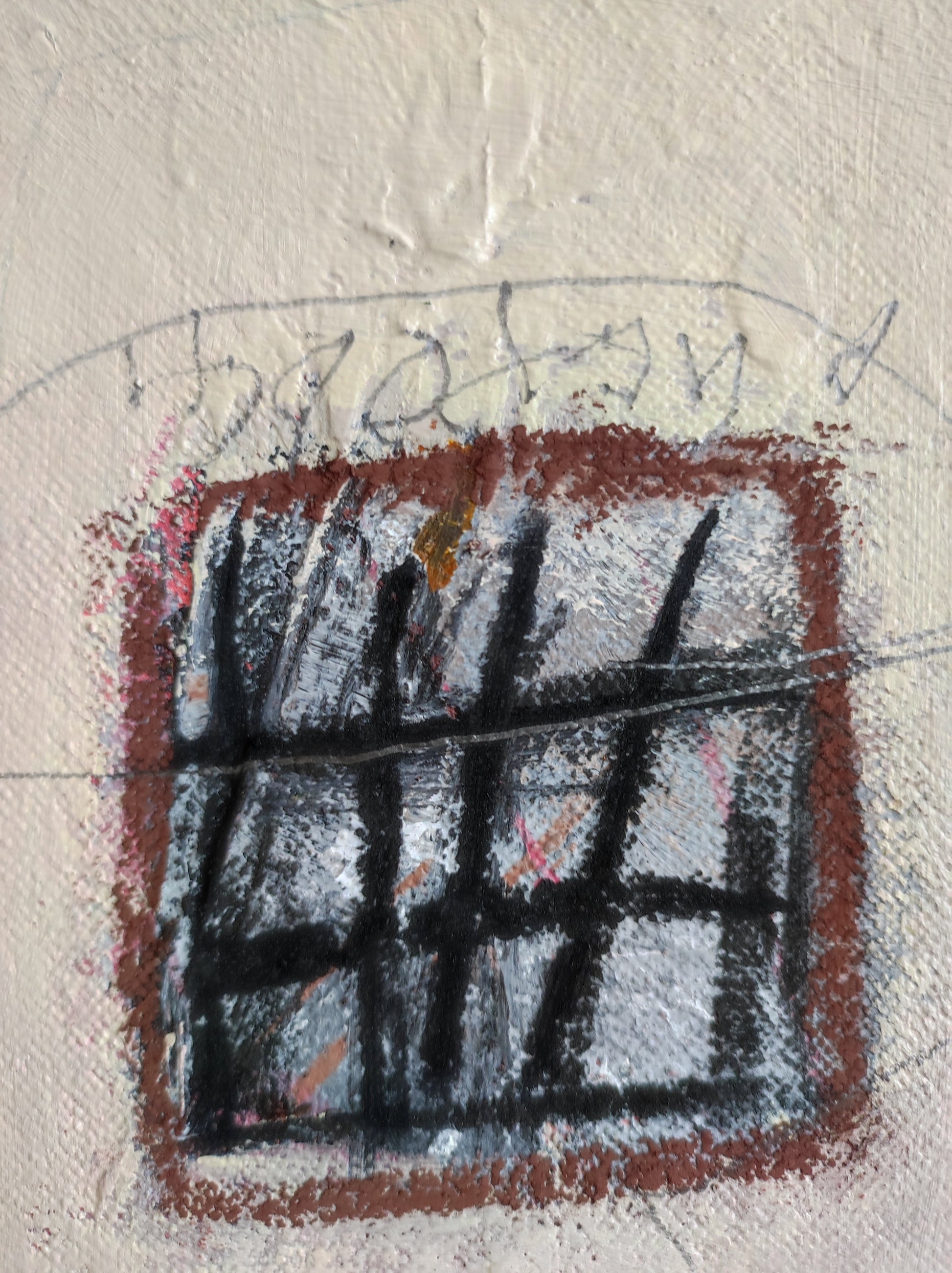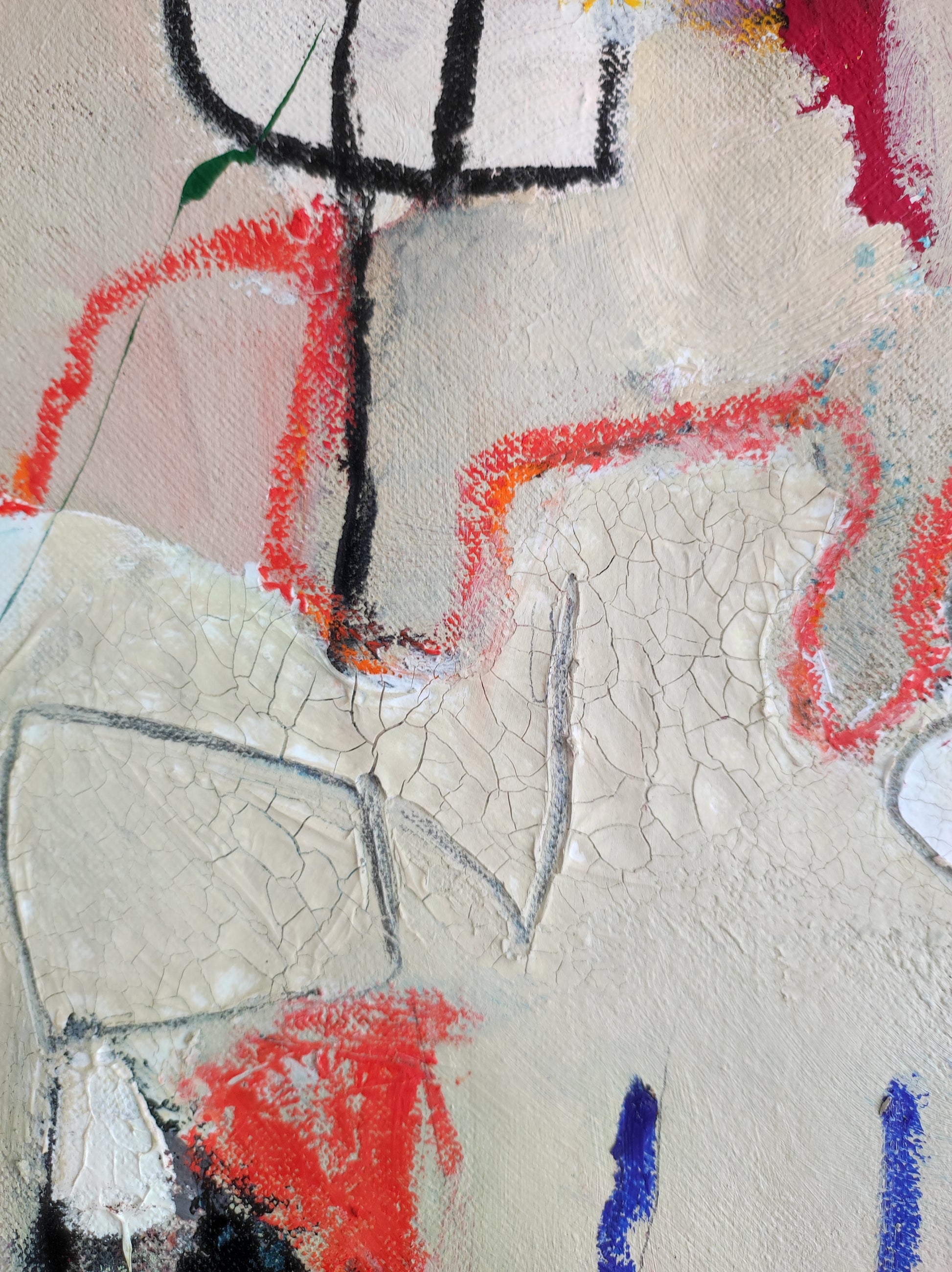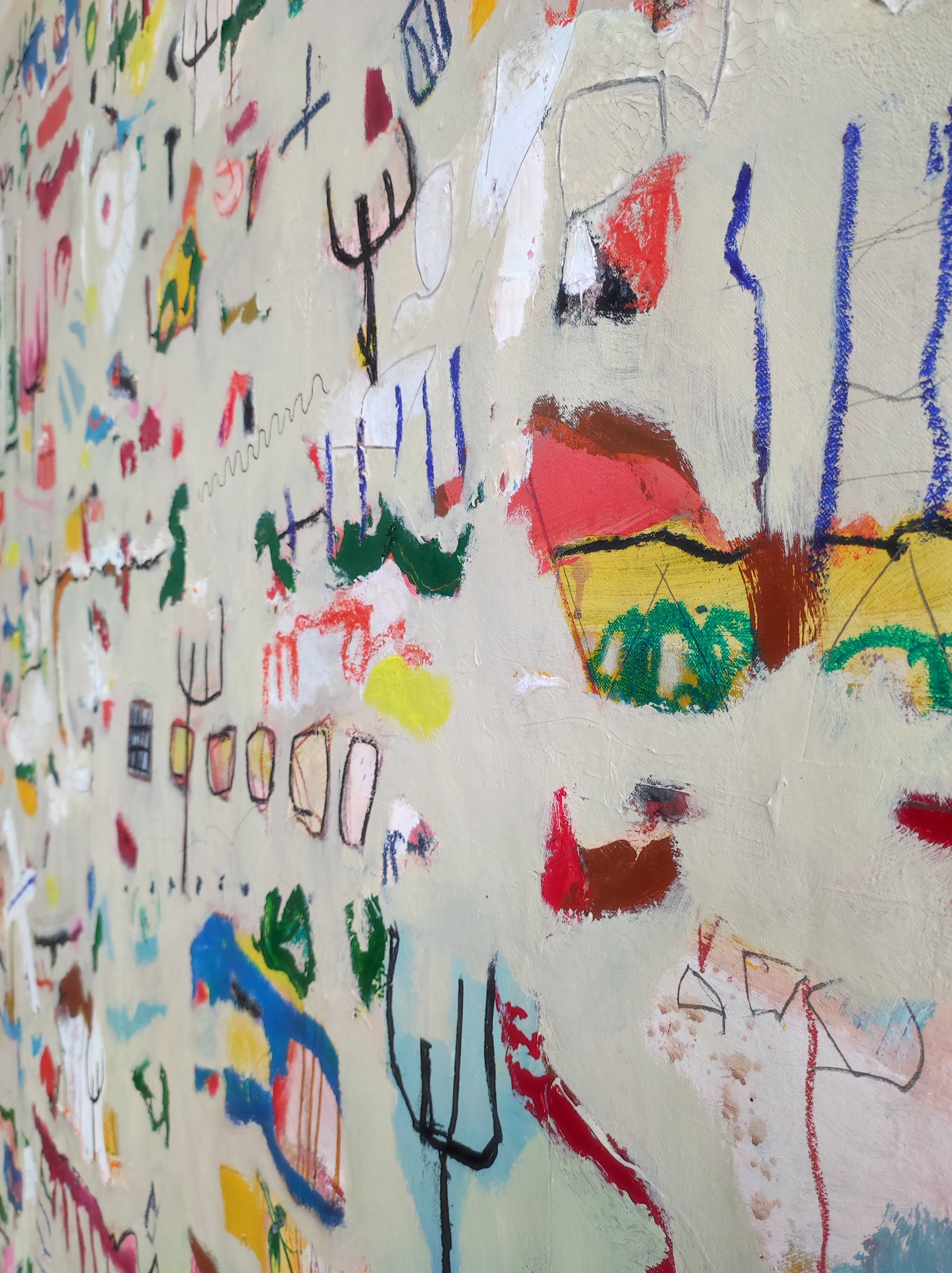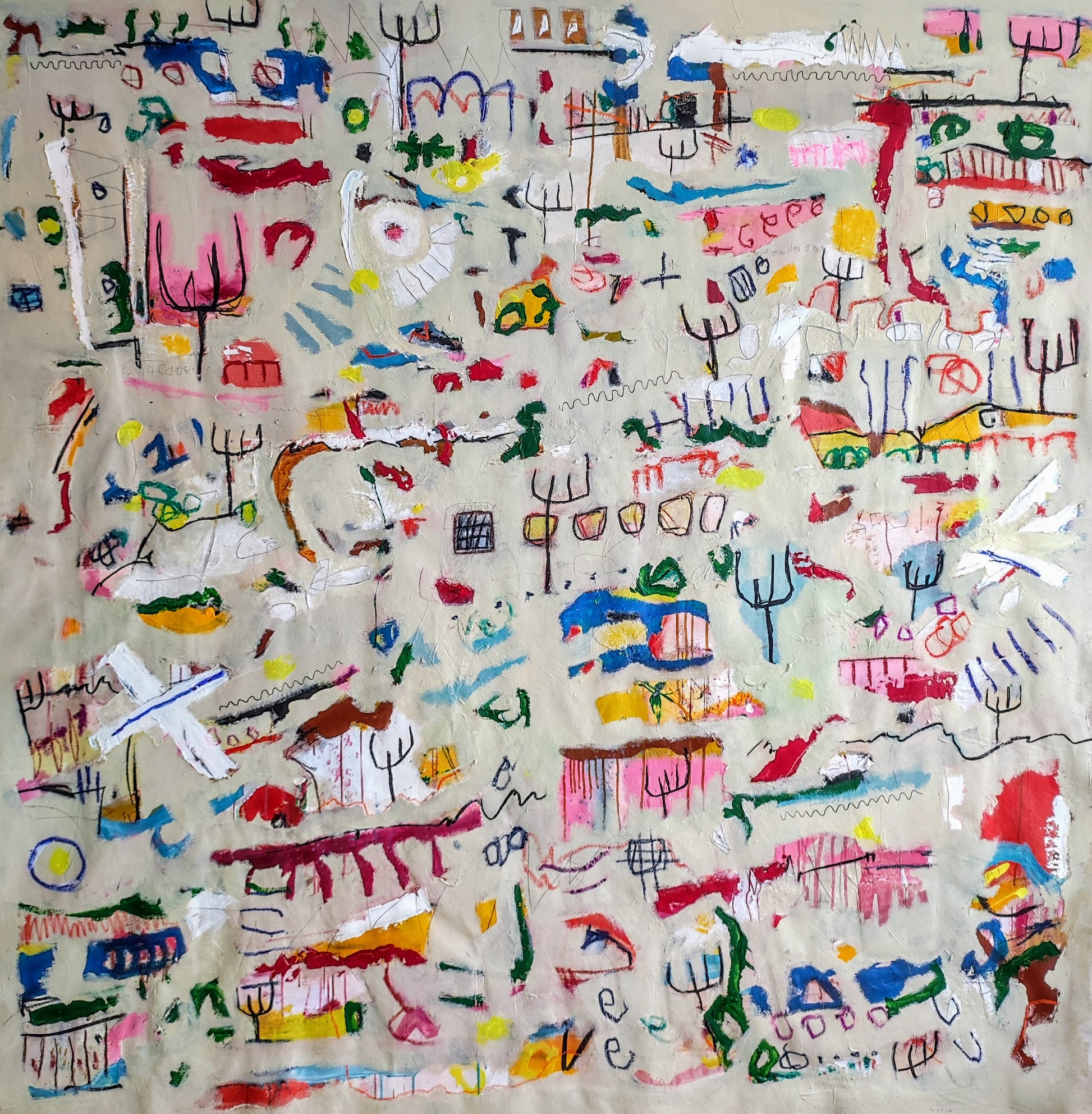 Técnica: acrílico, pigmentos, gesso, pintura en spray, ceras, carboncillo y lápiz.
