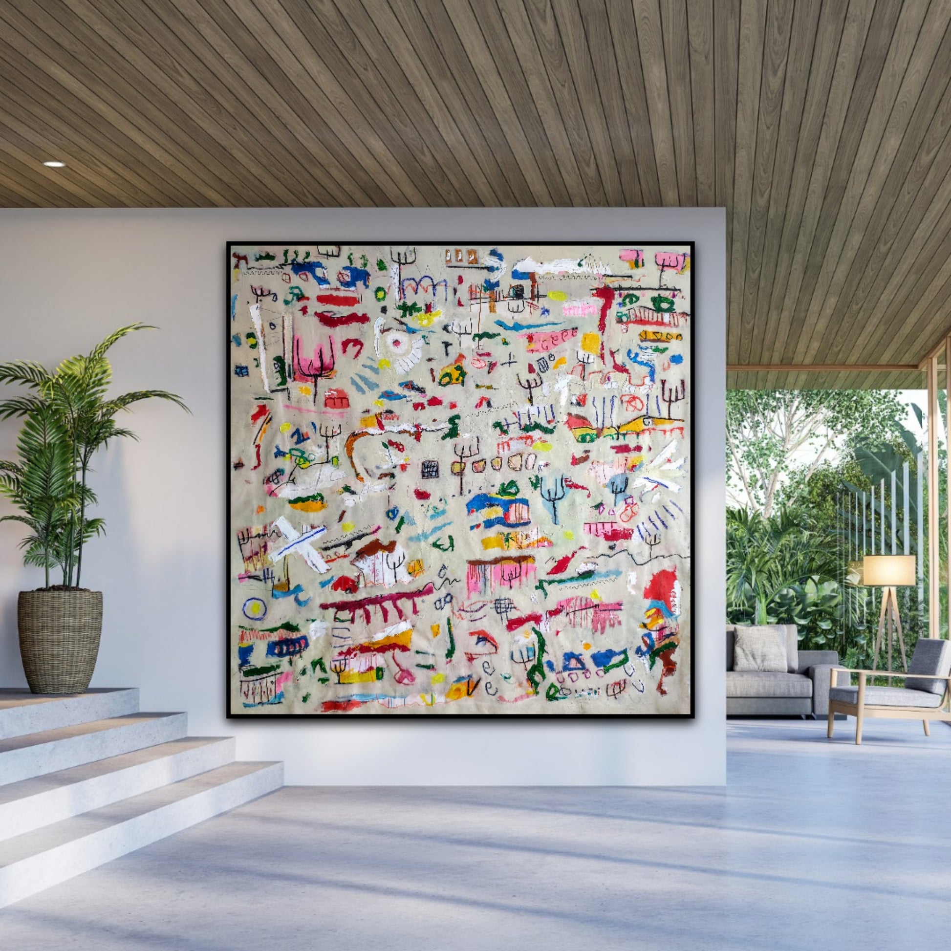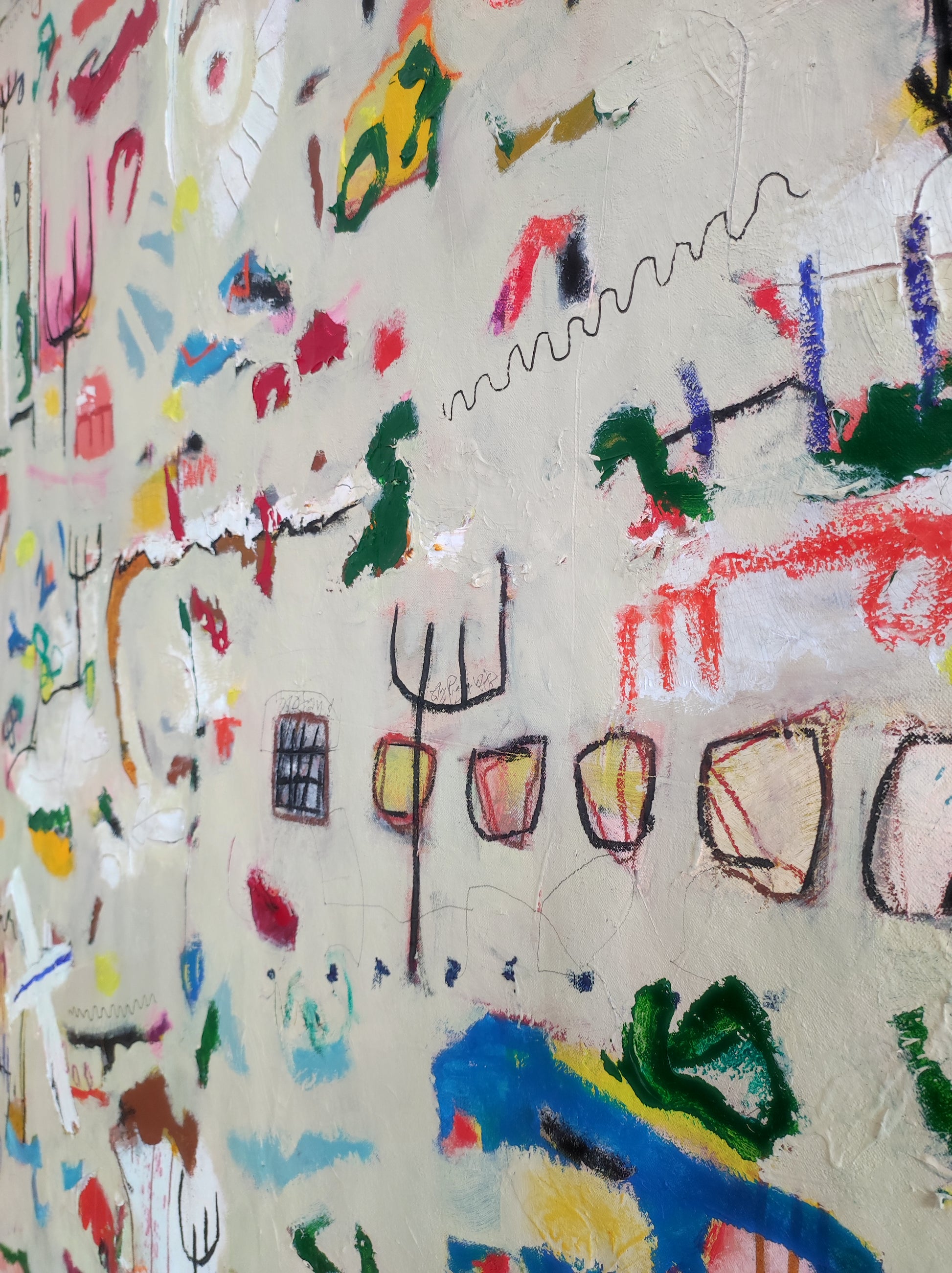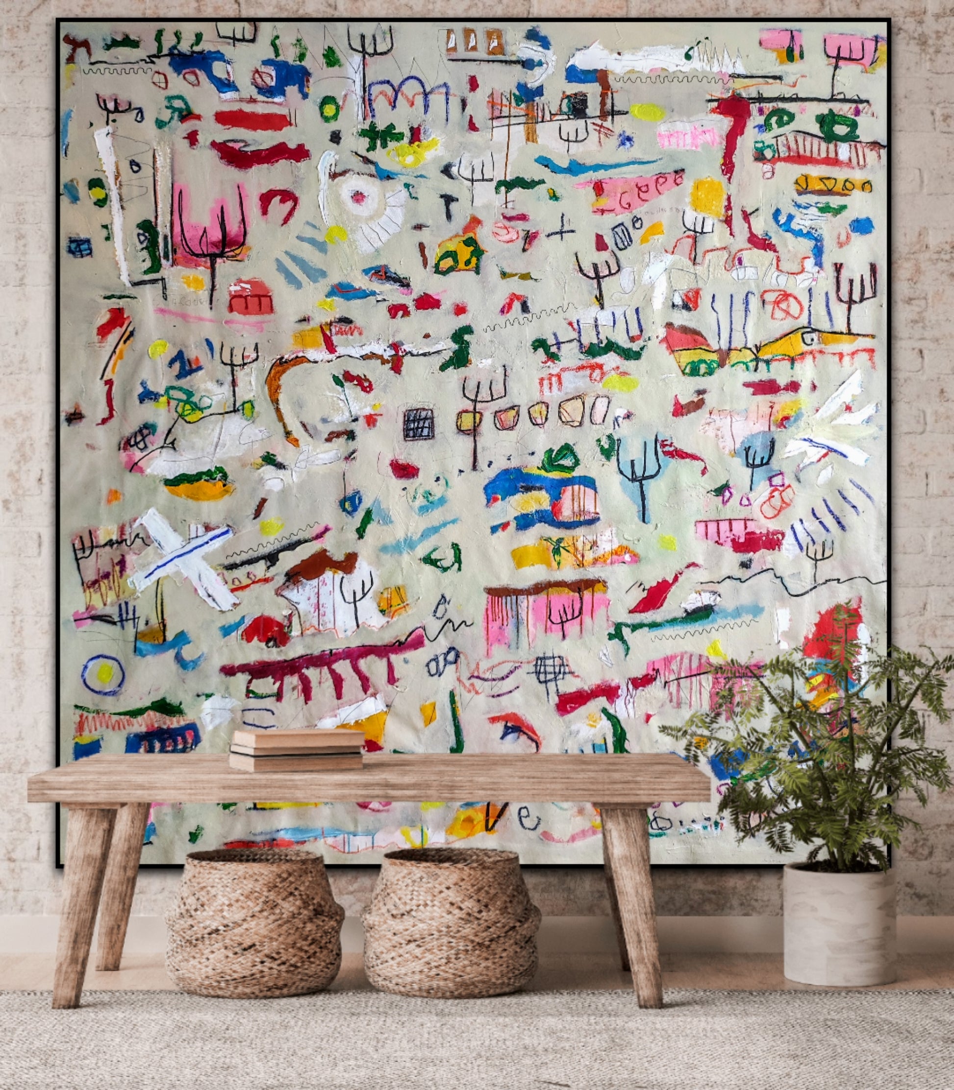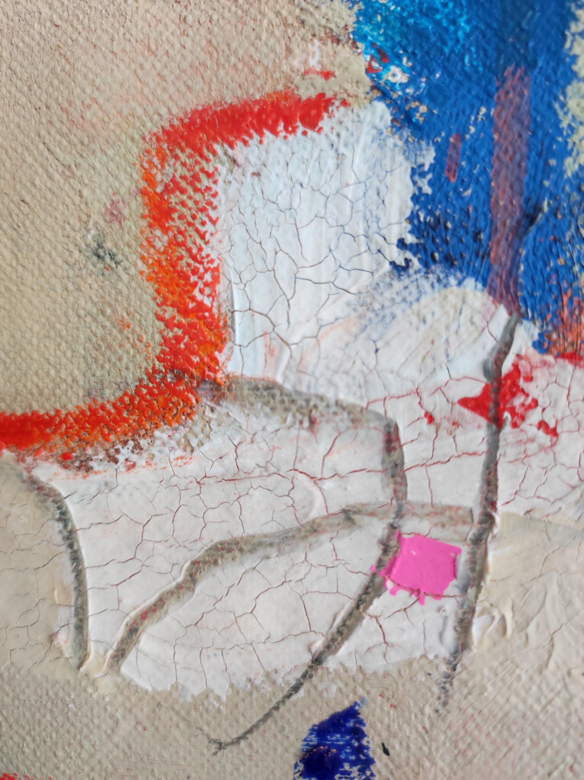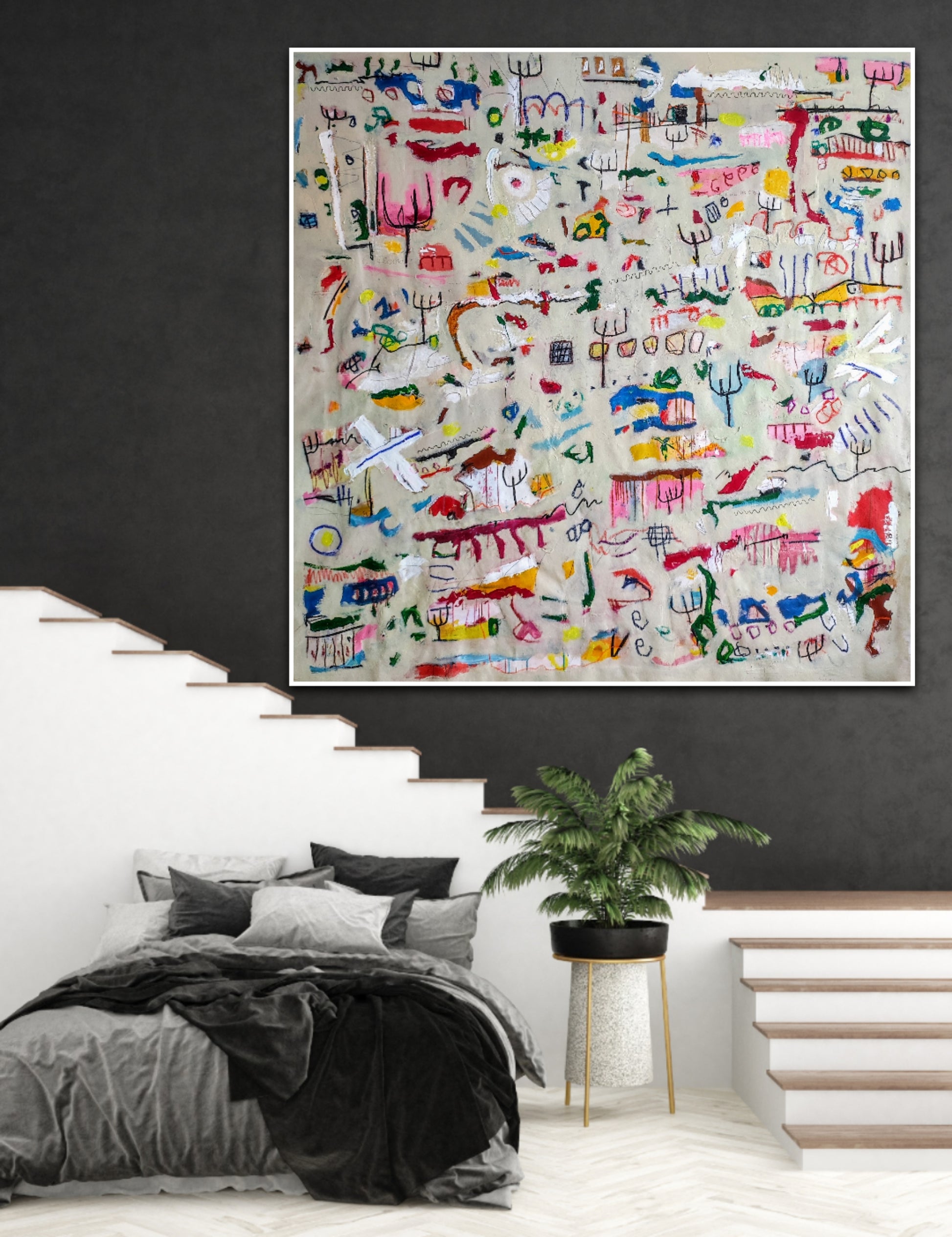 Técnica: acrílico, pigmentos, gesso, pintura en spray, ceras, carboncillo y lápiz.