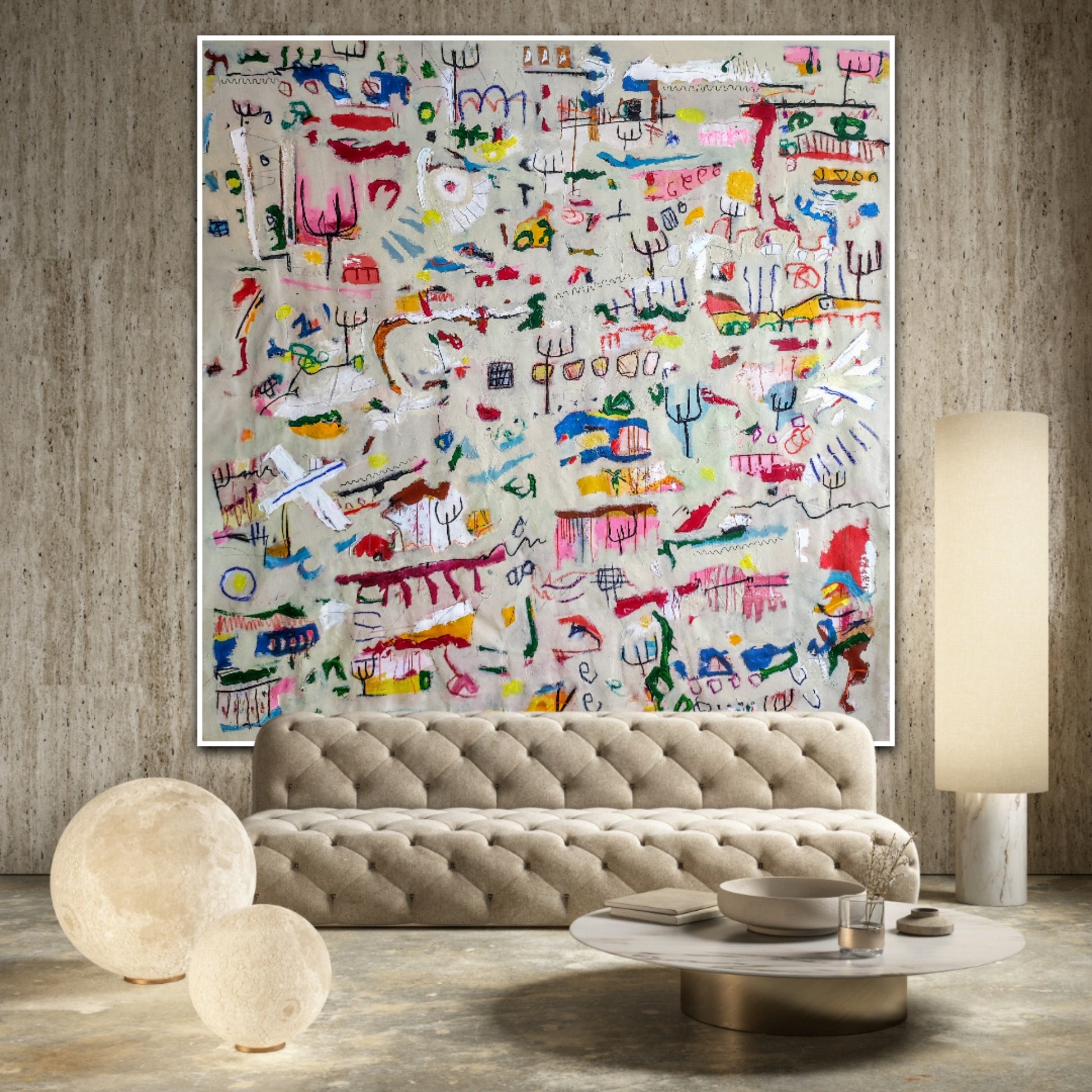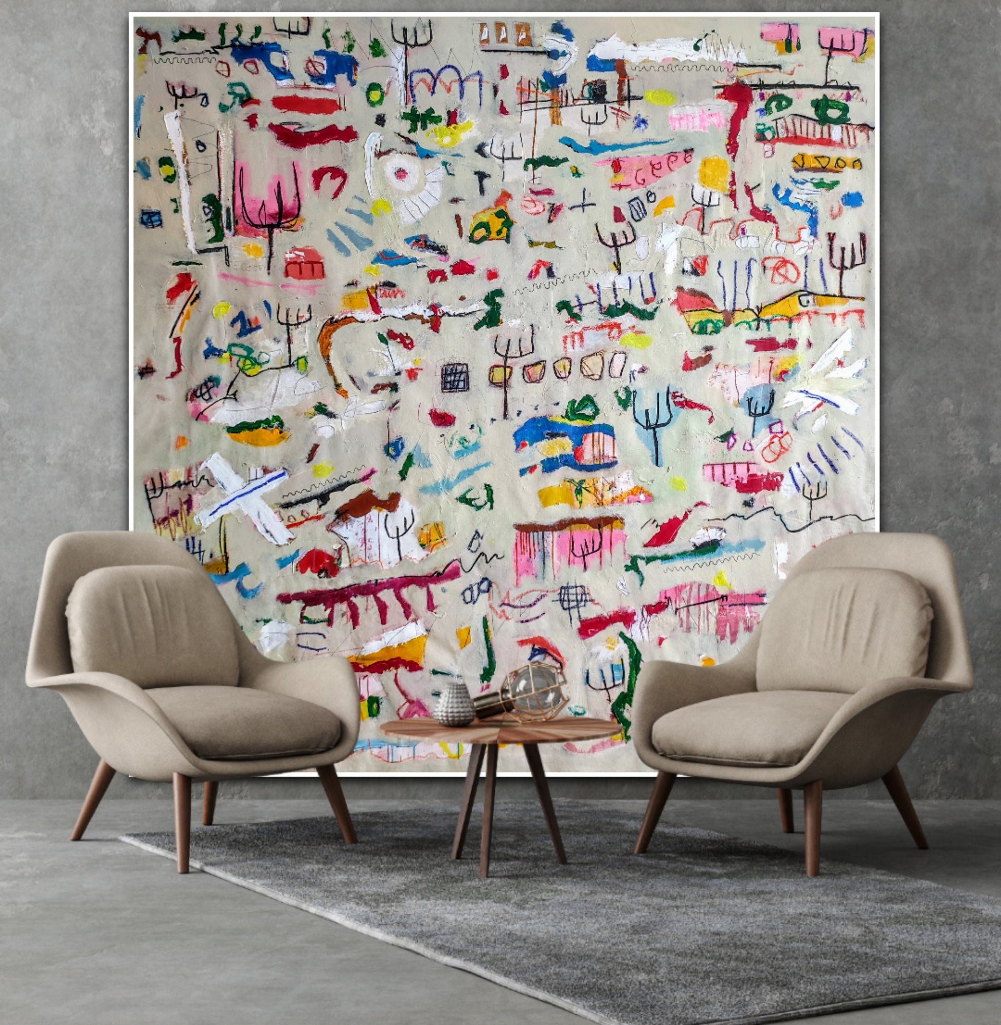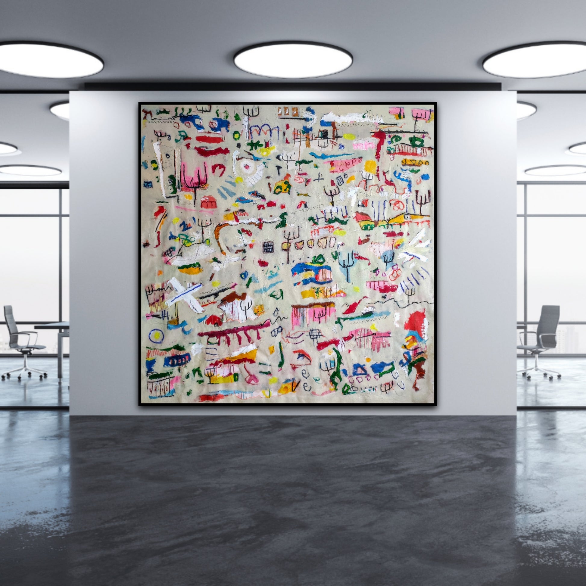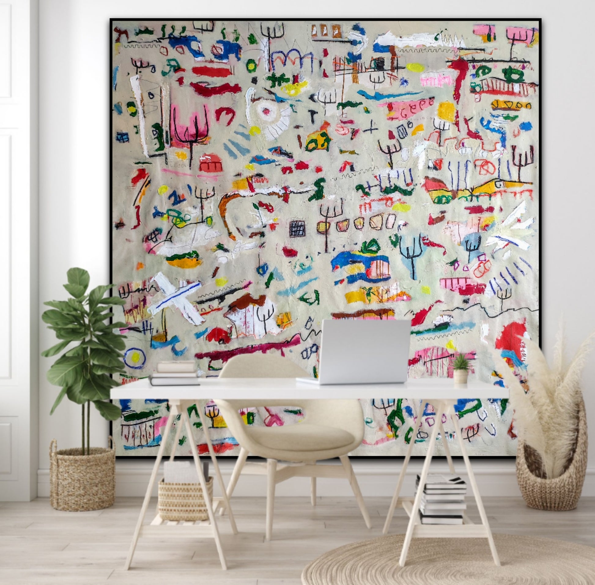 Técnica: acrílico, pigmentos, gesso, pintura en spray, ceras, carboncillo y lápiz.