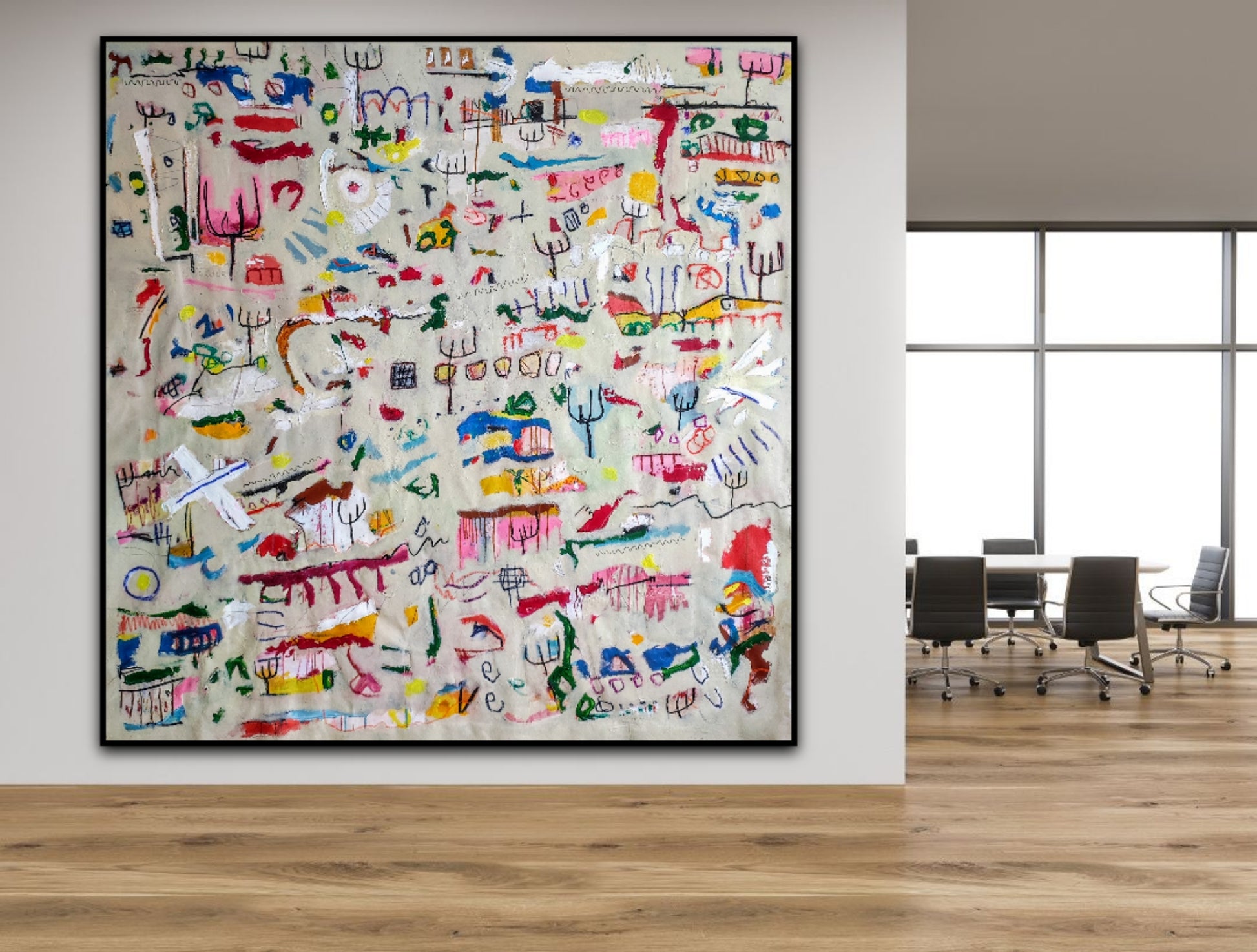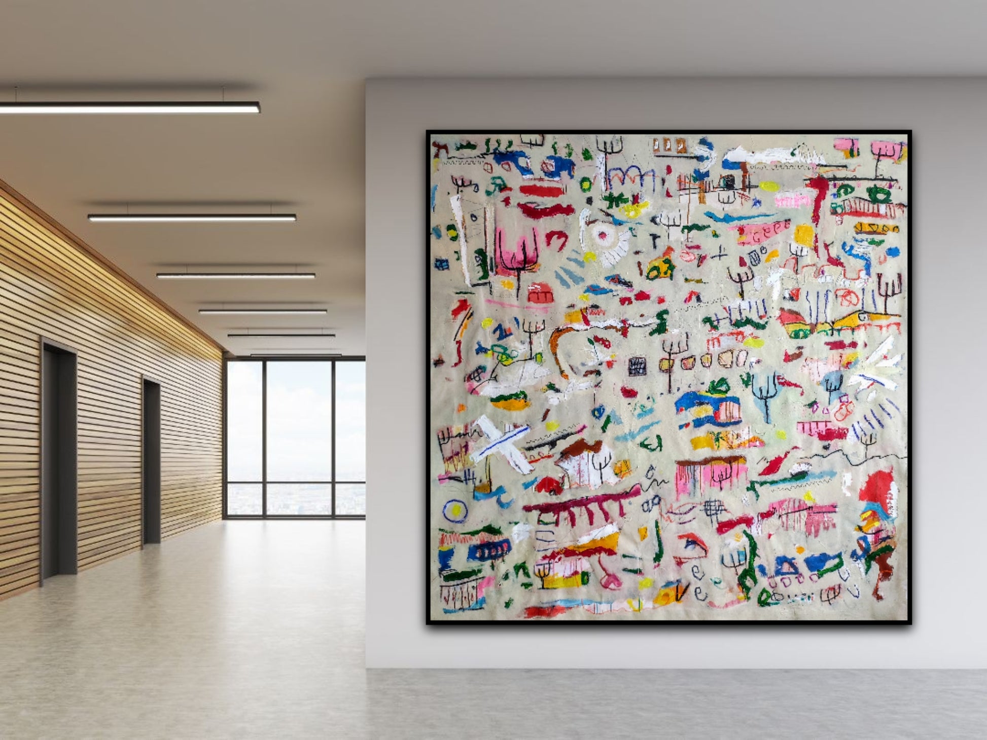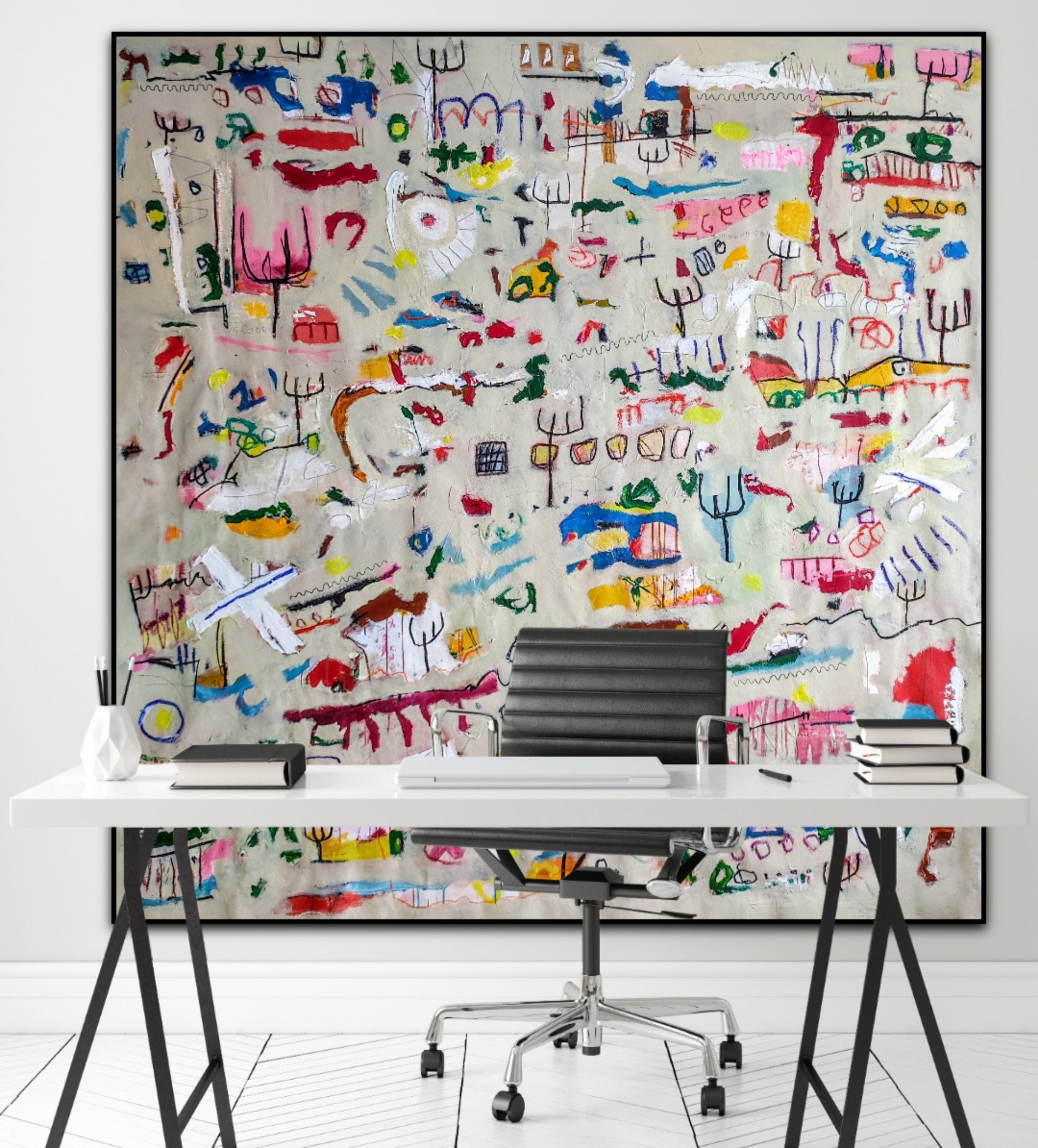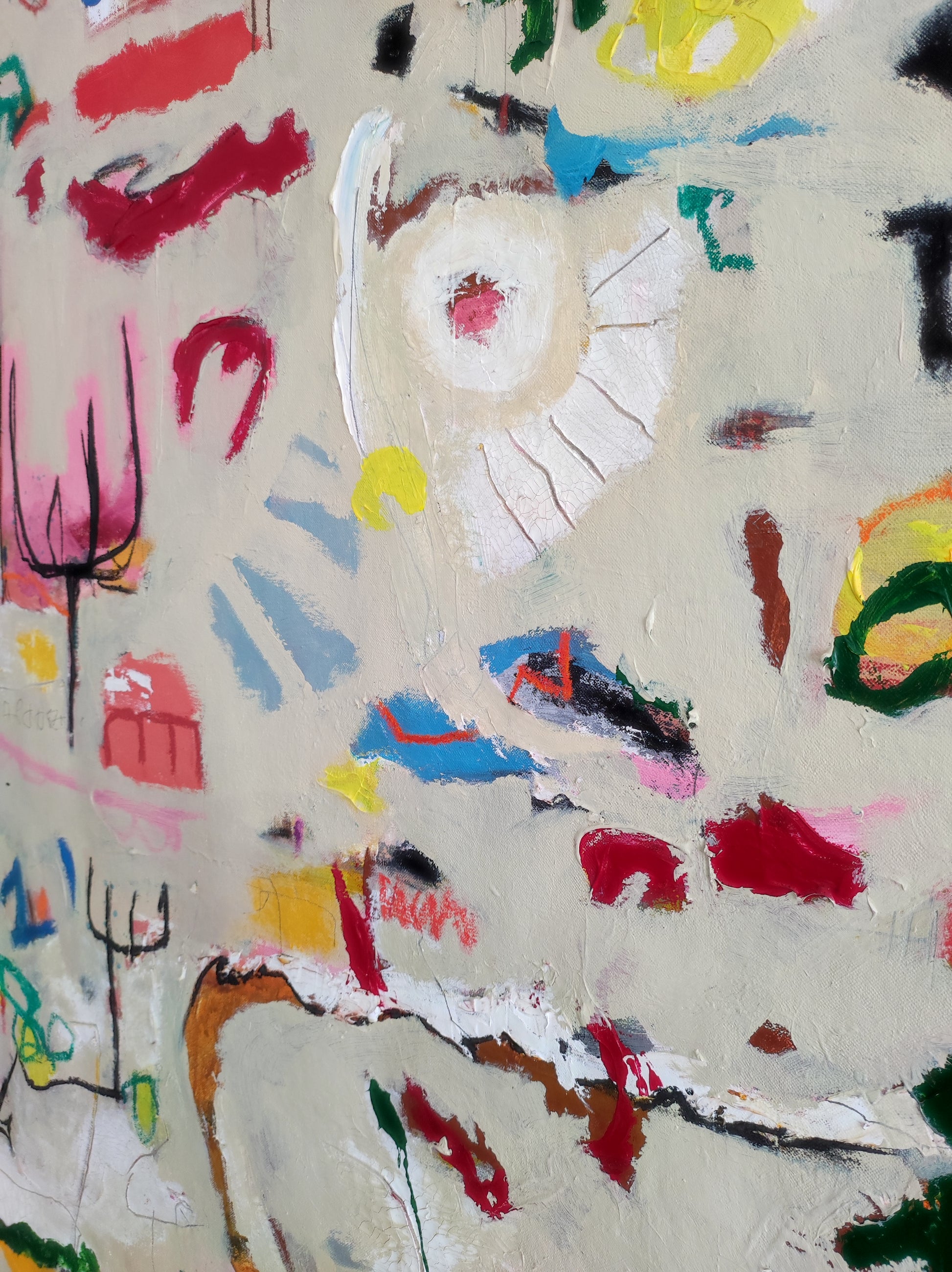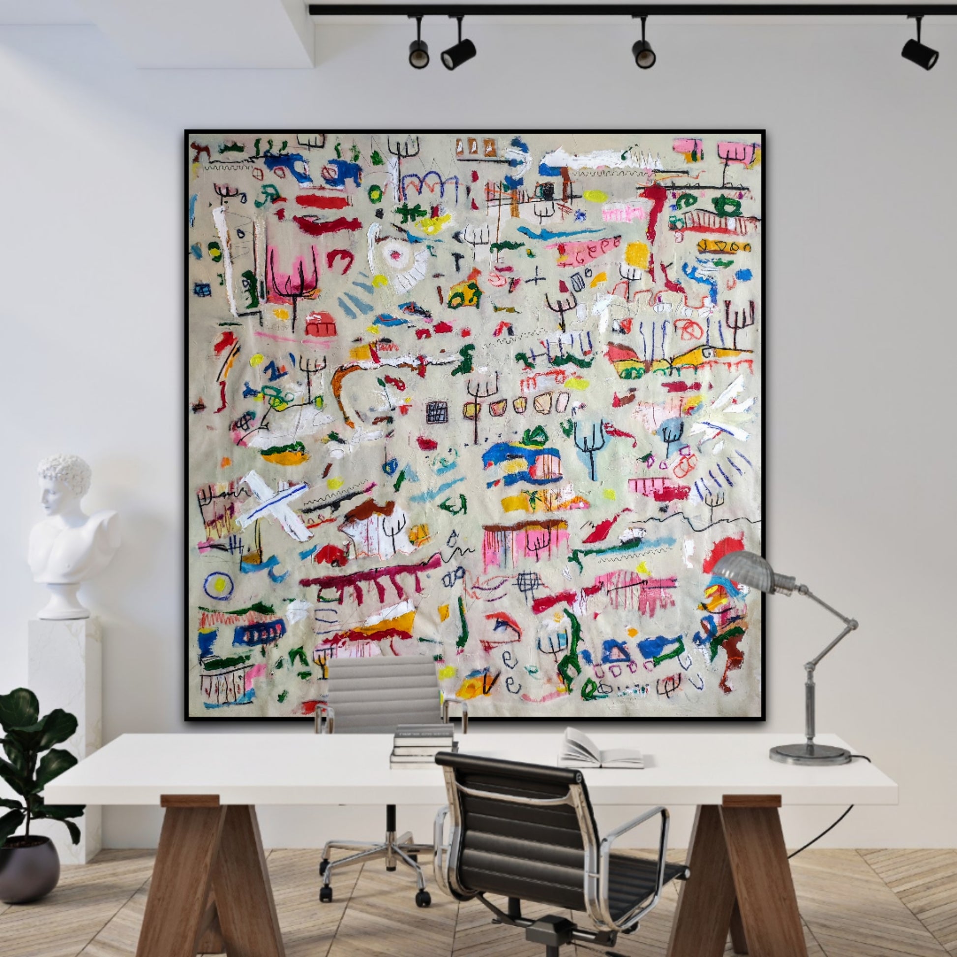 Técnica: acrílico, pigmentos, gesso, pintura en spray, ceras, carboncillo y lápiz.