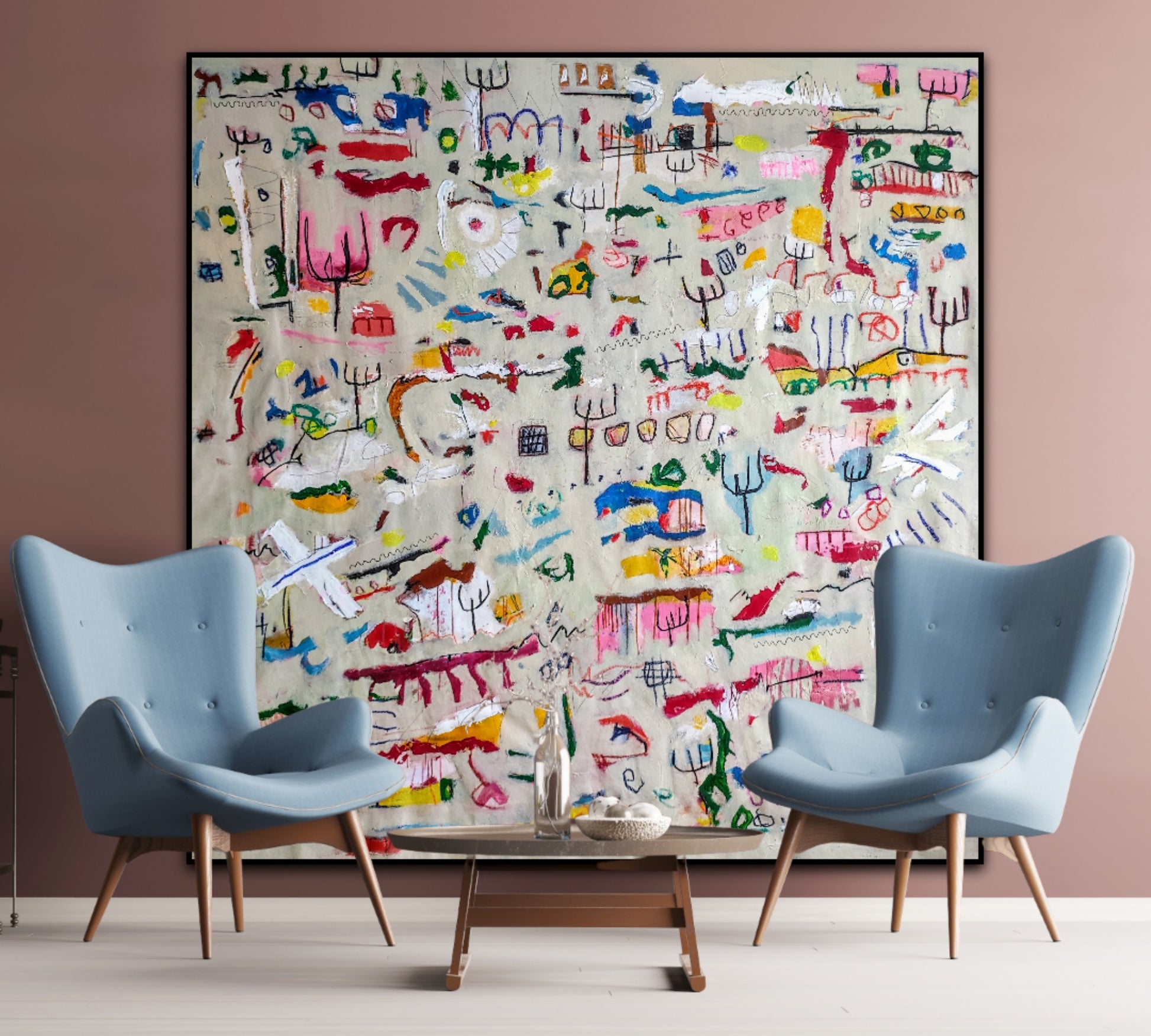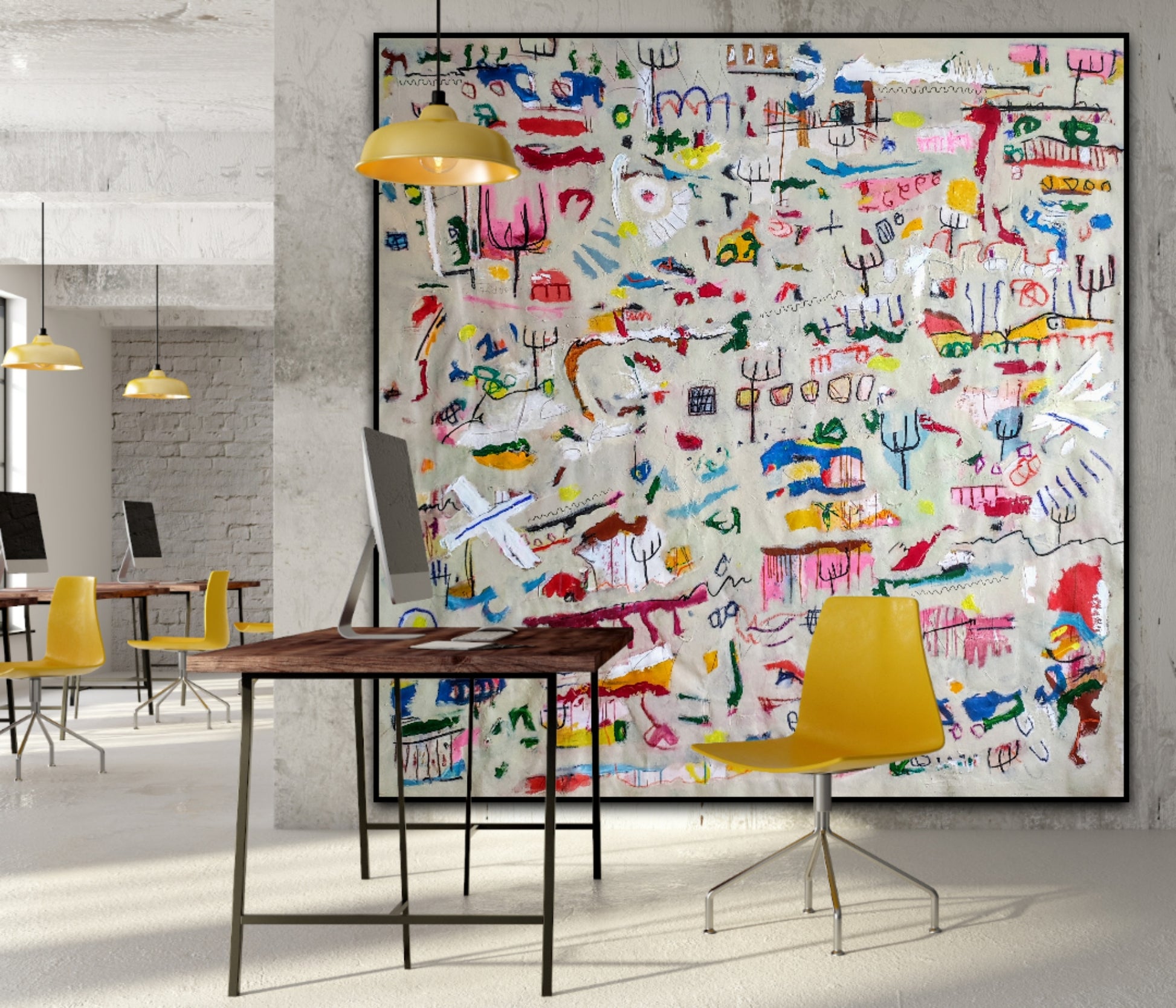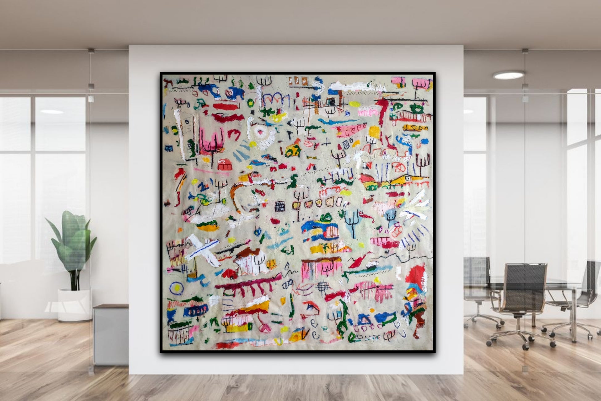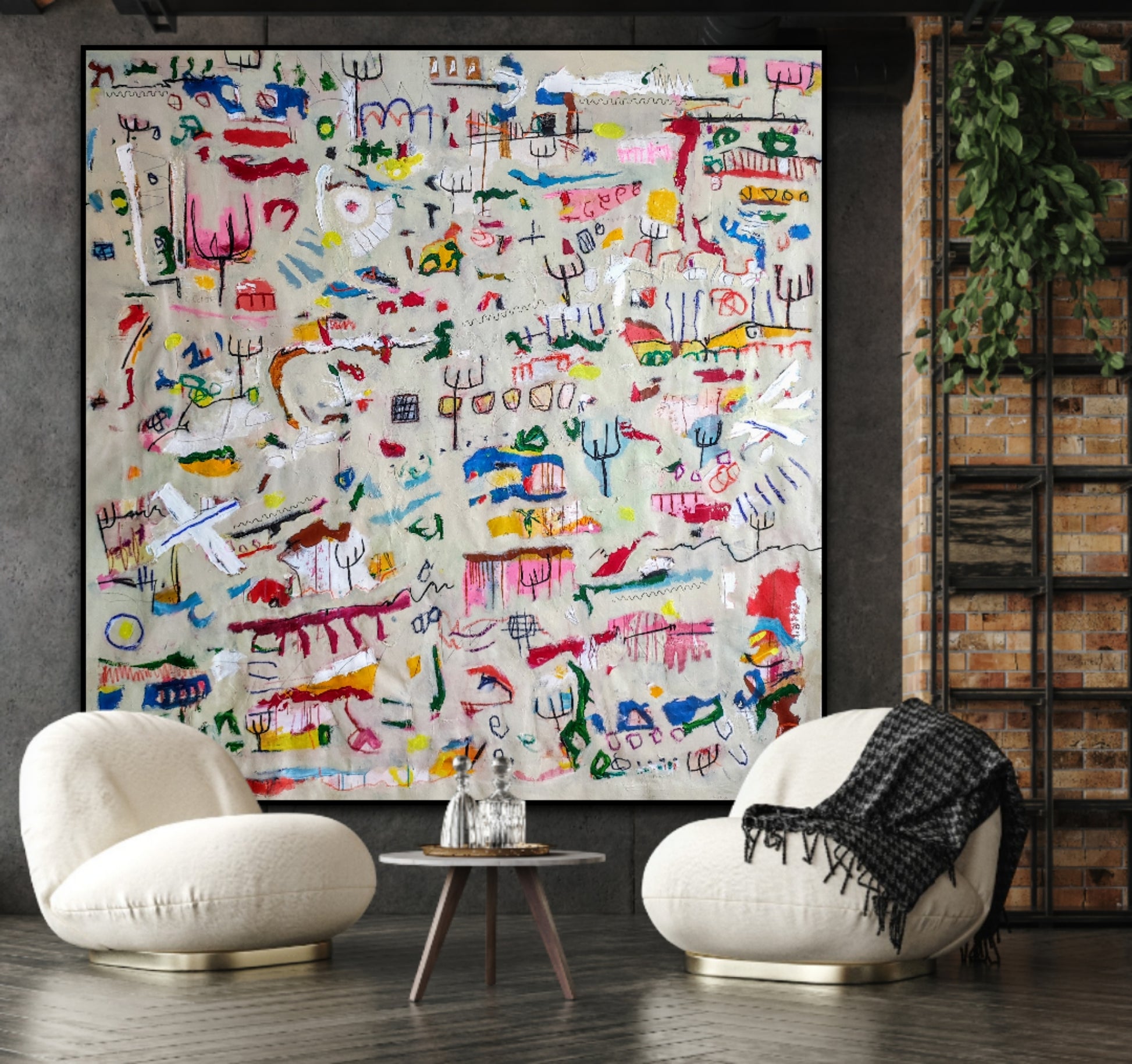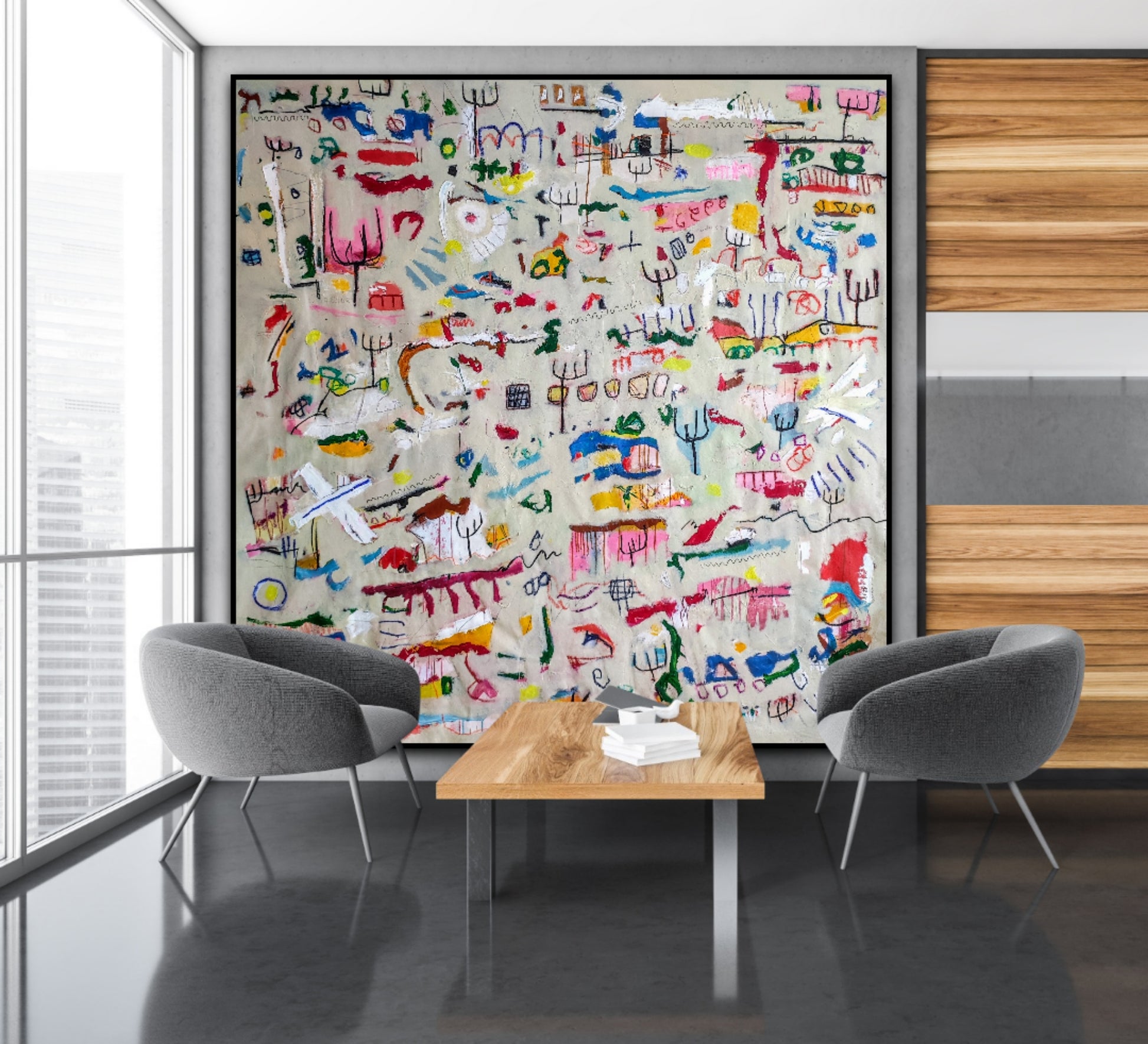 Técnica: acrílico, pigmentos, gesso, pintura en spray, ceras, carboncillo y lápiz.