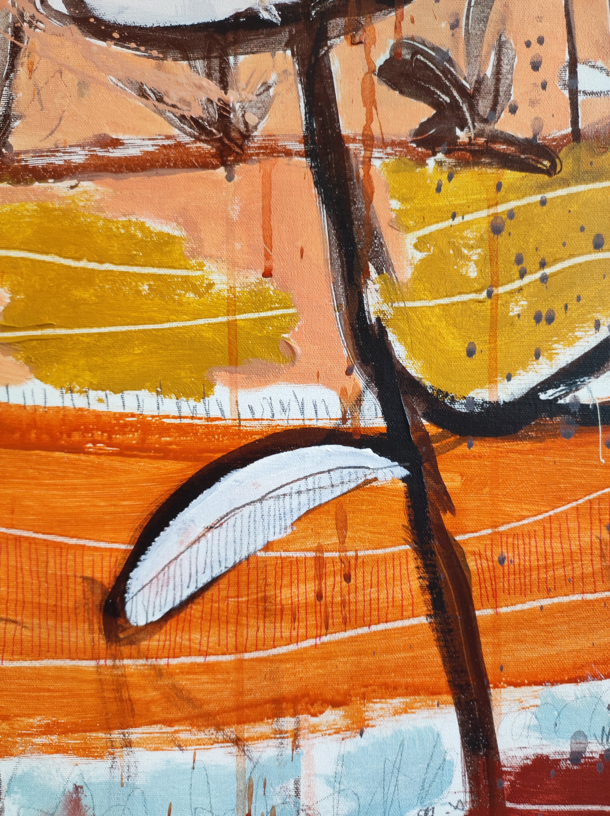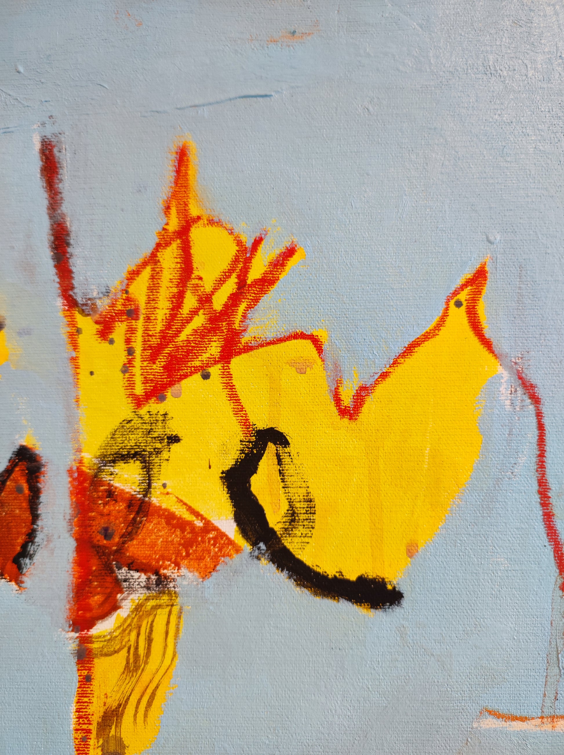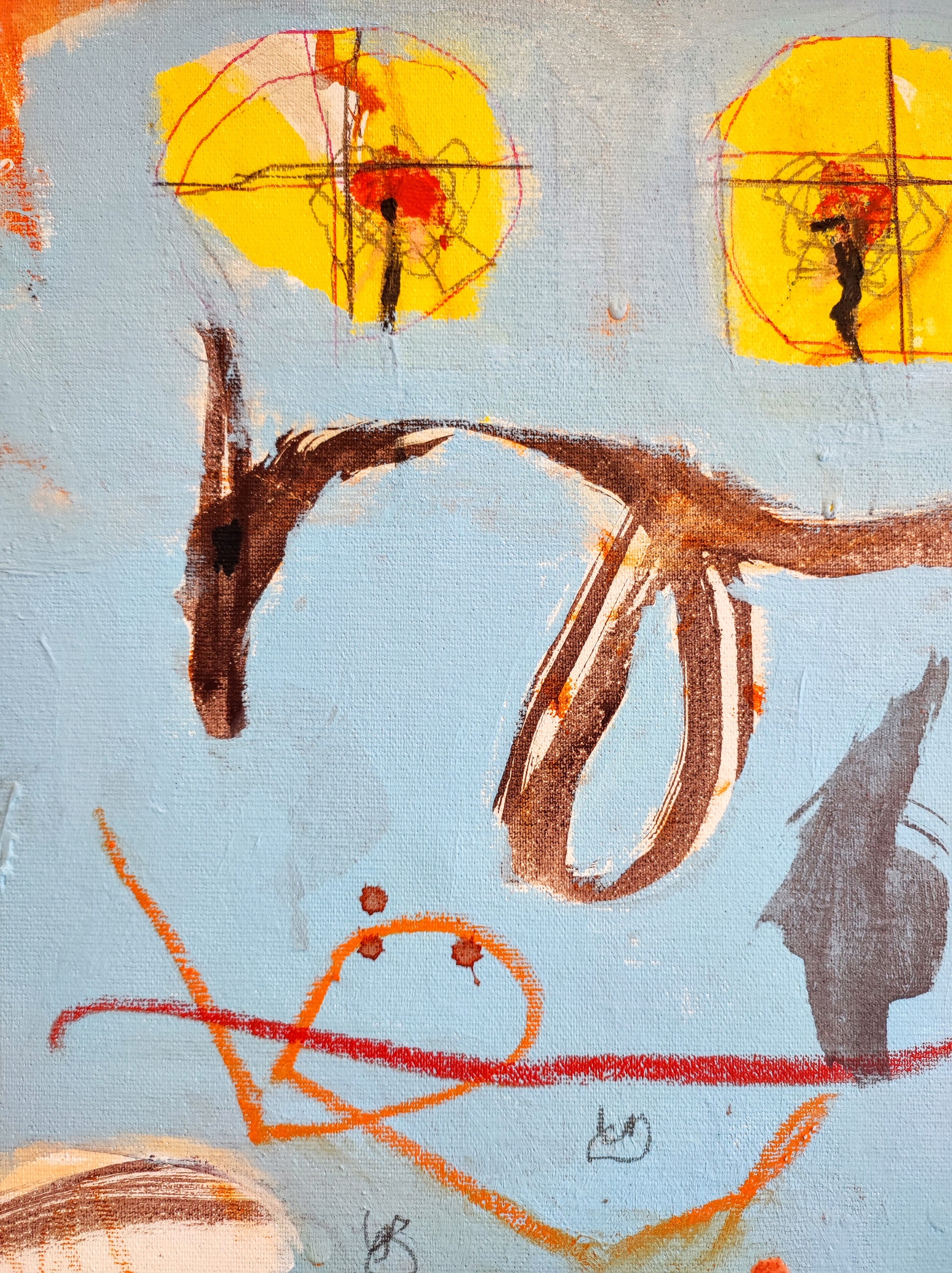 Pintura gestual, intuitiva, que deja que las cosas pasen y se apoya sobre lo que aparece. Aprovechando el accidente y aceptando las consecuencias.