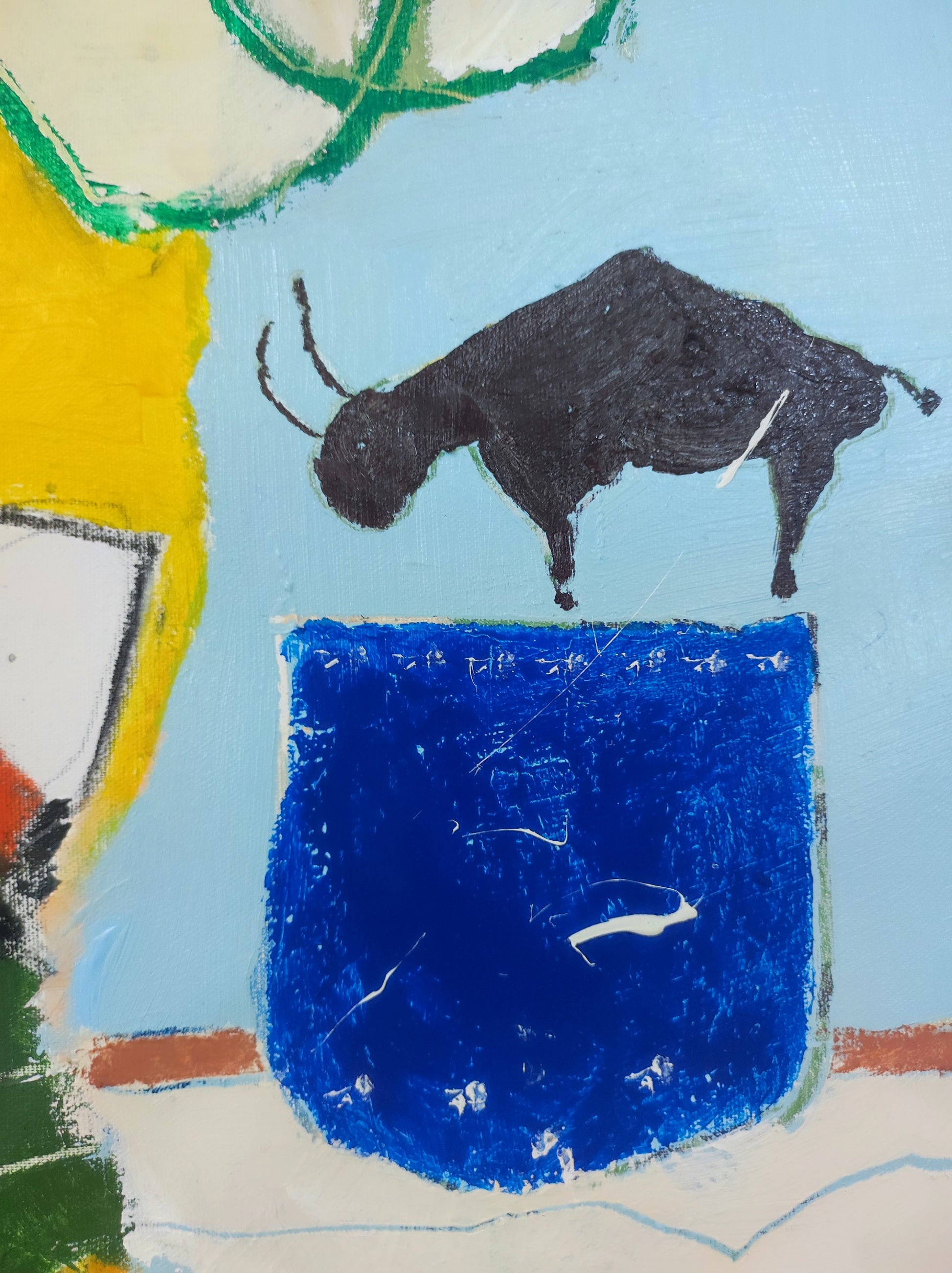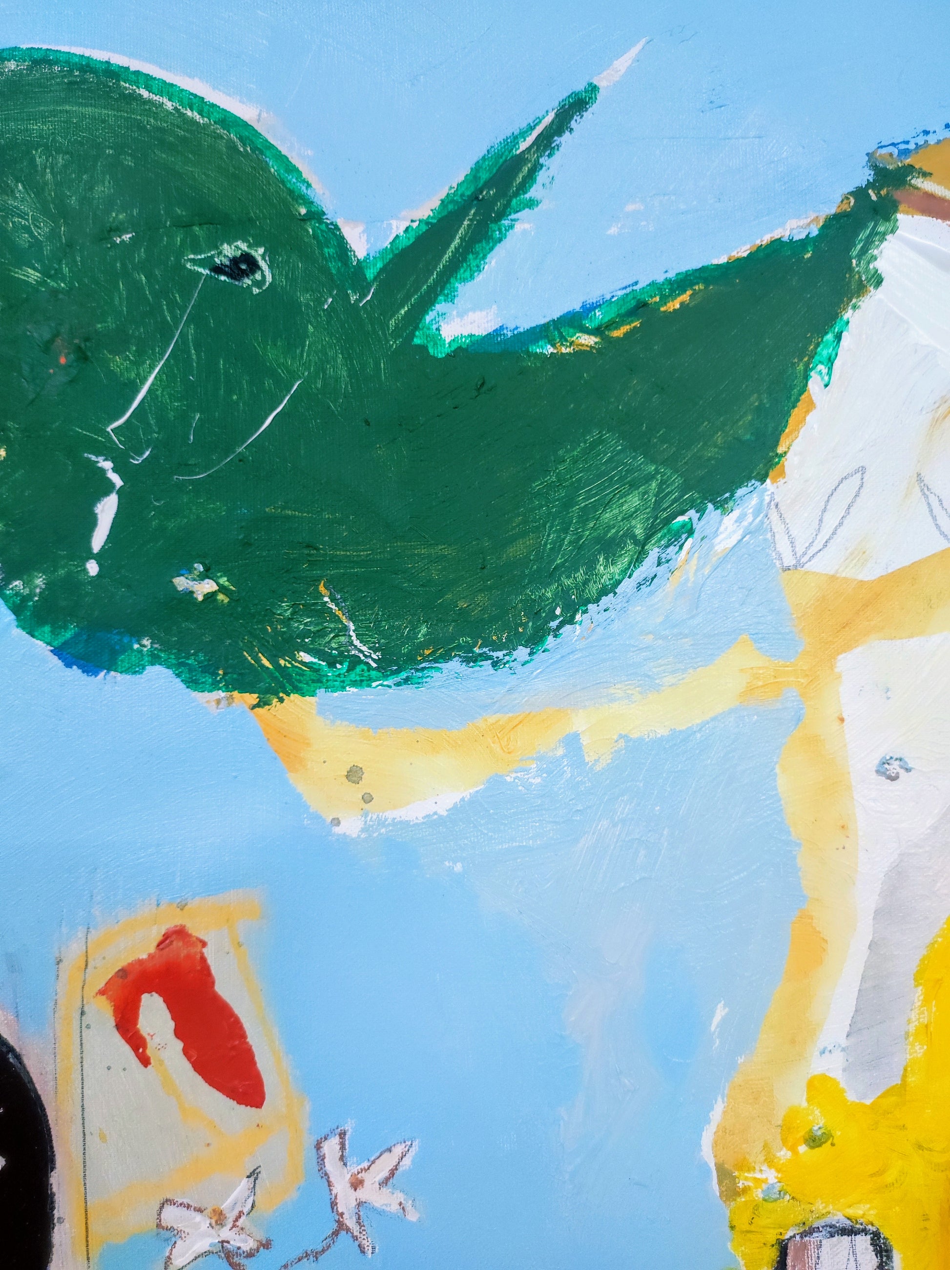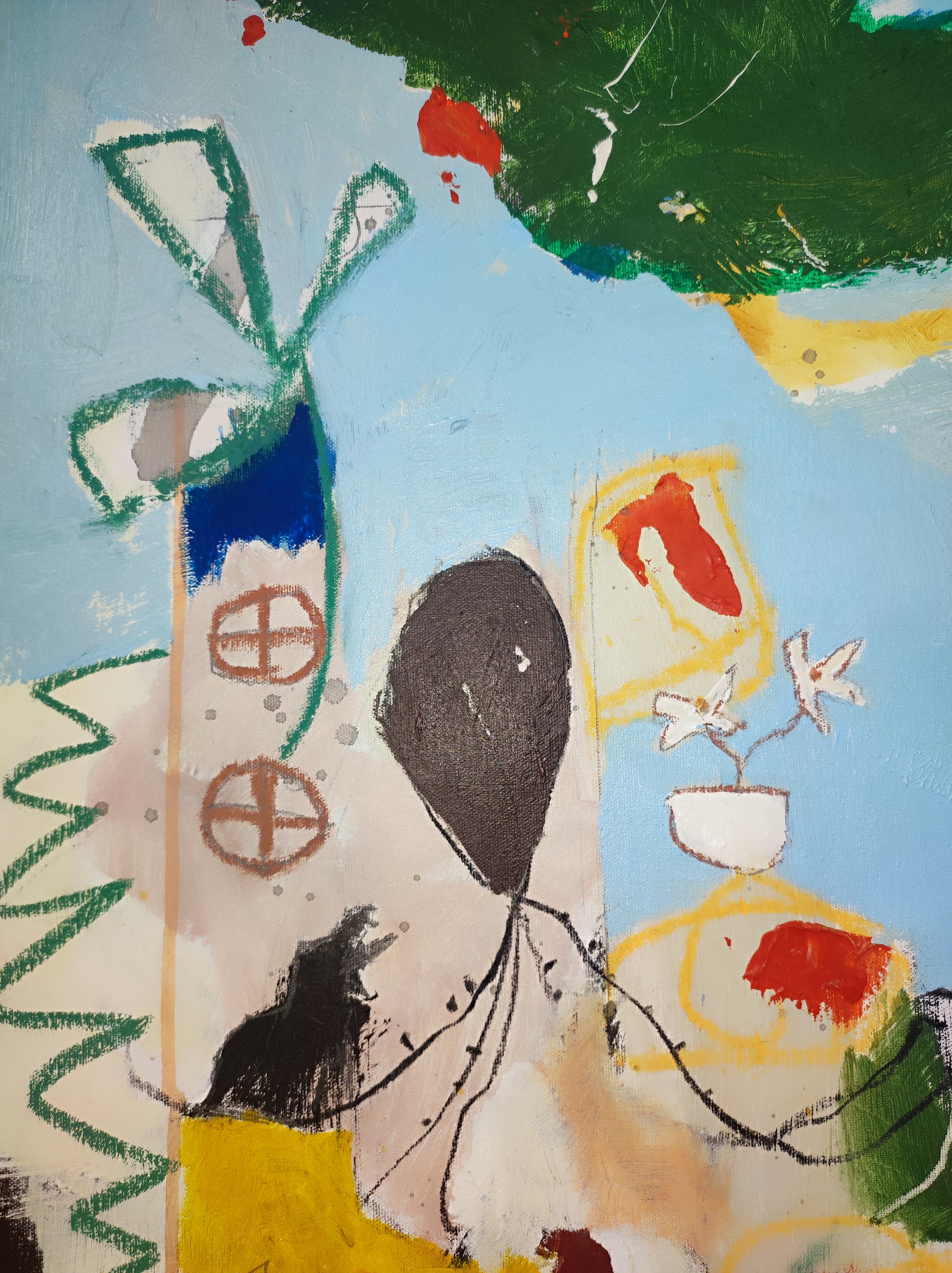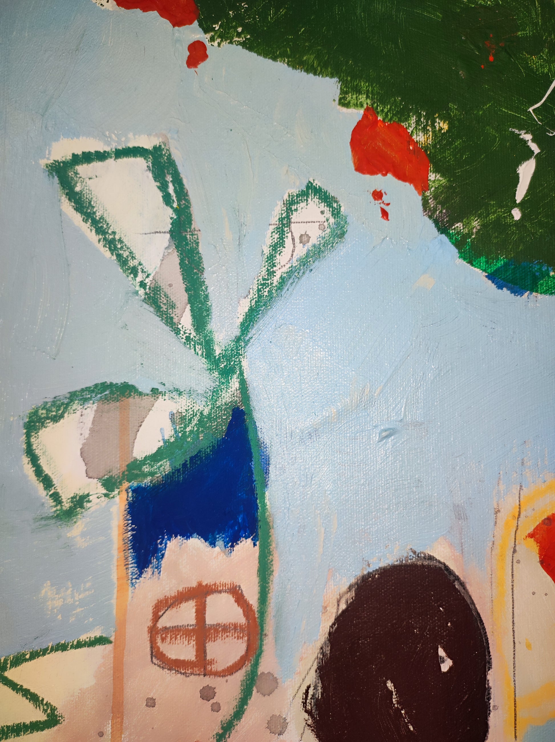Pintura gestual, intuitiva, que deja que las cosas pasen y se apoya sobre lo que aparece. Aprovechando el accidente y aceptando las consecuencias.