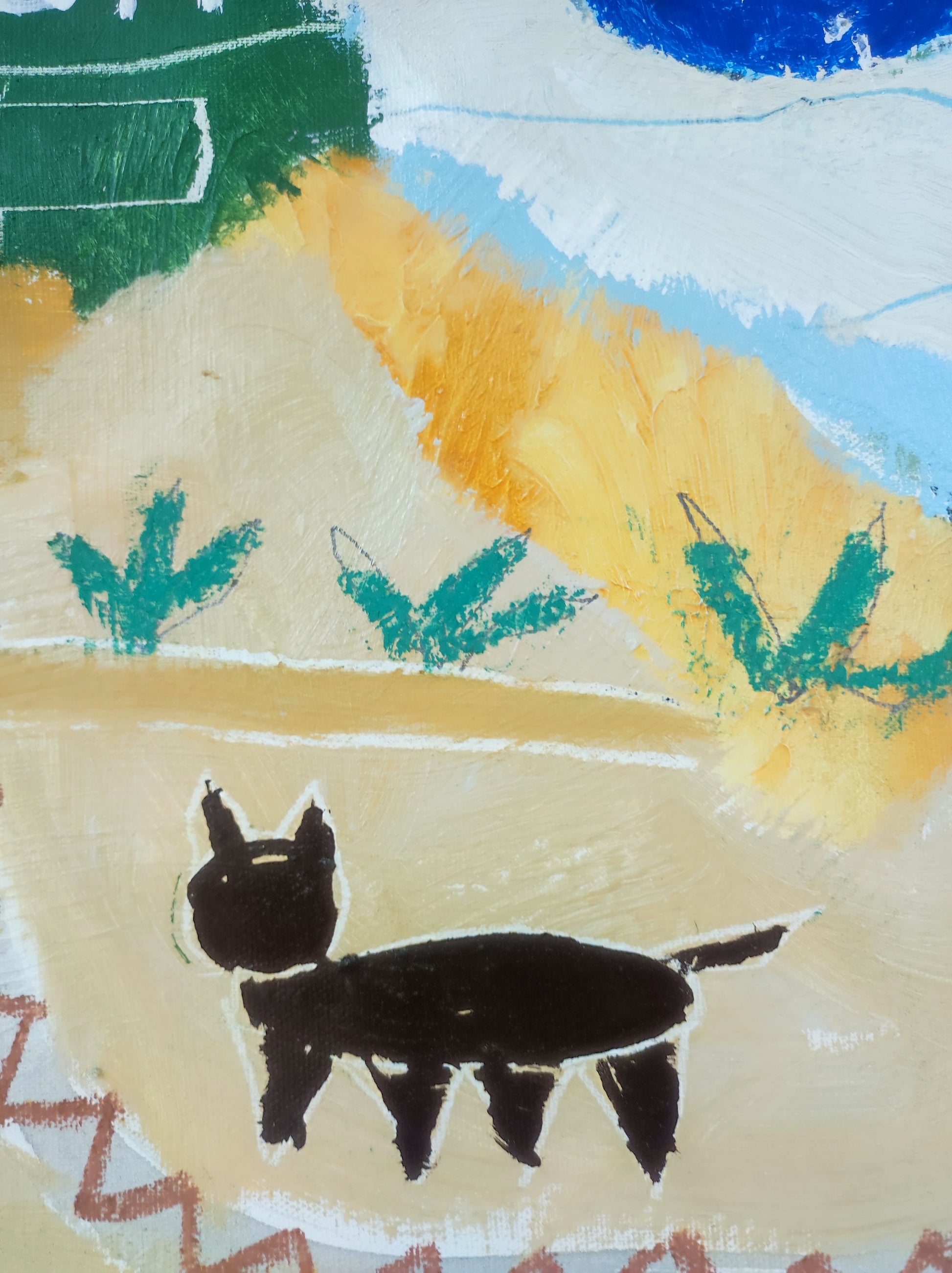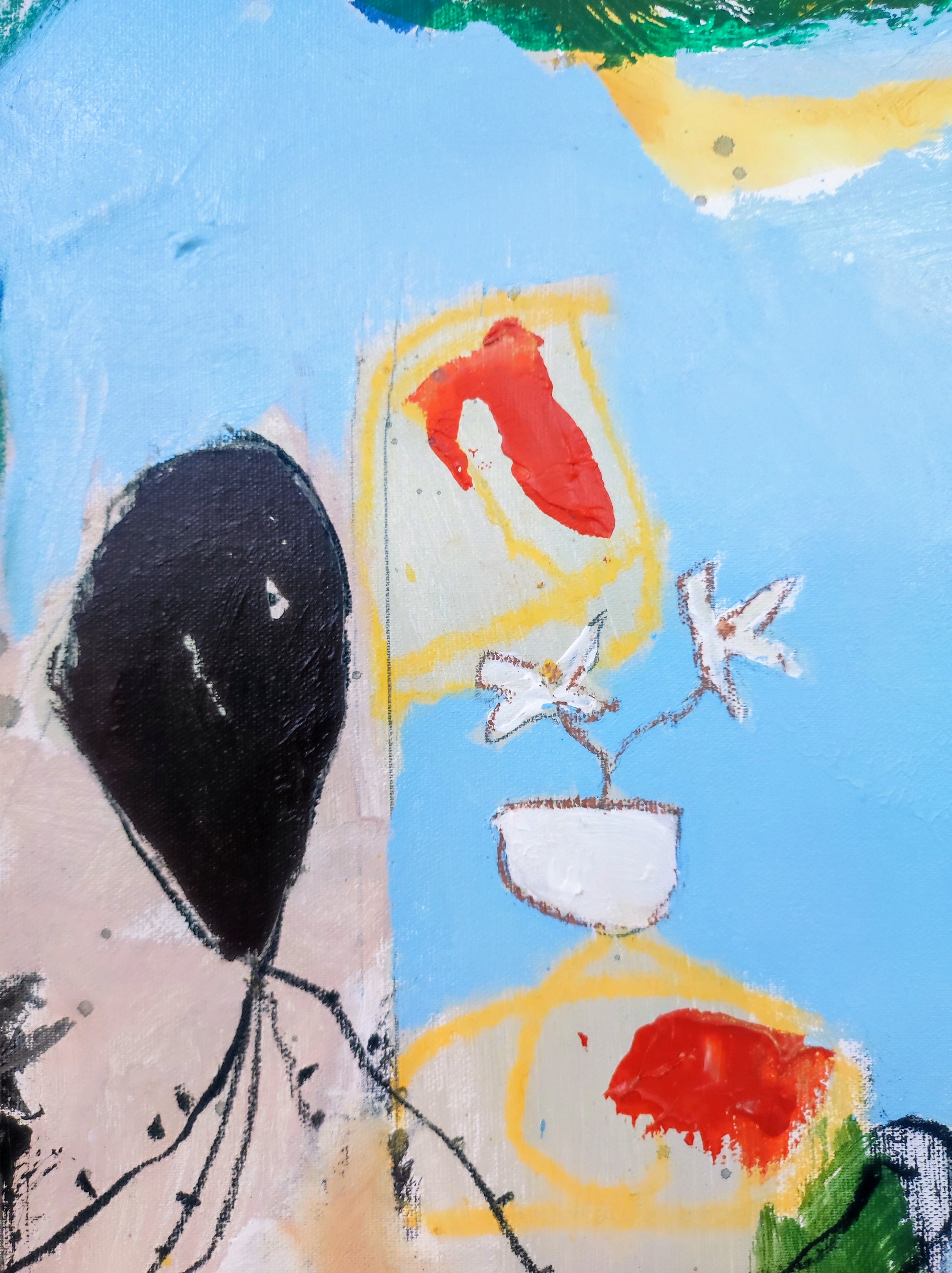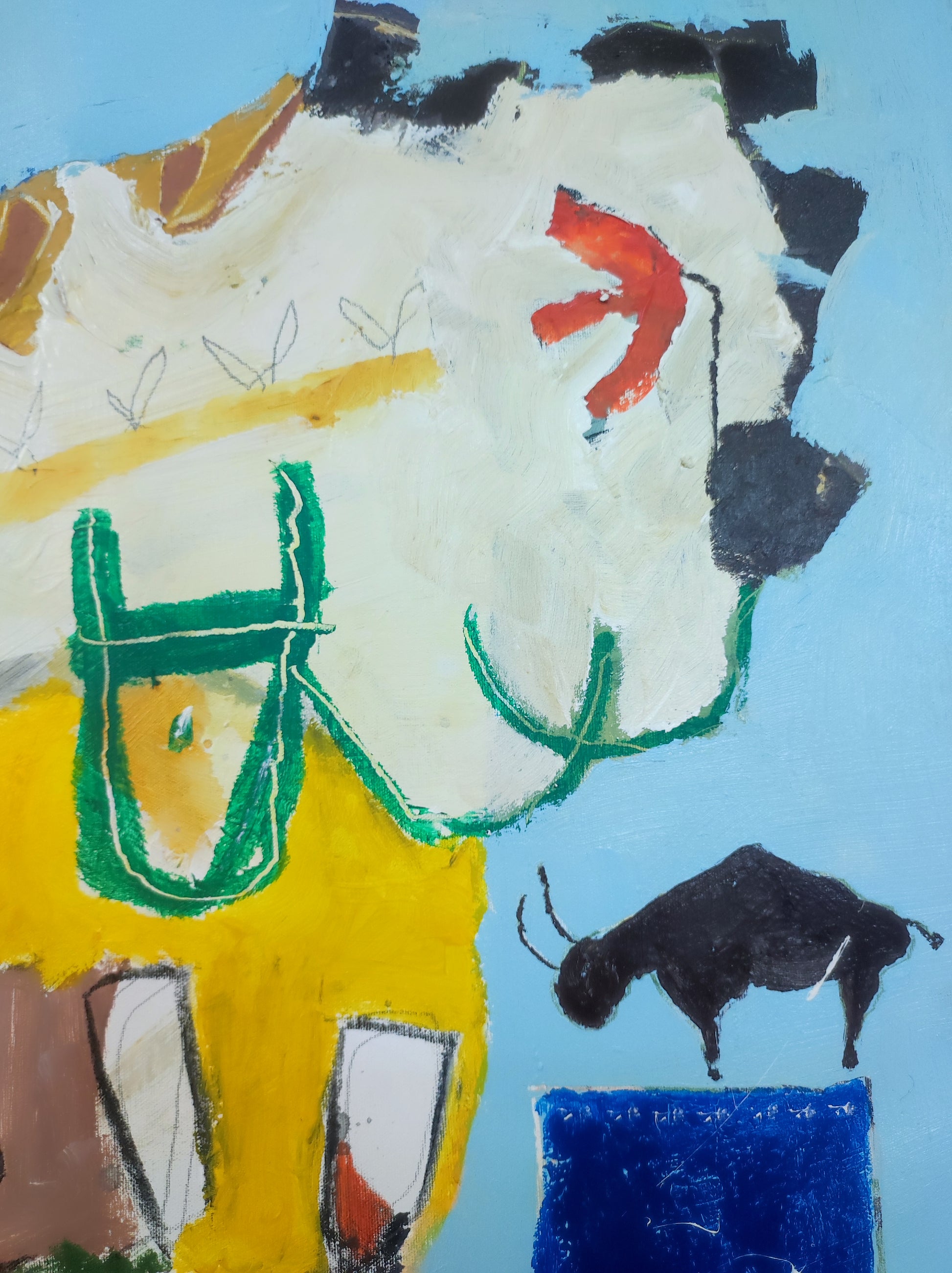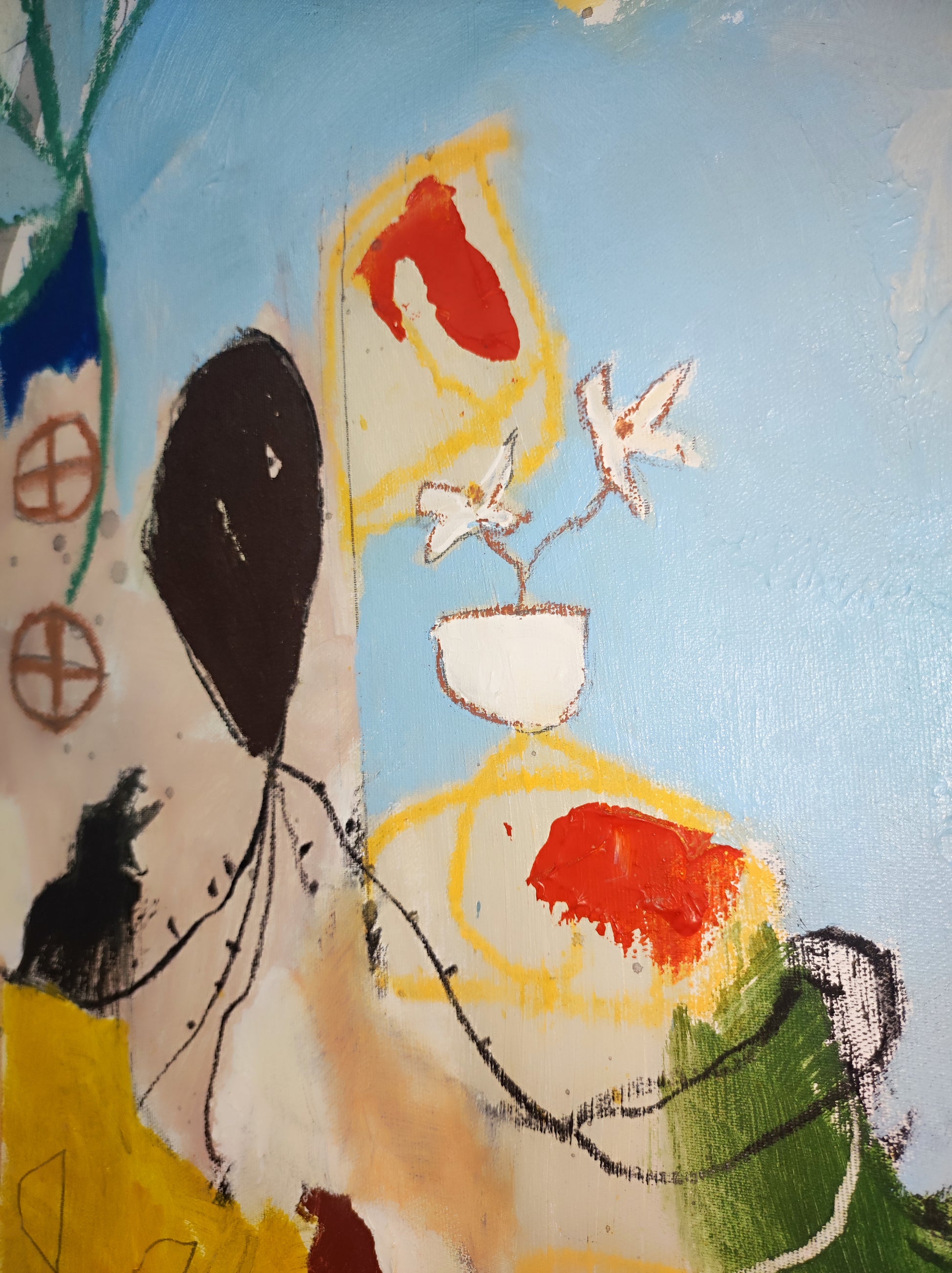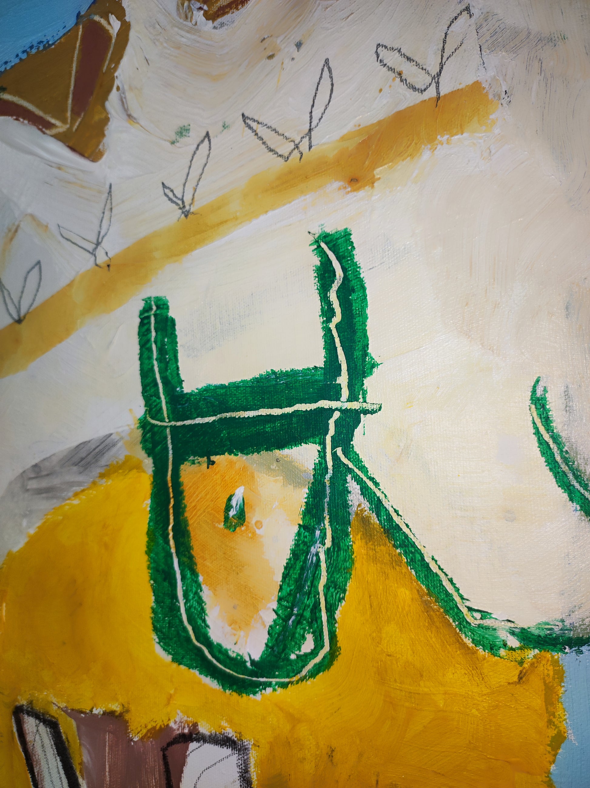 Pintura gestual, intuitiva, que deja que las cosas pasen y se apoya sobre lo que aparece. Aprovechando el accidente y aceptando las consecuencias.