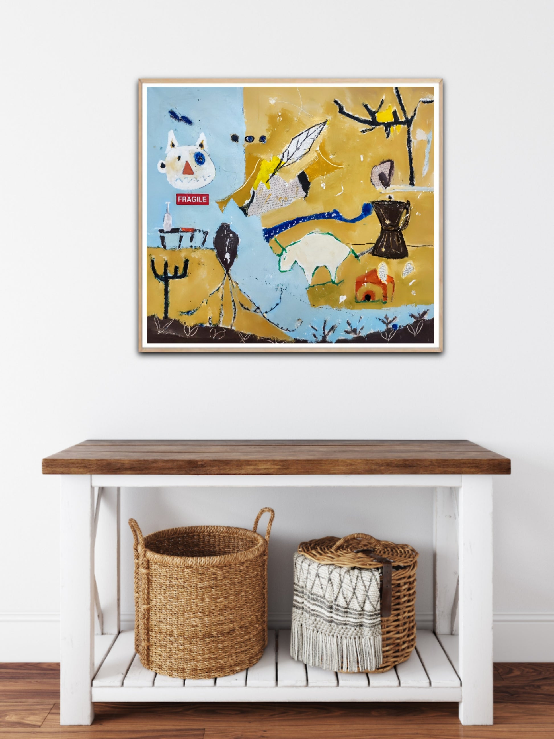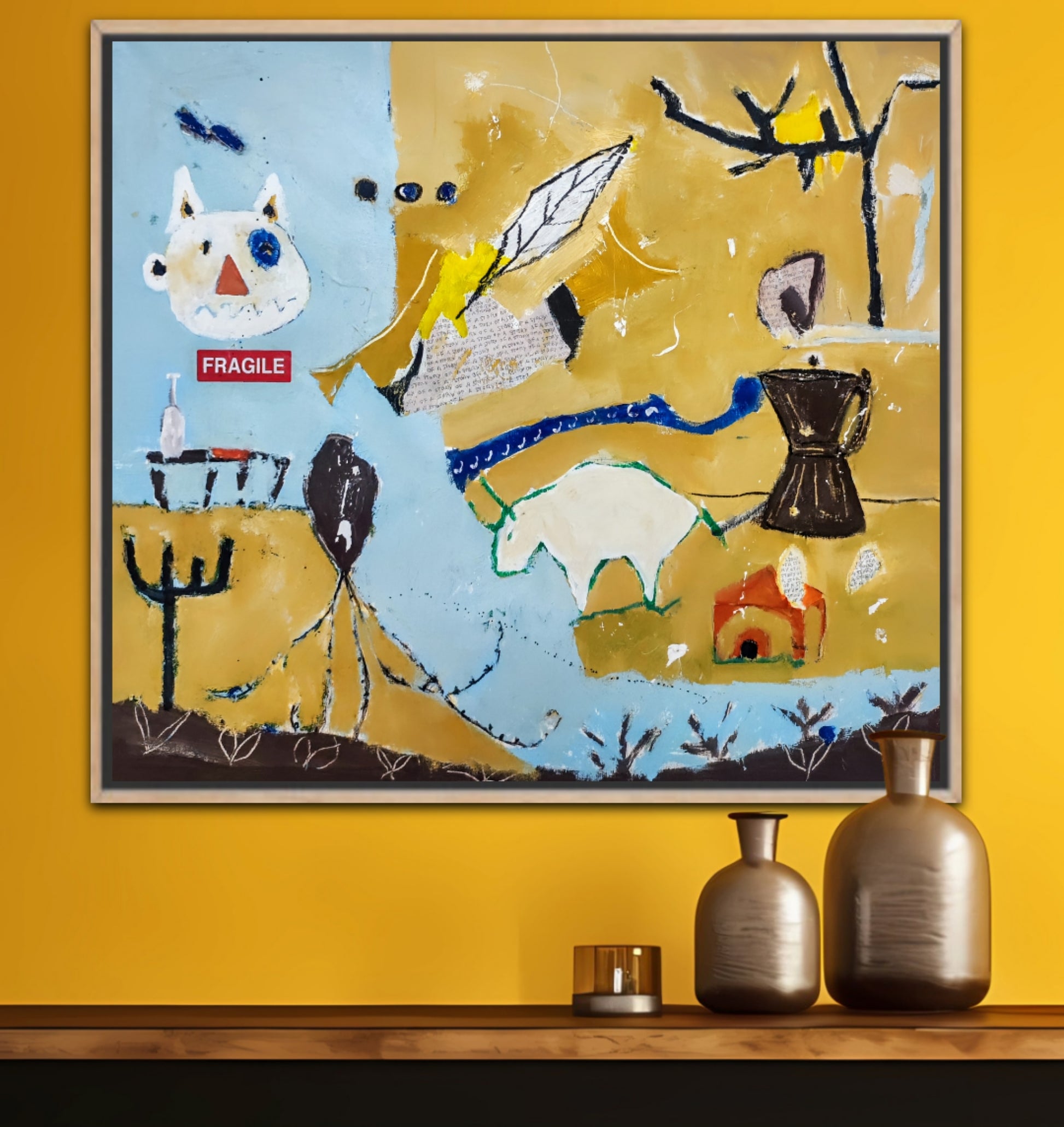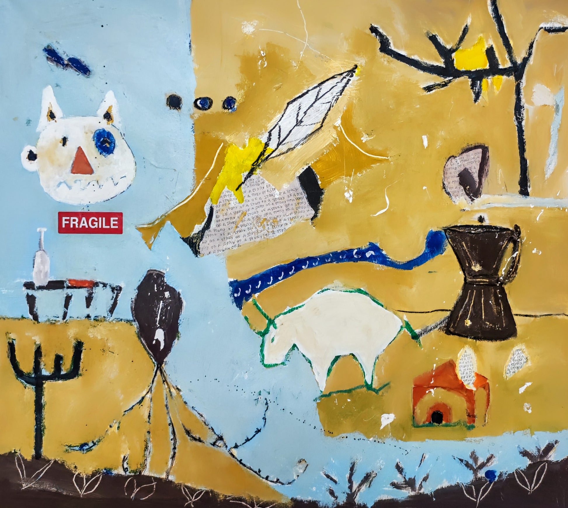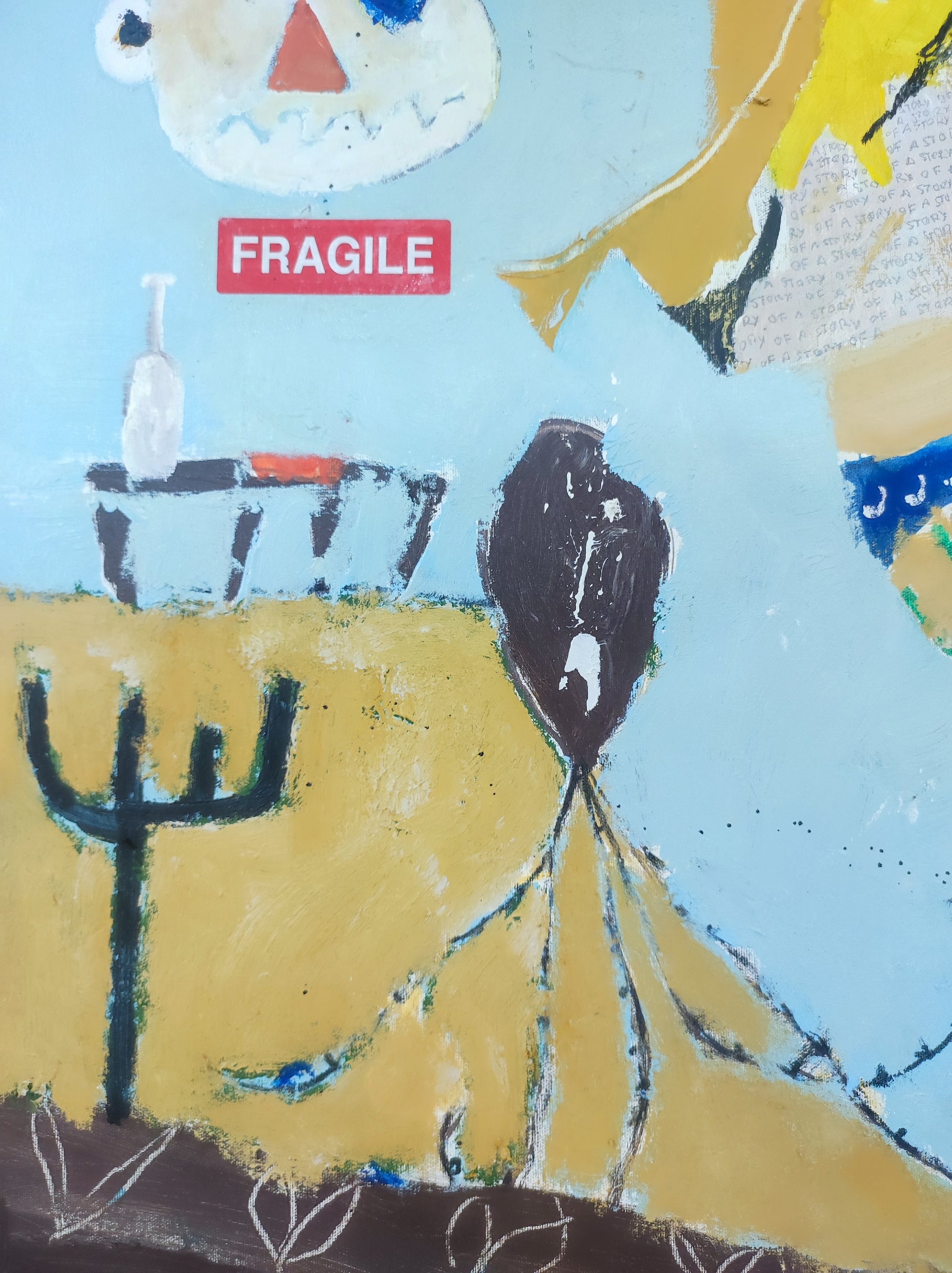 Técnica: acrílico, pigmentos, ceras, carboncillo, lápiz, pastel y tinta china.