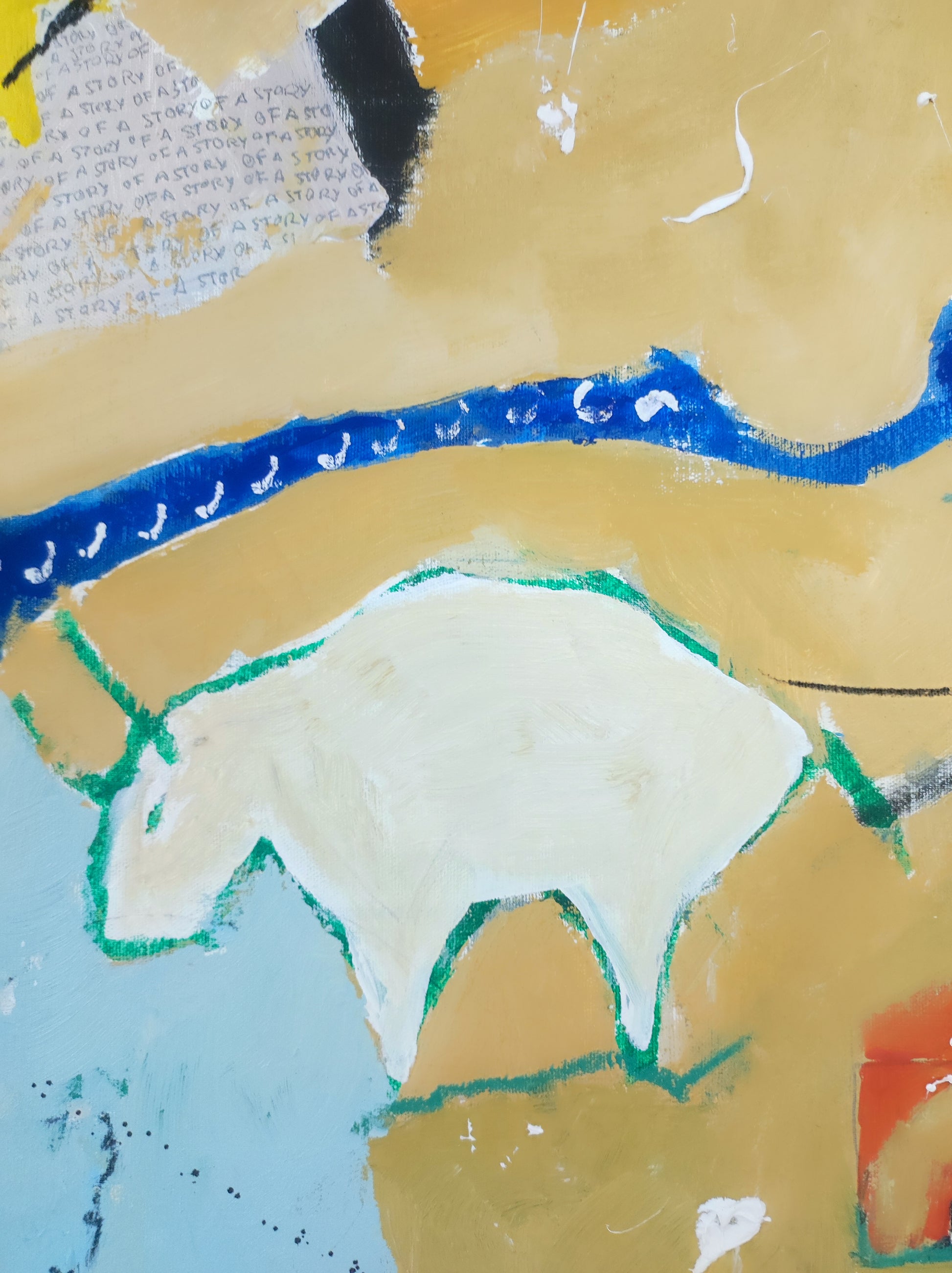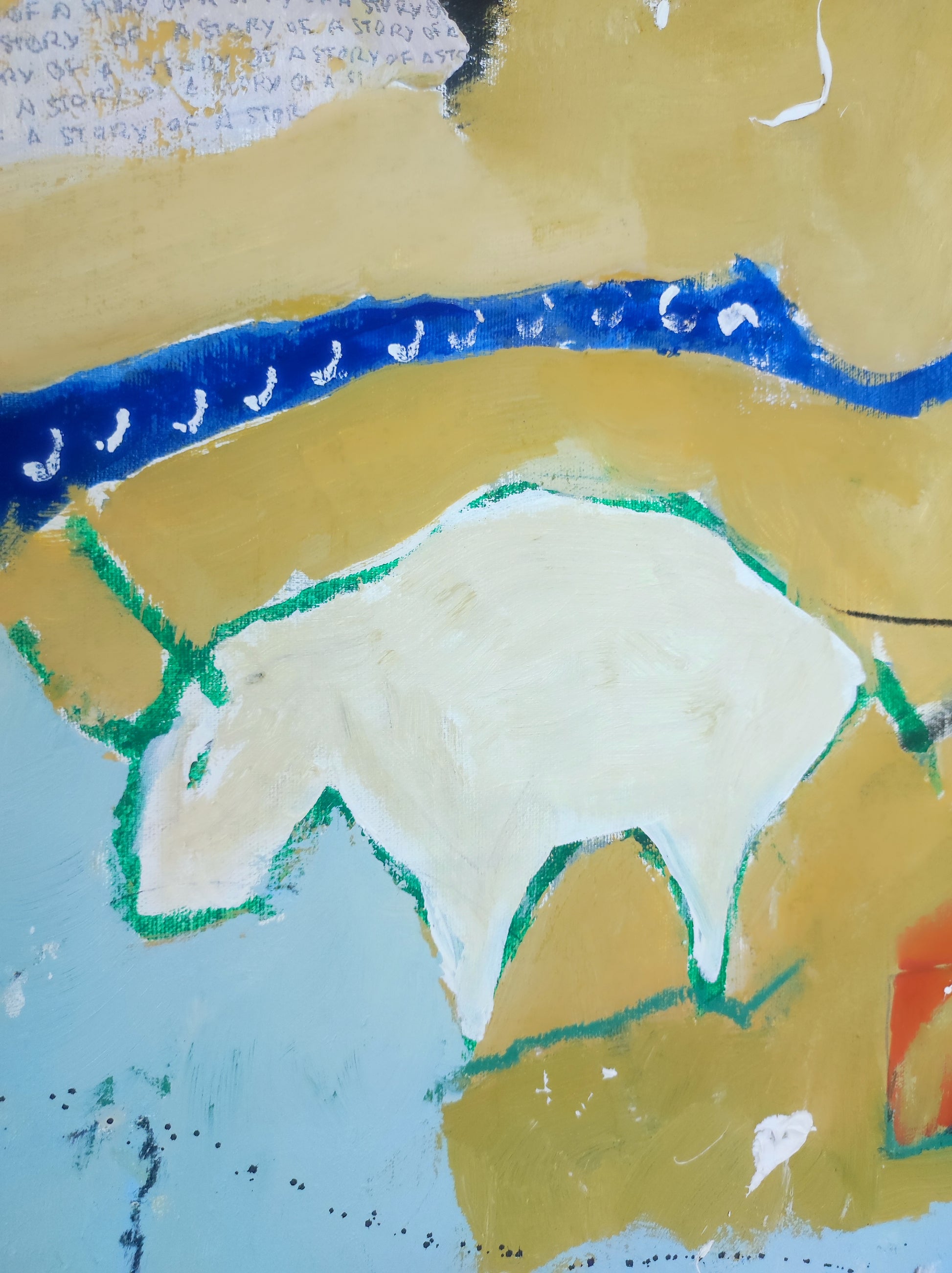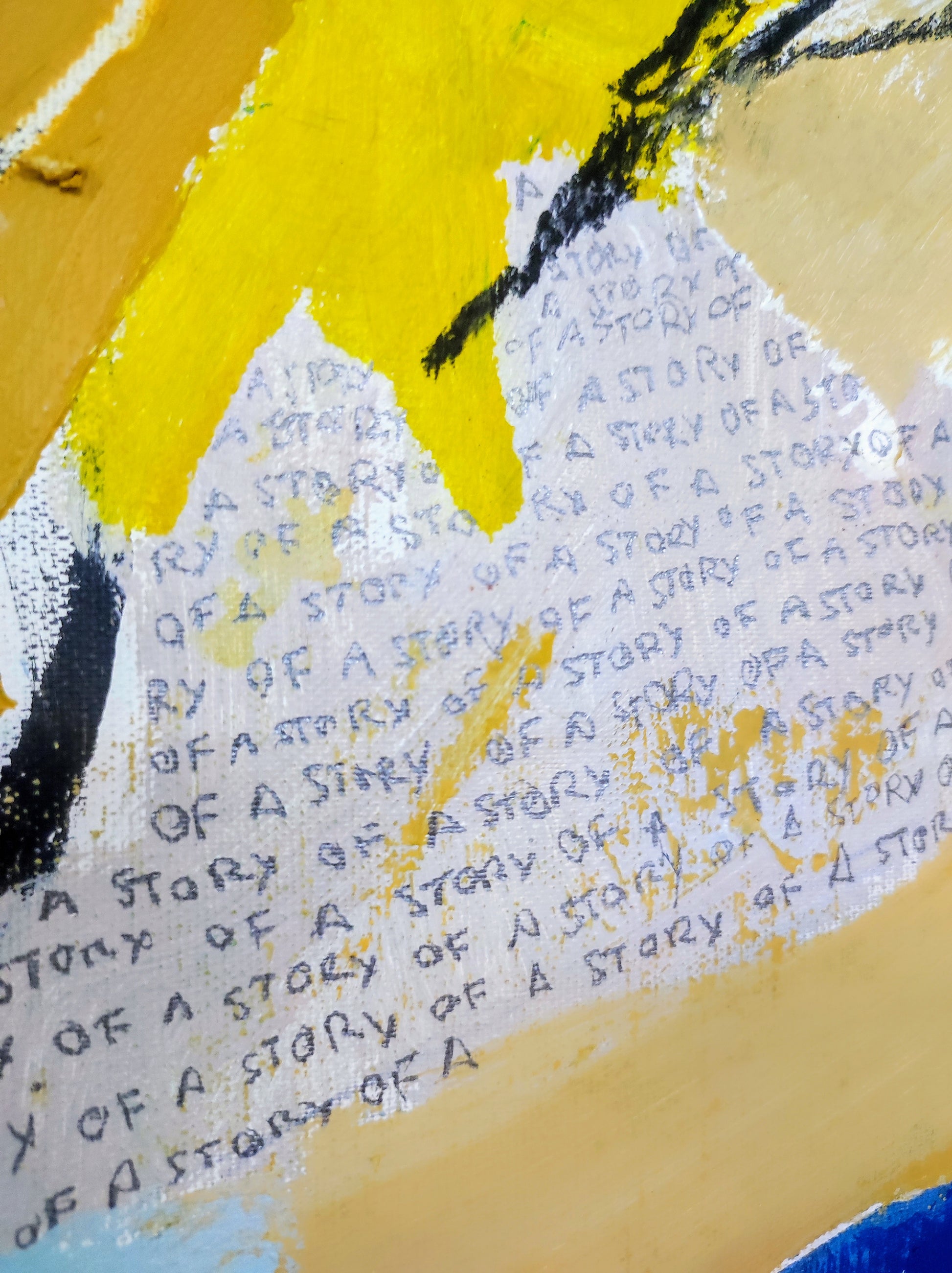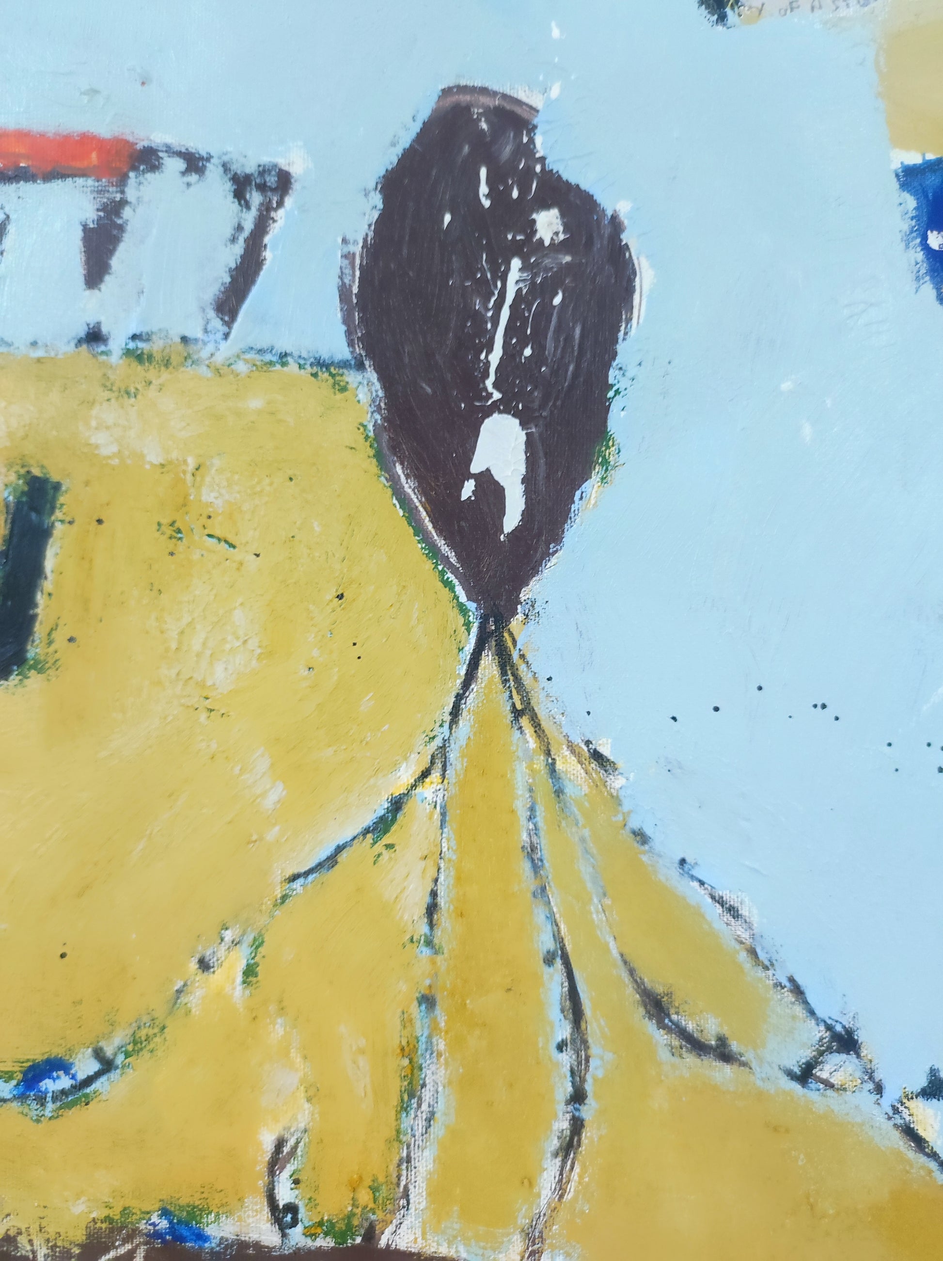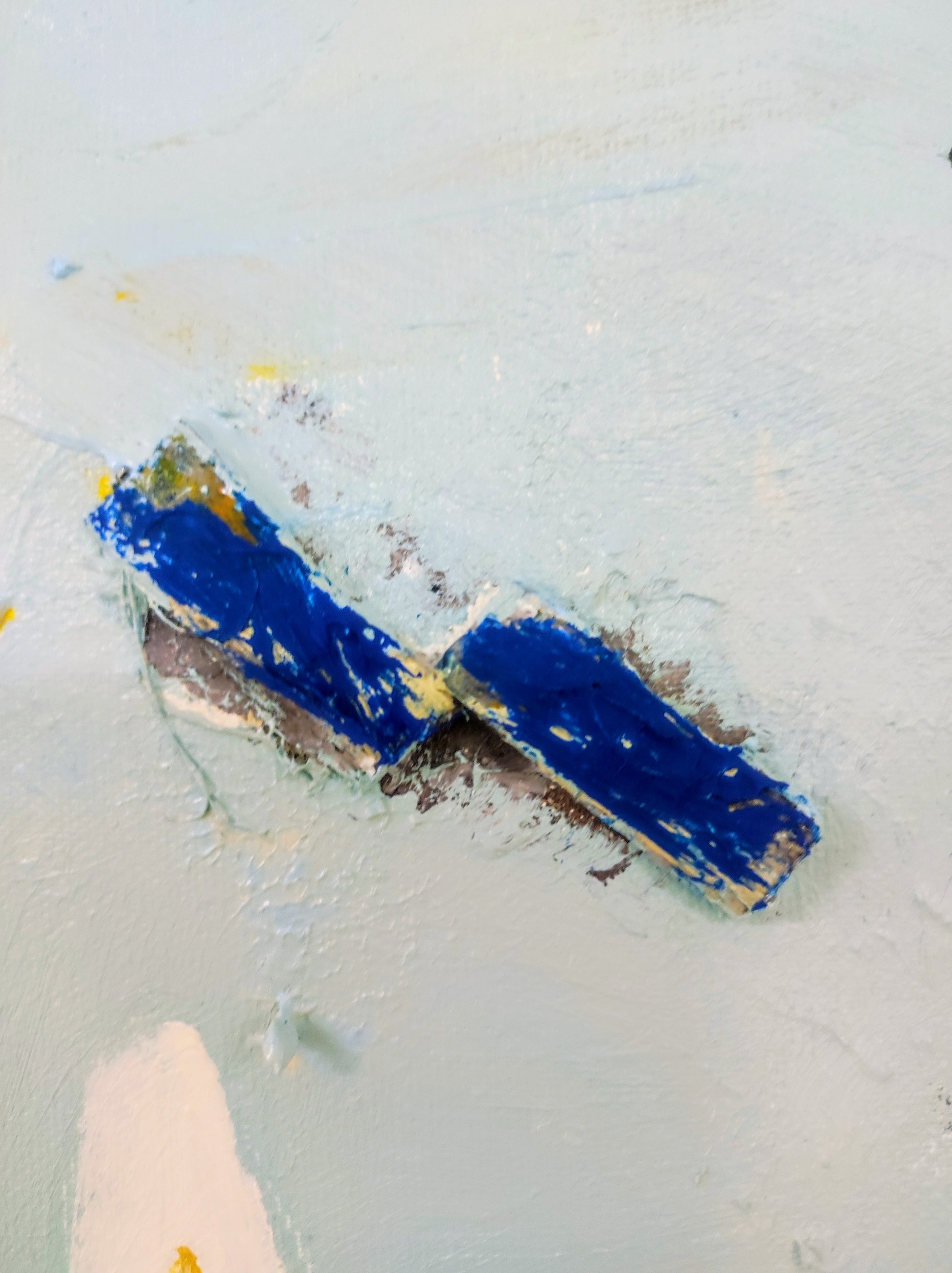 Pintura gestual, intuitiva, que deja que las cosas pasen y se apoya sobre lo que aparece. Aprovechando el accidente y aceptando las consecuencias.