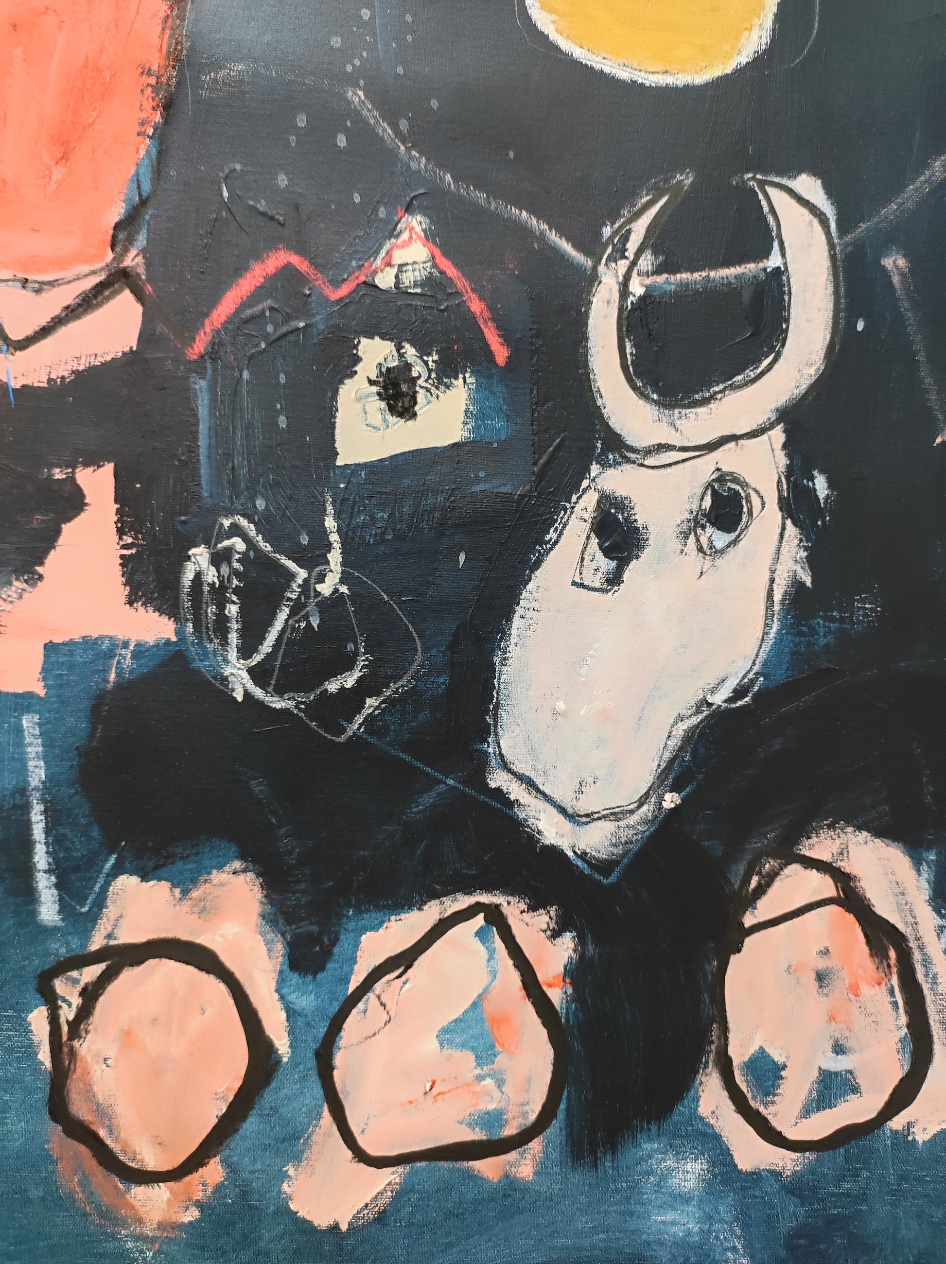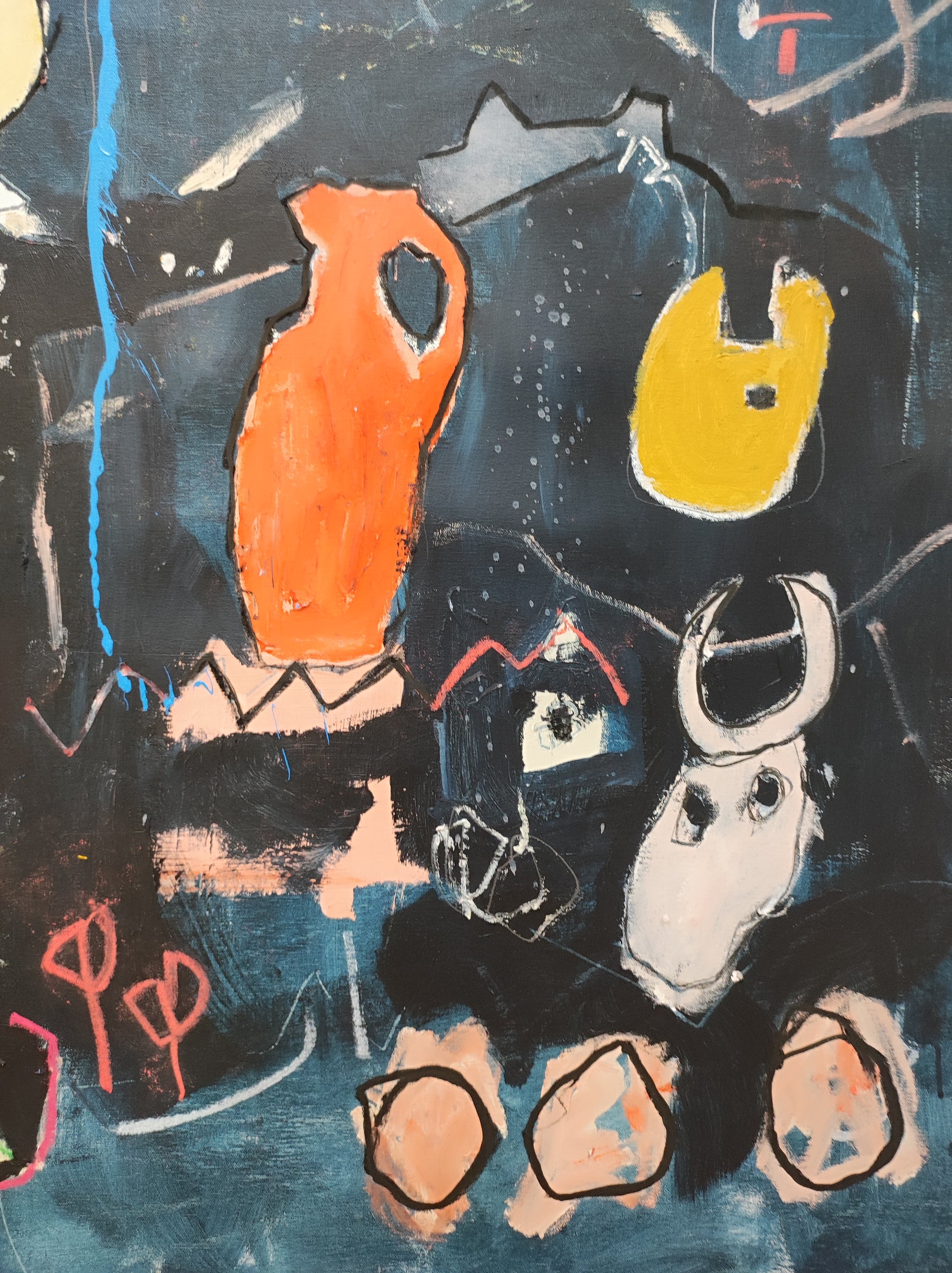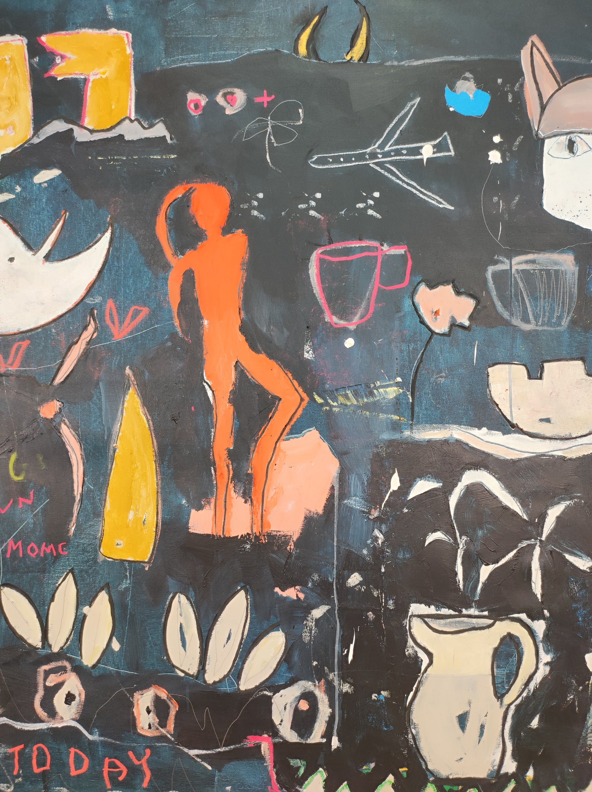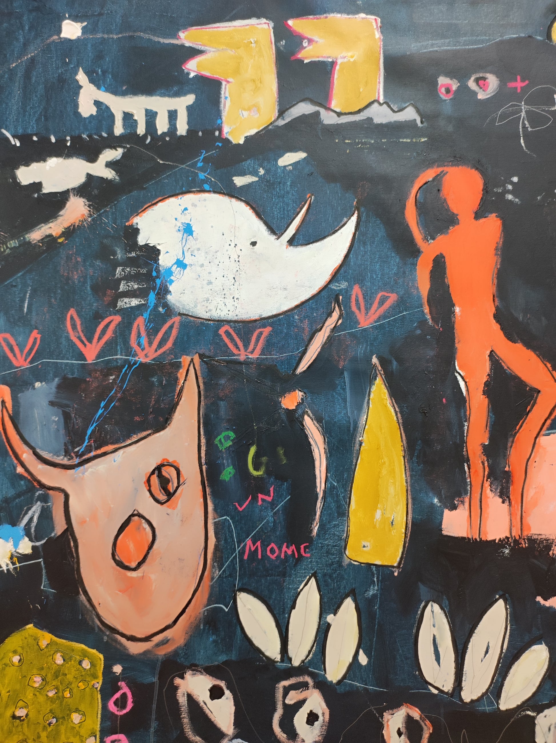 Pintura gestual, intuitiva, que deja que las cosas pasen y se apoya sobre lo que aparece. Aprovechando el accidente y aceptando las consecuencias.