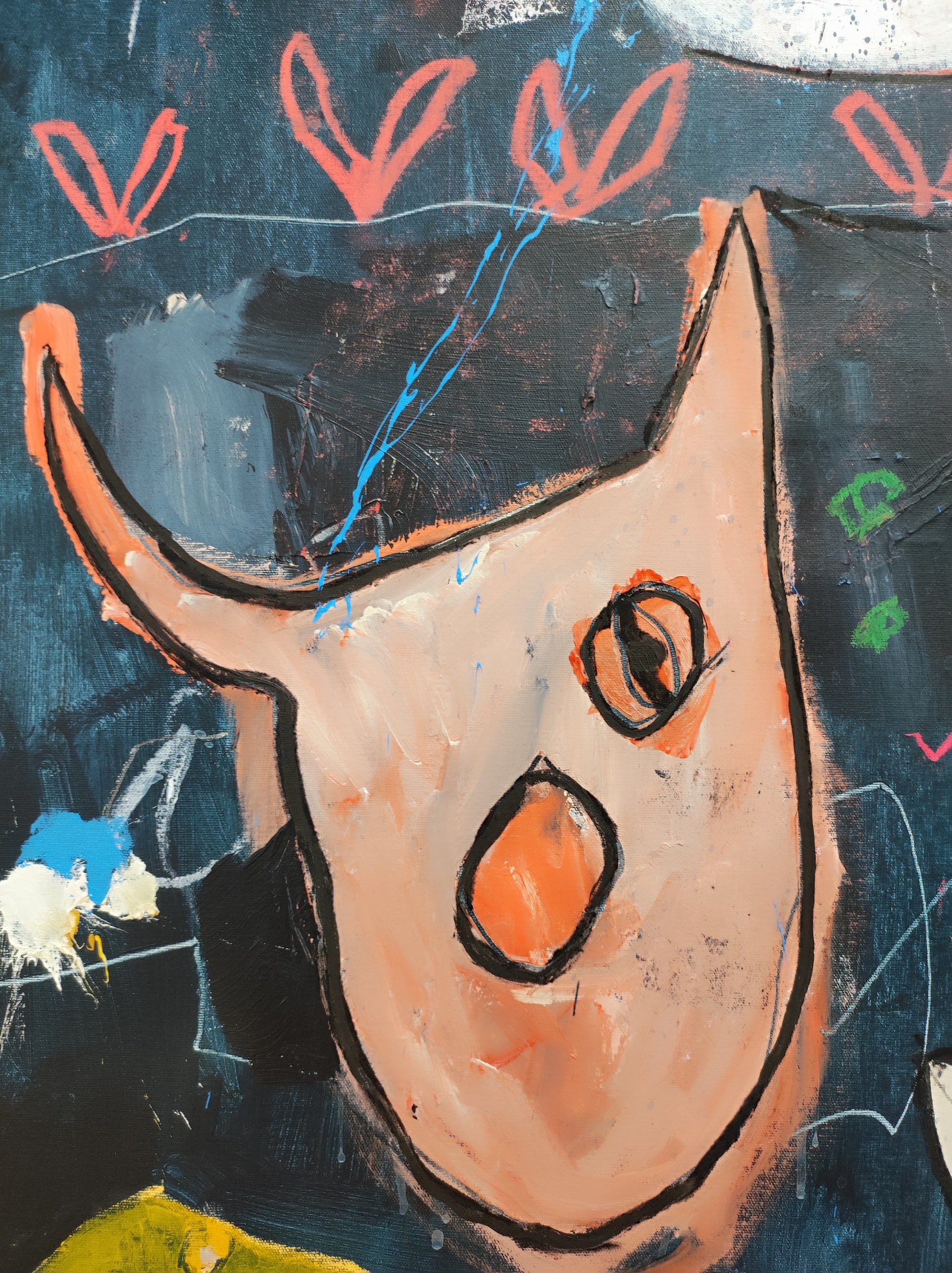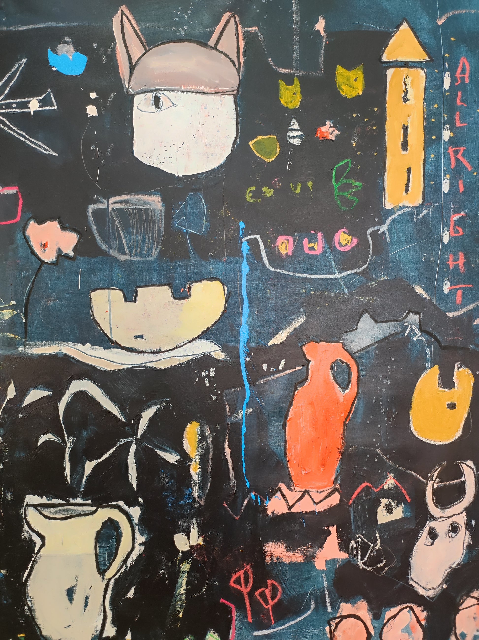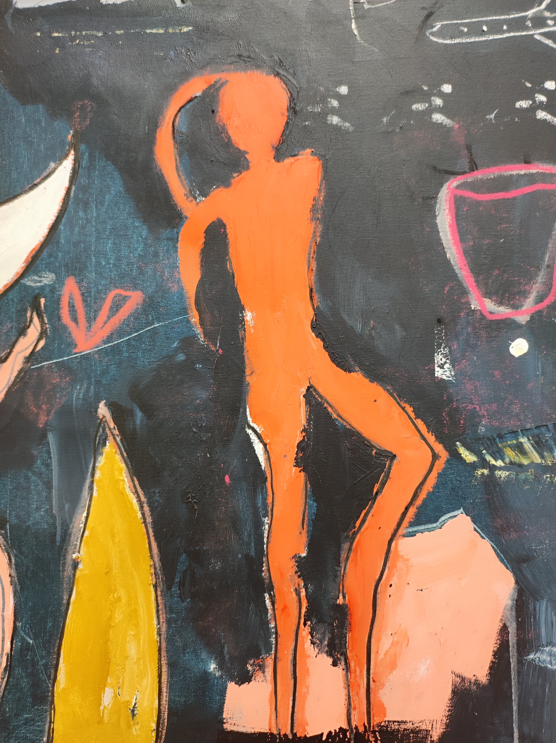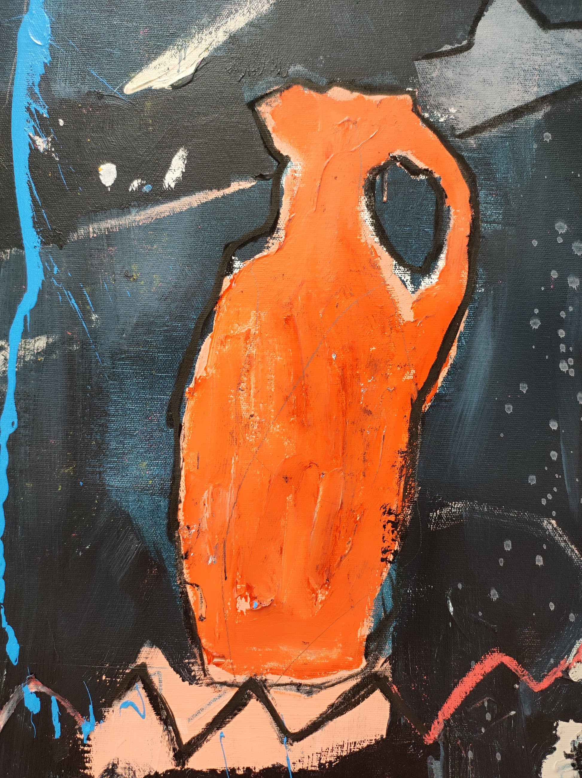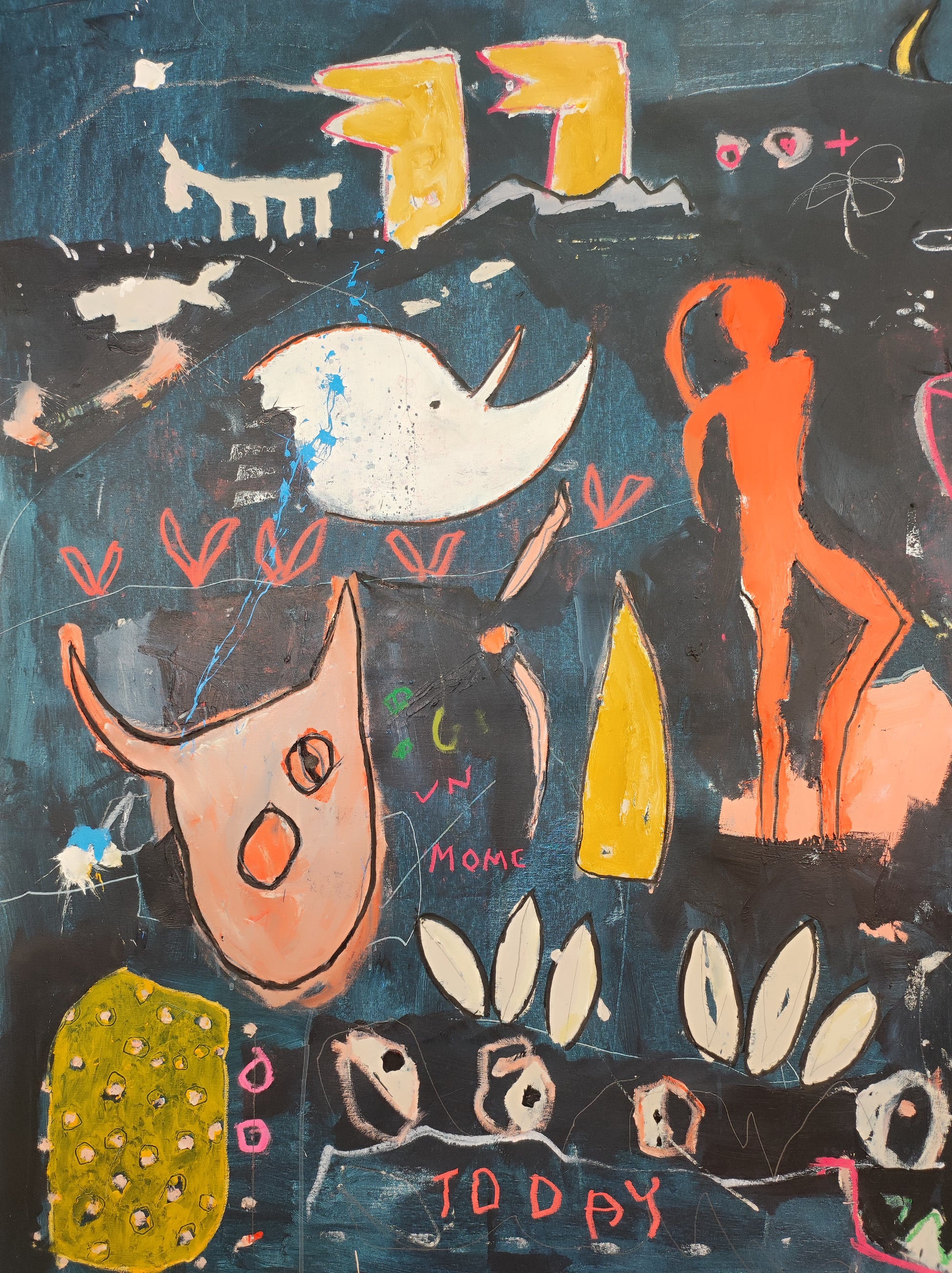 Pintura gestual, intuitiva, que deja que las cosas pasen y se apoya sobre lo que aparece. Aprovechando el accidente y aceptando las consecuencias.