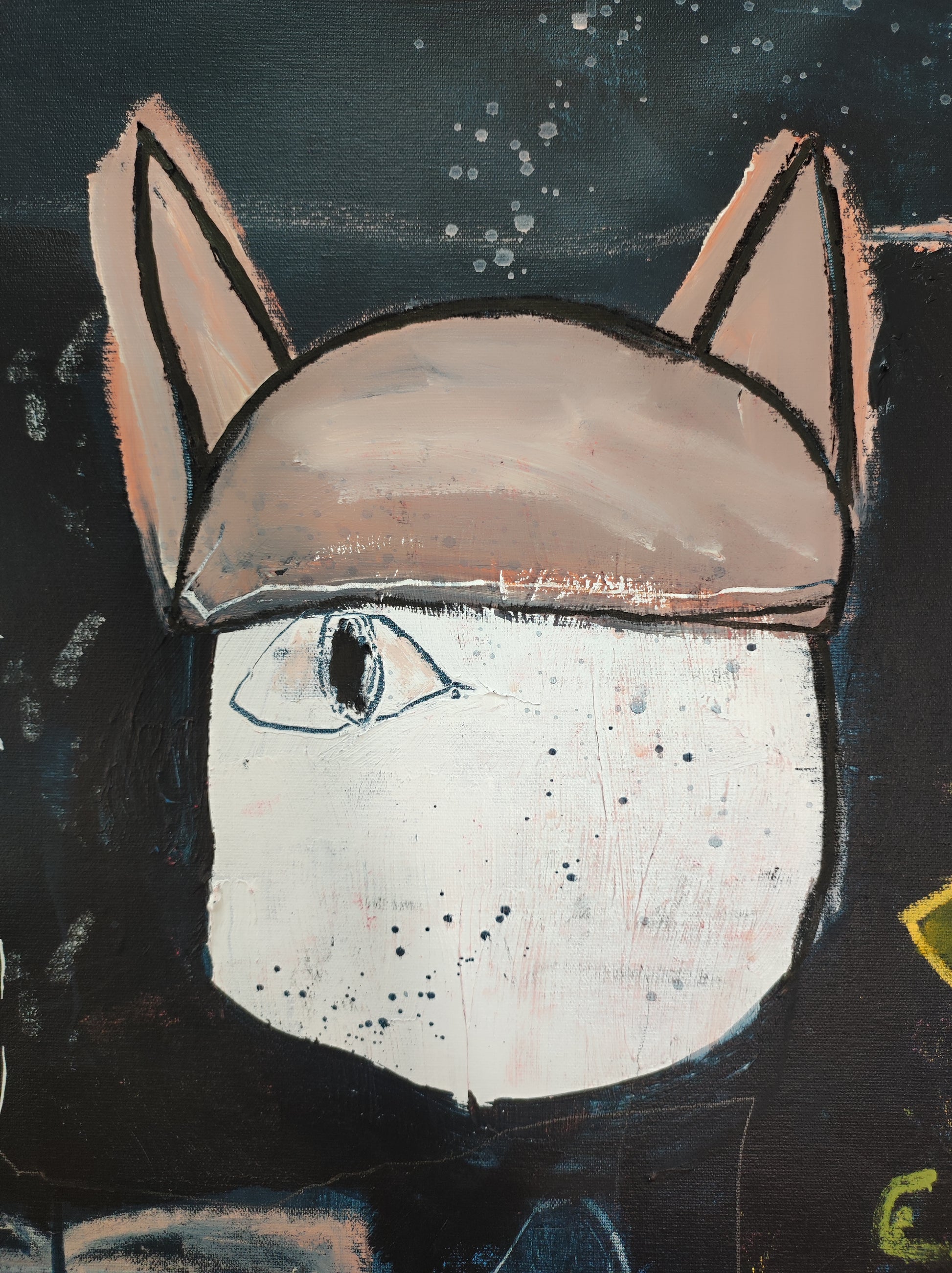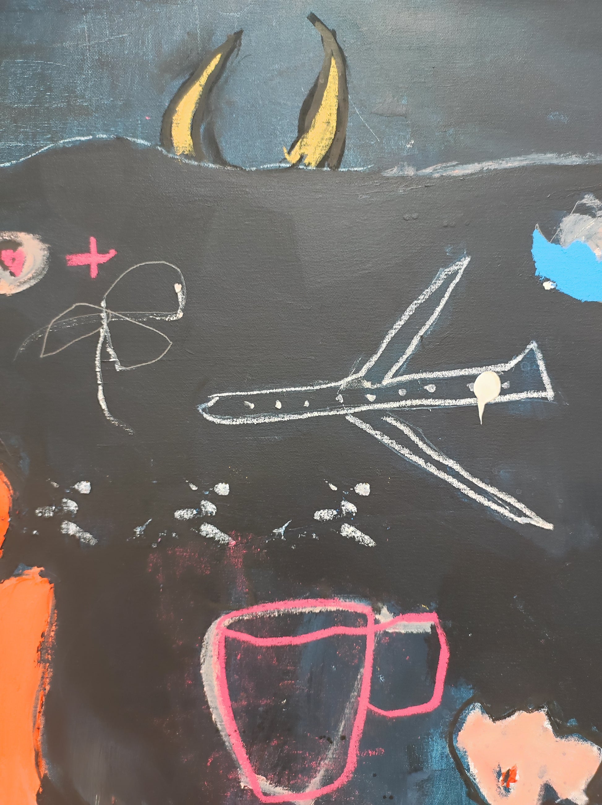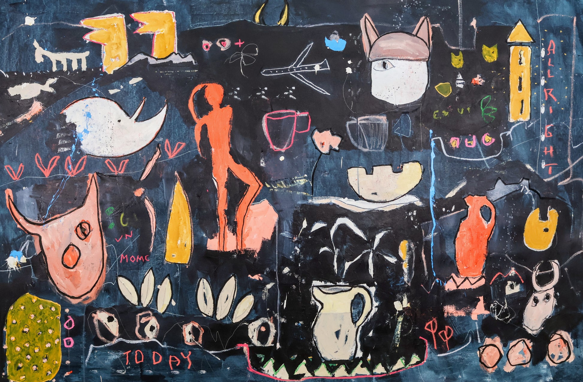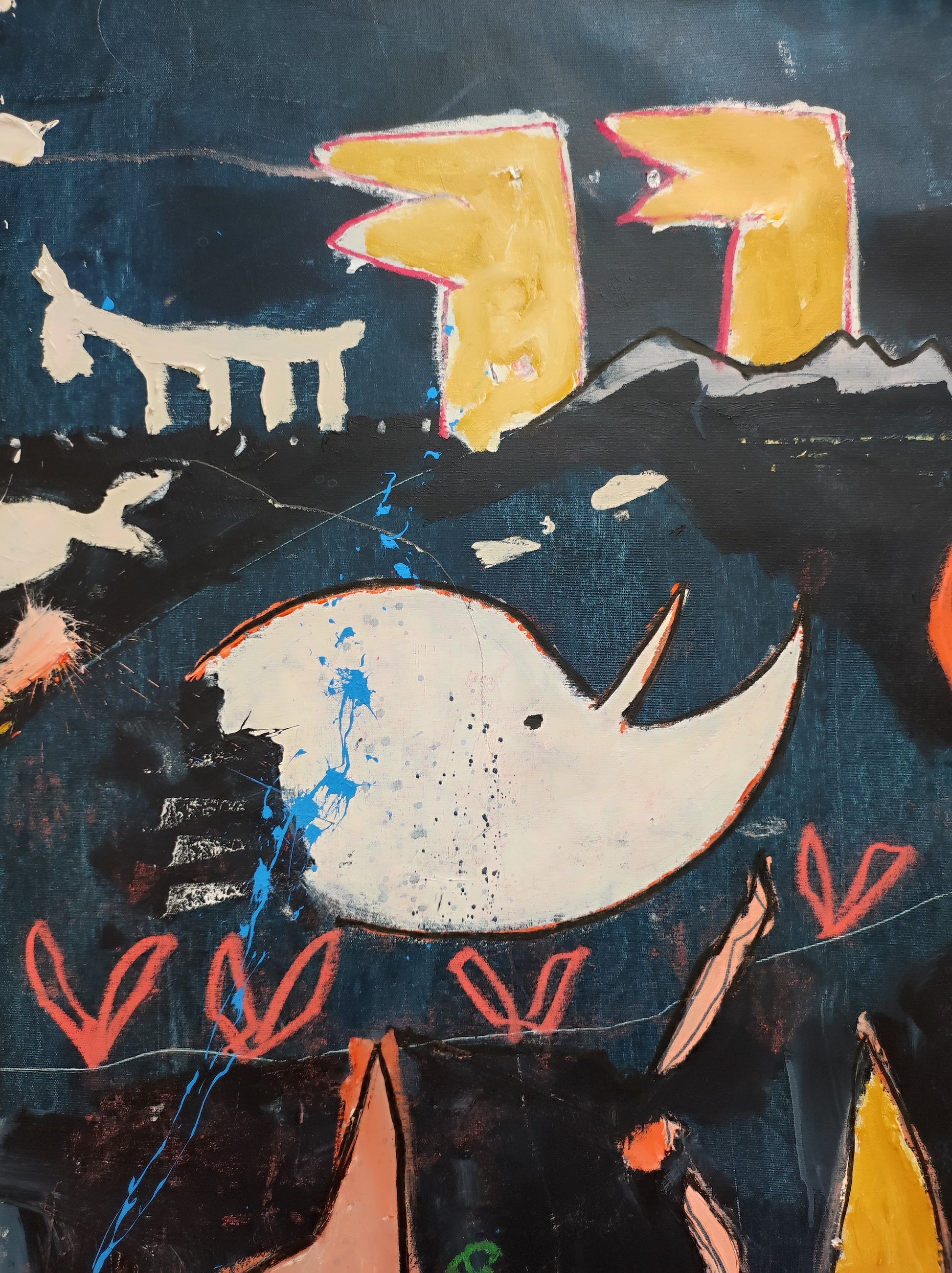 Pintura gestual, intuitiva, que deja que las cosas pasen y se apoya sobre lo que aparece. Aprovechando el accidente y aceptando las consecuencias.