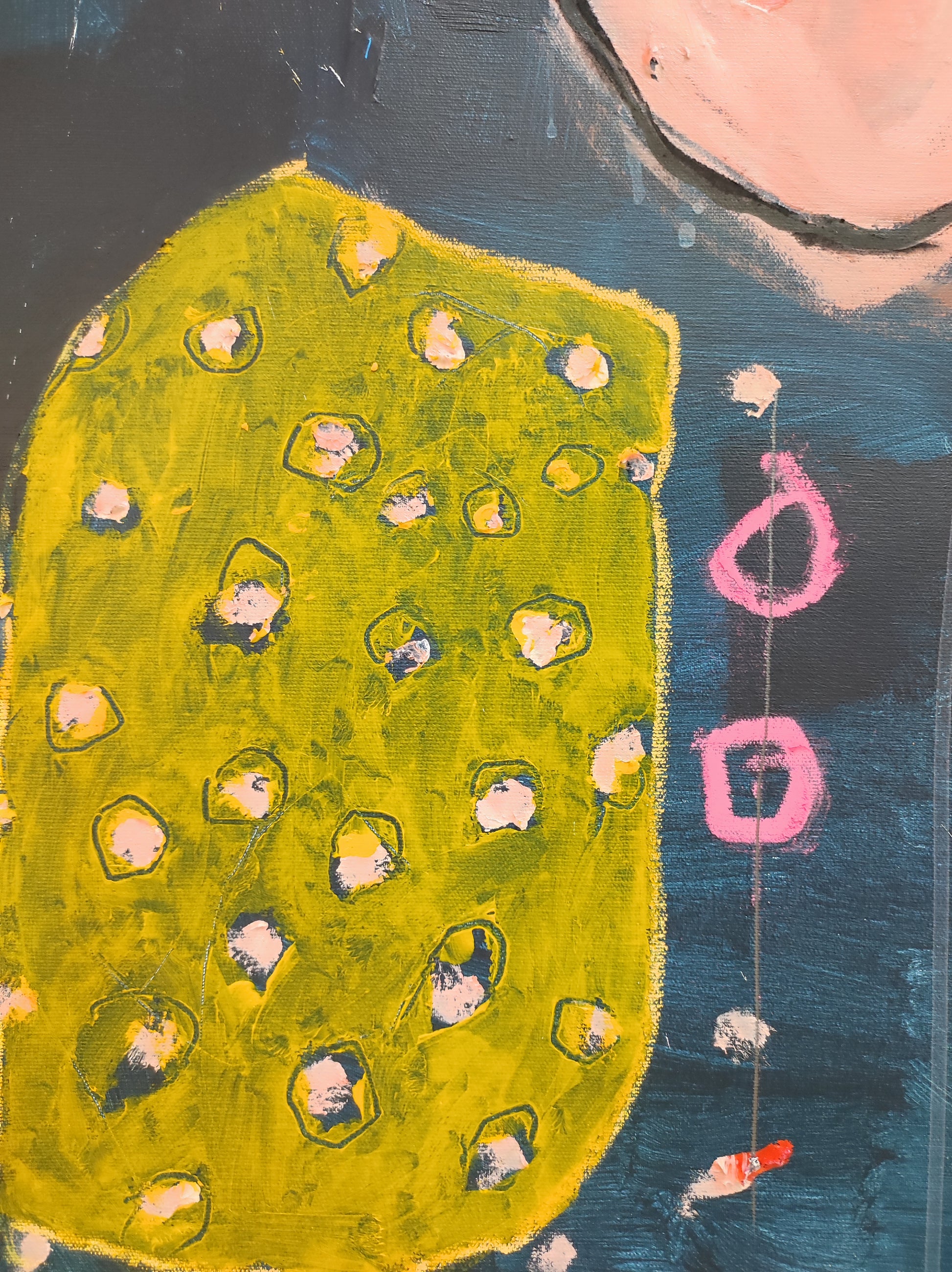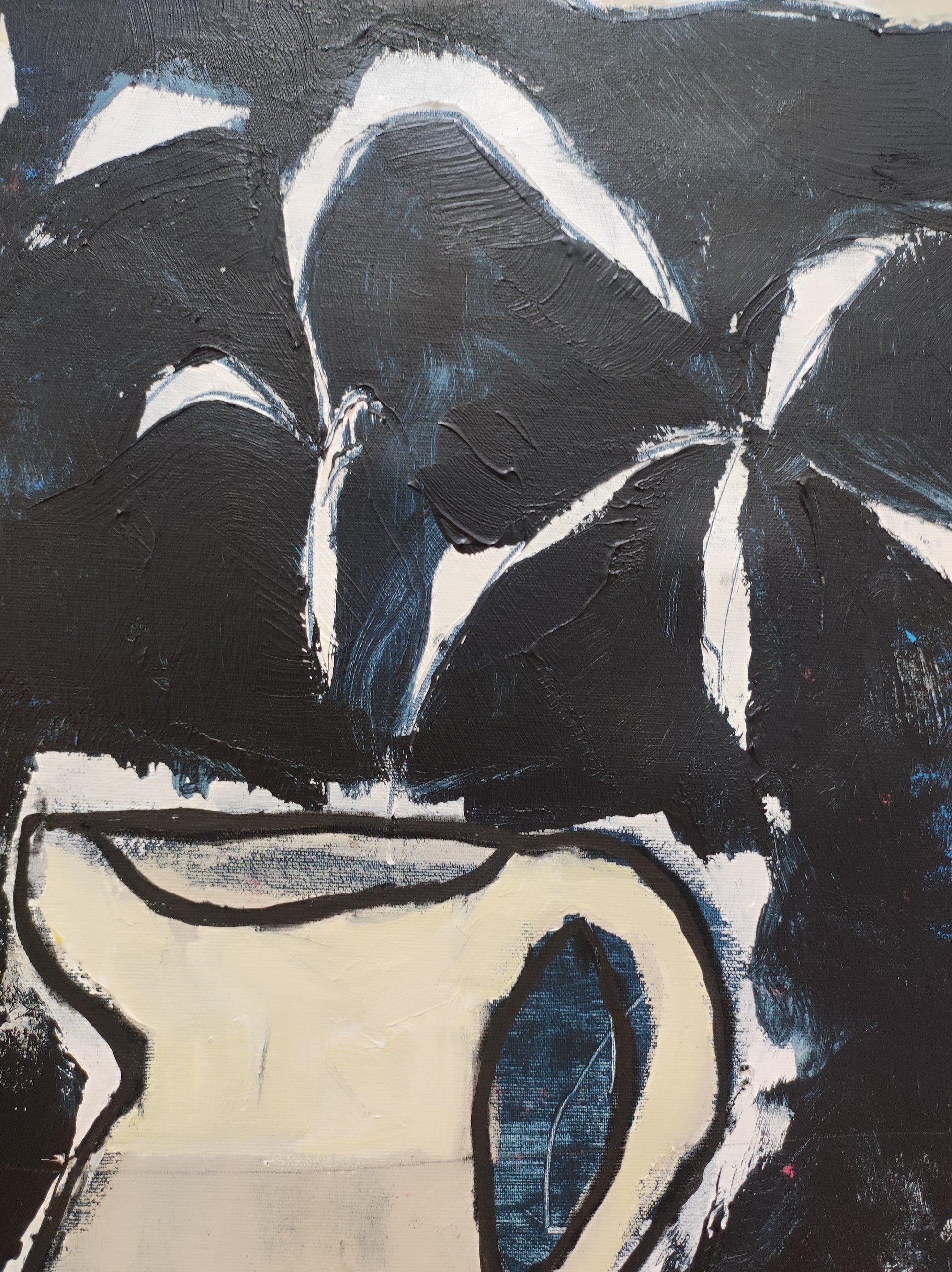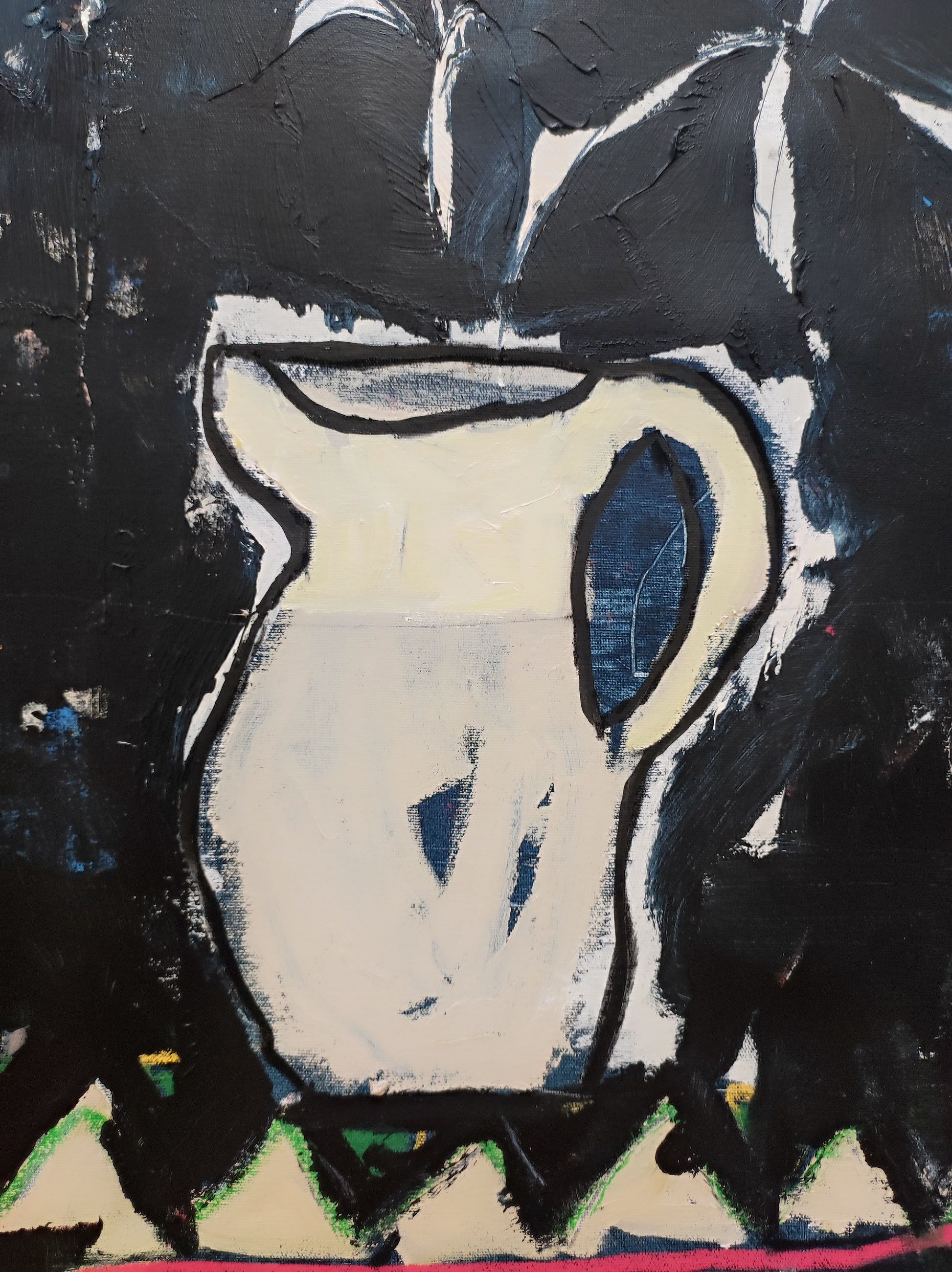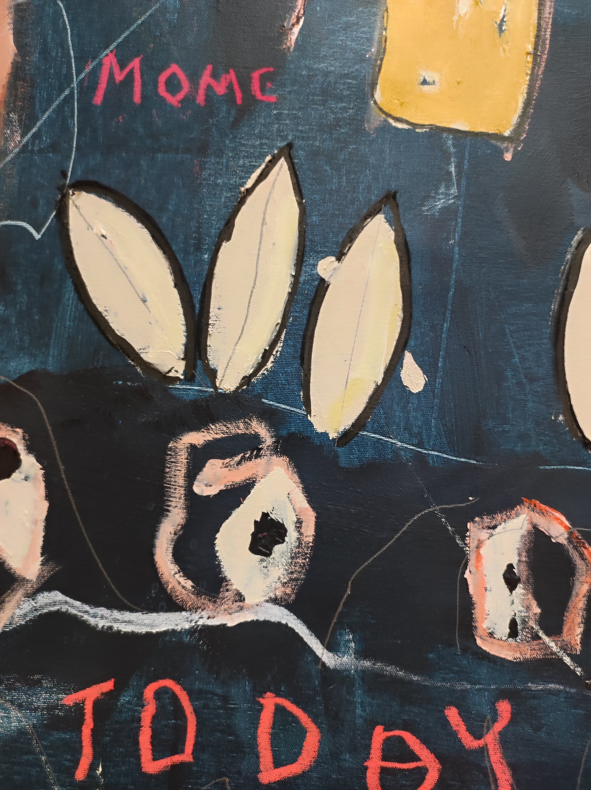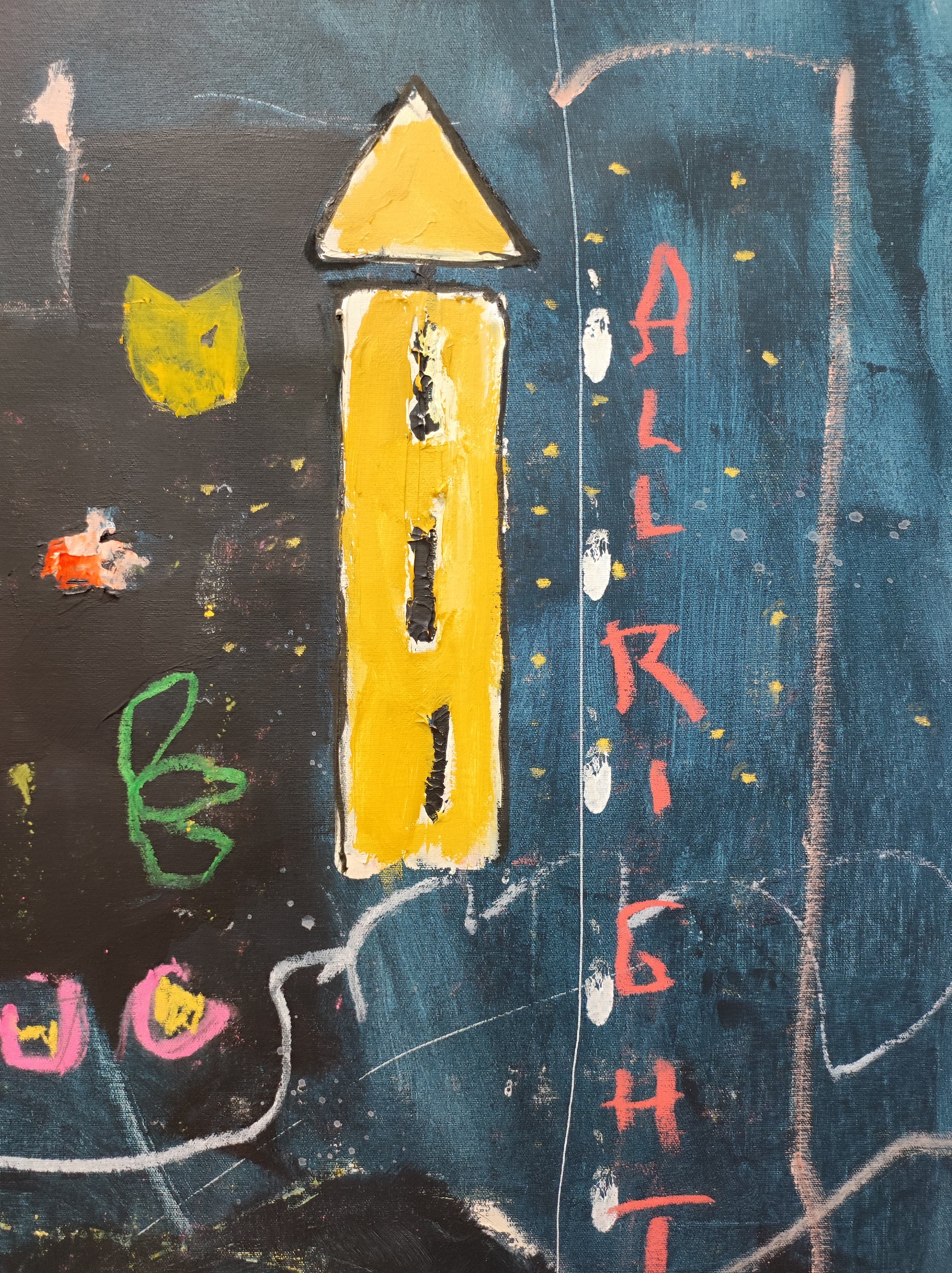 Pintura gestual, intuitiva, que deja que las cosas pasen y se apoya sobre lo que aparece. Aprovechando el accidente y aceptando las consecuencias.