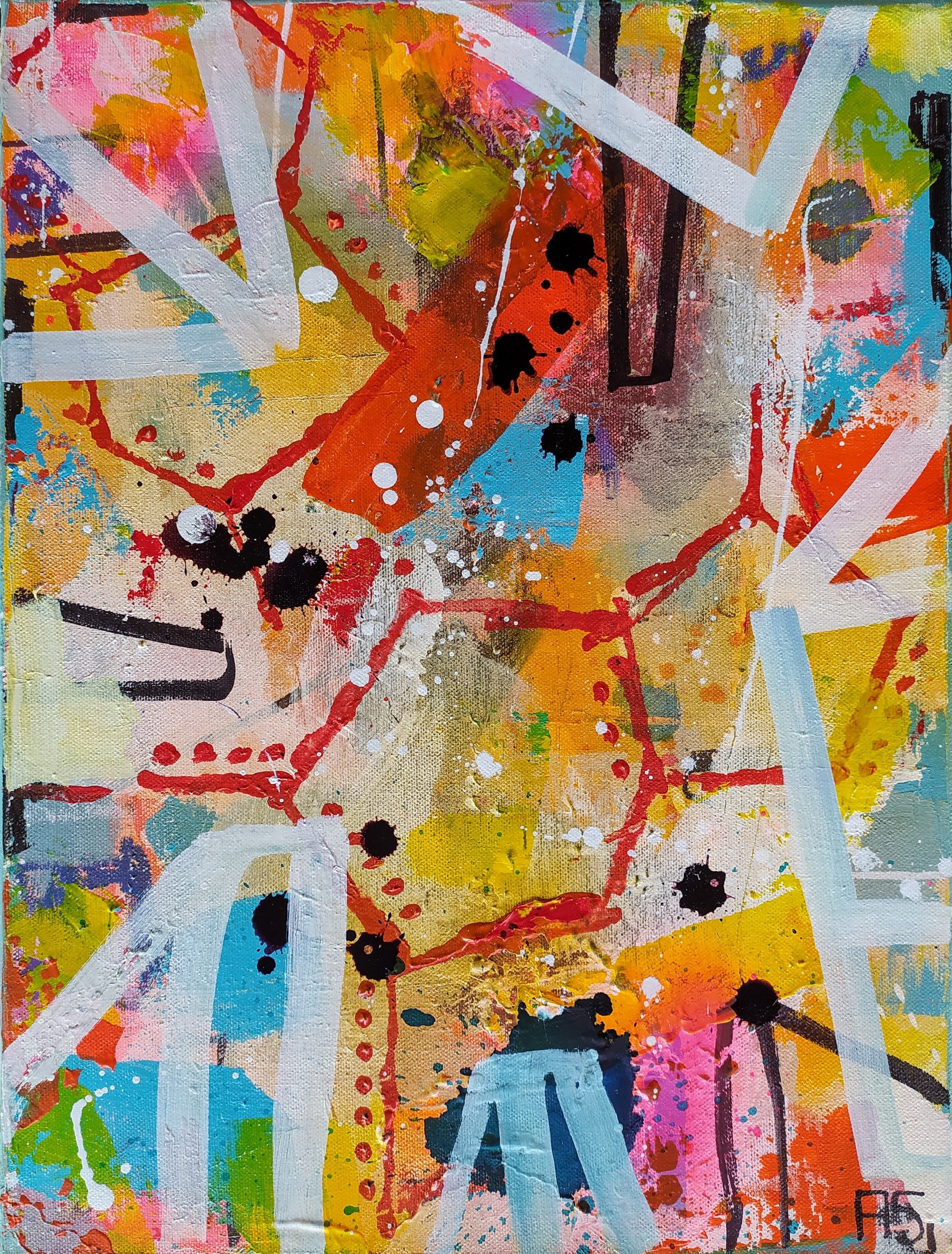 Acrílicos, tintas al alcohol, pintura en spray, rotuladores acrílicos, carboncillo y ceras. Pinceladas rápidas, manchas, marcas, dripping...