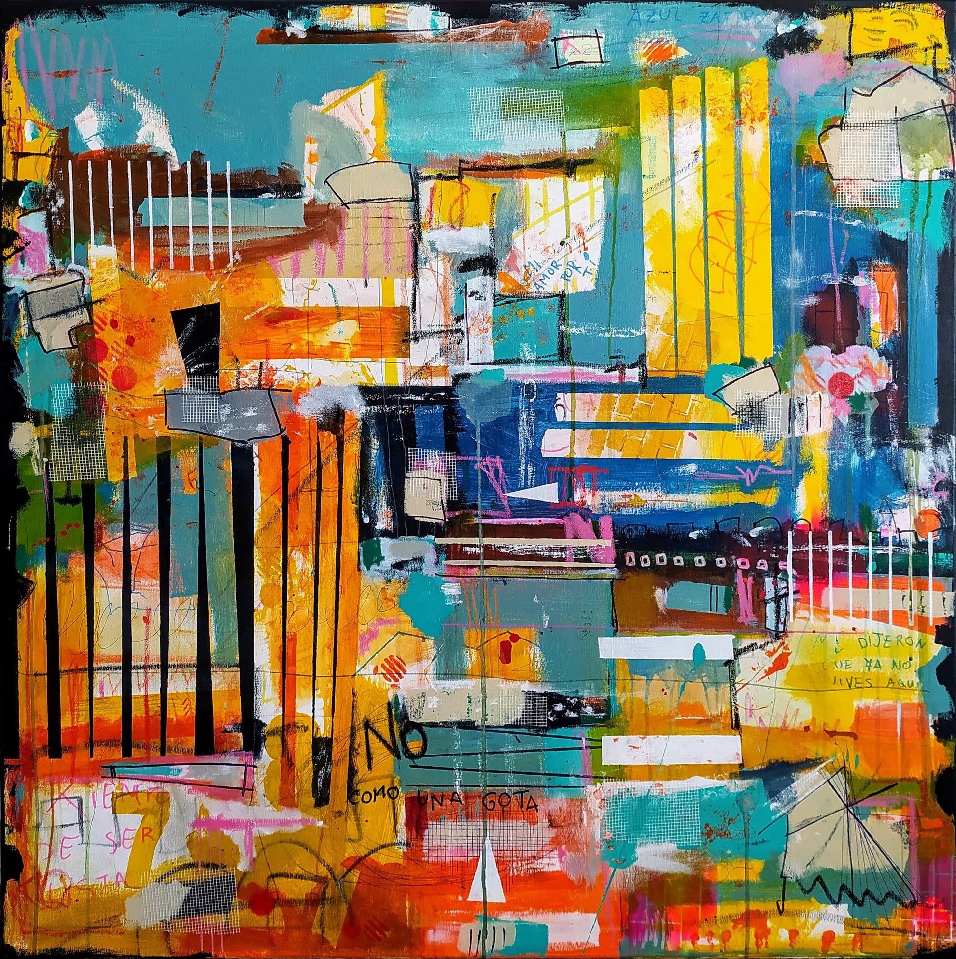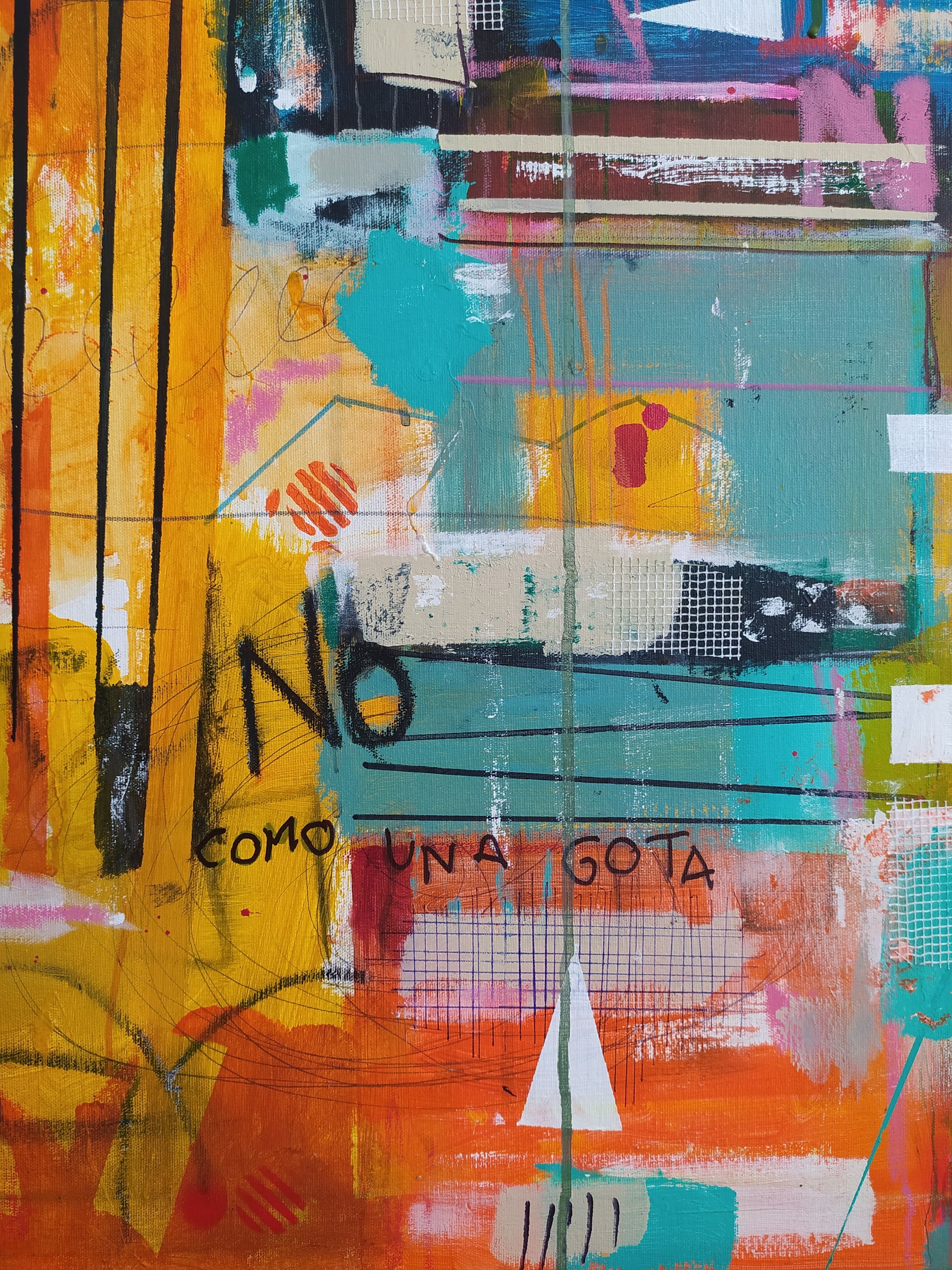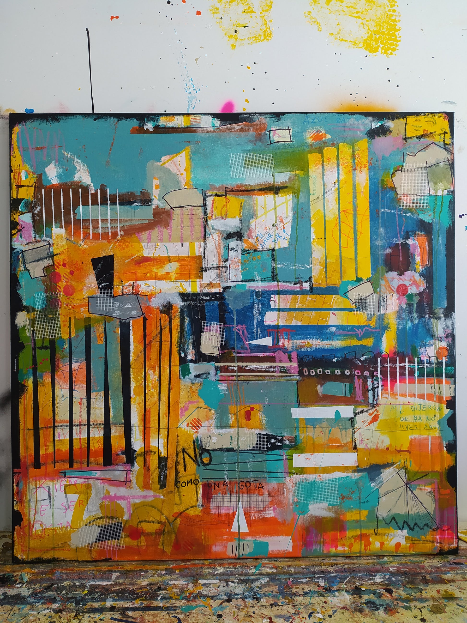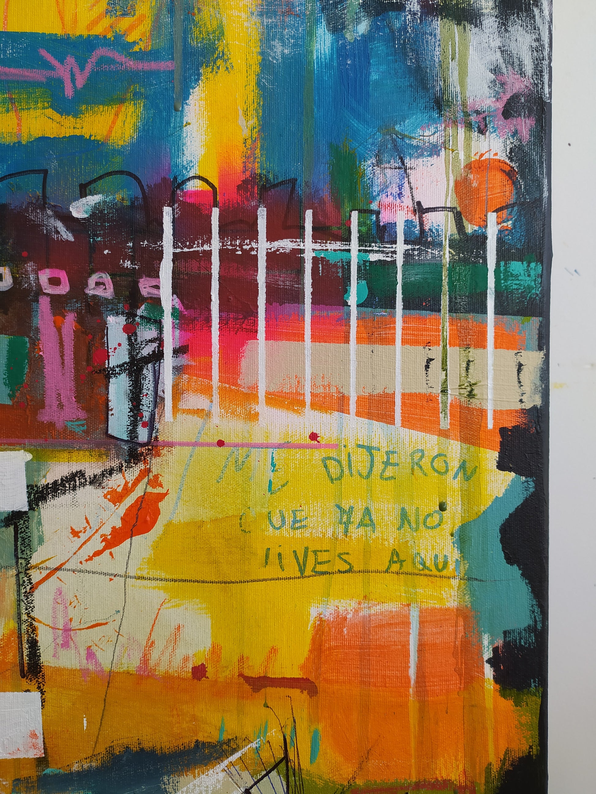 Este trabajo comienza con una primera capa creada por mis hijas de 10 y 9 años donde aparecen textos, dibujos y manchas. Sobre ella voy añadiendo capas y desarrollando un paisaje urbano un poco random donde los elementos chocan unos con otros, encajando de alguna manera poco dirigida.
