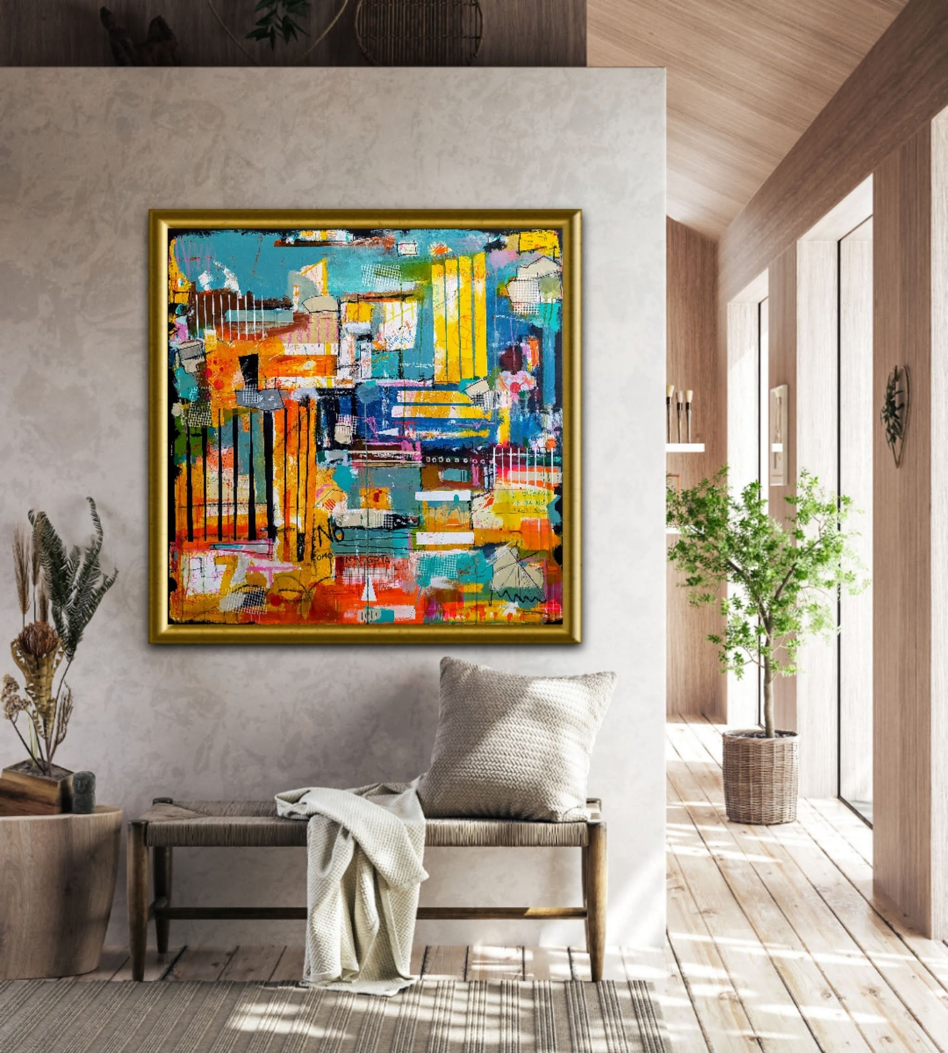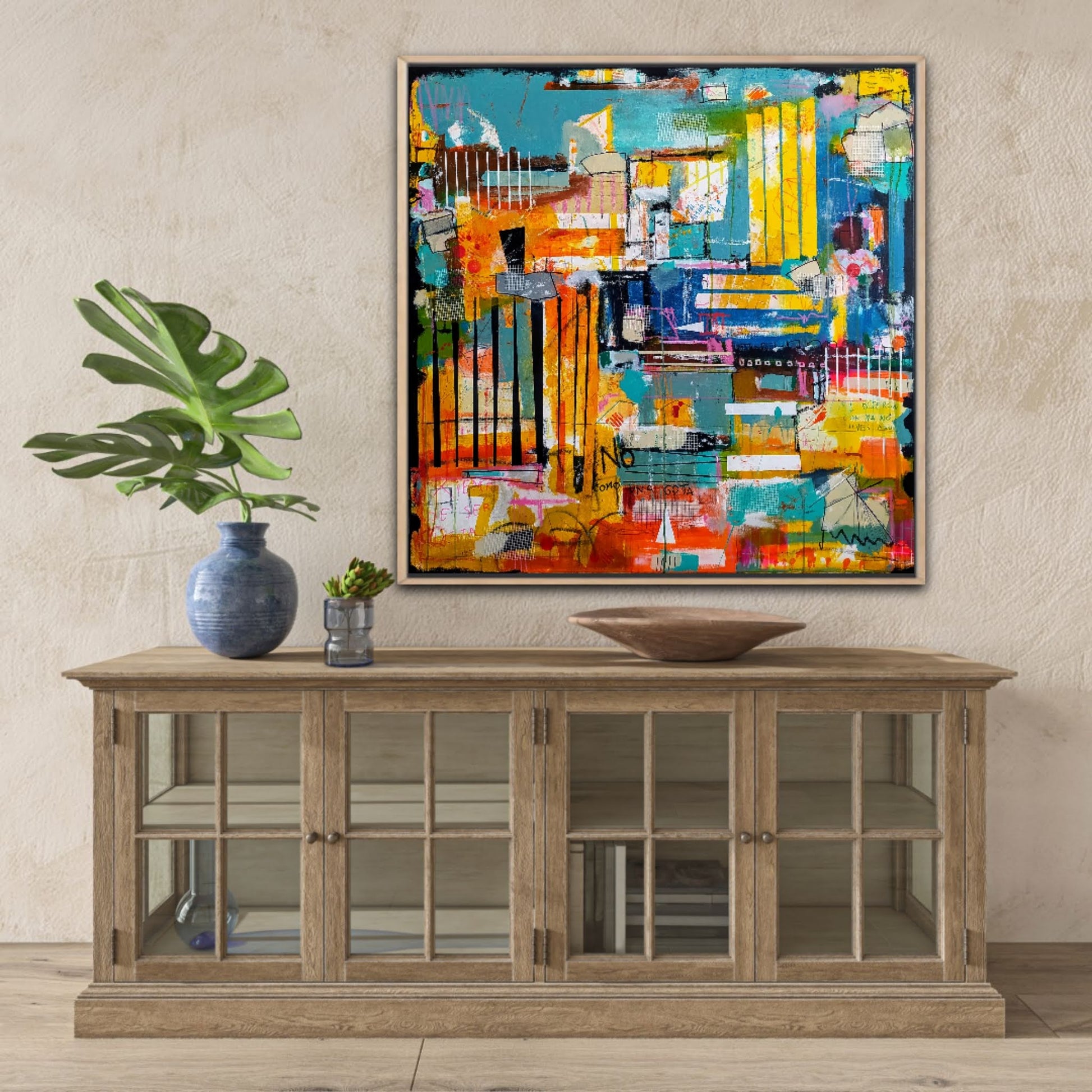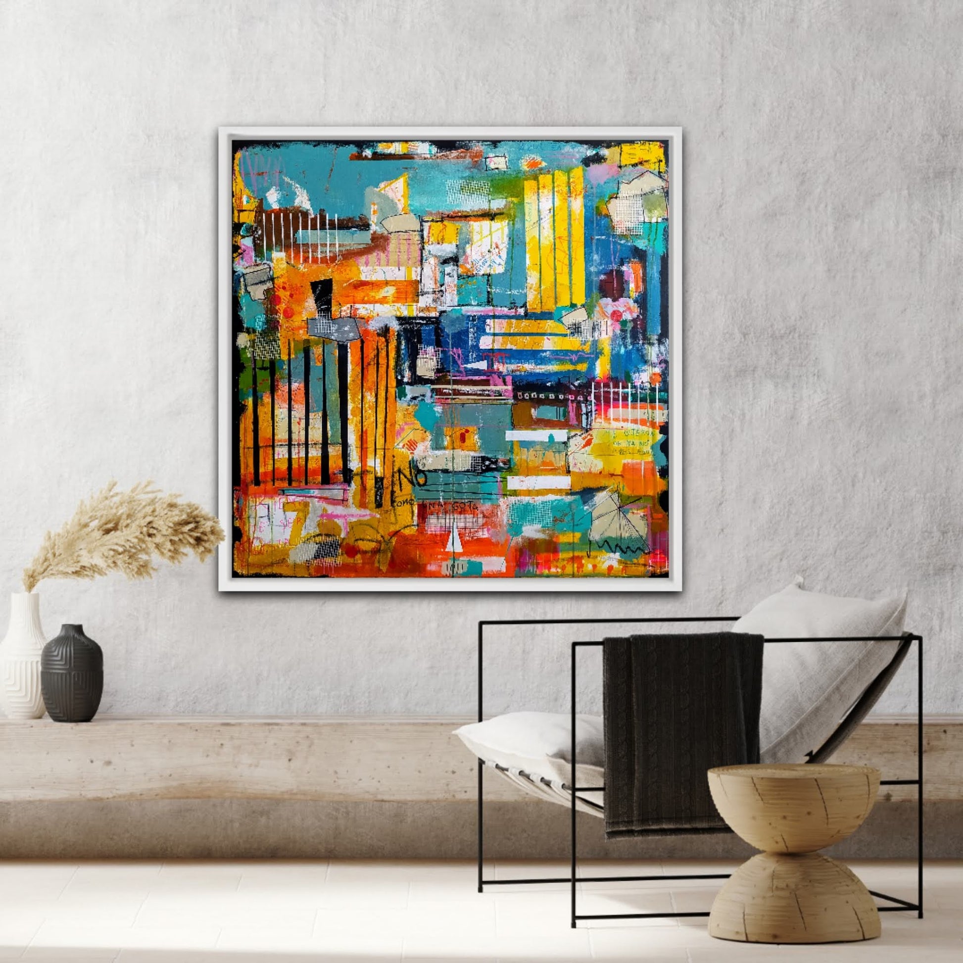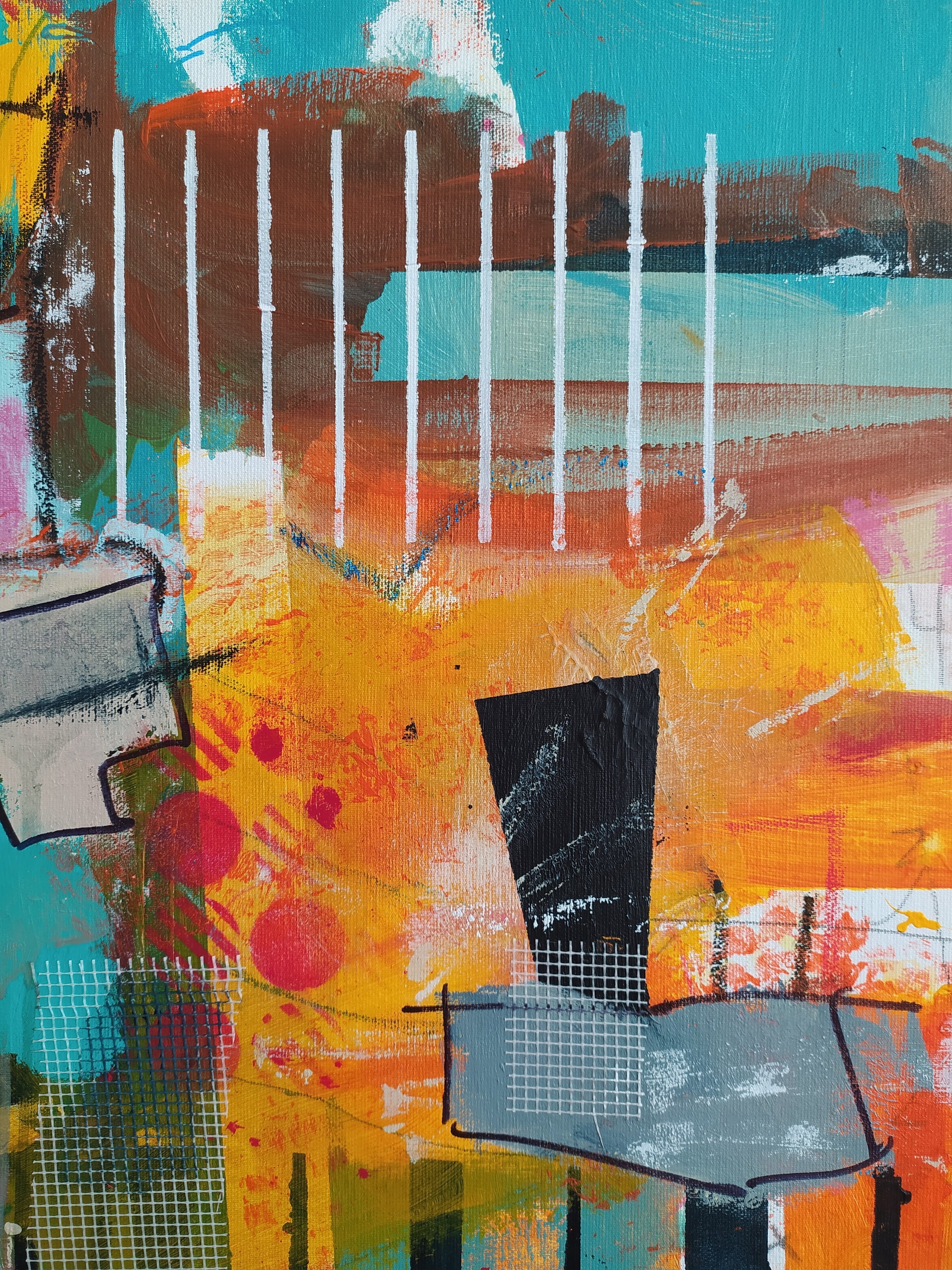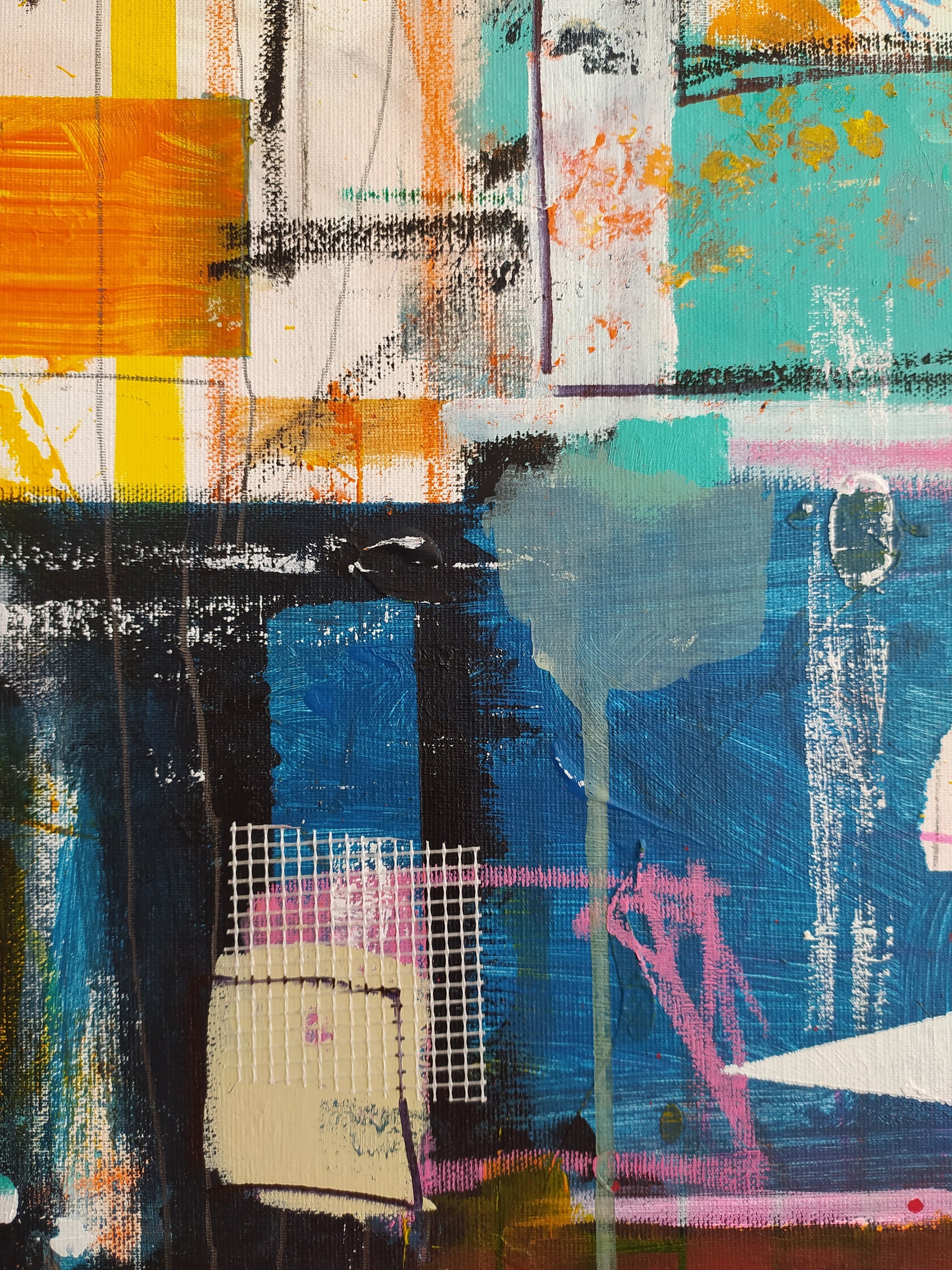 Este trabajo comienza con una primera capa creada por mis hijas de 10 y 9 años donde aparecen textos, dibujos y manchas. Sobre ella voy añadiendo capas y desarrollando un paisaje urbano un poco random donde los elementos chocan unos con otros, encajando de alguna manera poco dirigida.