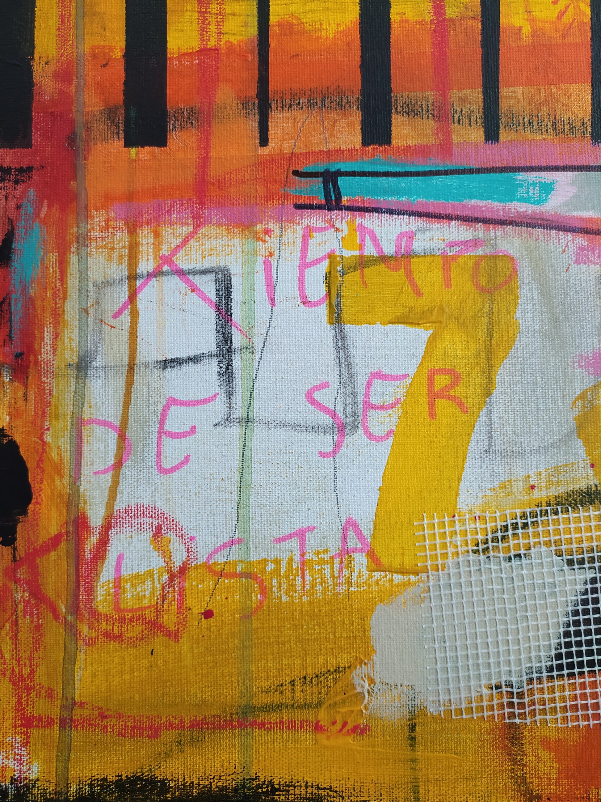Técnica: acrílico, pintura en spray, ceras, rotuladores, bolígrafo, malla de fibra de vidrio.