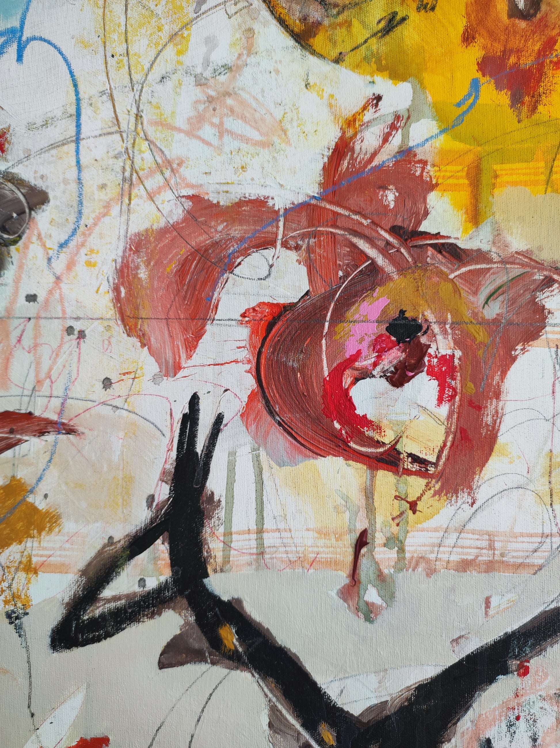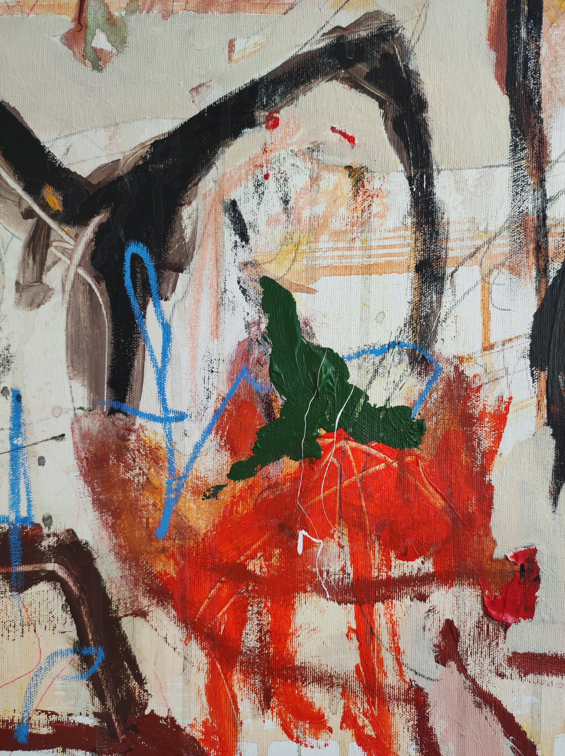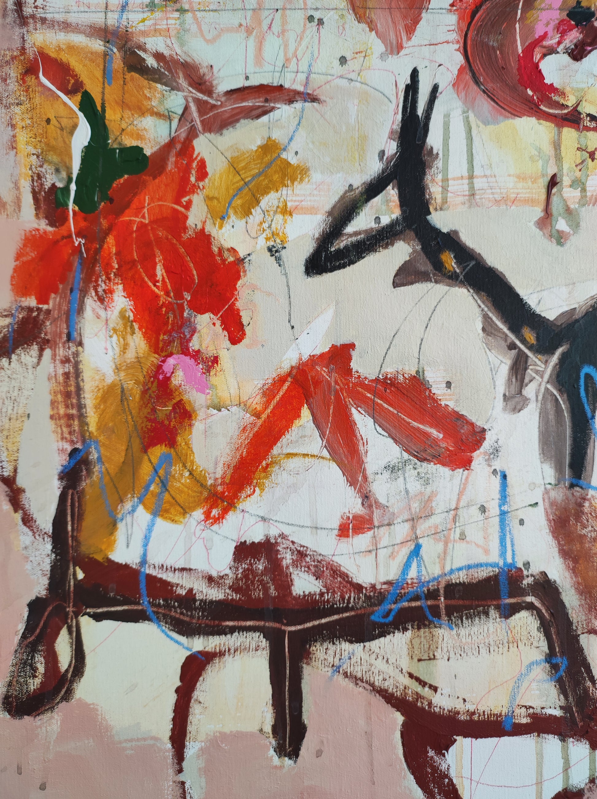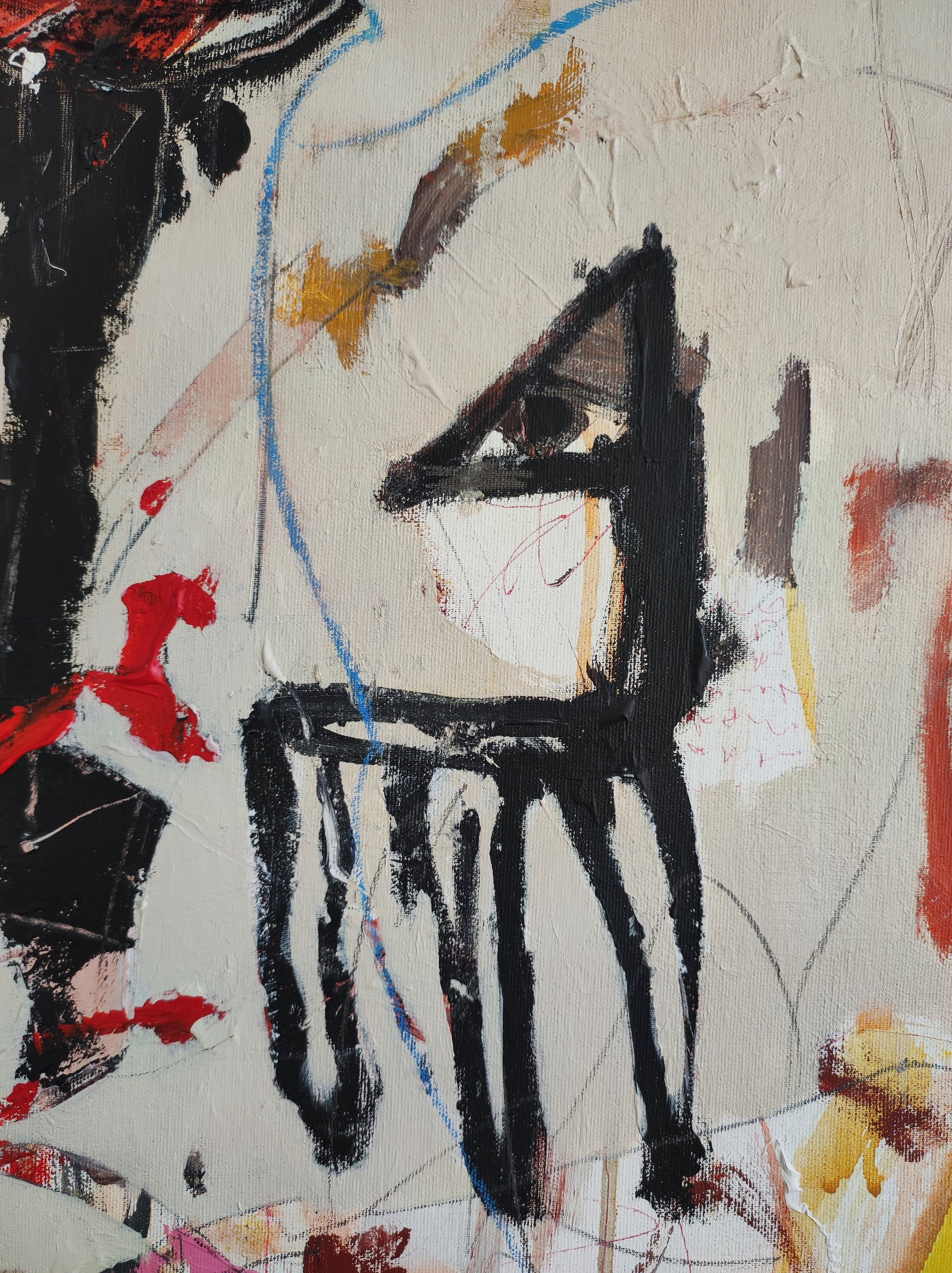 Pintura gestual, intuitiva, que deja que las cosas pasen y se apoya sobre lo que aparece. Aprovechando el accidente y aceptando las consecuencias.