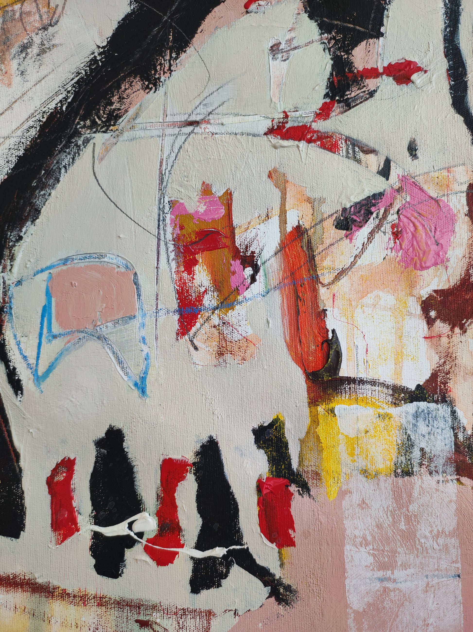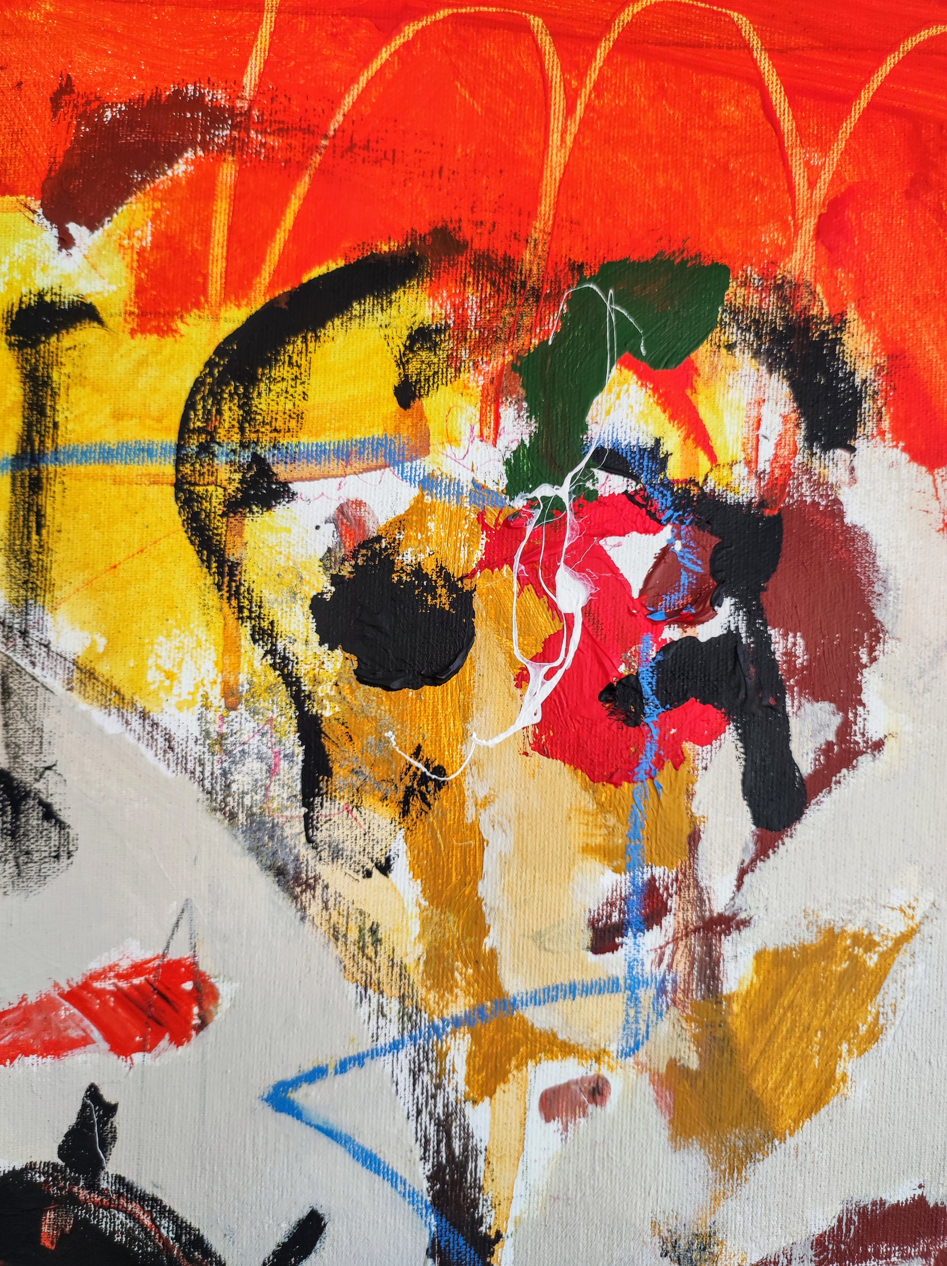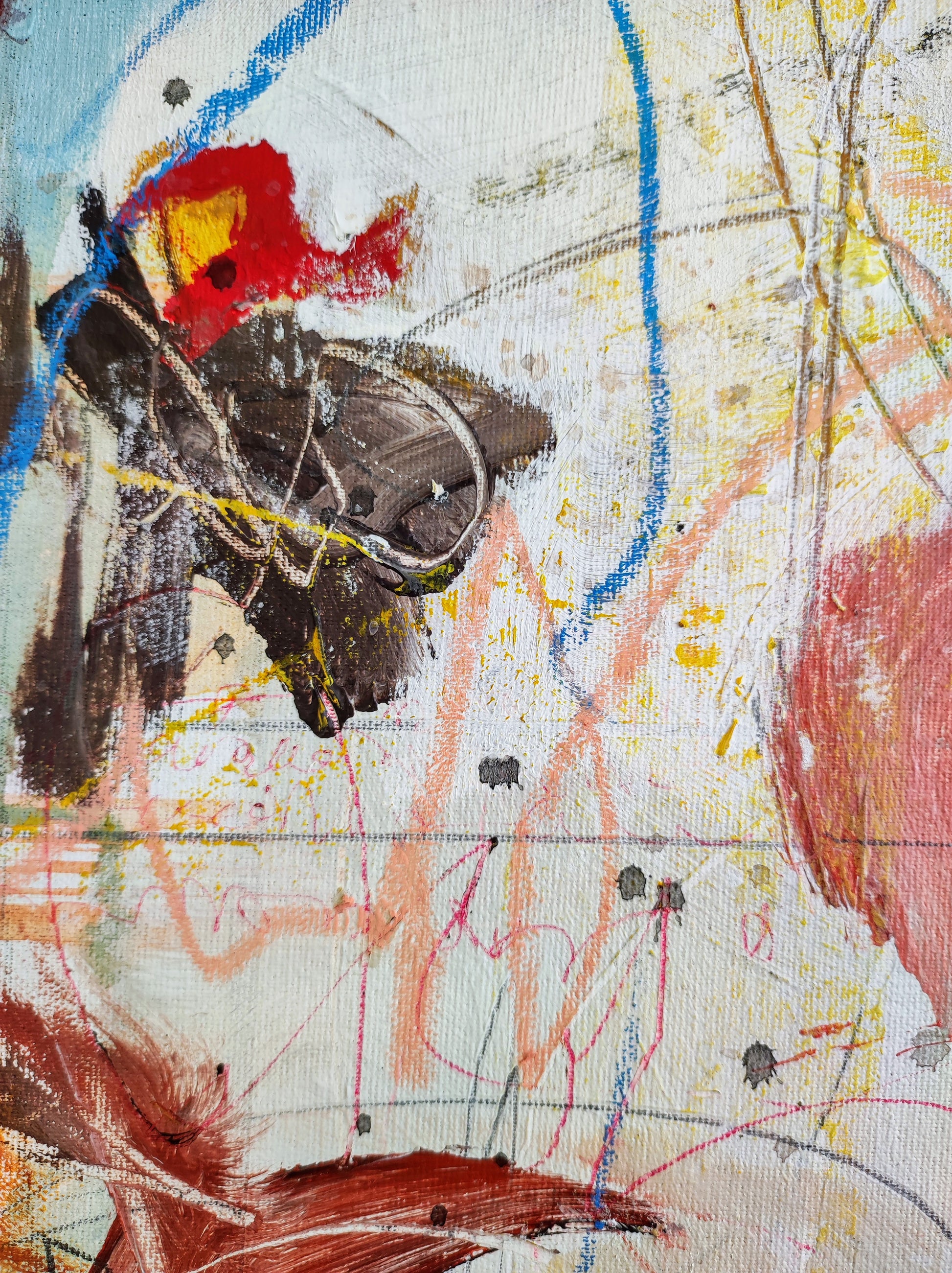 Pintura gestual, intuitiva, que deja que las cosas pasen y se apoya sobre lo que aparece. Aprovechando el accidente y aceptando las consecuencias.