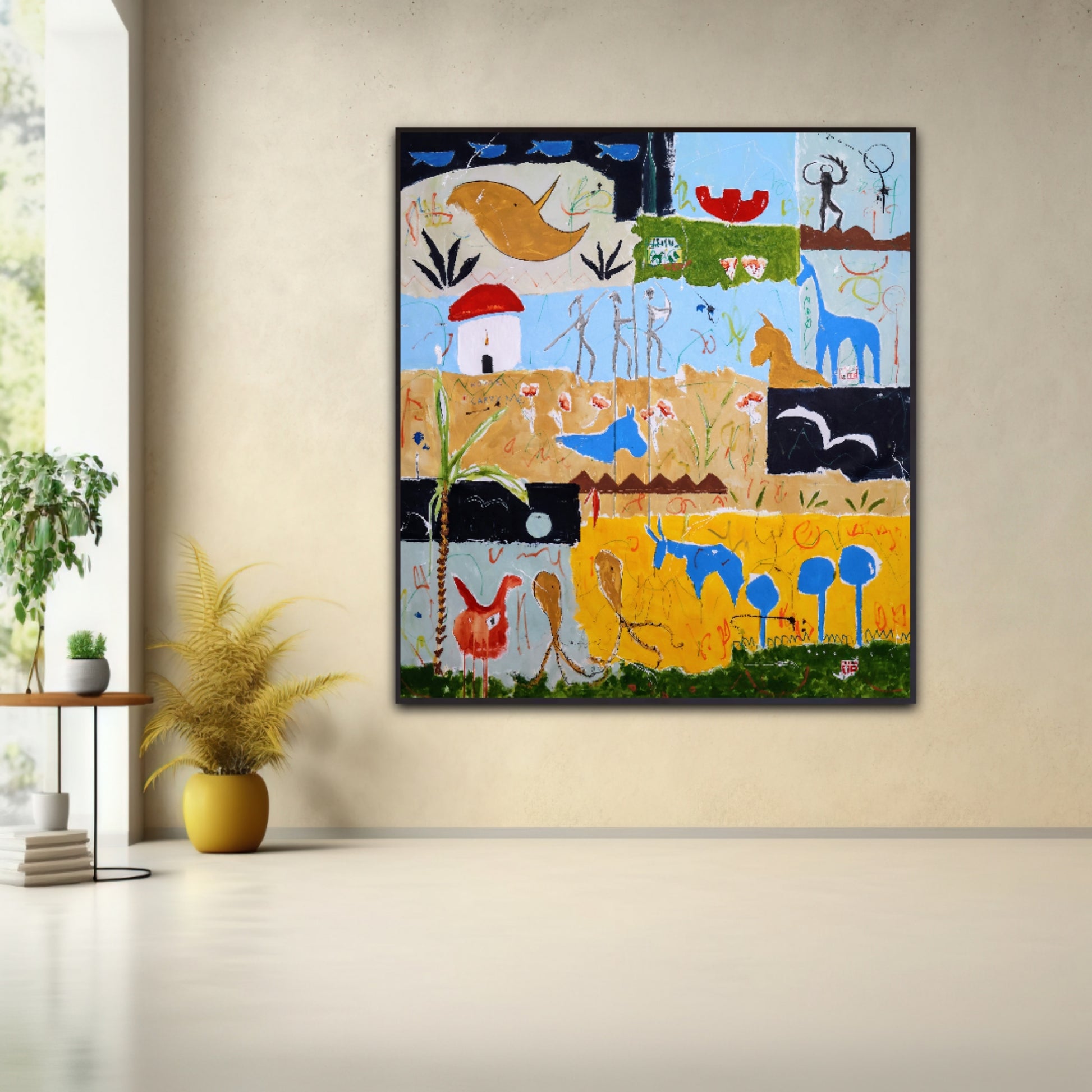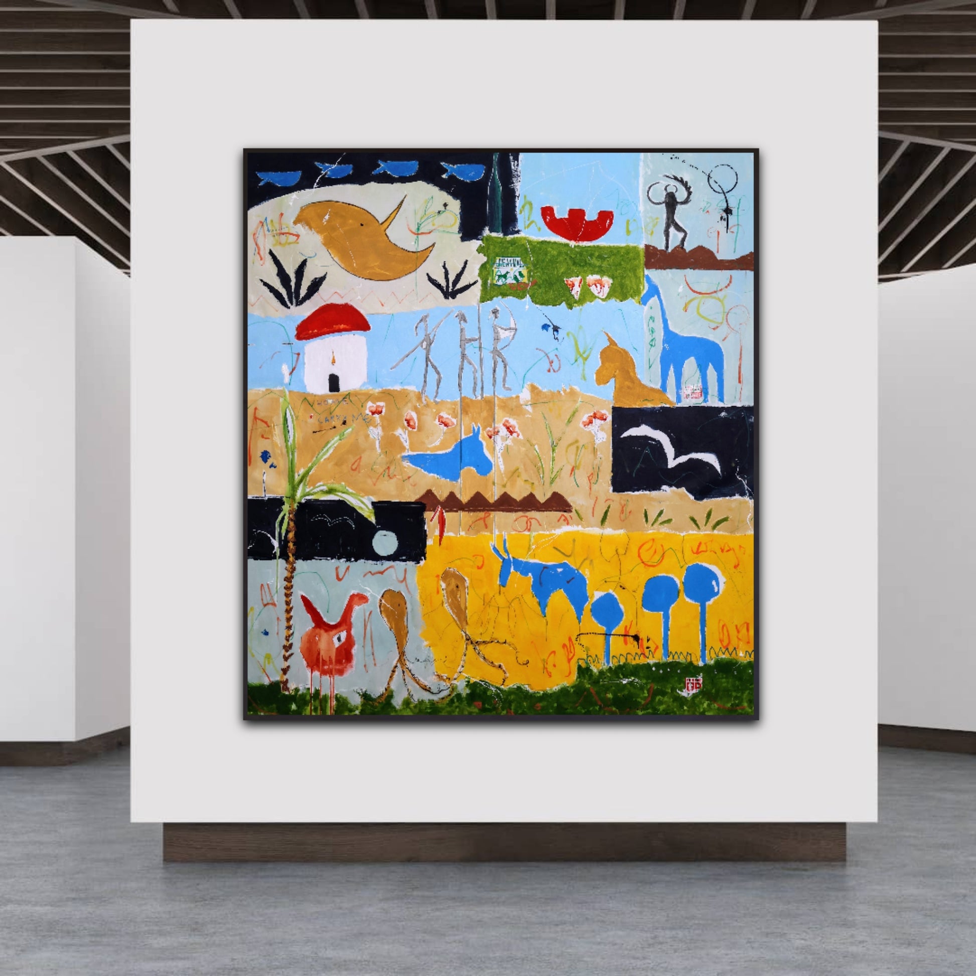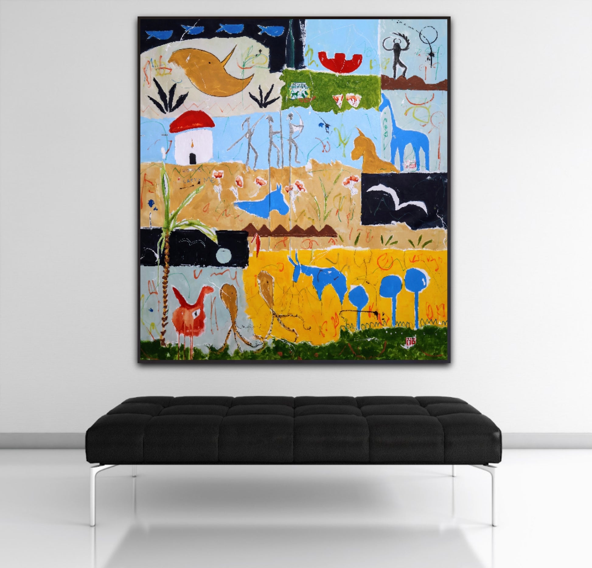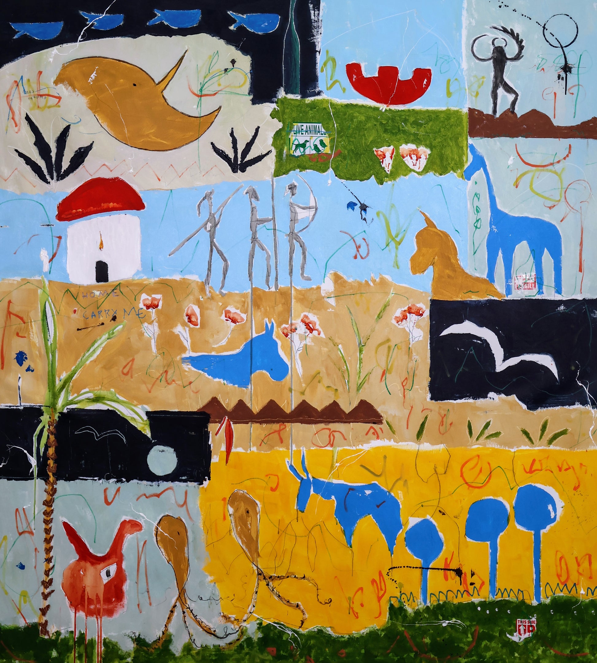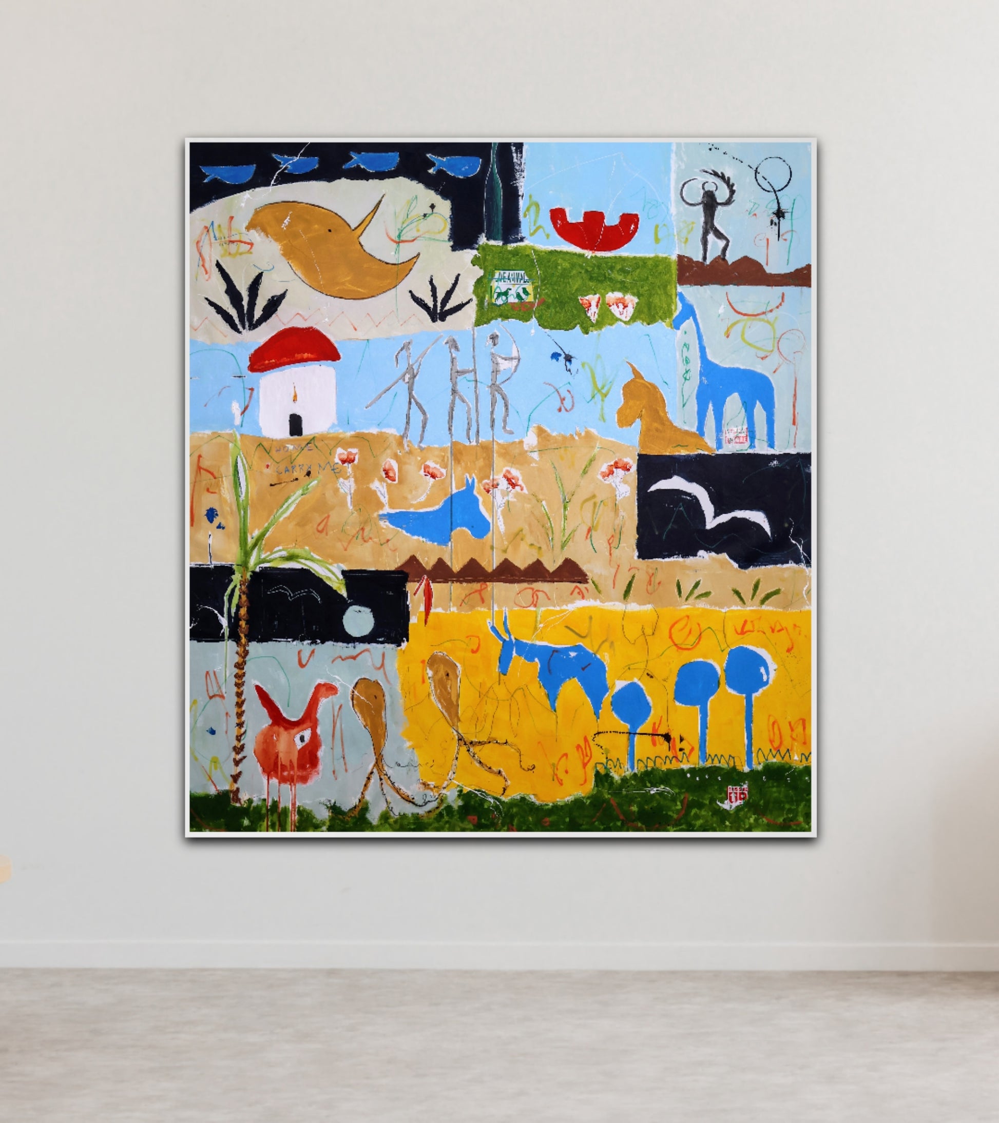 Técnica: acrílico, pigmentos, lápiz, gesso y adhesivos.