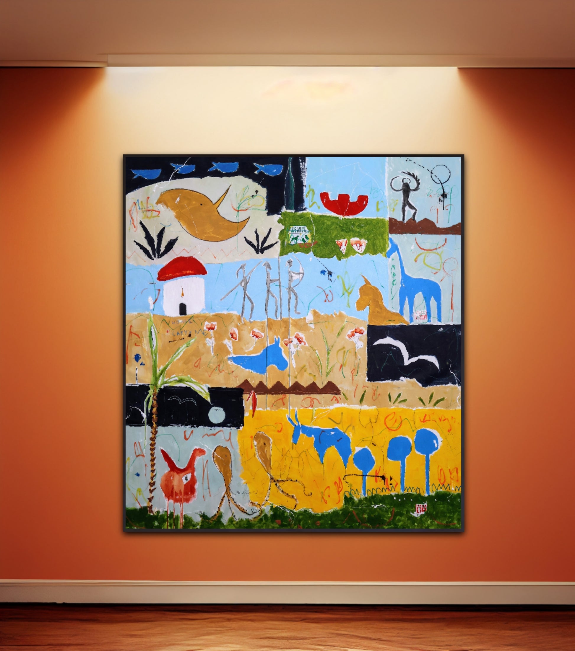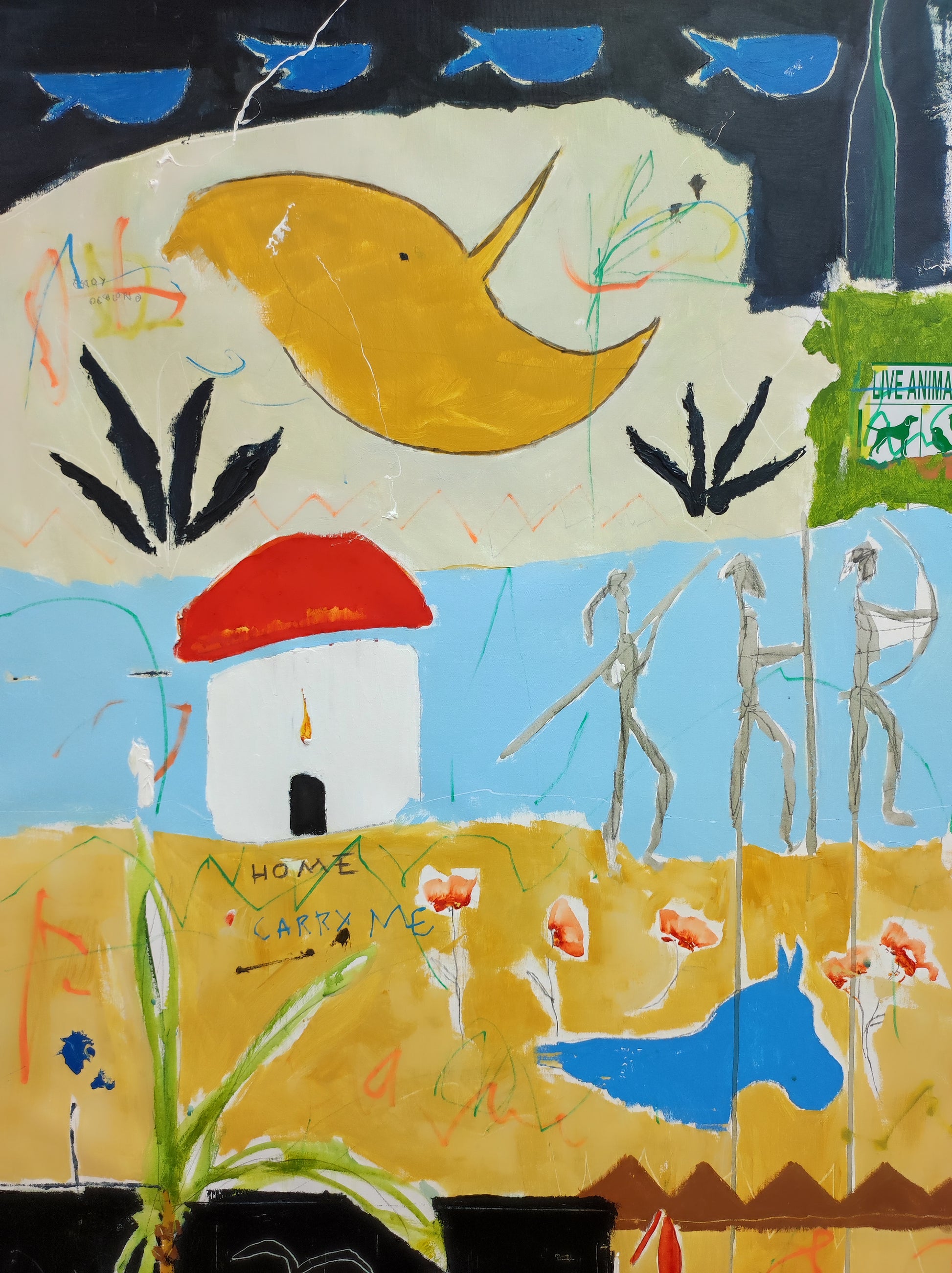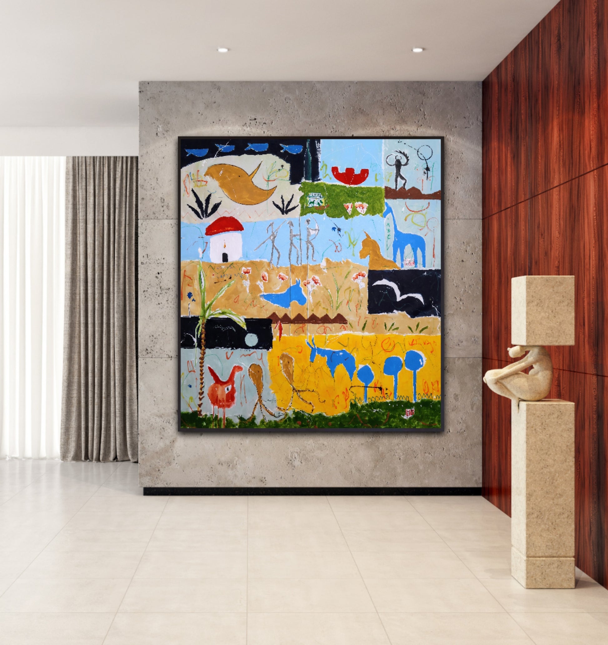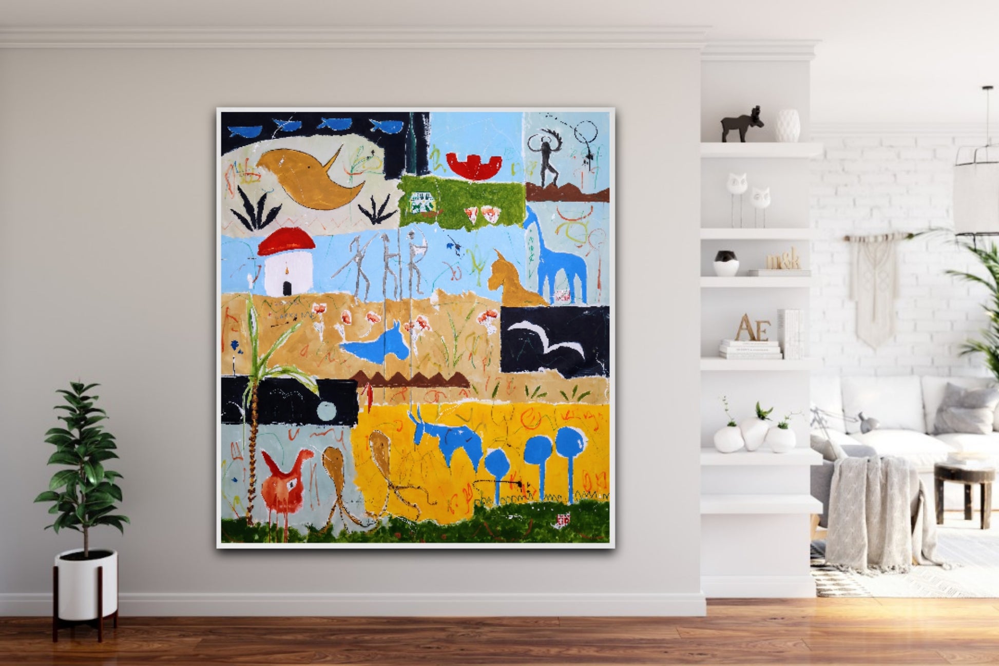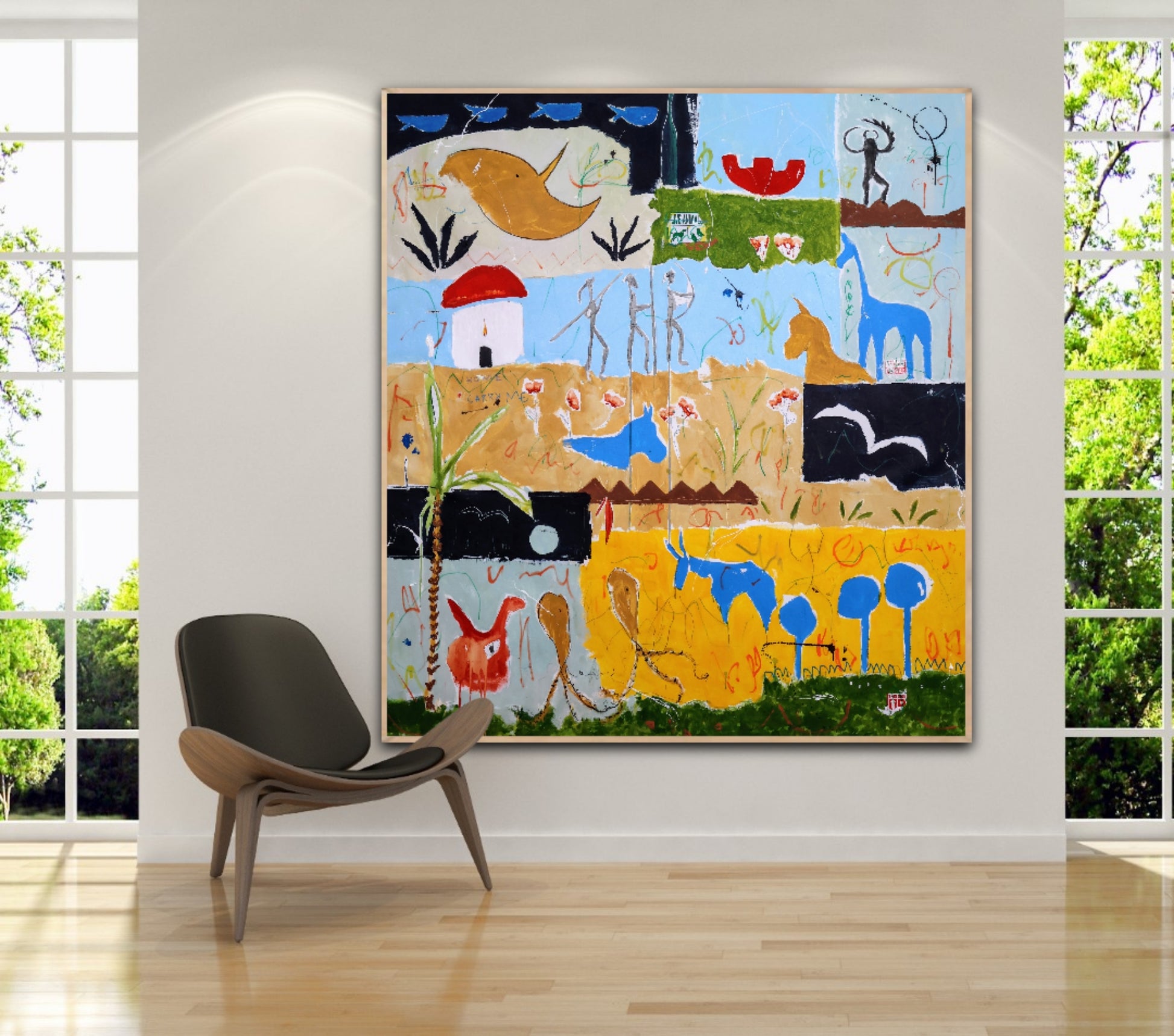Técnica: acrílico, pigmentos, lápiz, gesso y adhesivos.