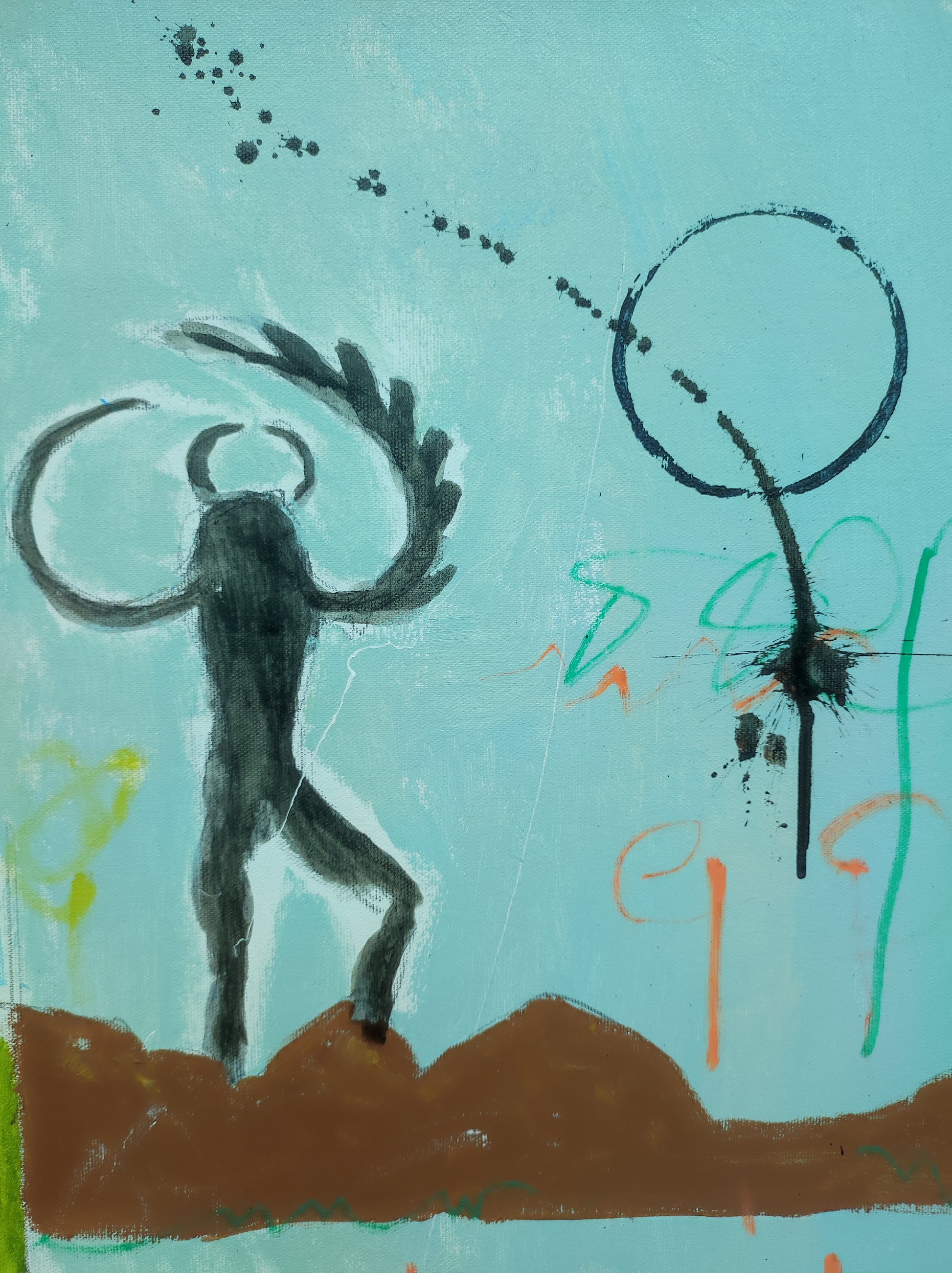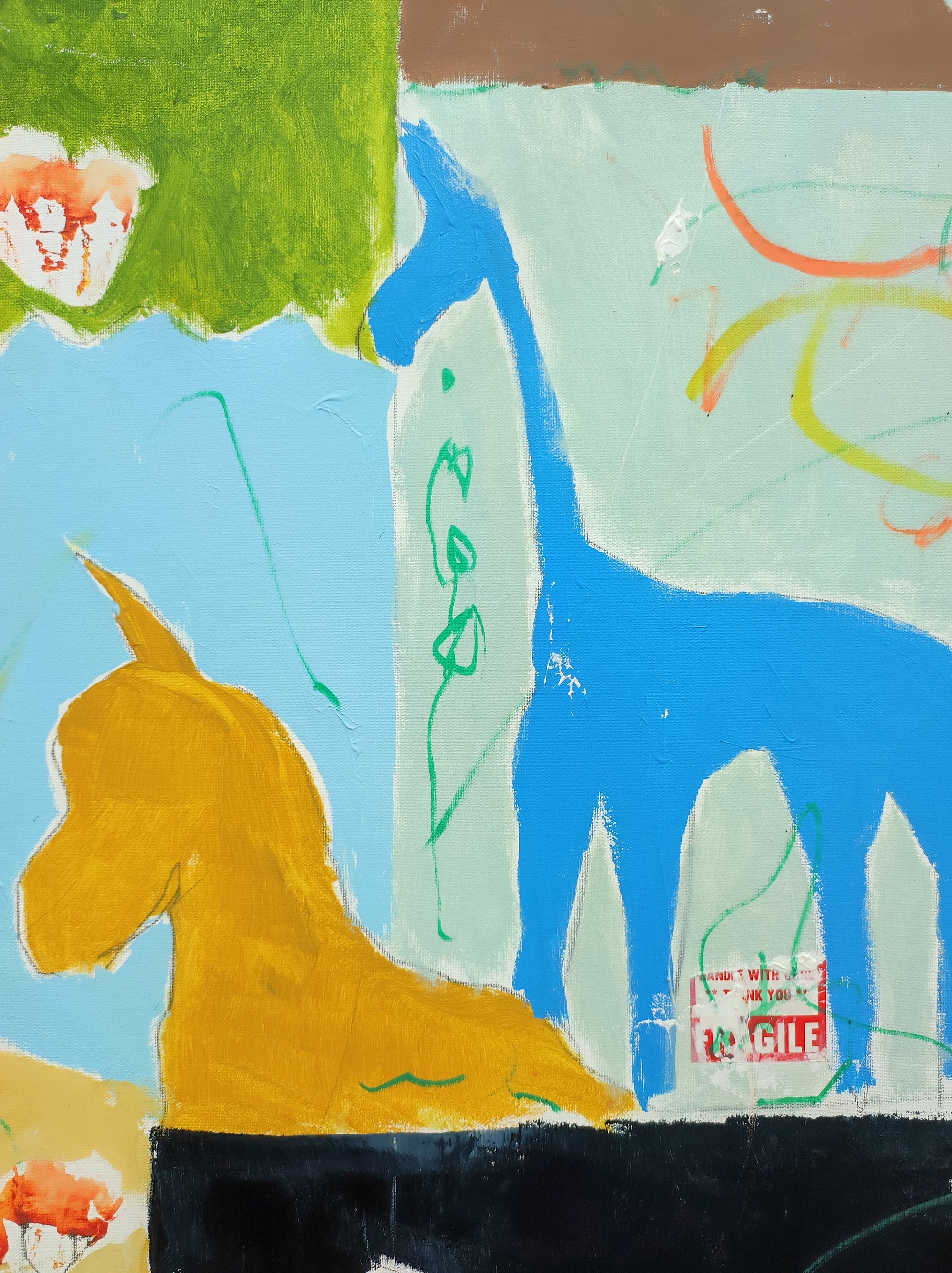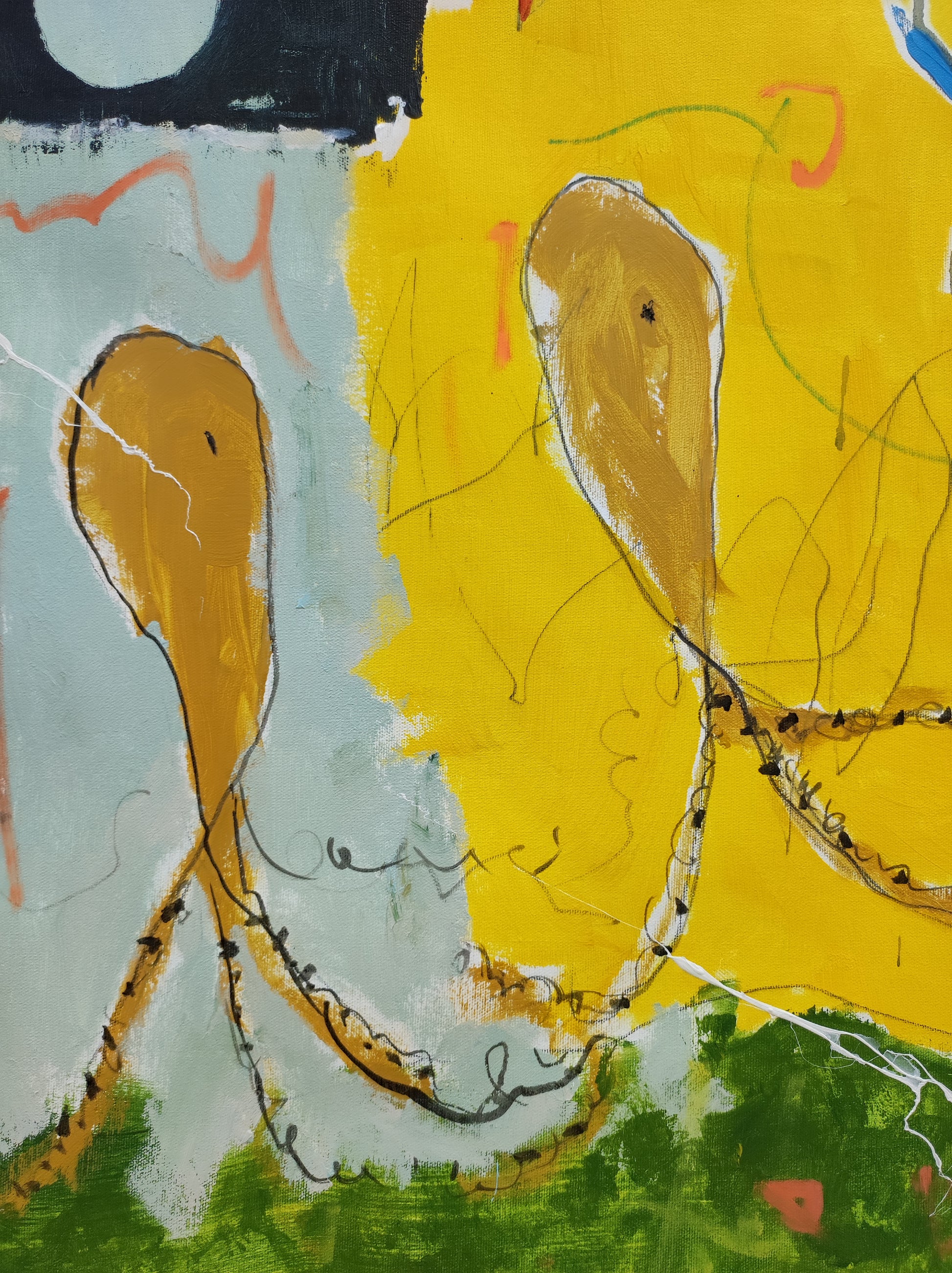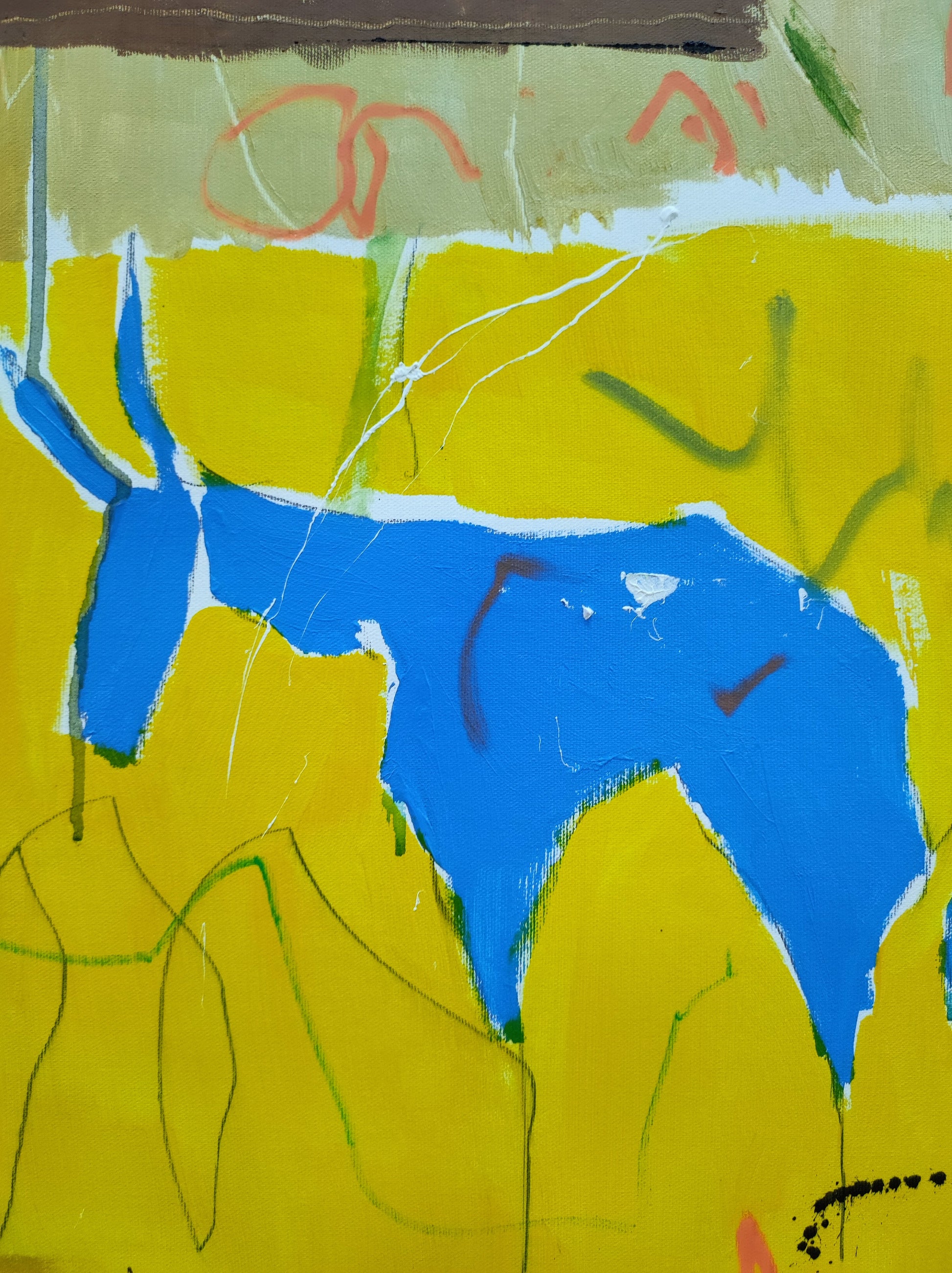 Pintura gestual, intuitiva, que deja que las cosas pasen y se apoya sobre lo que aparece. Aprovechando el accidente y aceptando las consecuencias.