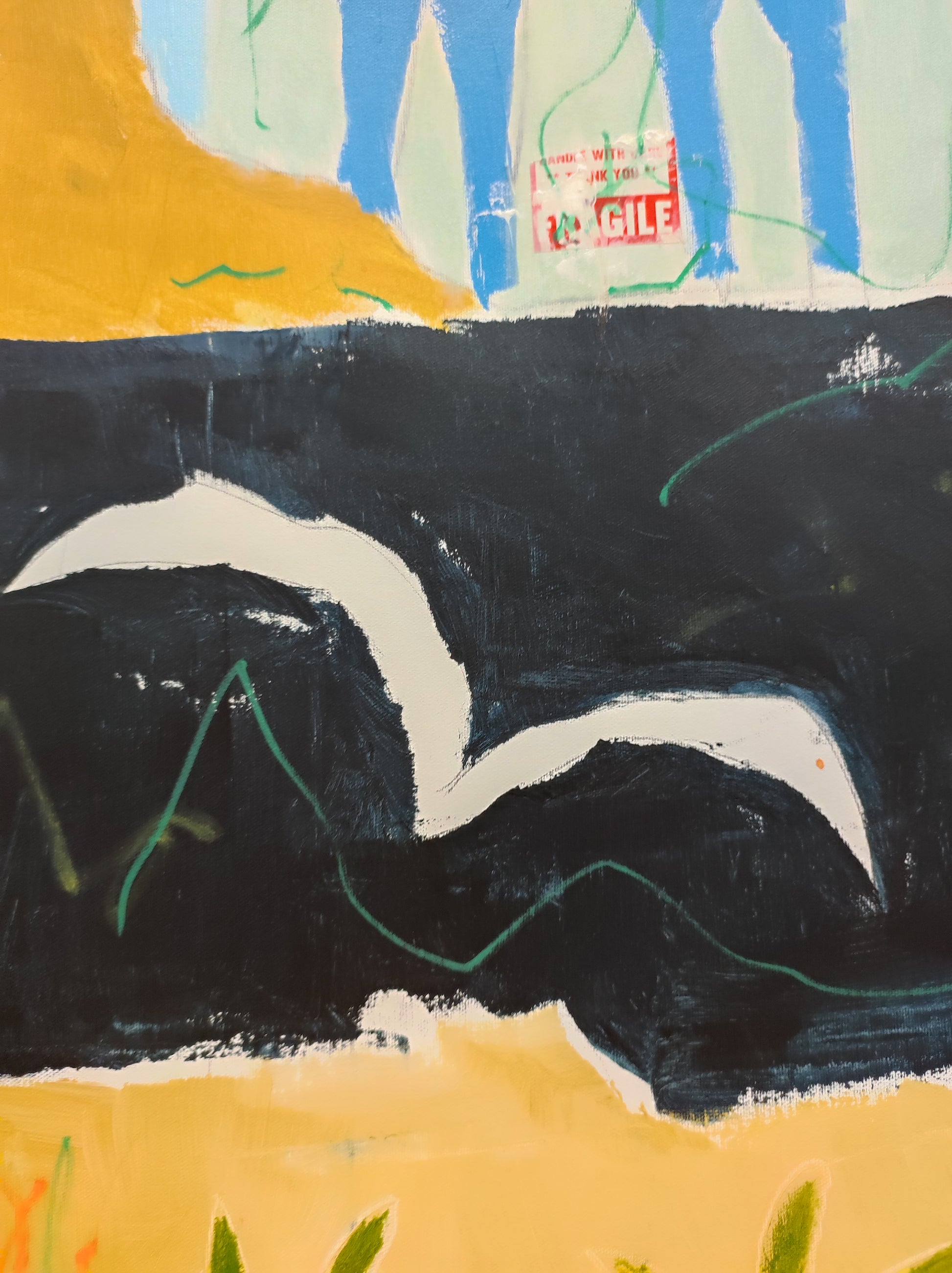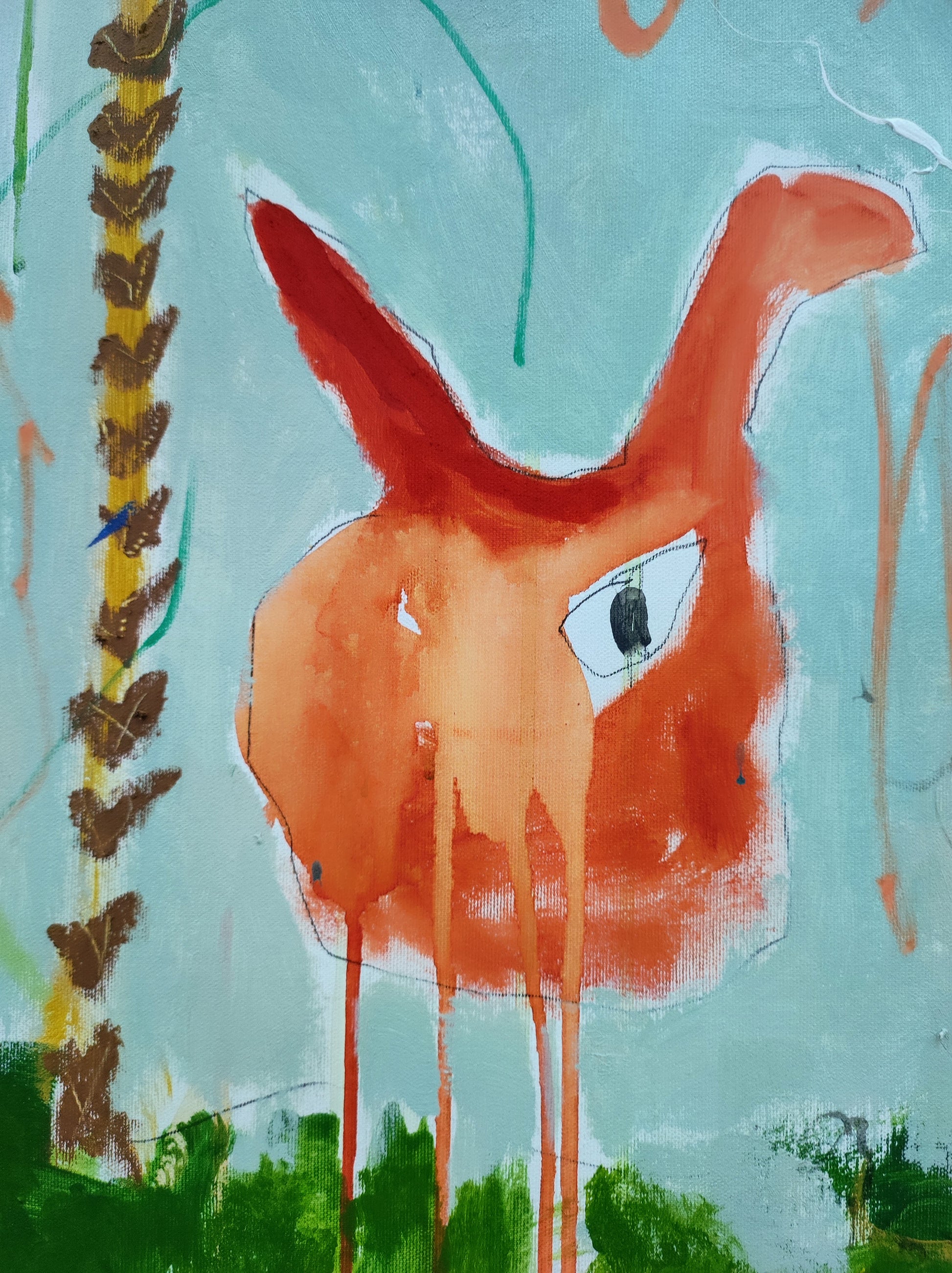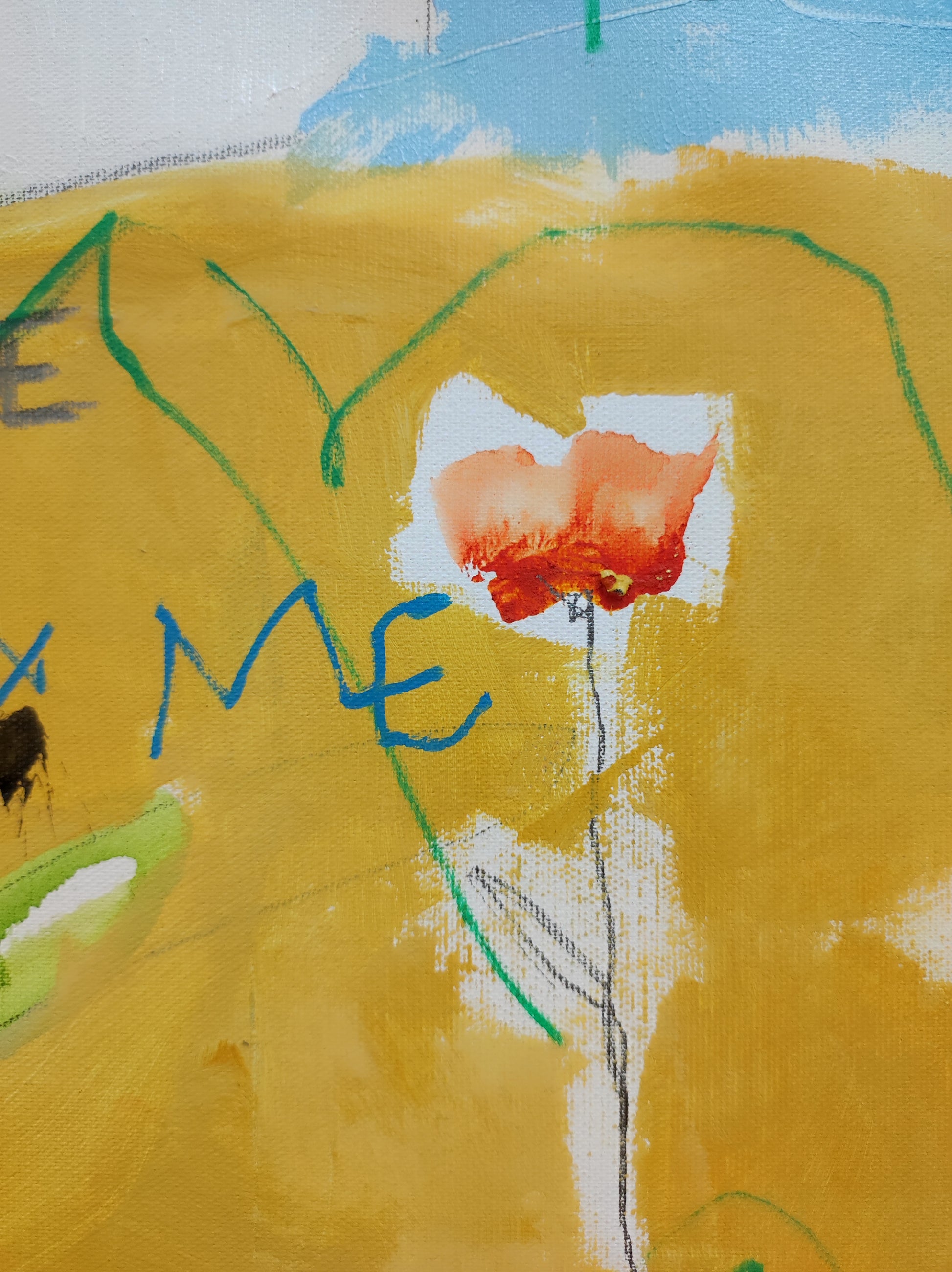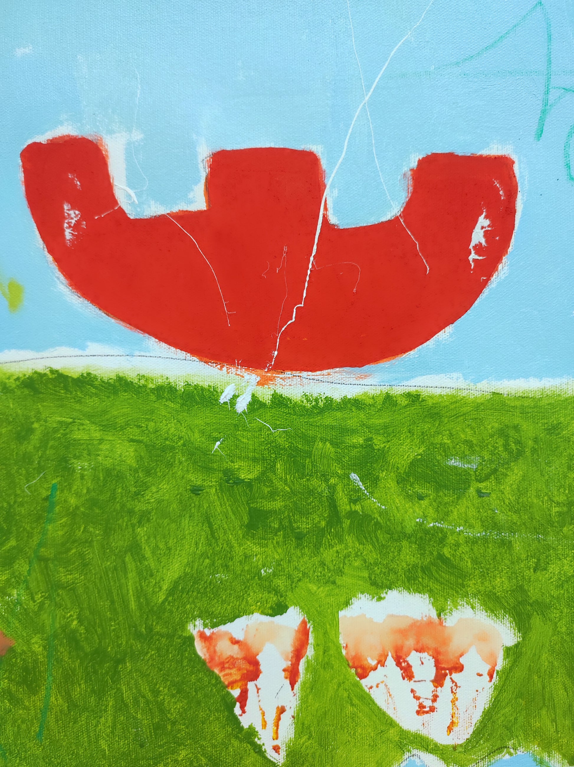 Pintura gestual, intuitiva, que deja que las cosas pasen y se apoya sobre lo que aparece. Aprovechando el accidente y aceptando las consecuencias.