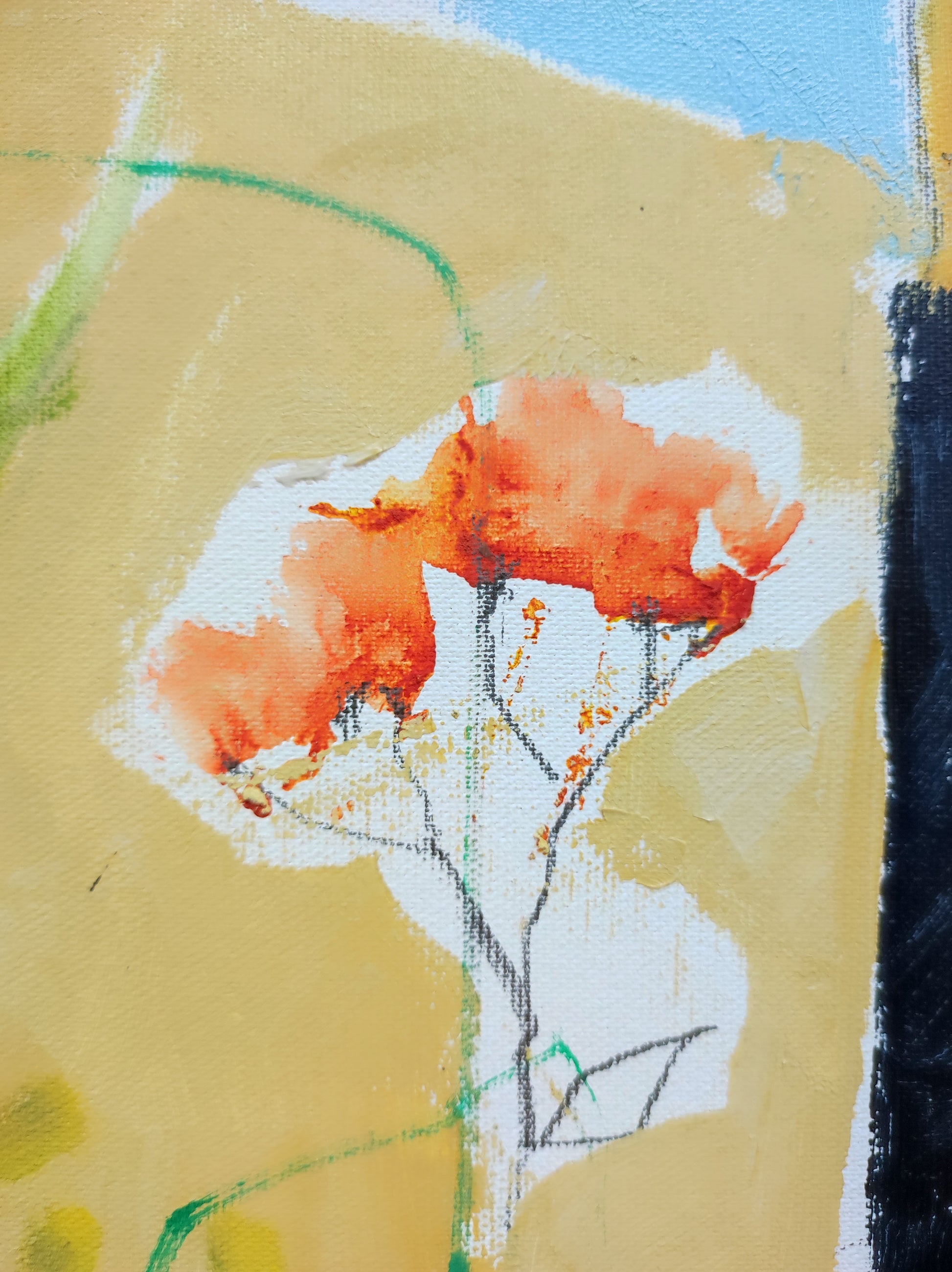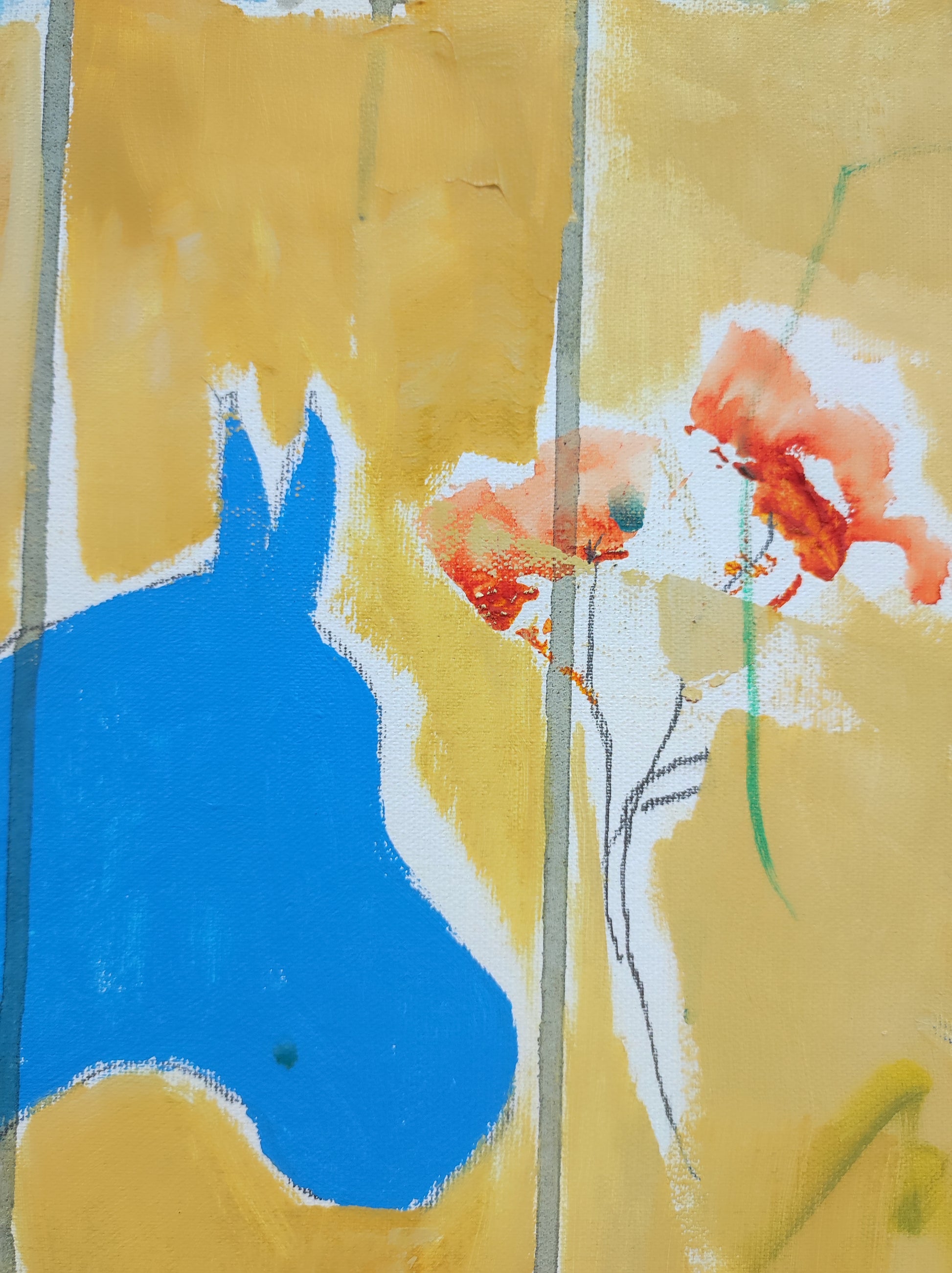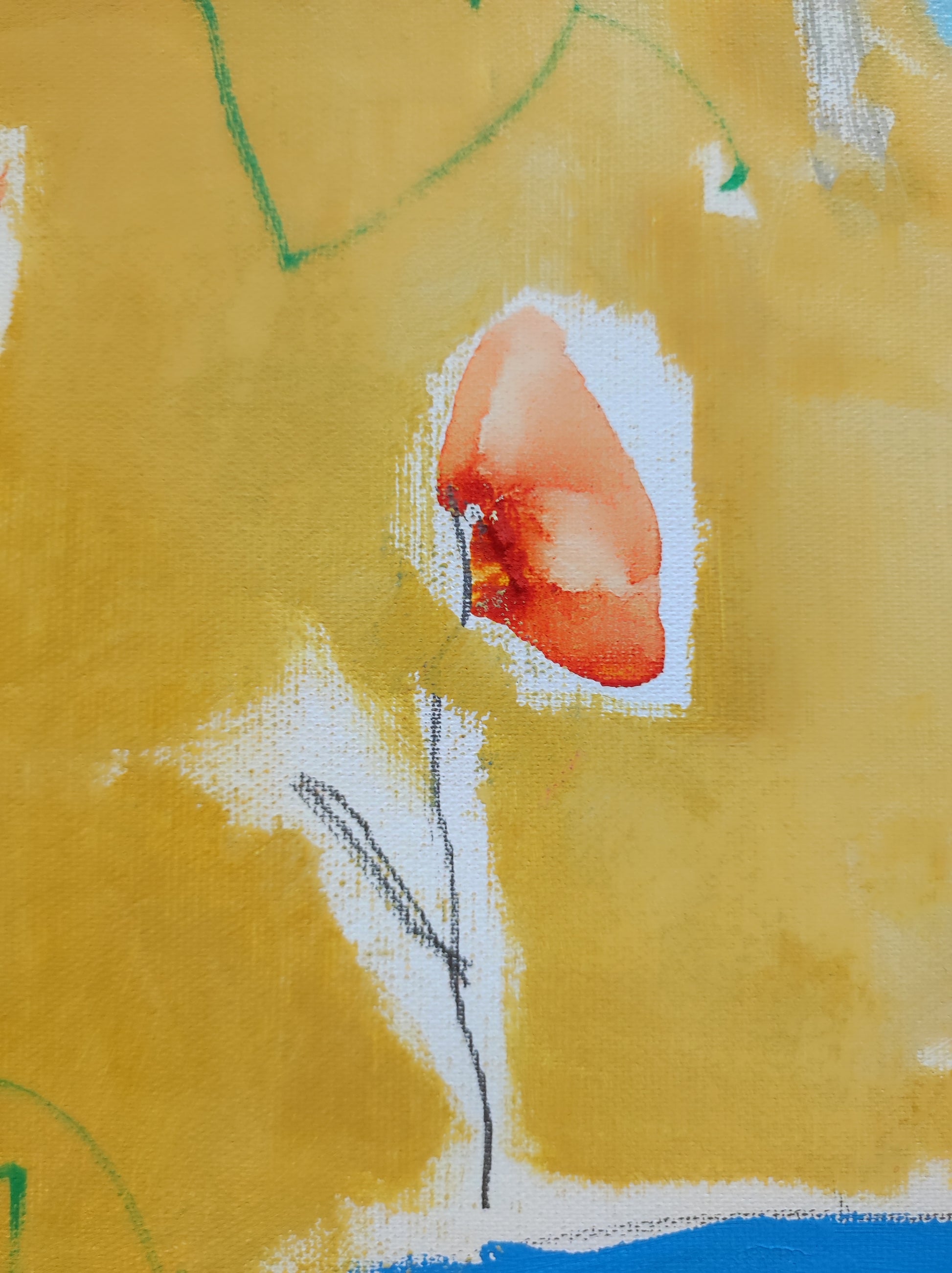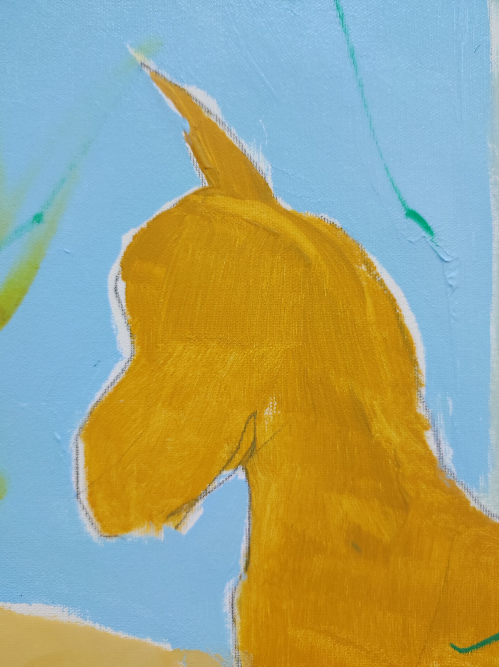 Pintura gestual, intuitiva, que deja que las cosas pasen y se apoya sobre lo que aparece. Aprovechando el accidente y aceptando las consecuencias.