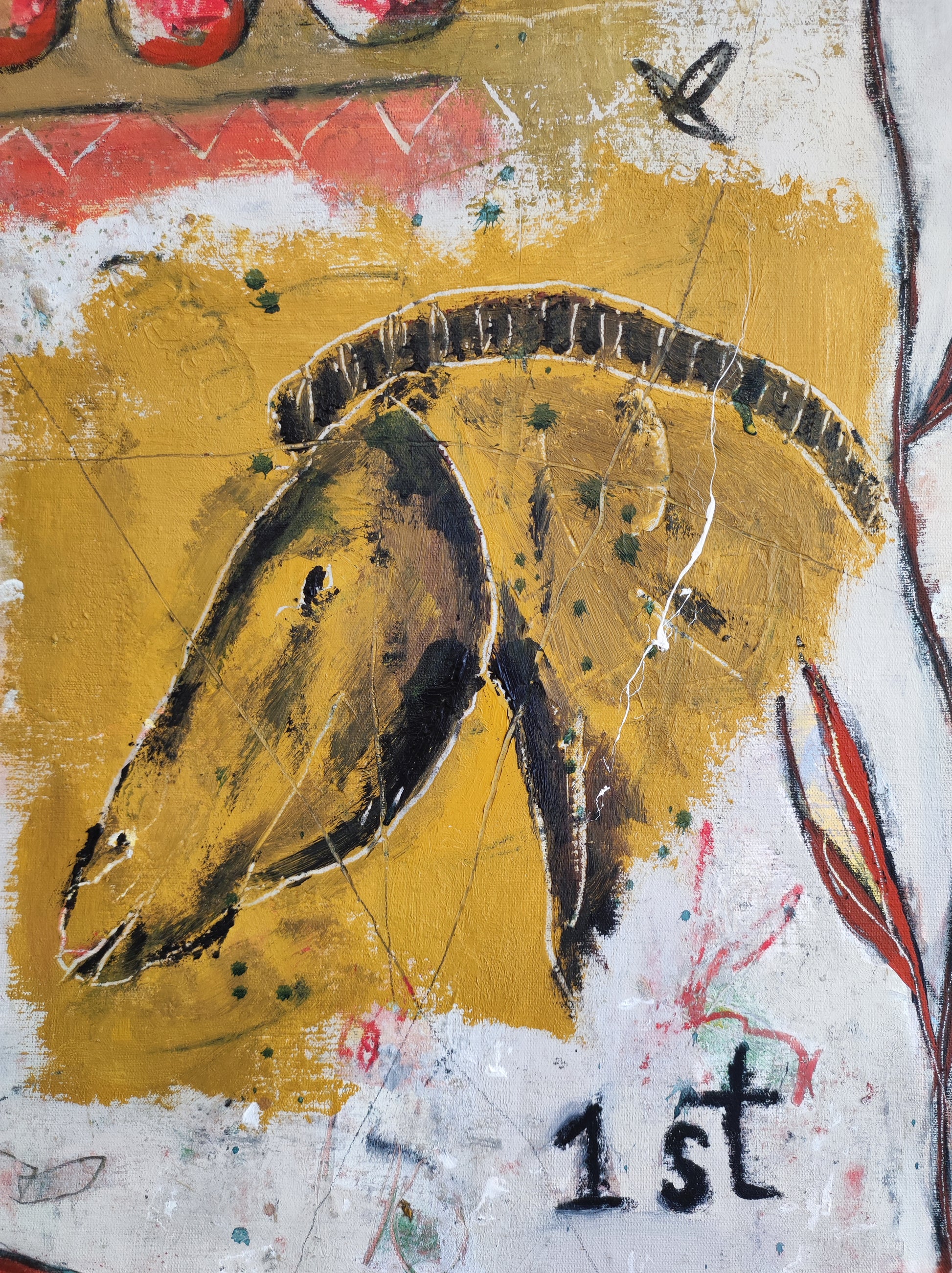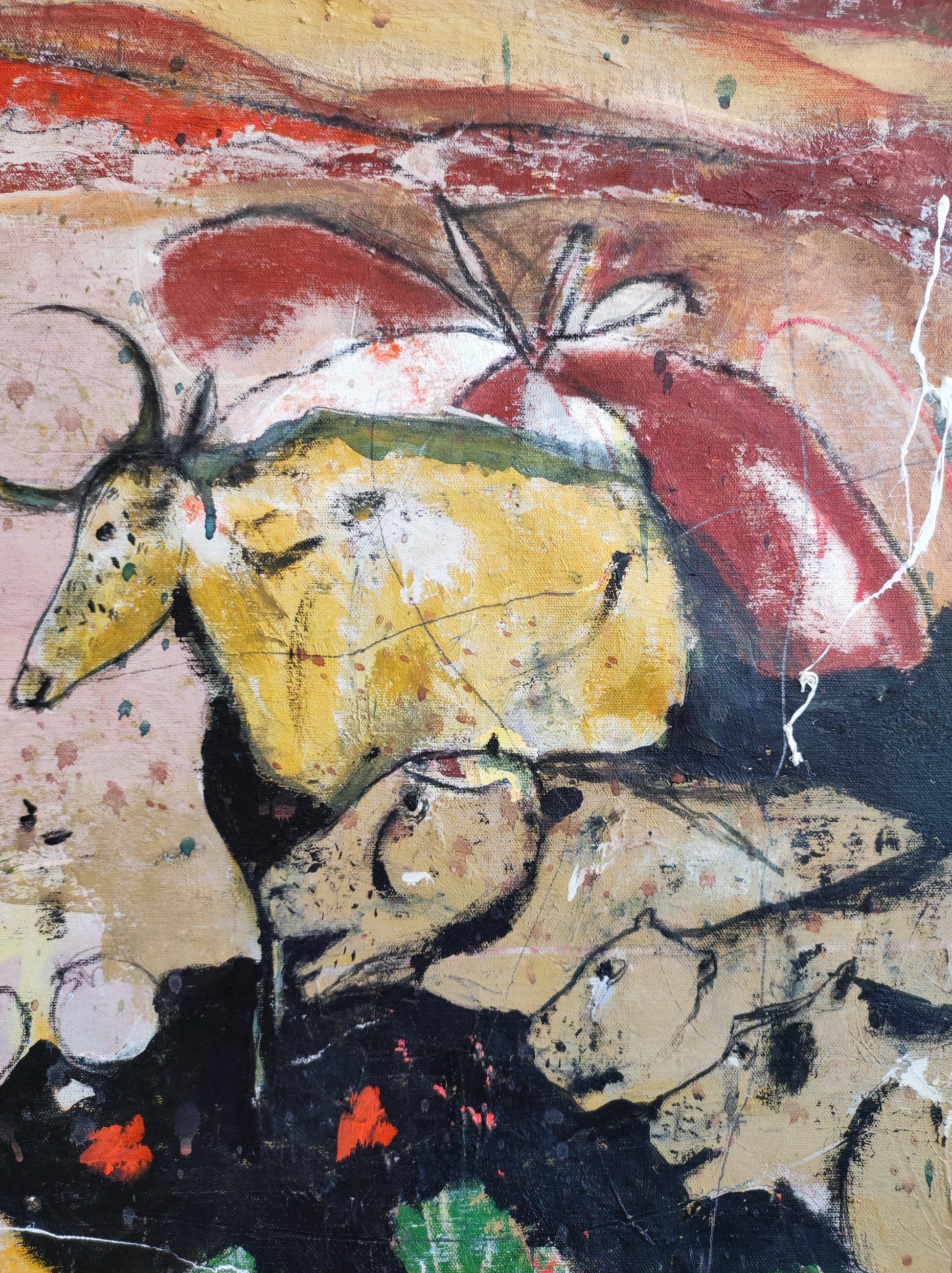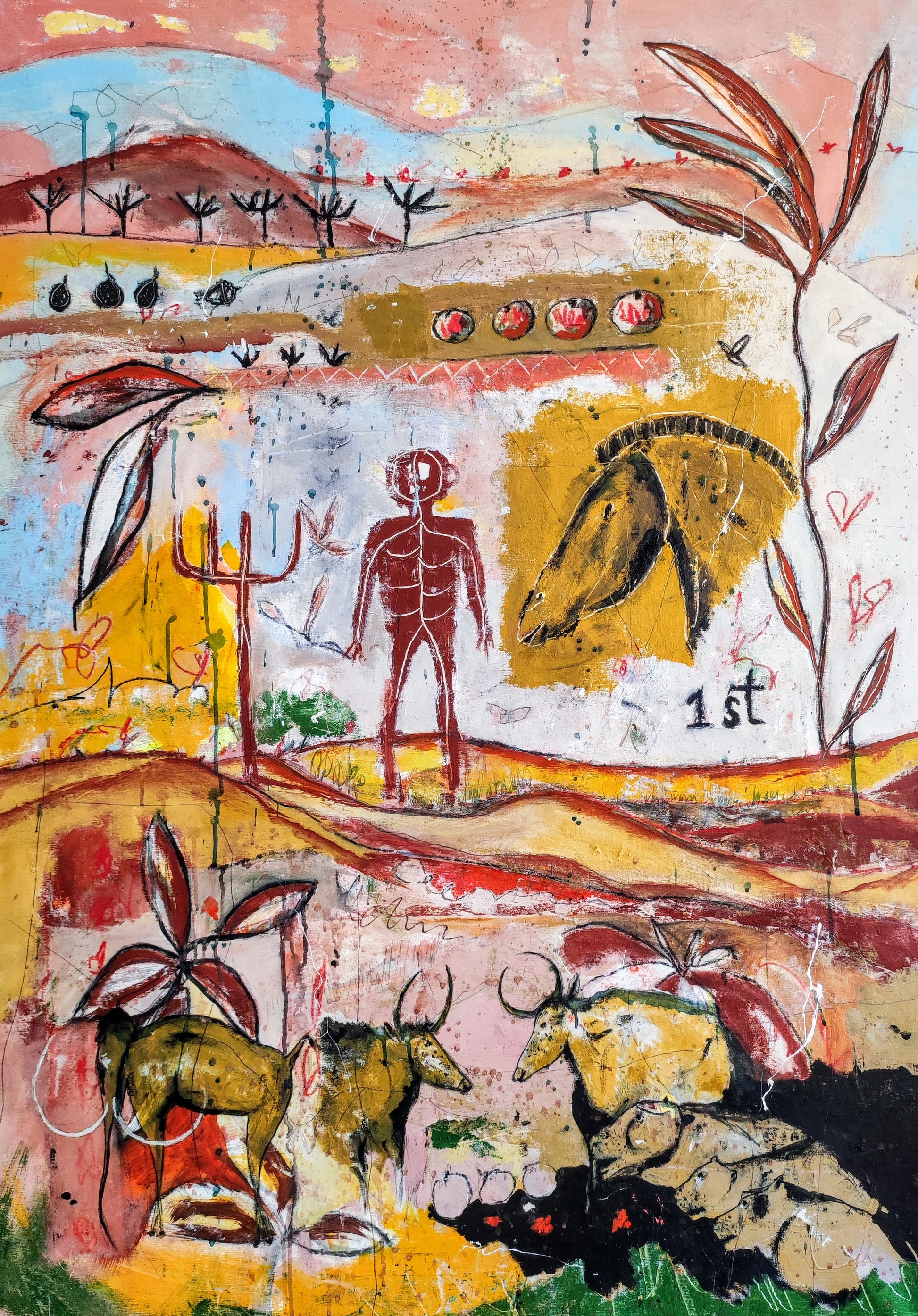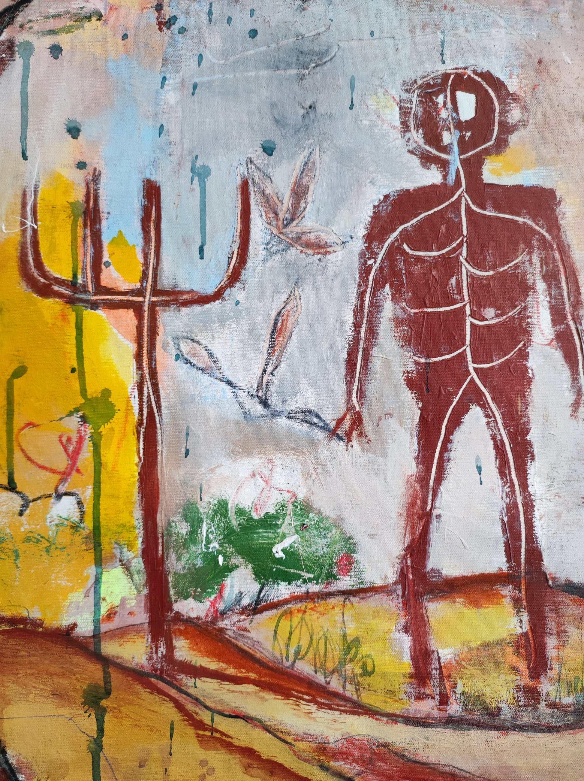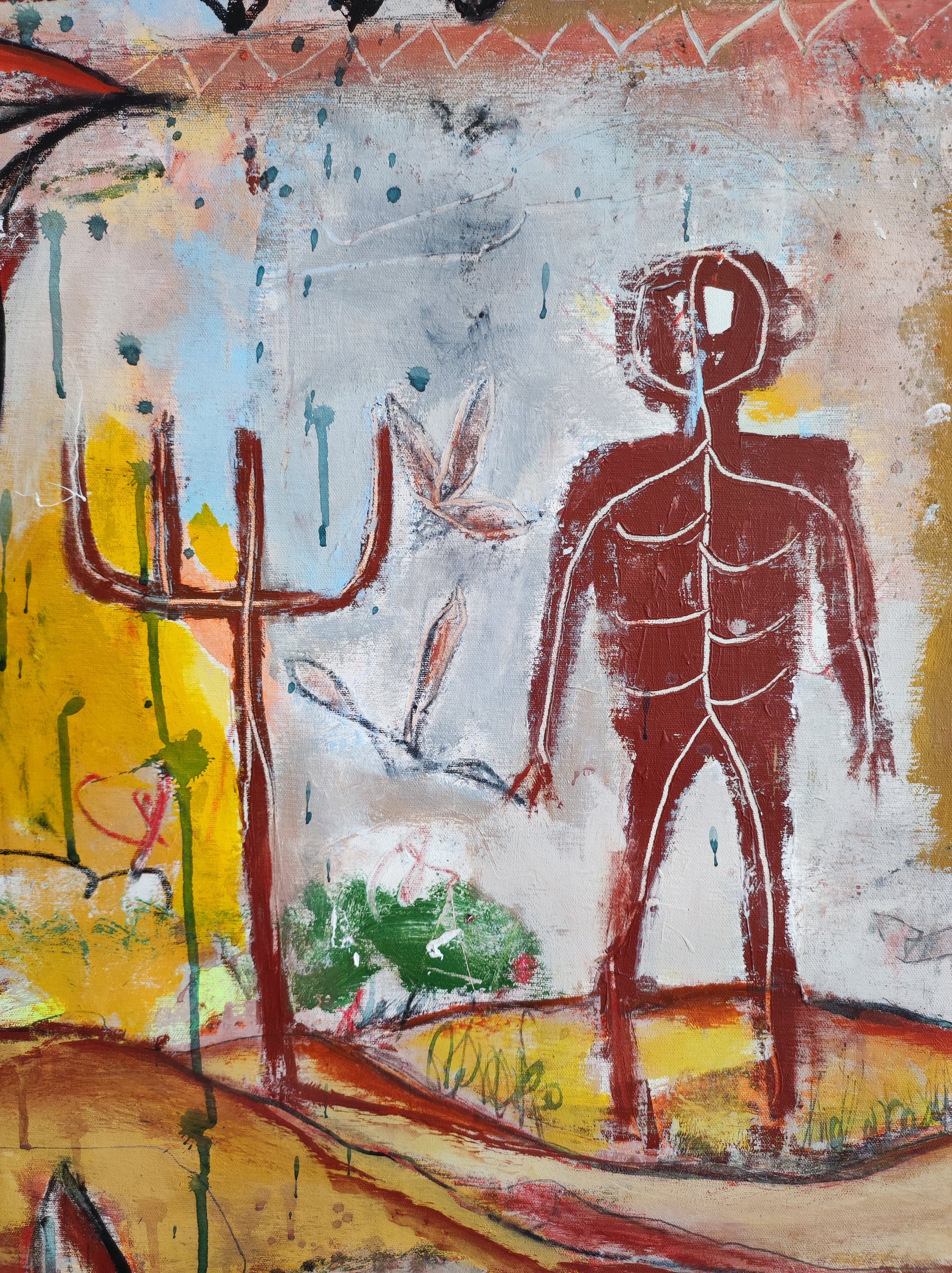 Técnica: acrílico, pigmentos, gesso, ceras y lápiz.