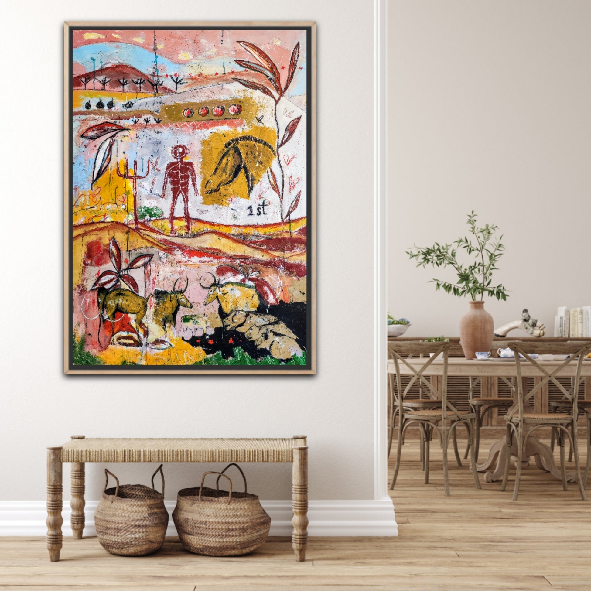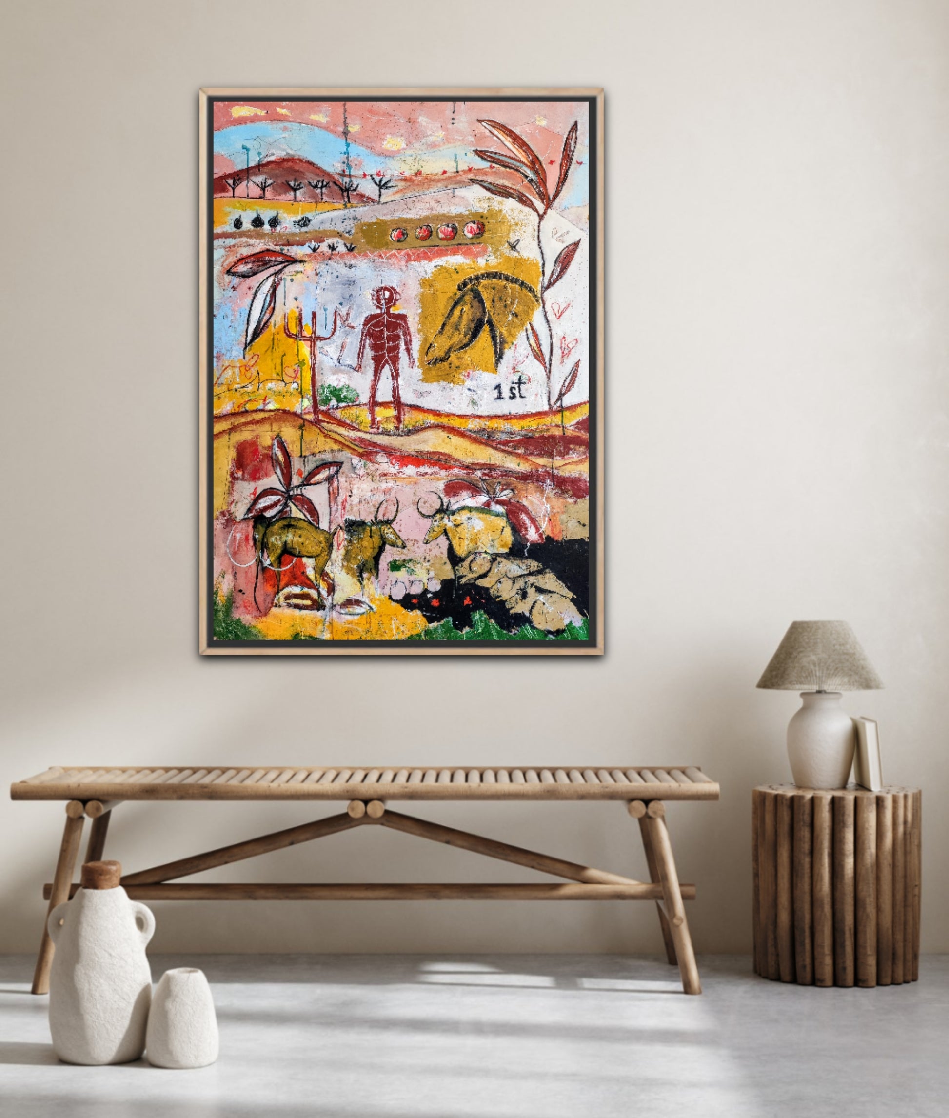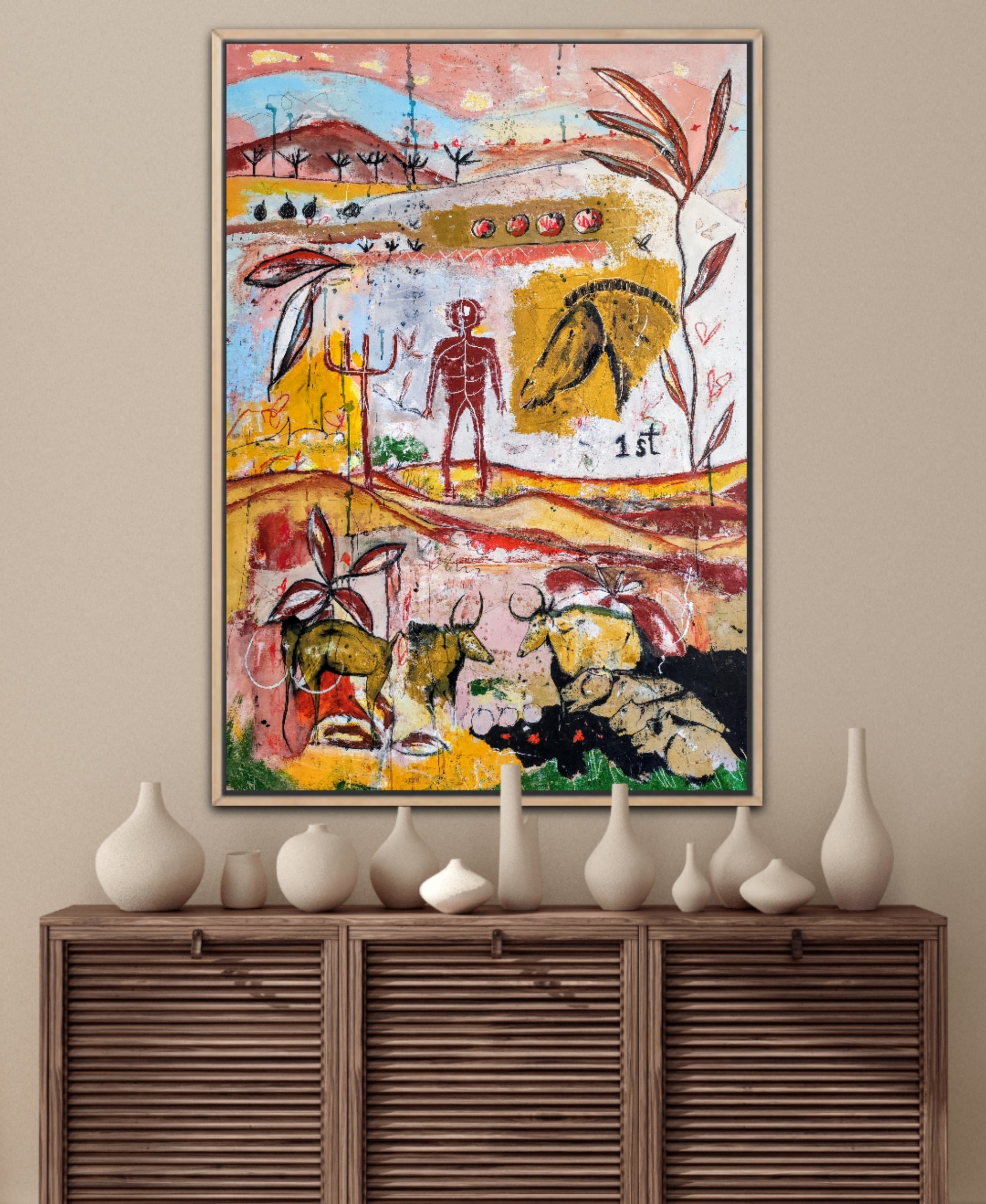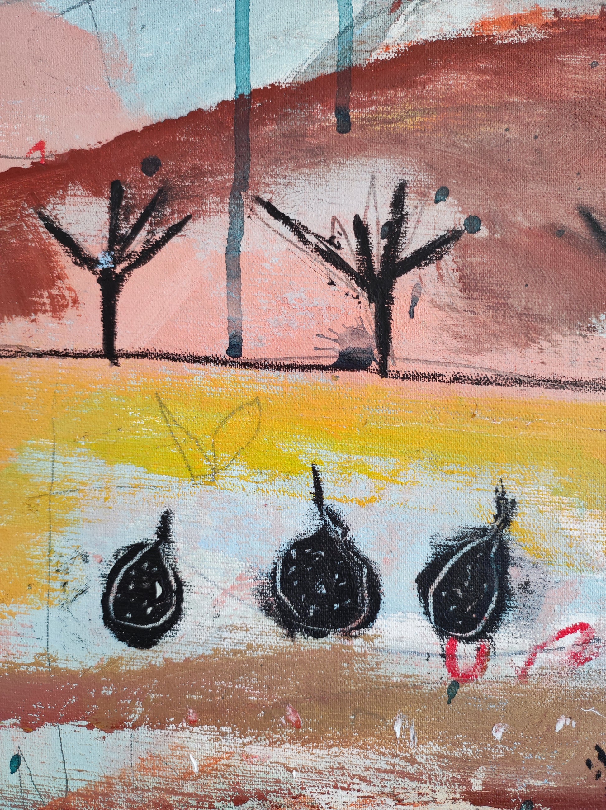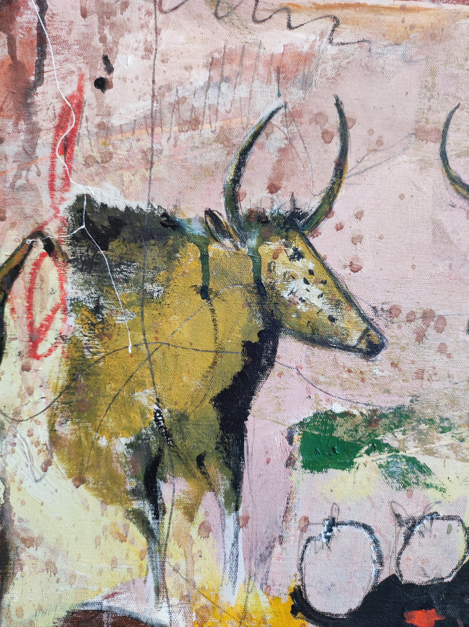 Técnica: acrílico, pigmentos, gesso, ceras y lápiz.