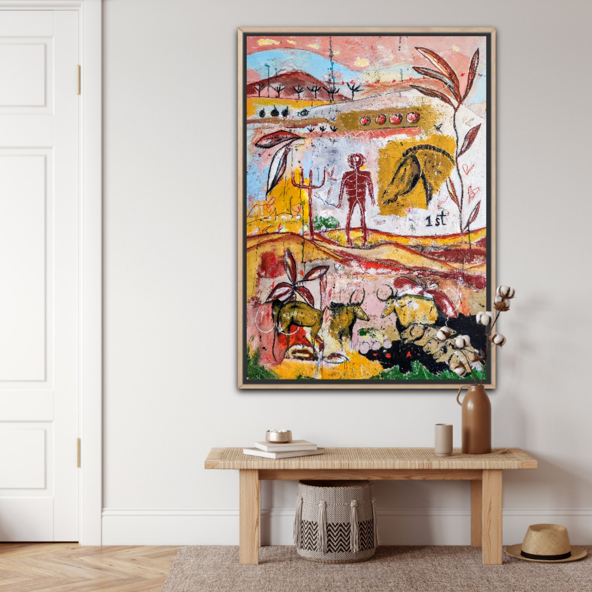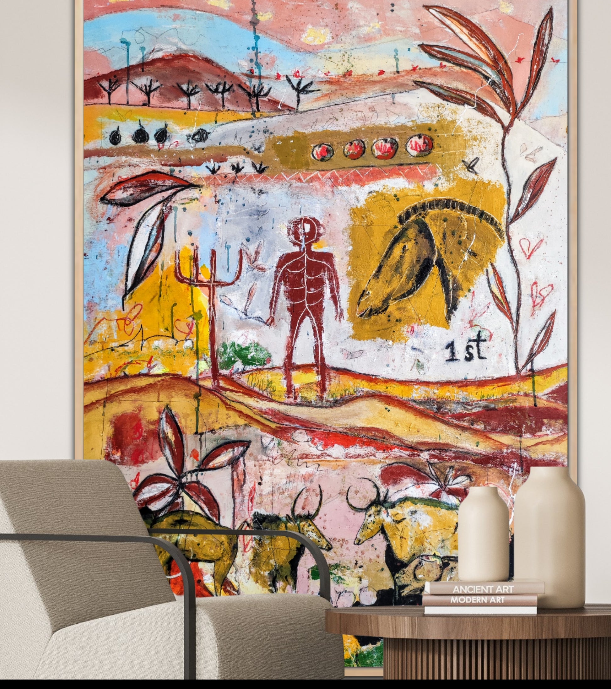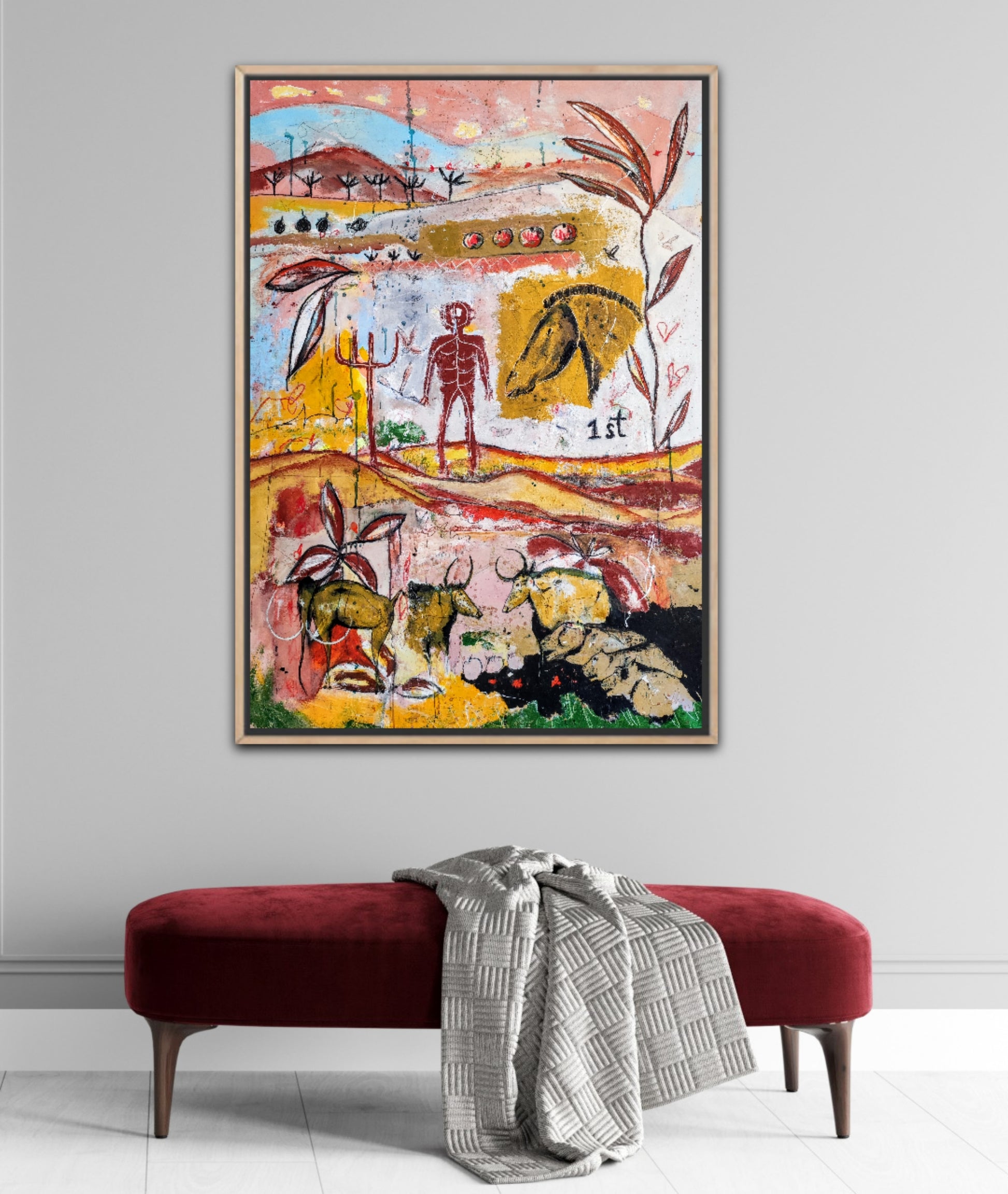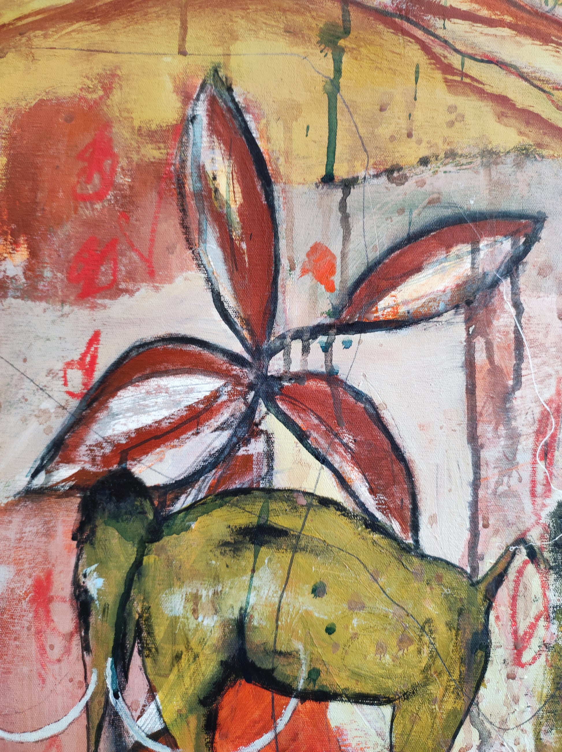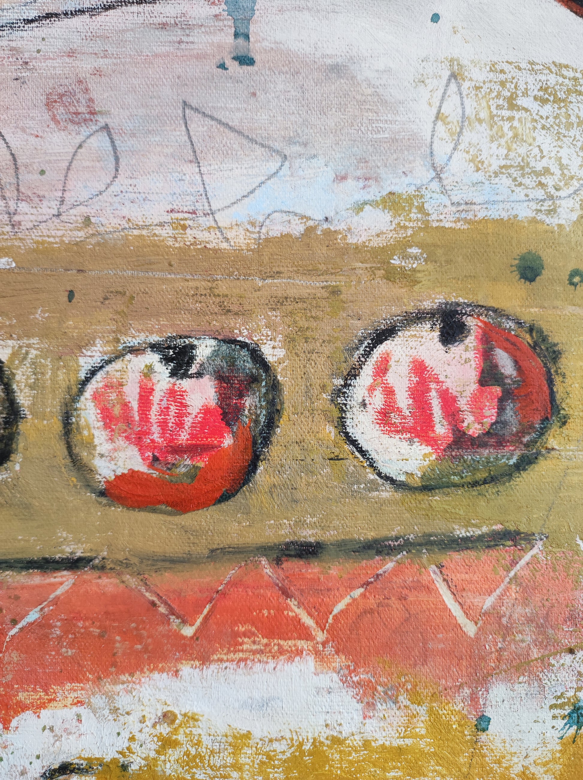Técnica: acrílico, pigmentos, gesso, ceras y lápiz.