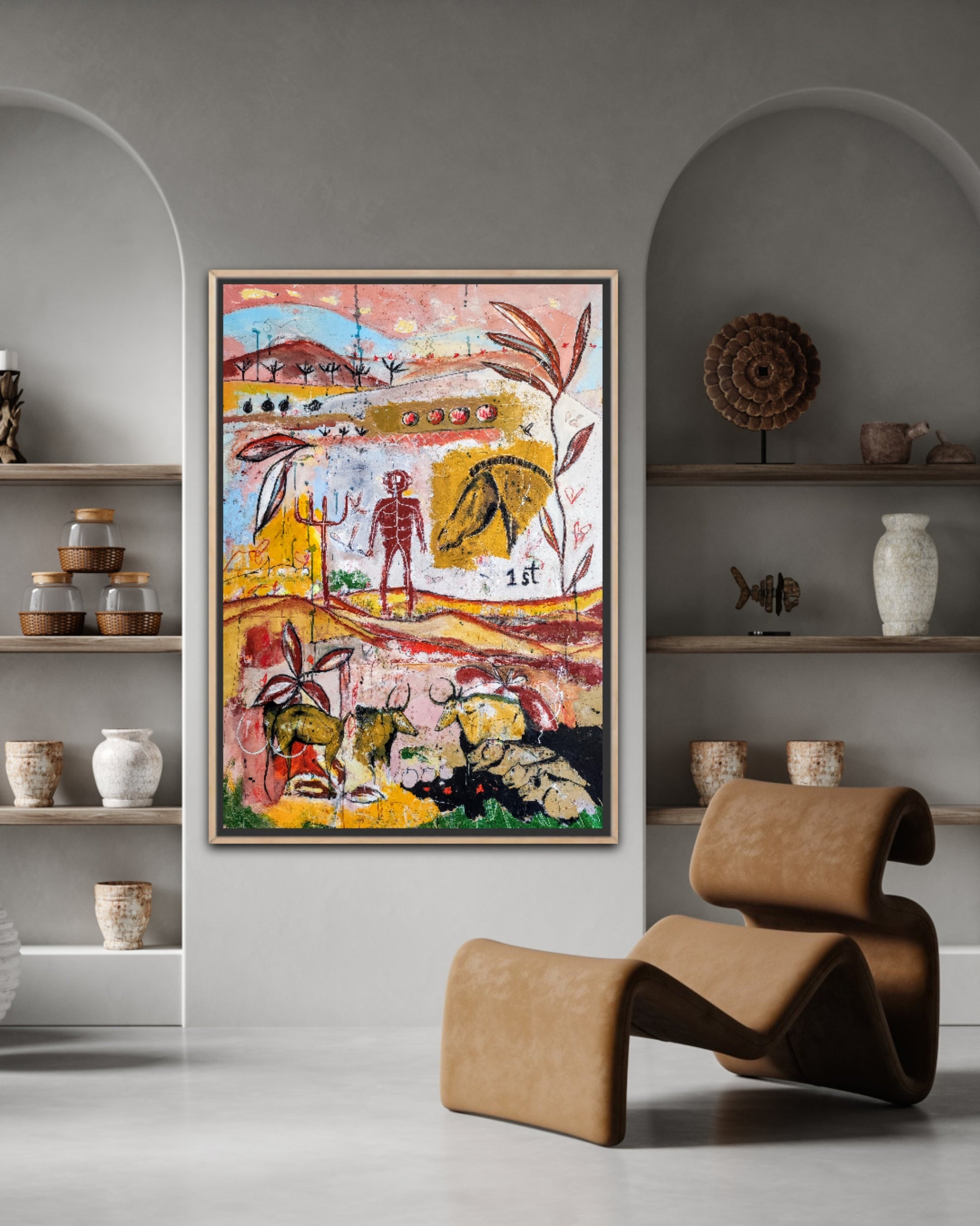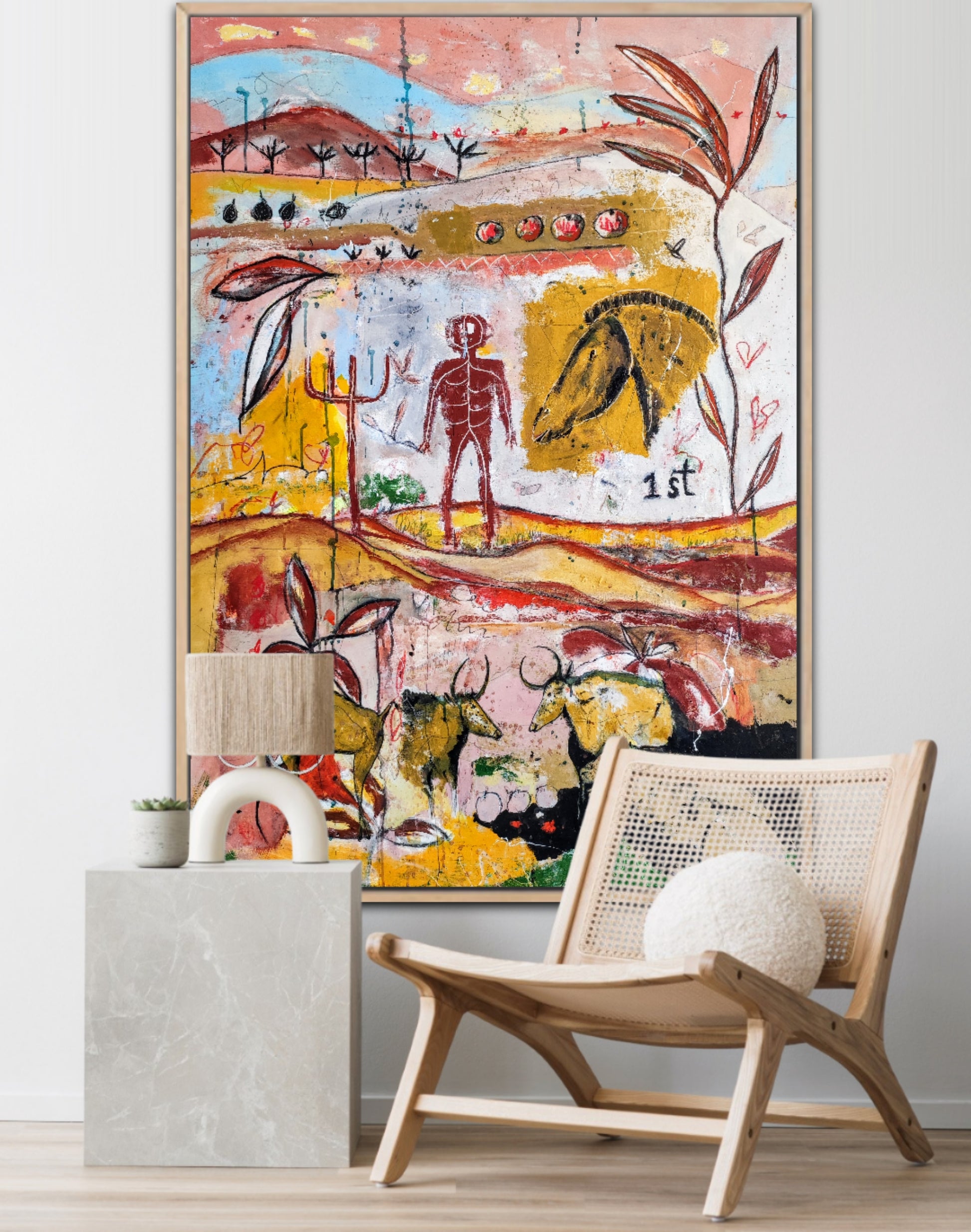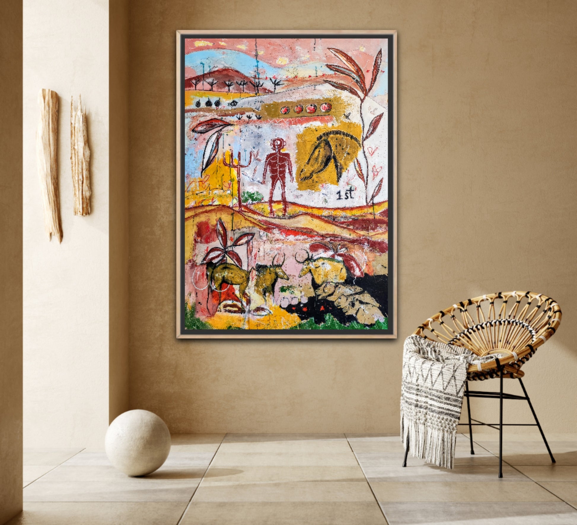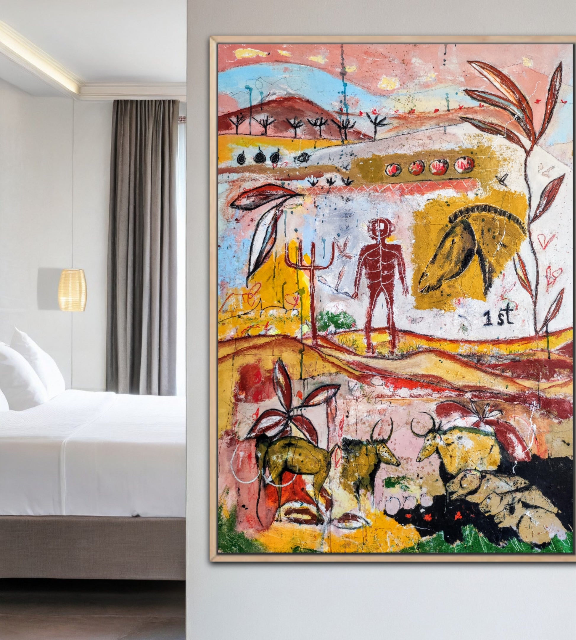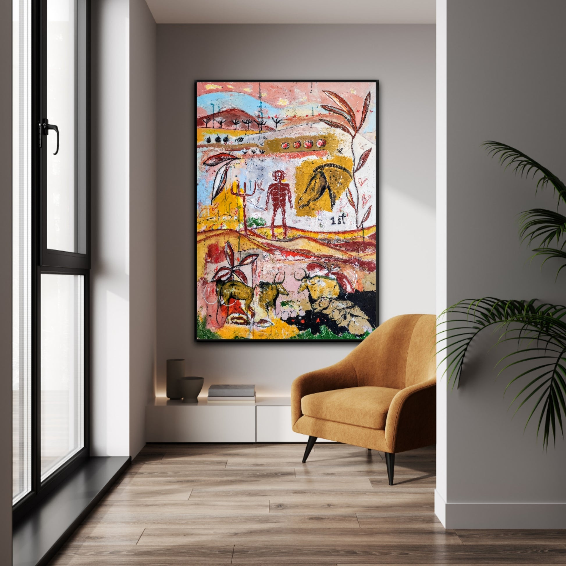 Técnica: acrílico, pigmentos, gesso, ceras y lápiz.