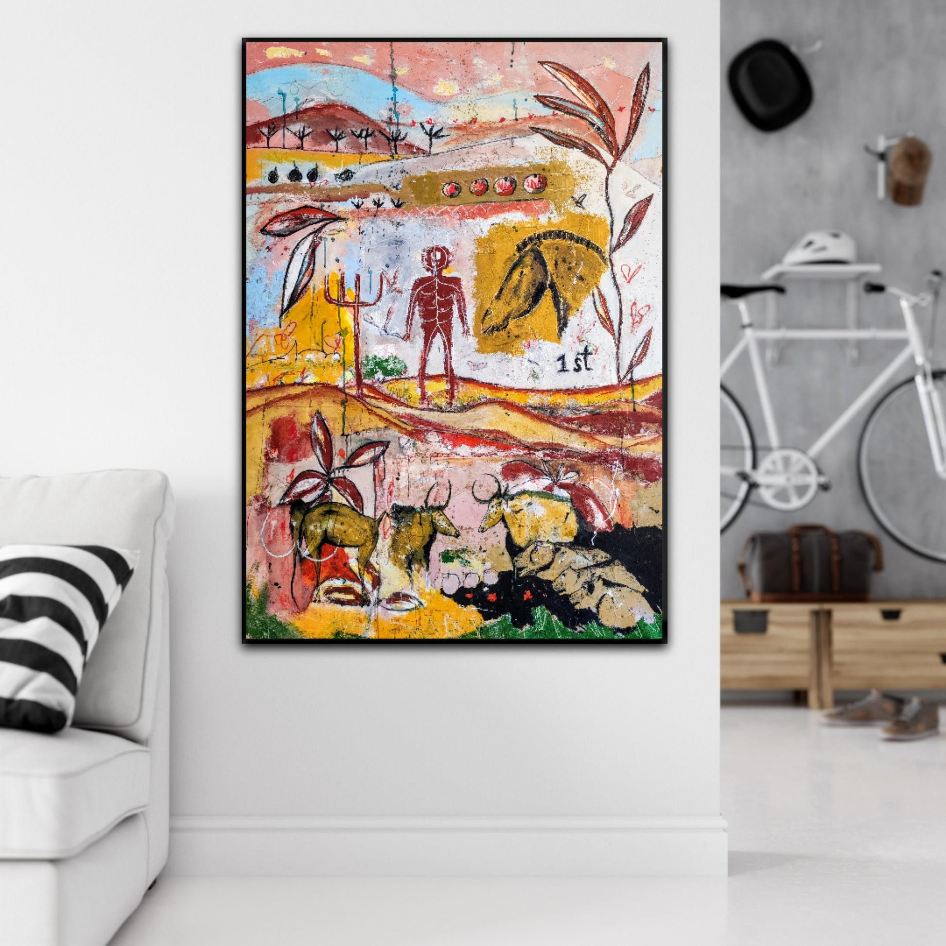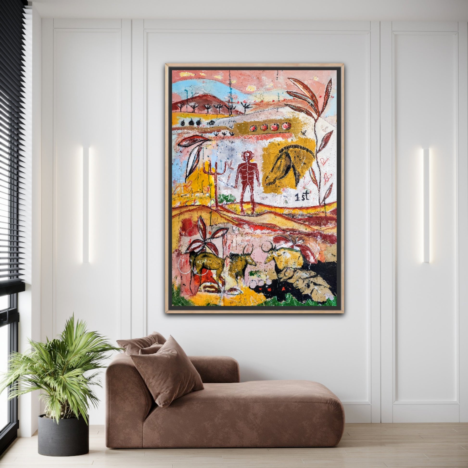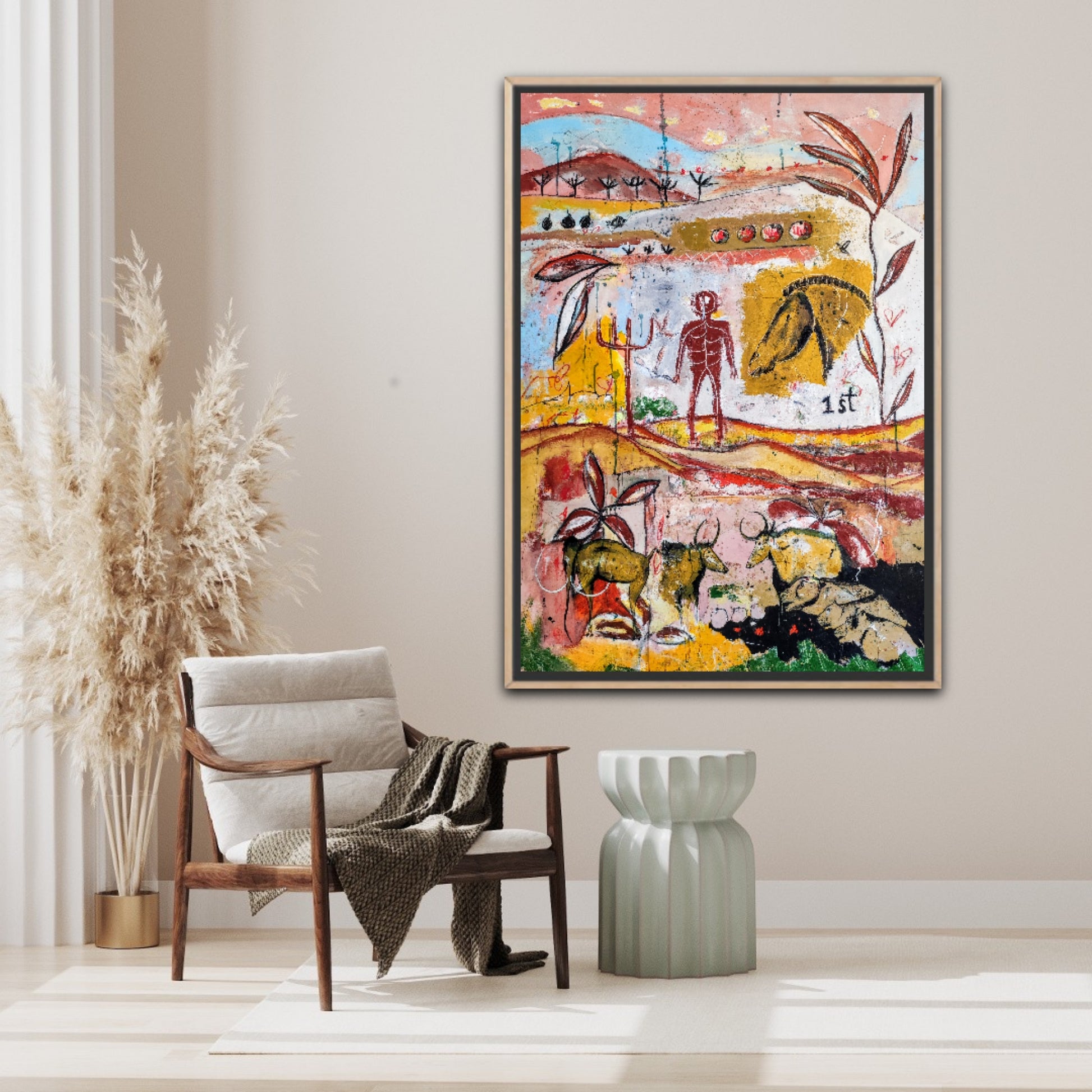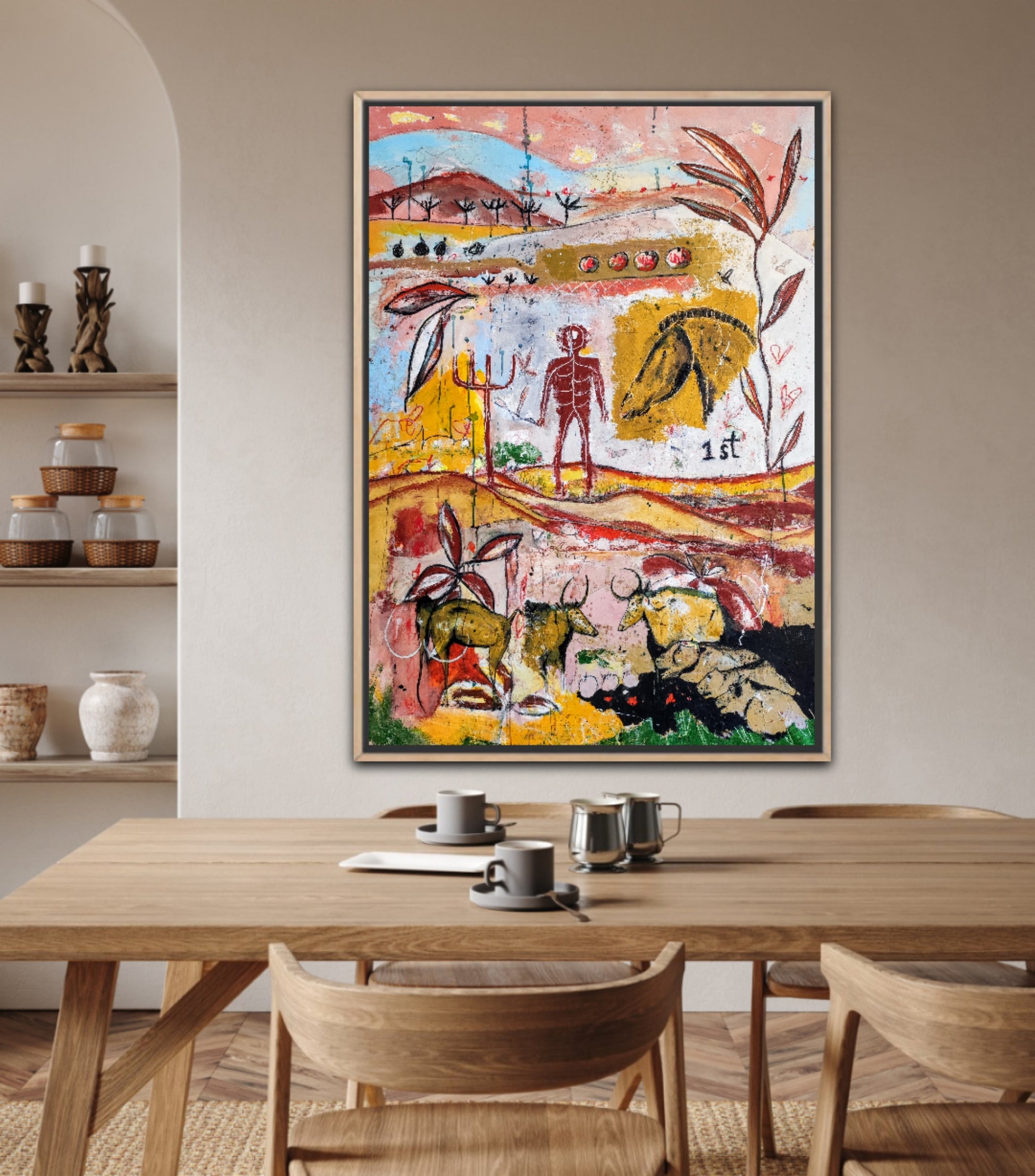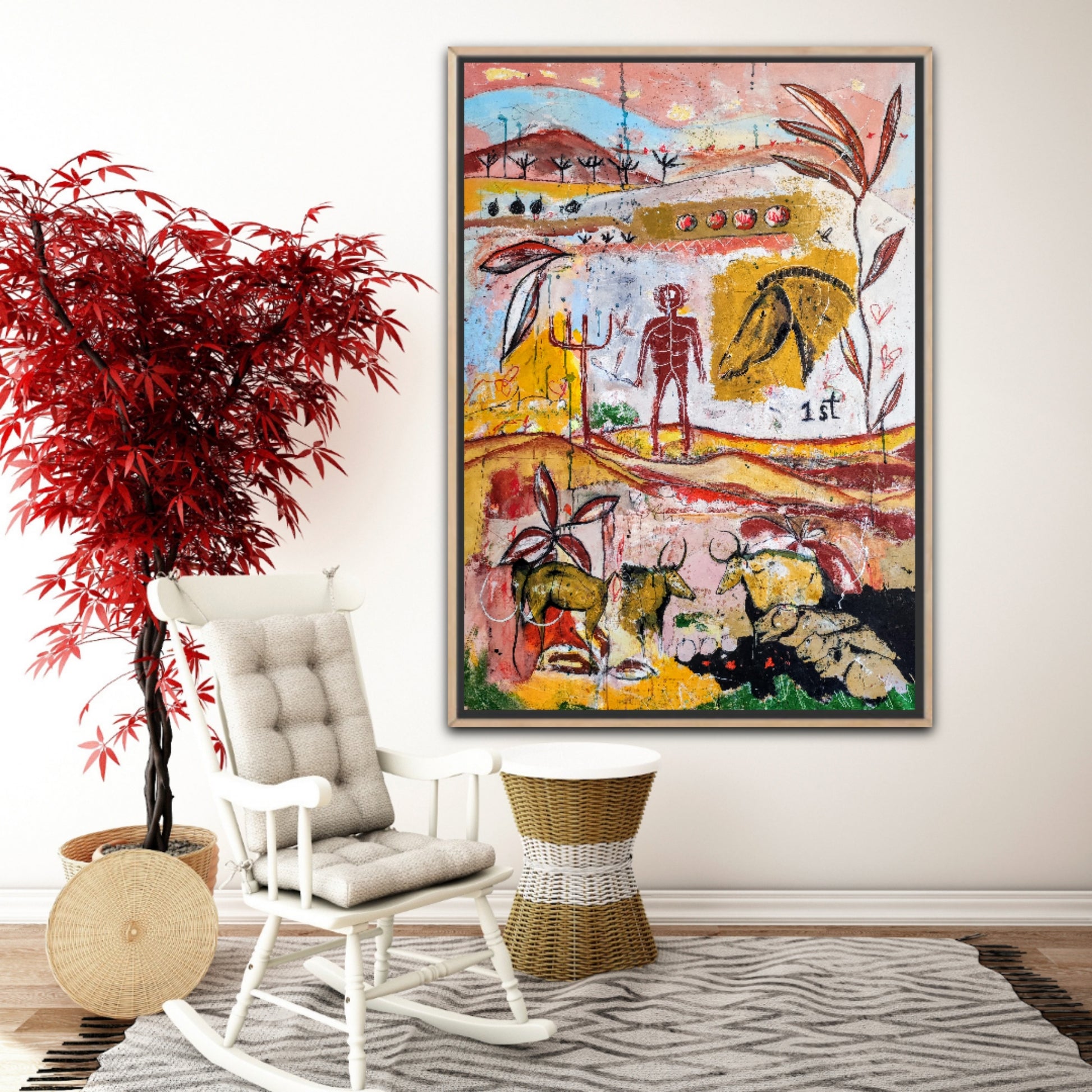 Técnica: acrílico, pigmentos, gesso, ceras y lápiz.