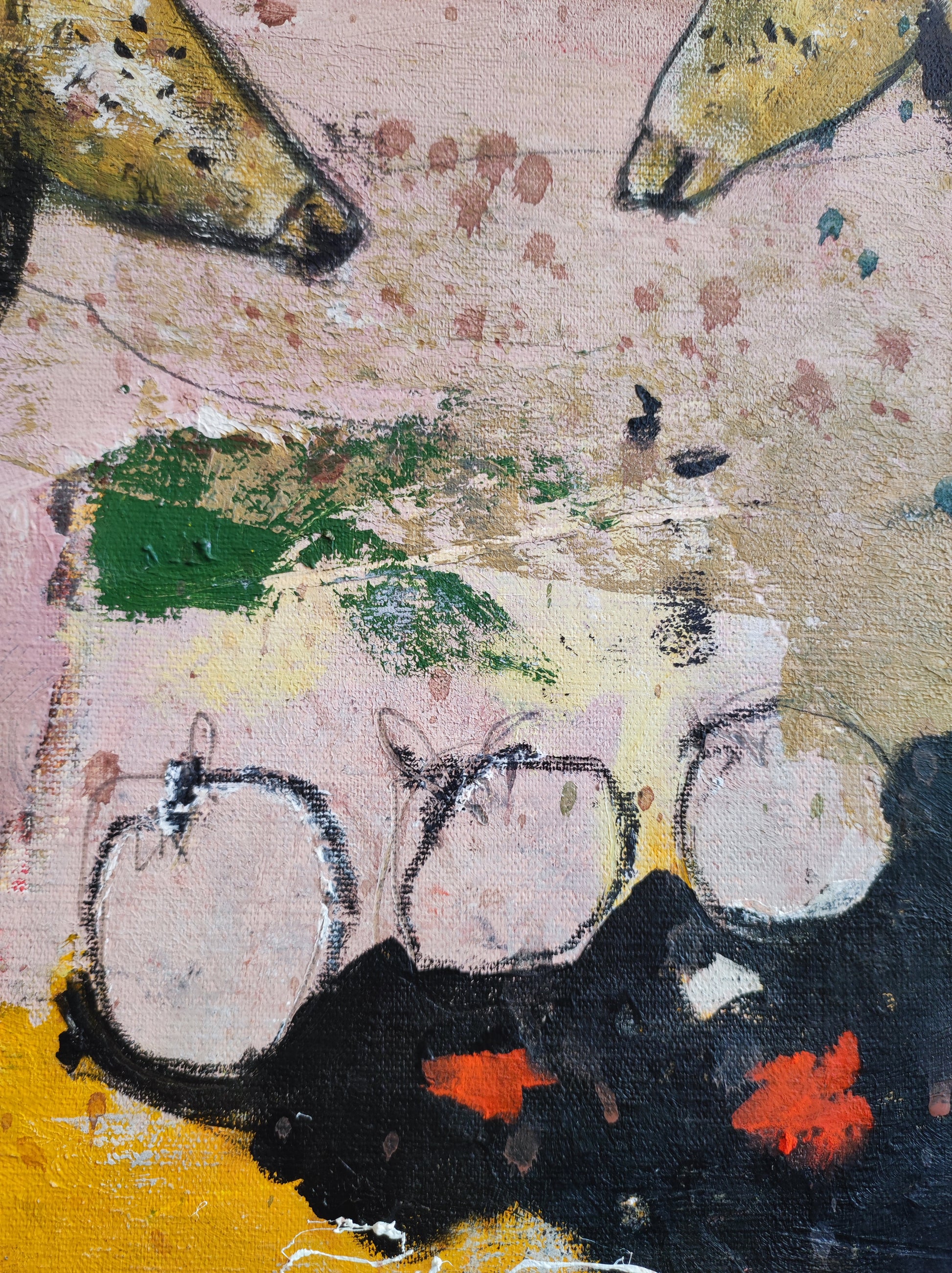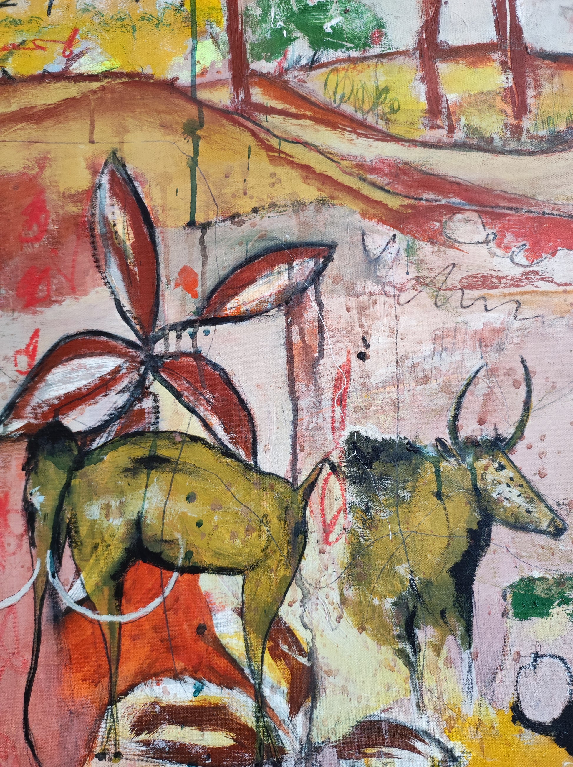 Pintura gestual, intuitiva, que deja que las cosas pasen y se apoya sobre lo que aparece. Aprovechando el accidente y aceptando las consecuencias.