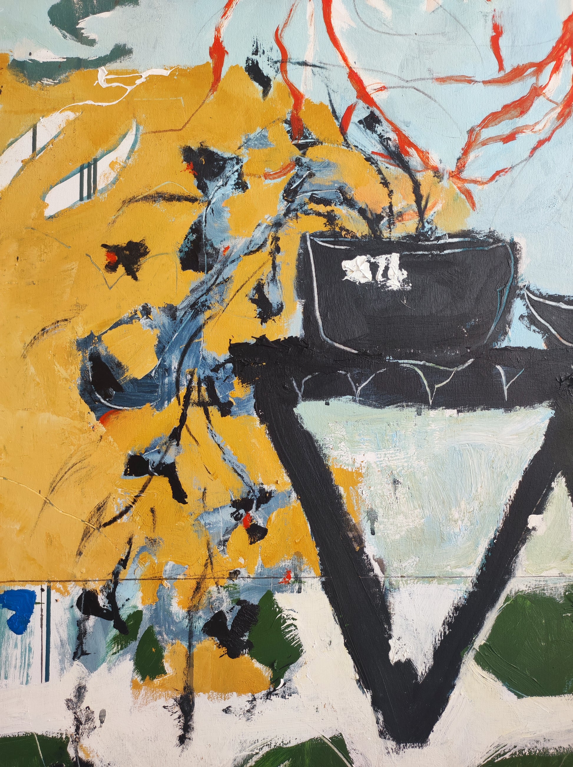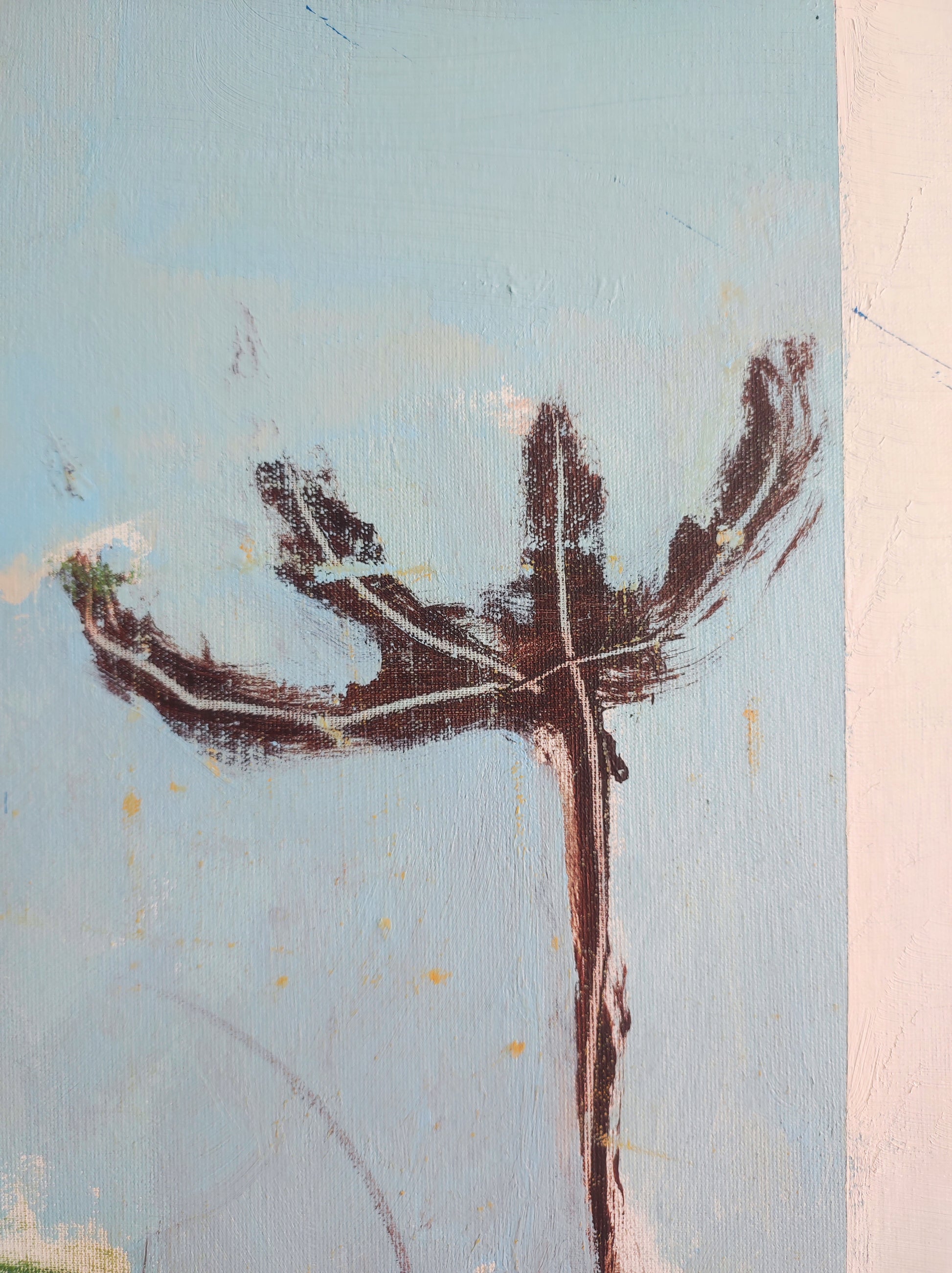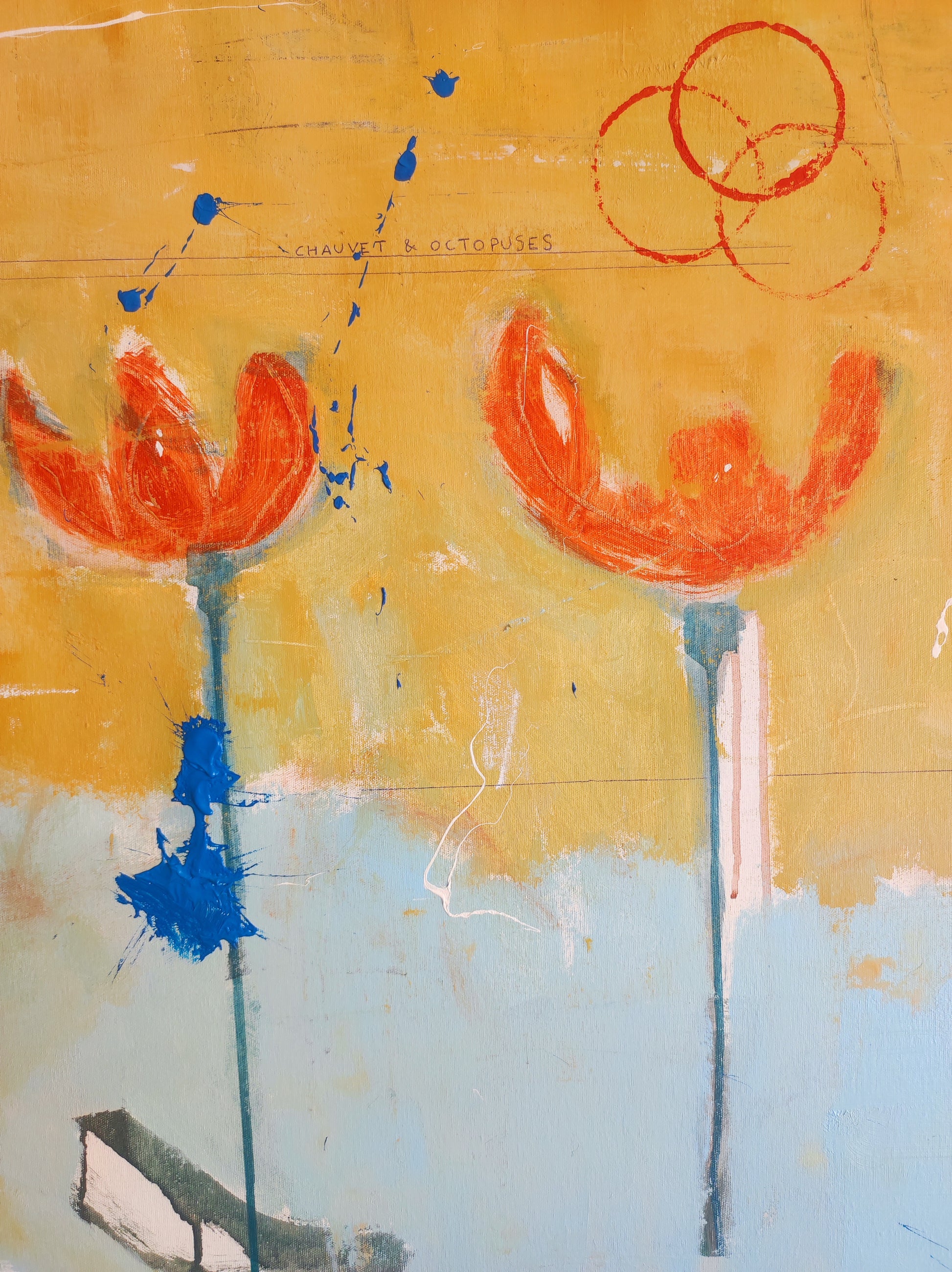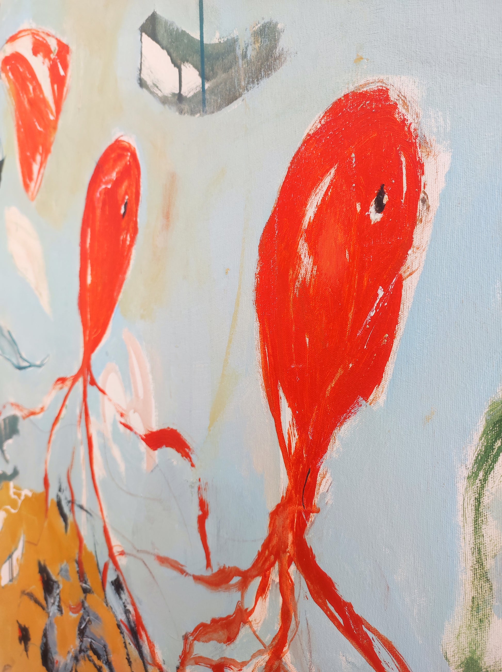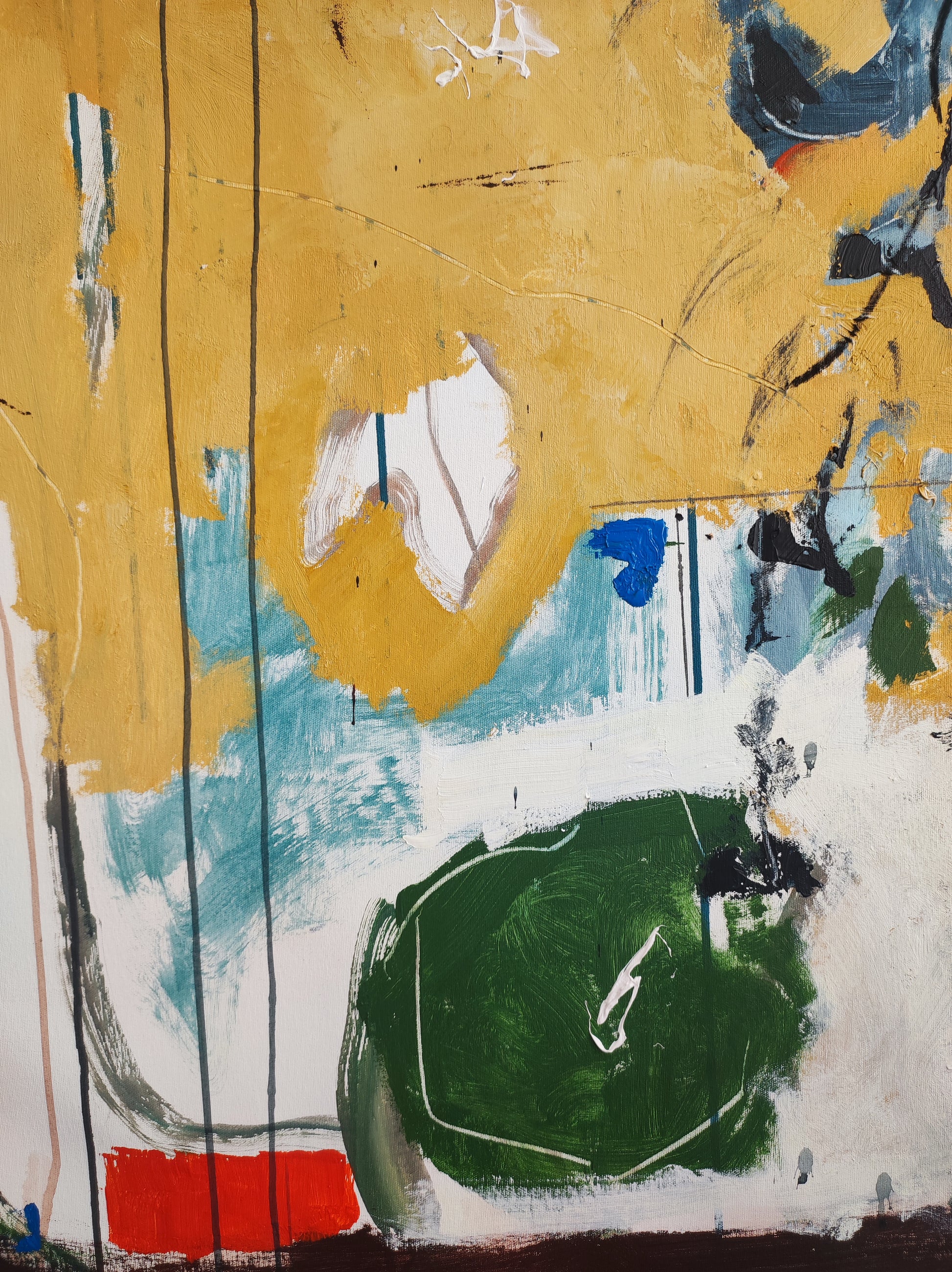 Pintura gestual, intuitiva, que deja que las cosas pasen y se apoya sobre lo que aparece. Aprovechando el accidente y aceptando las consecuencias.