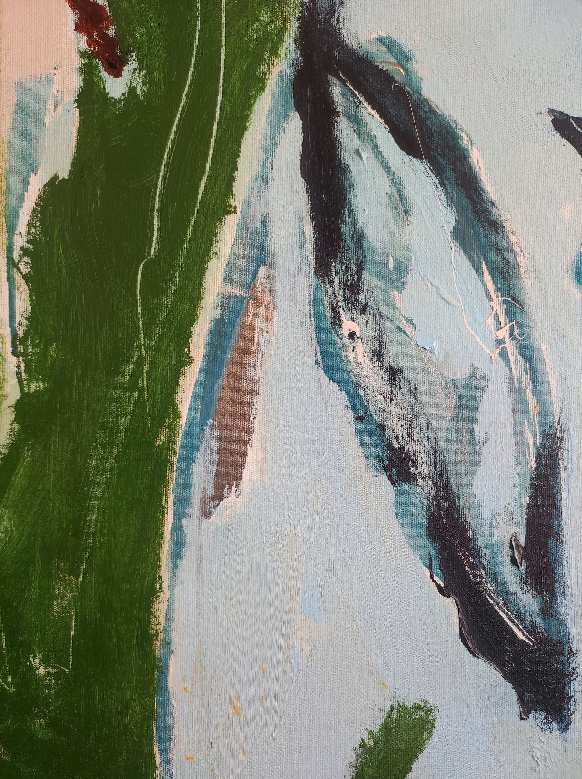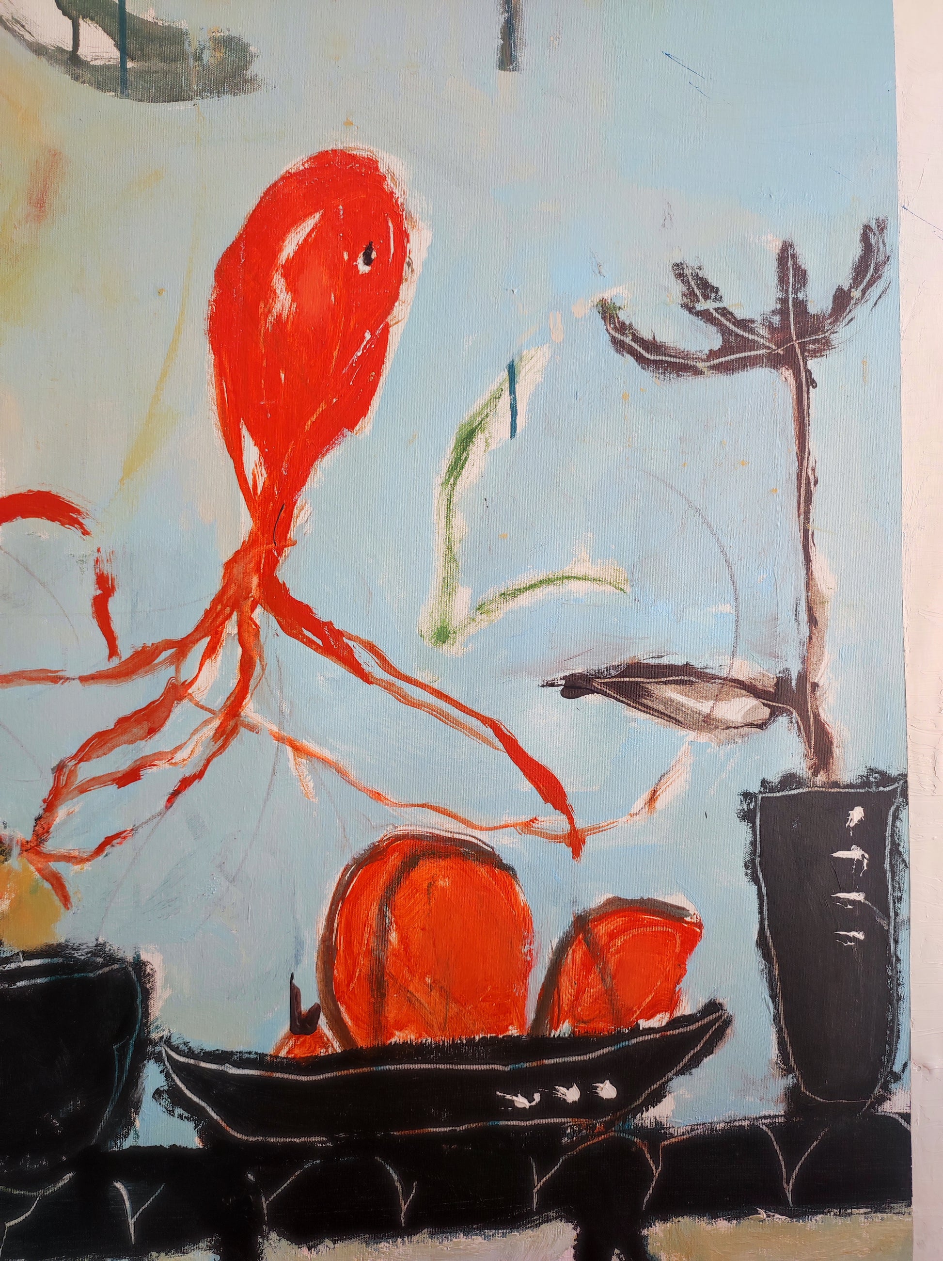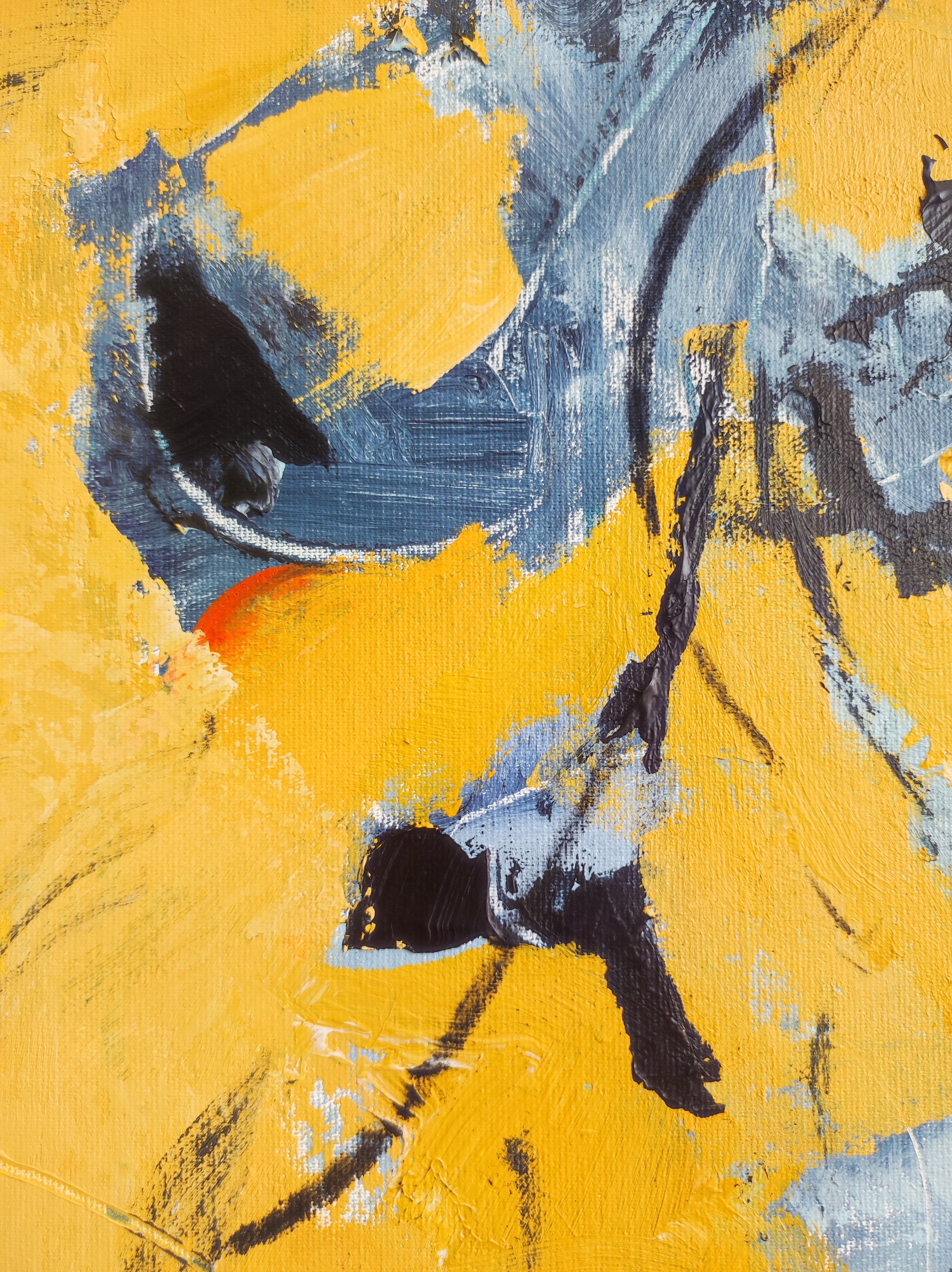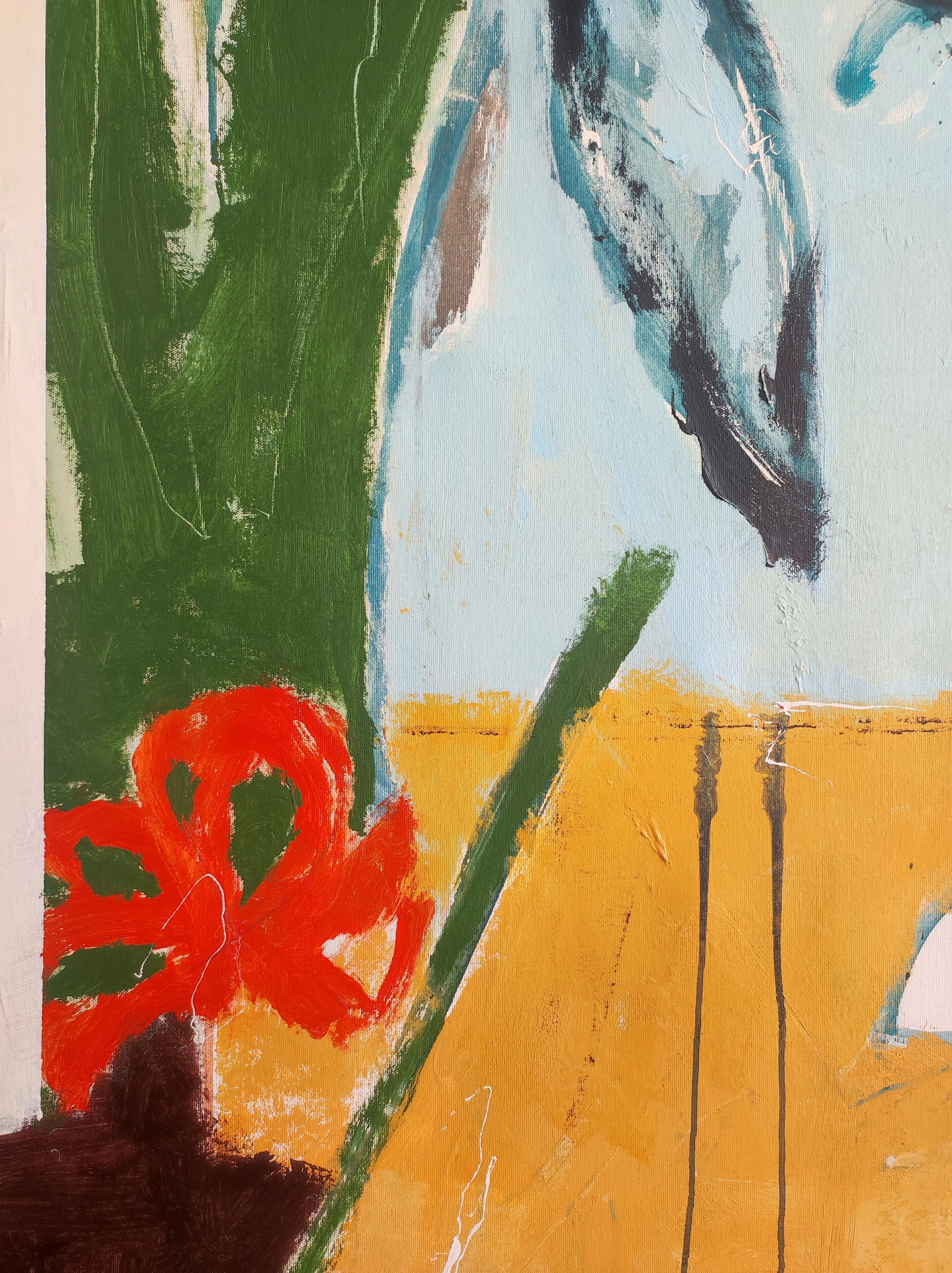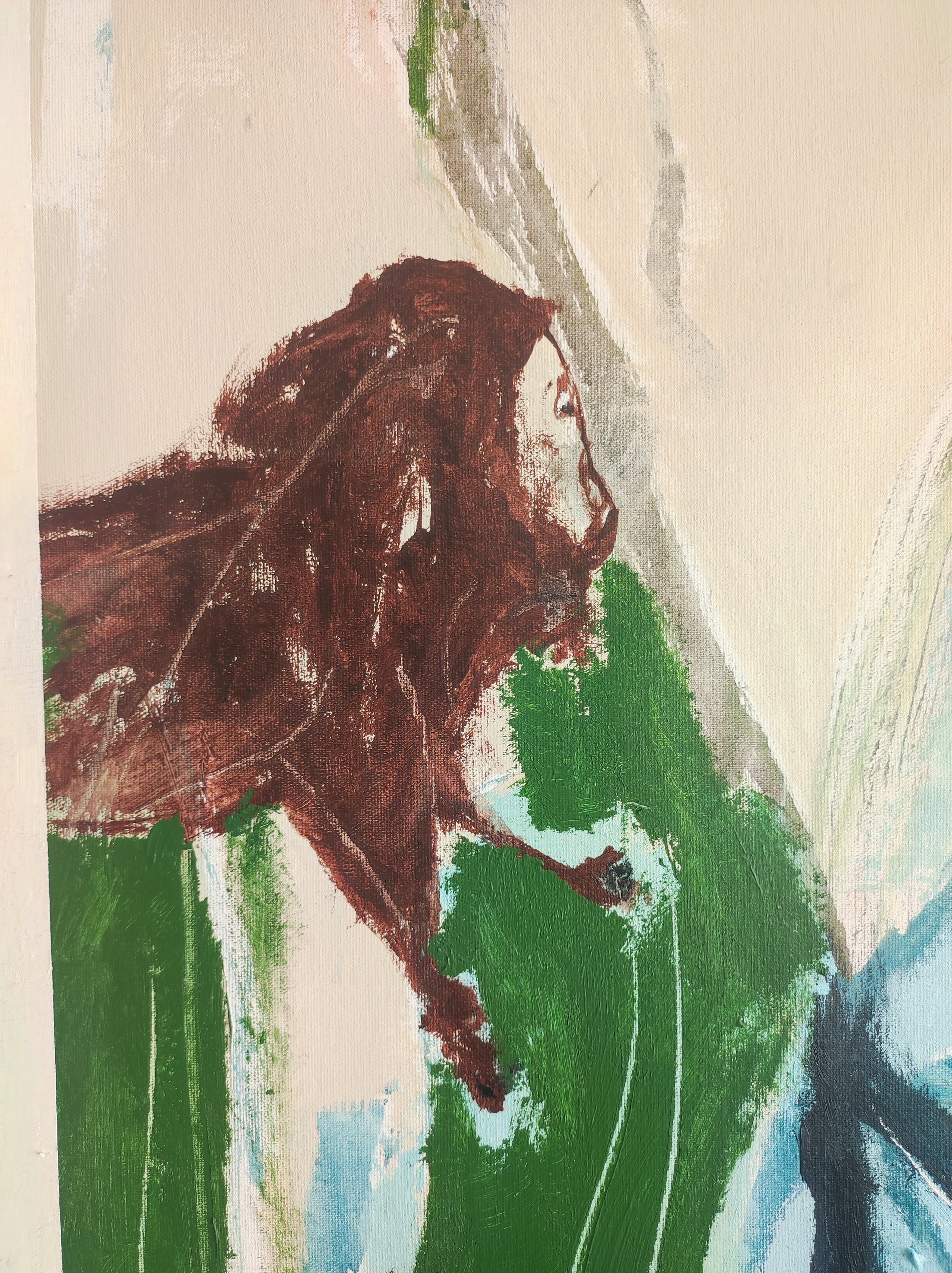 Pintura gestual, intuitiva, que deja que las cosas pasen y se apoya sobre lo que aparece. Aprovechando el accidente y aceptando las consecuencias.