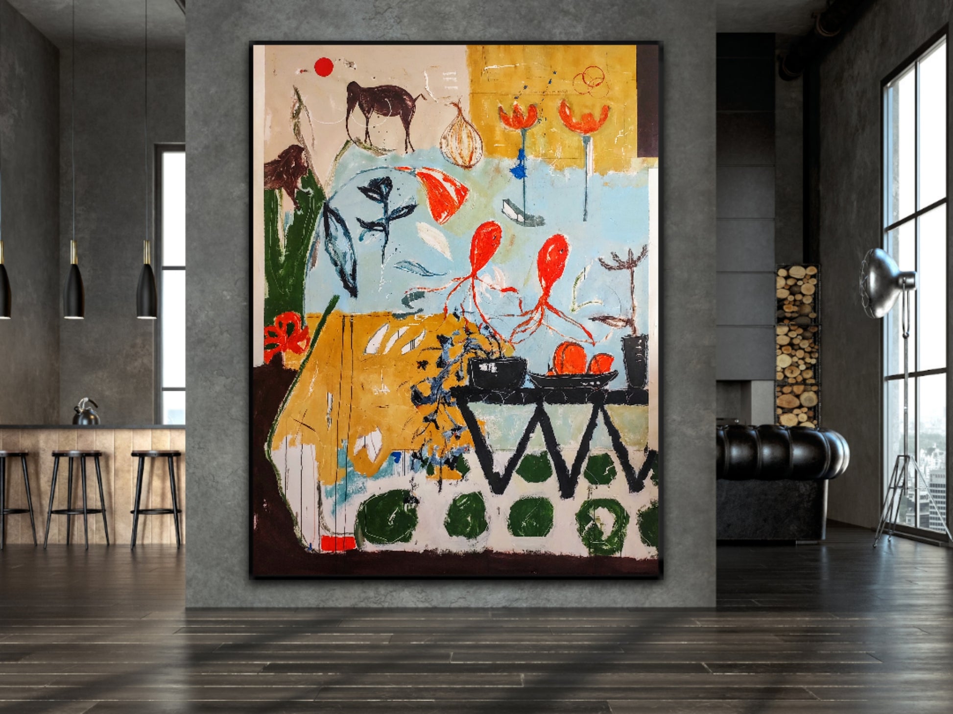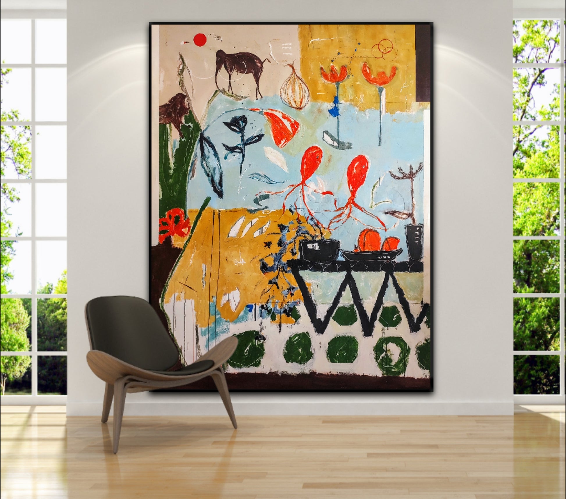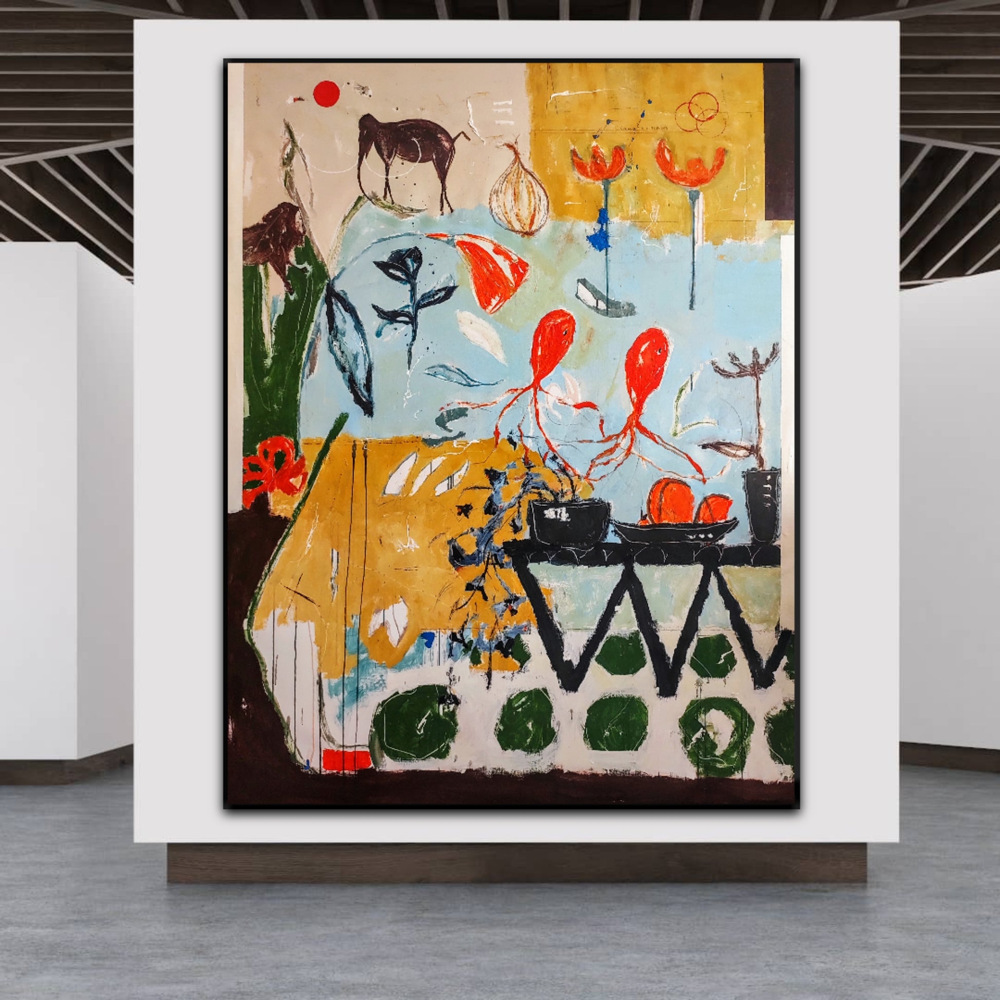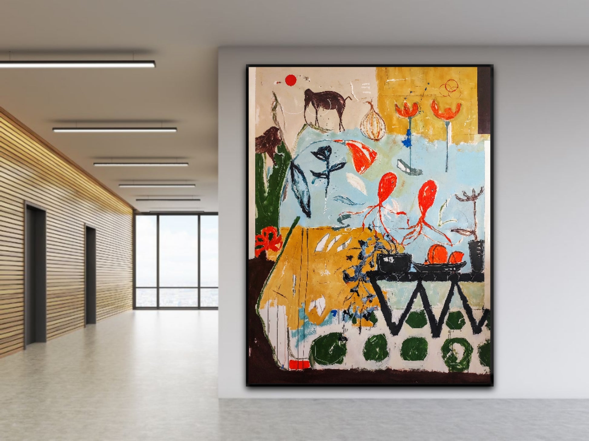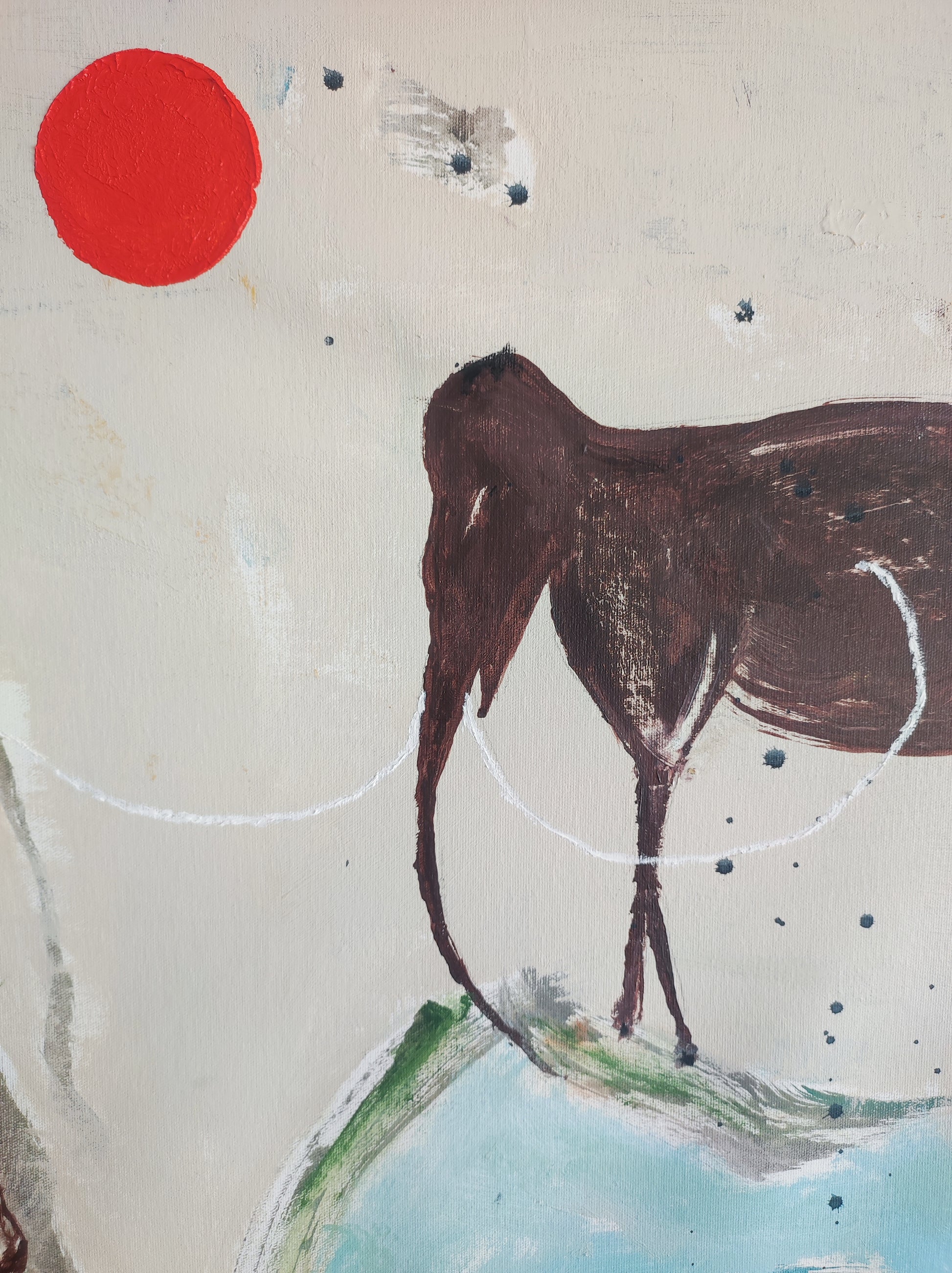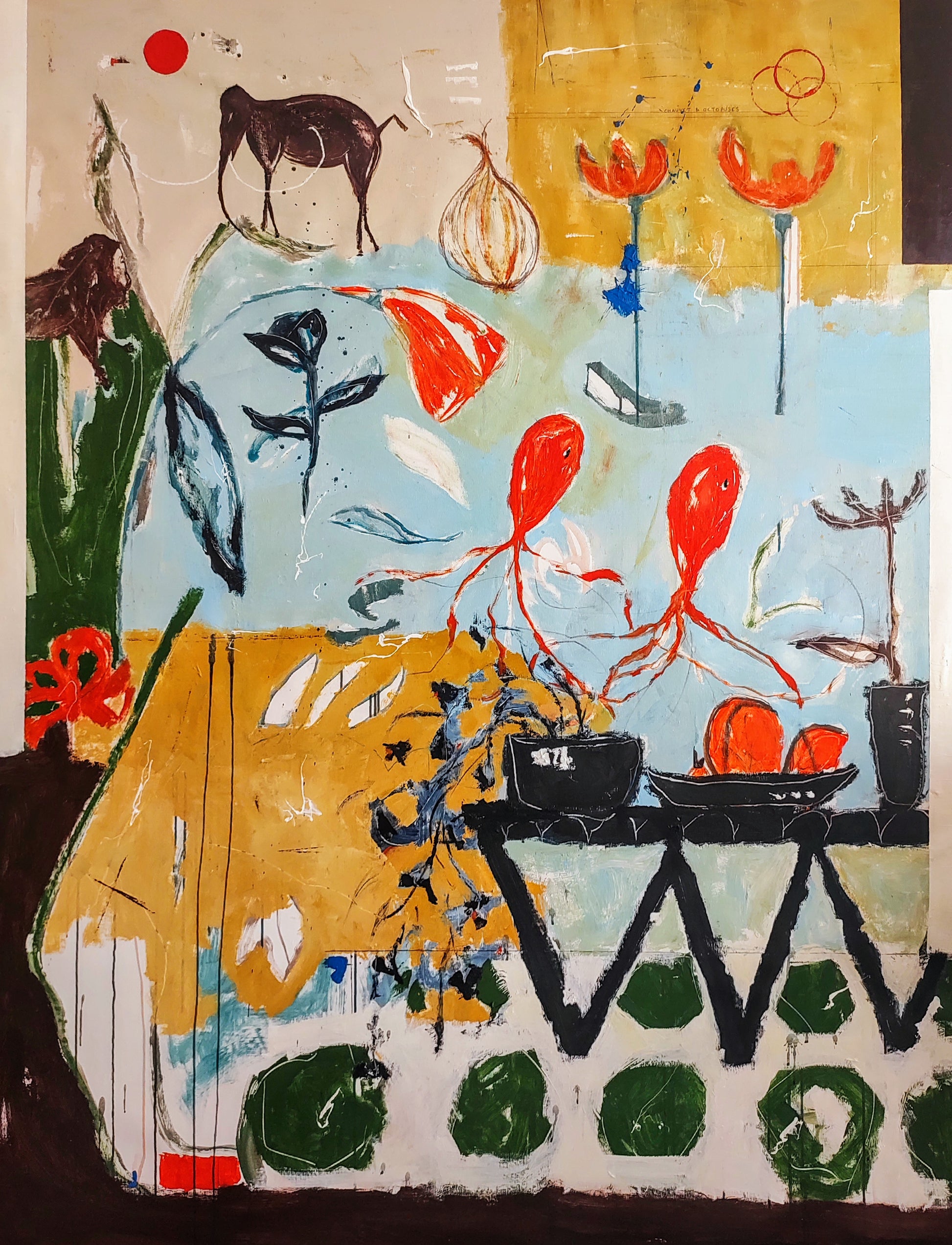 Pintura gestual, intuitiva, que deja que las cosas pasen y se apoya sobre lo que aparece. Aprovechando el accidente y aceptando las consecuencias.
