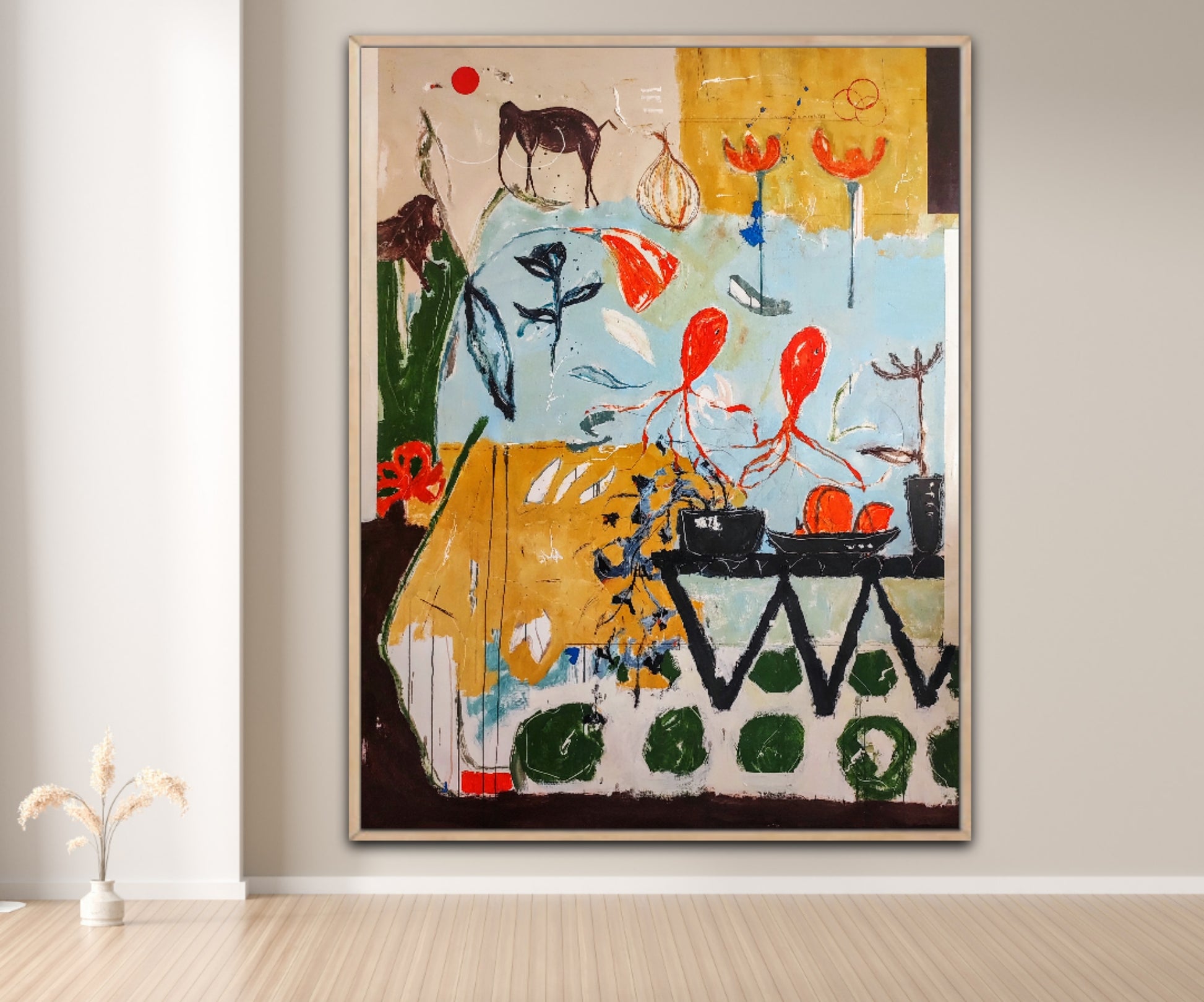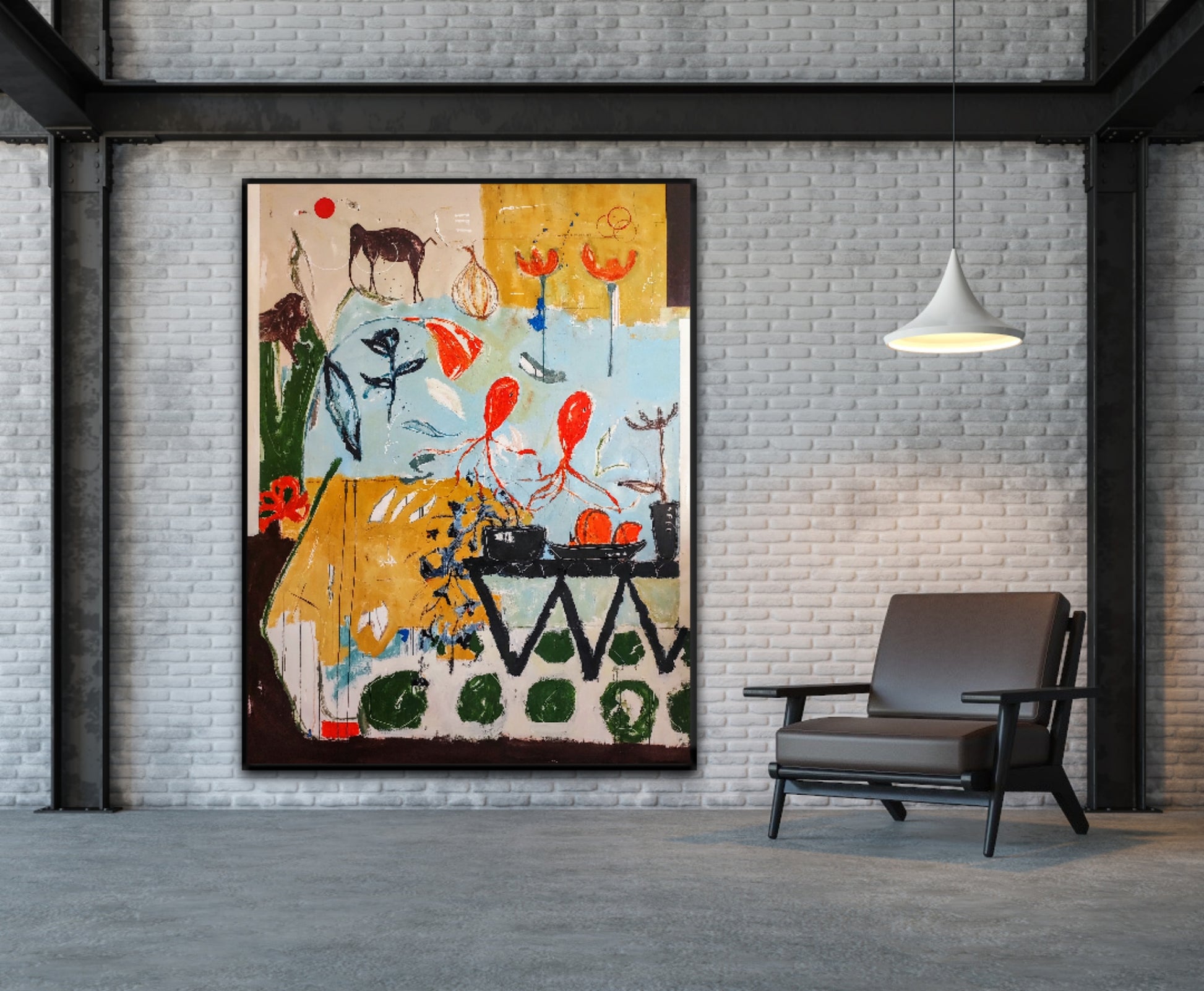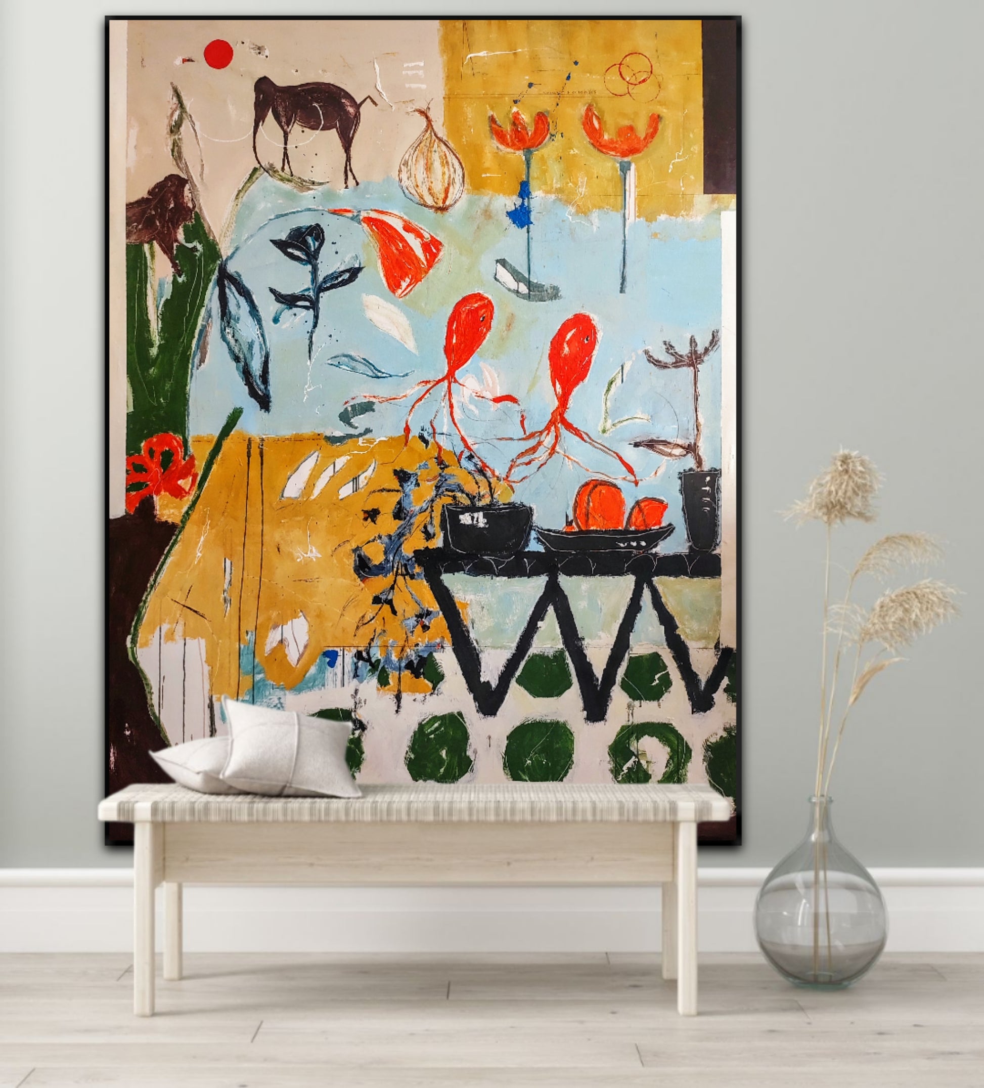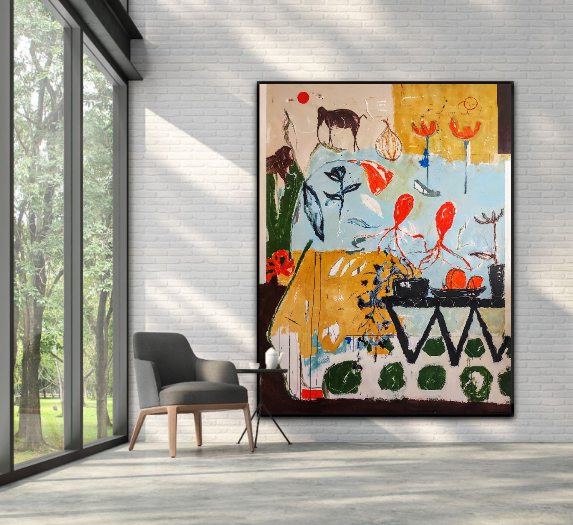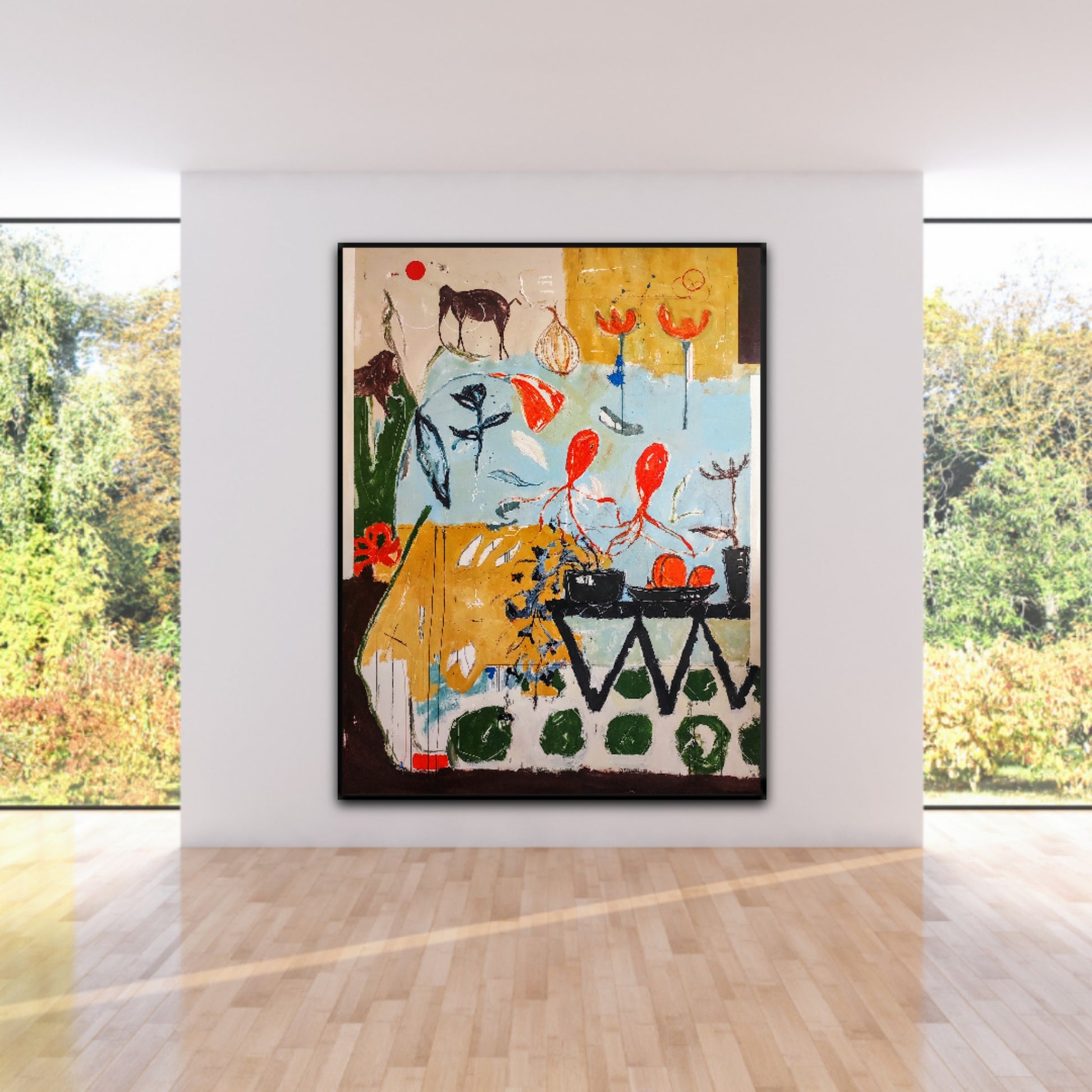 Pintura gestual, intuitiva, que deja que las cosas pasen y se apoya sobre lo que aparece. Aprovechando el accidente y aceptando las consecuencias.