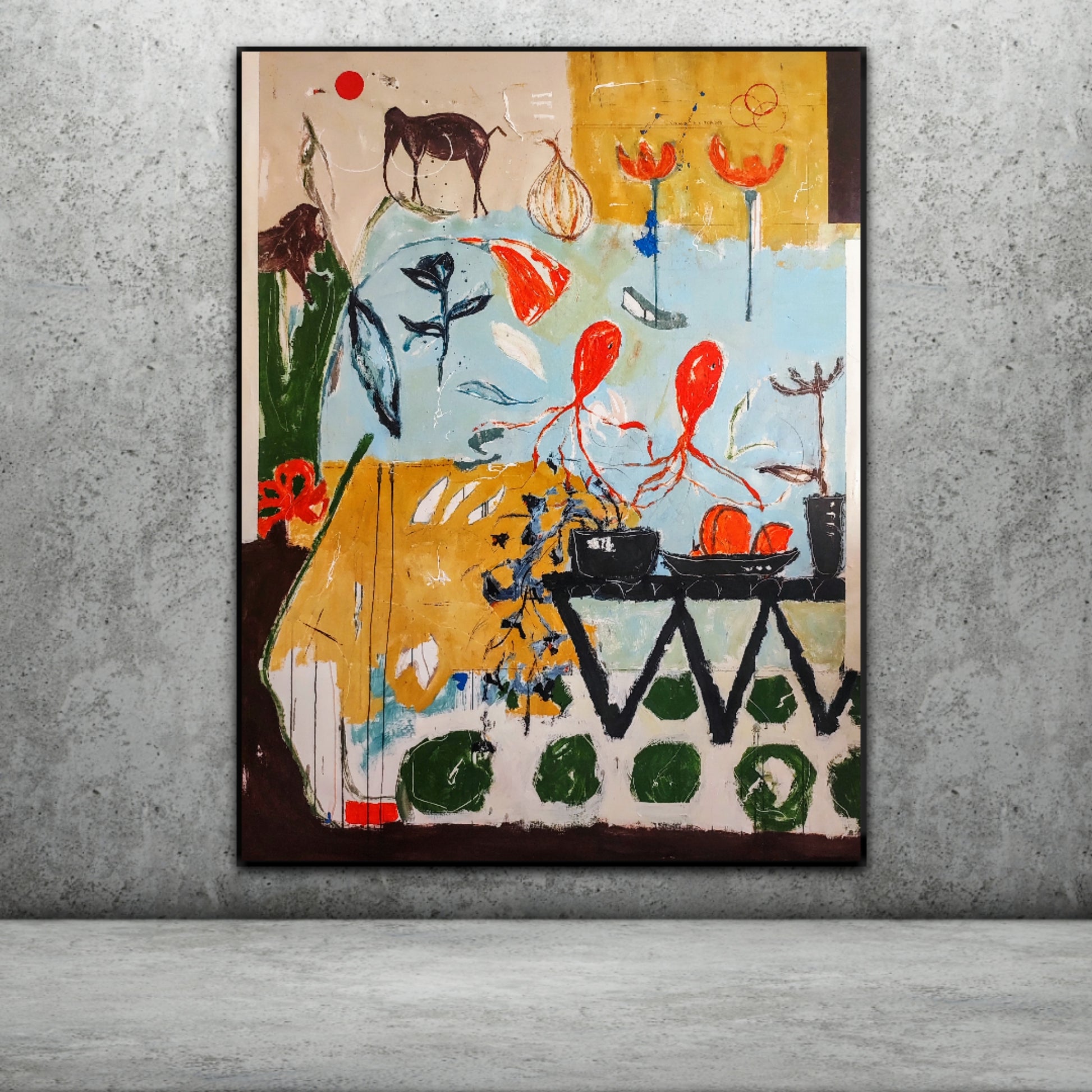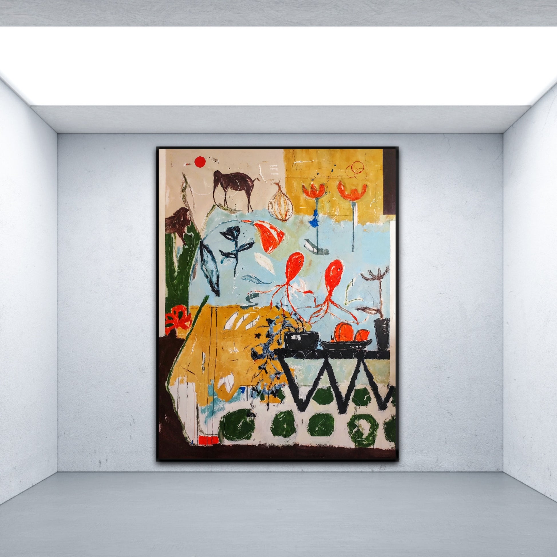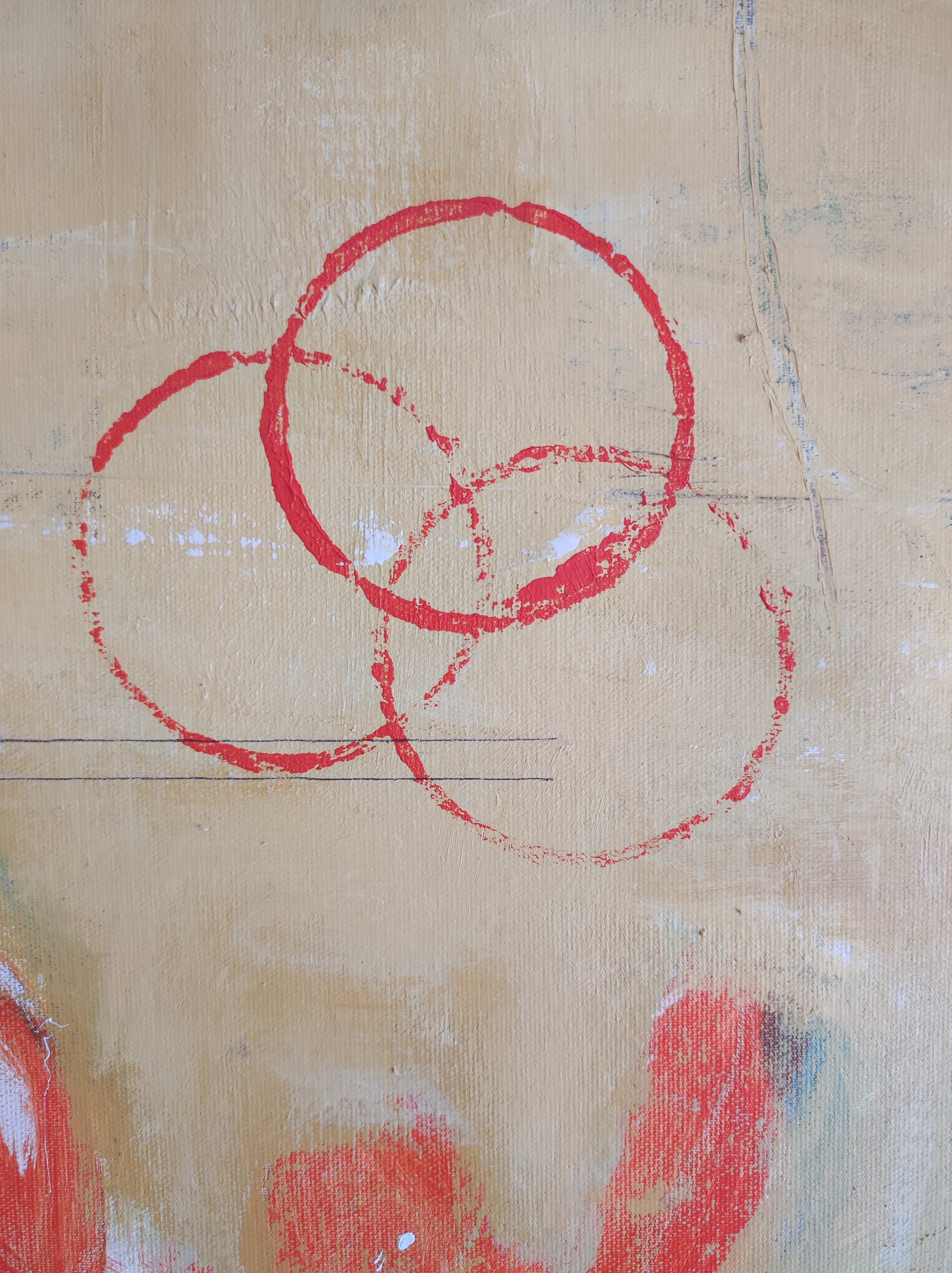 Técnica: acrílico, pigmentos, gesso, ceras, bolígrafo, carboncillo y lápiz.