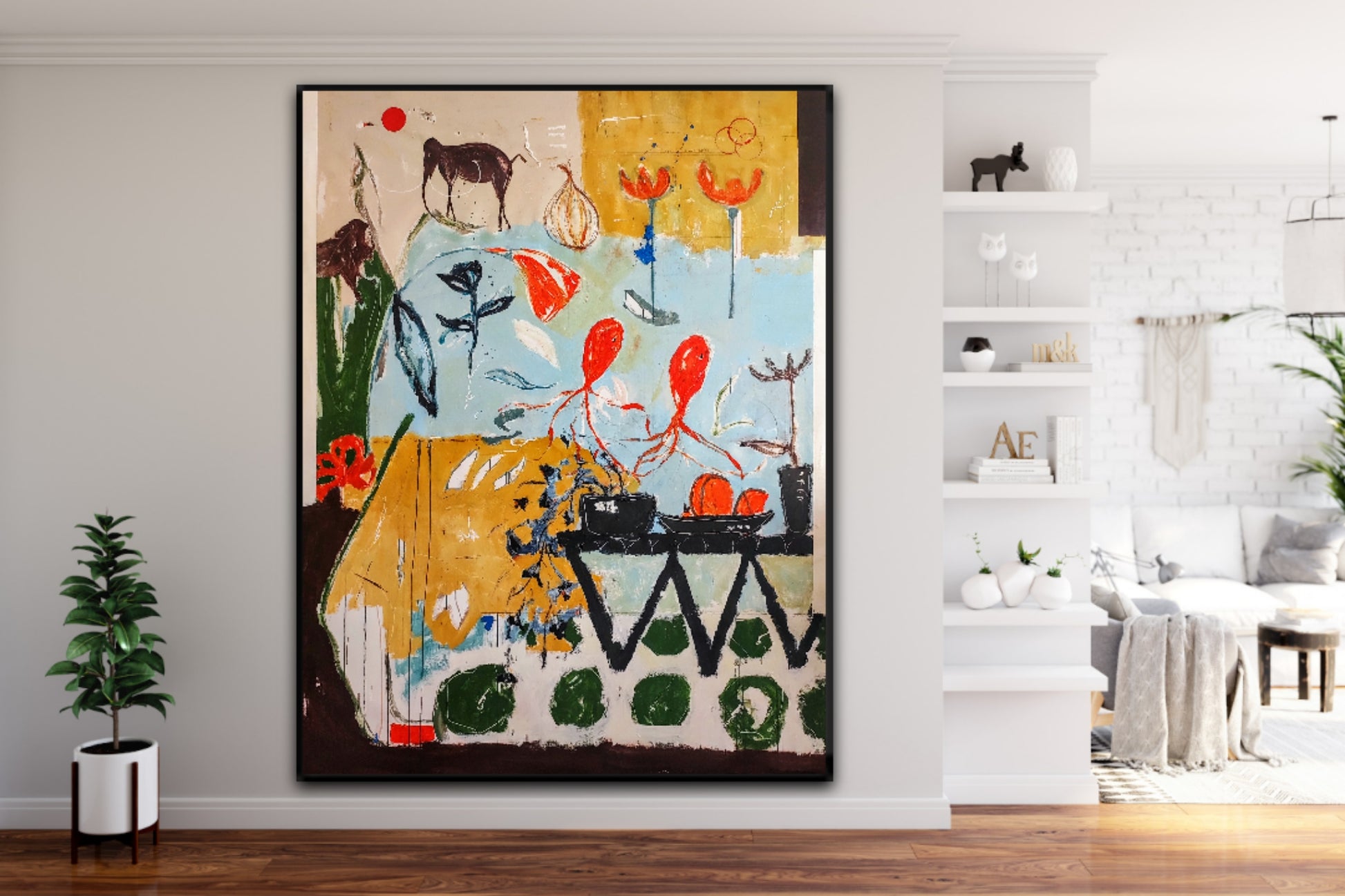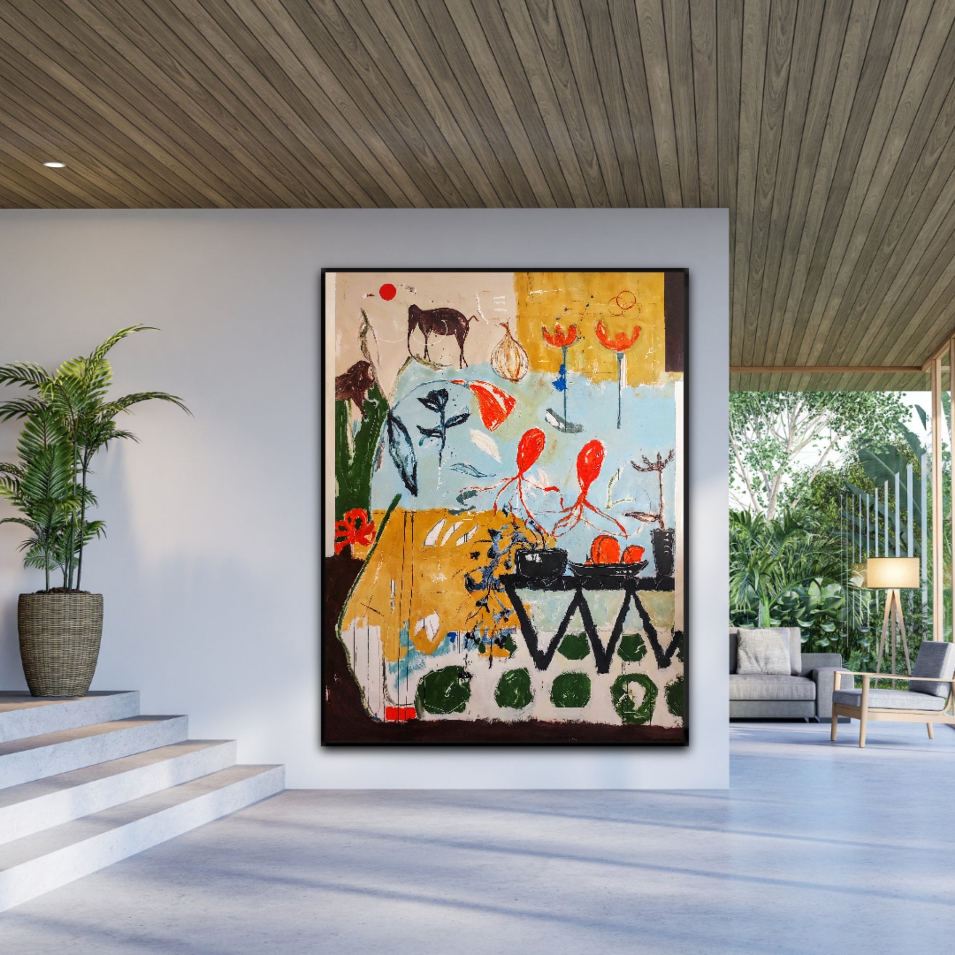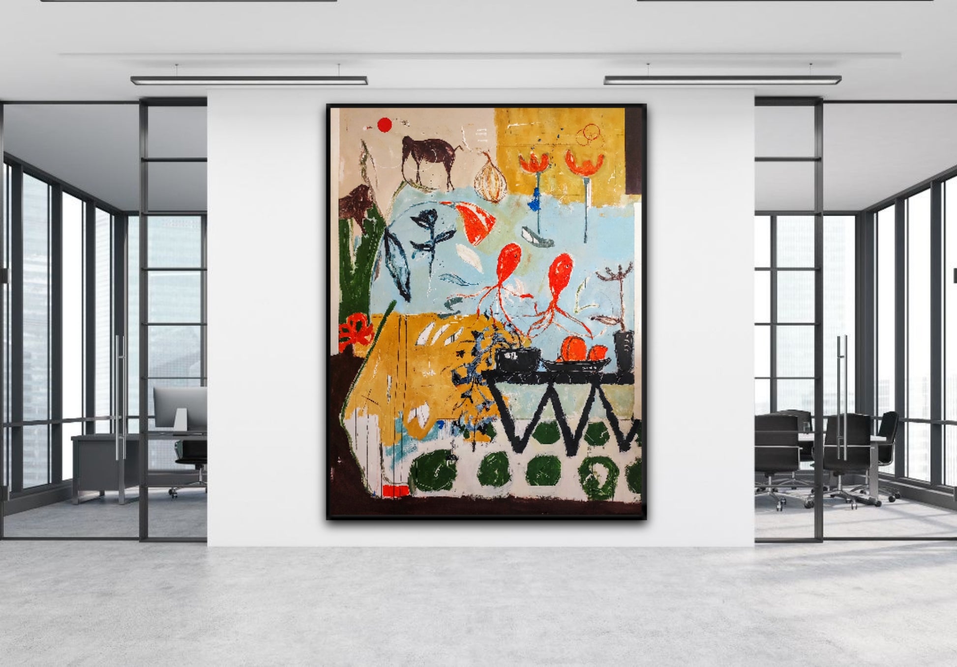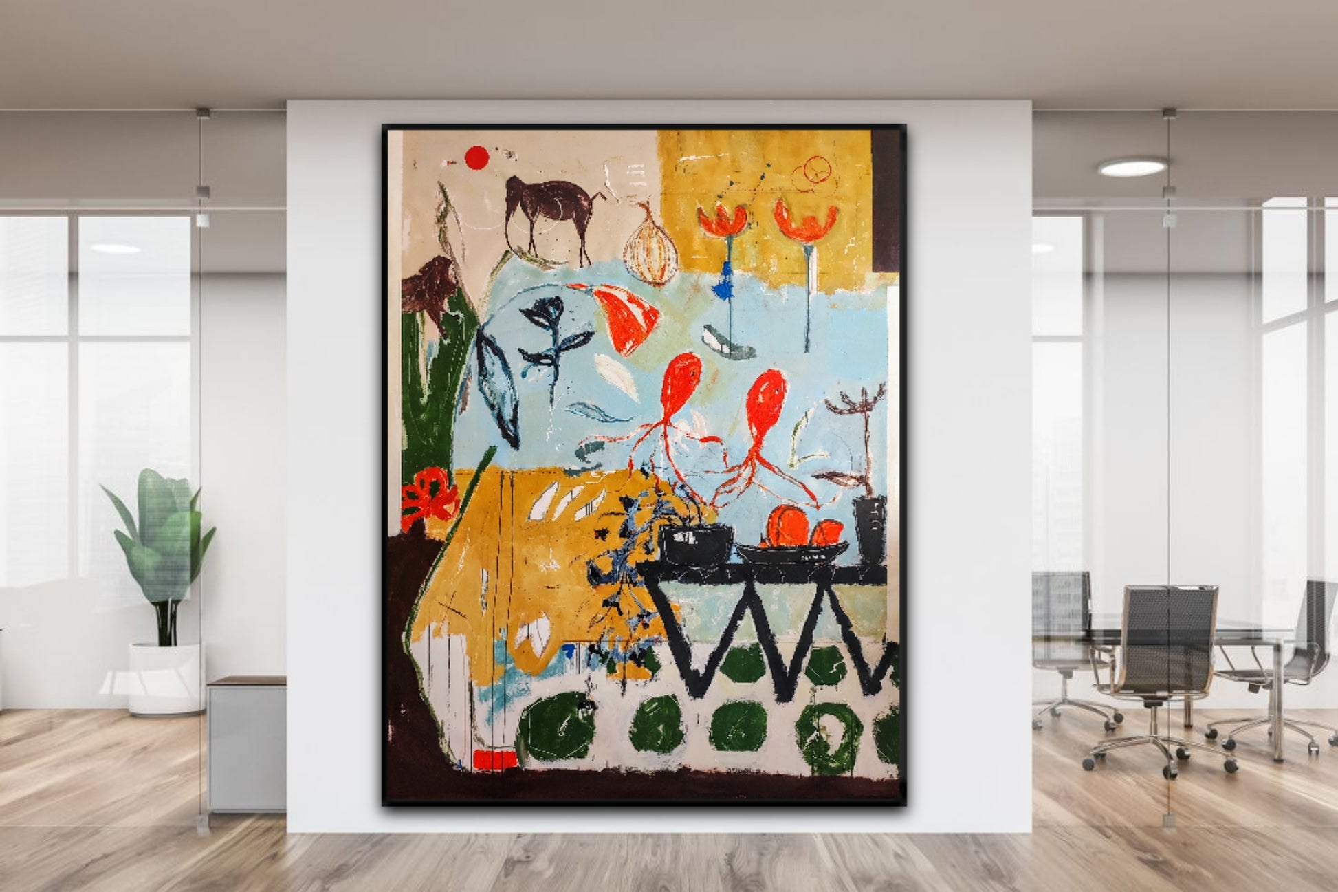 Técnica: acrílico, pigmentos, gesso, ceras, bolígrafo, carboncillo y lápiz.
